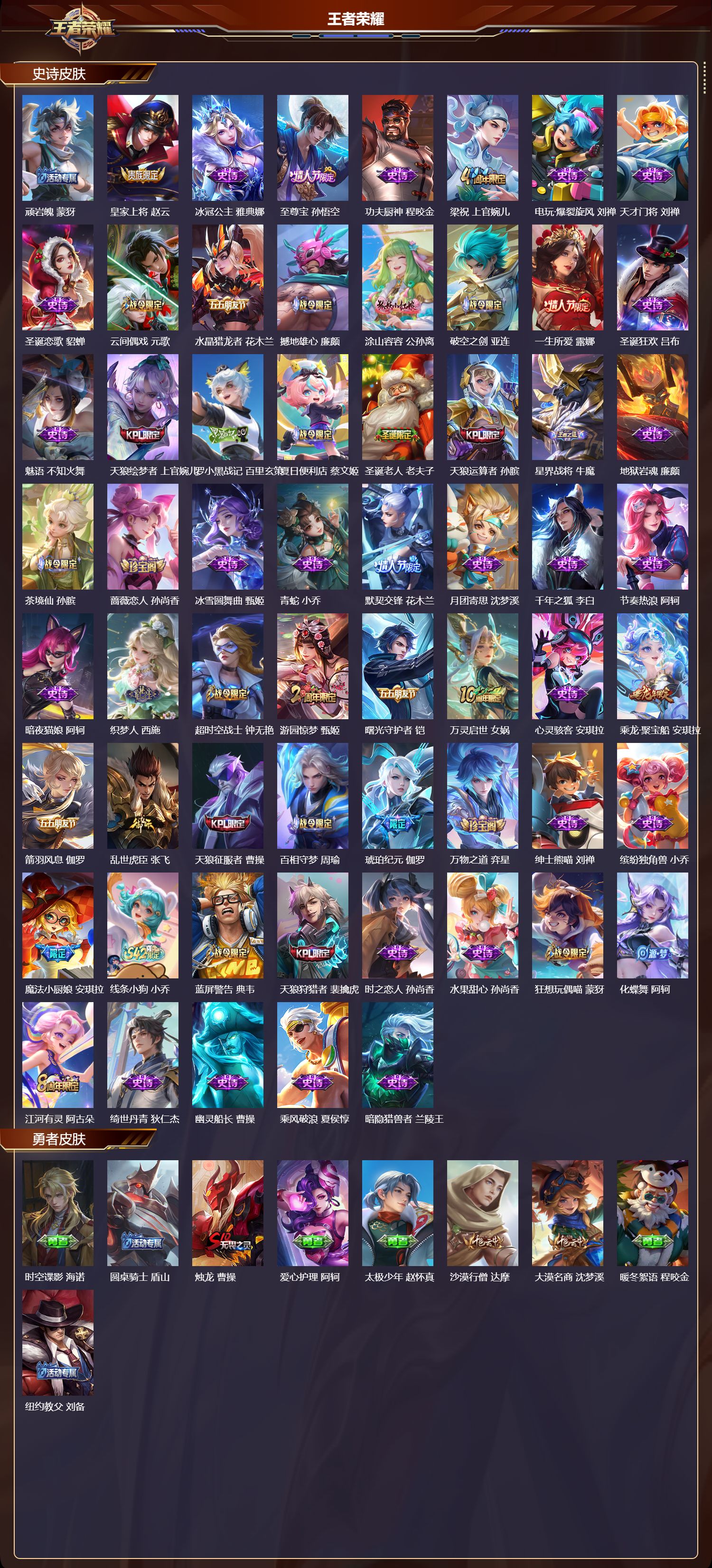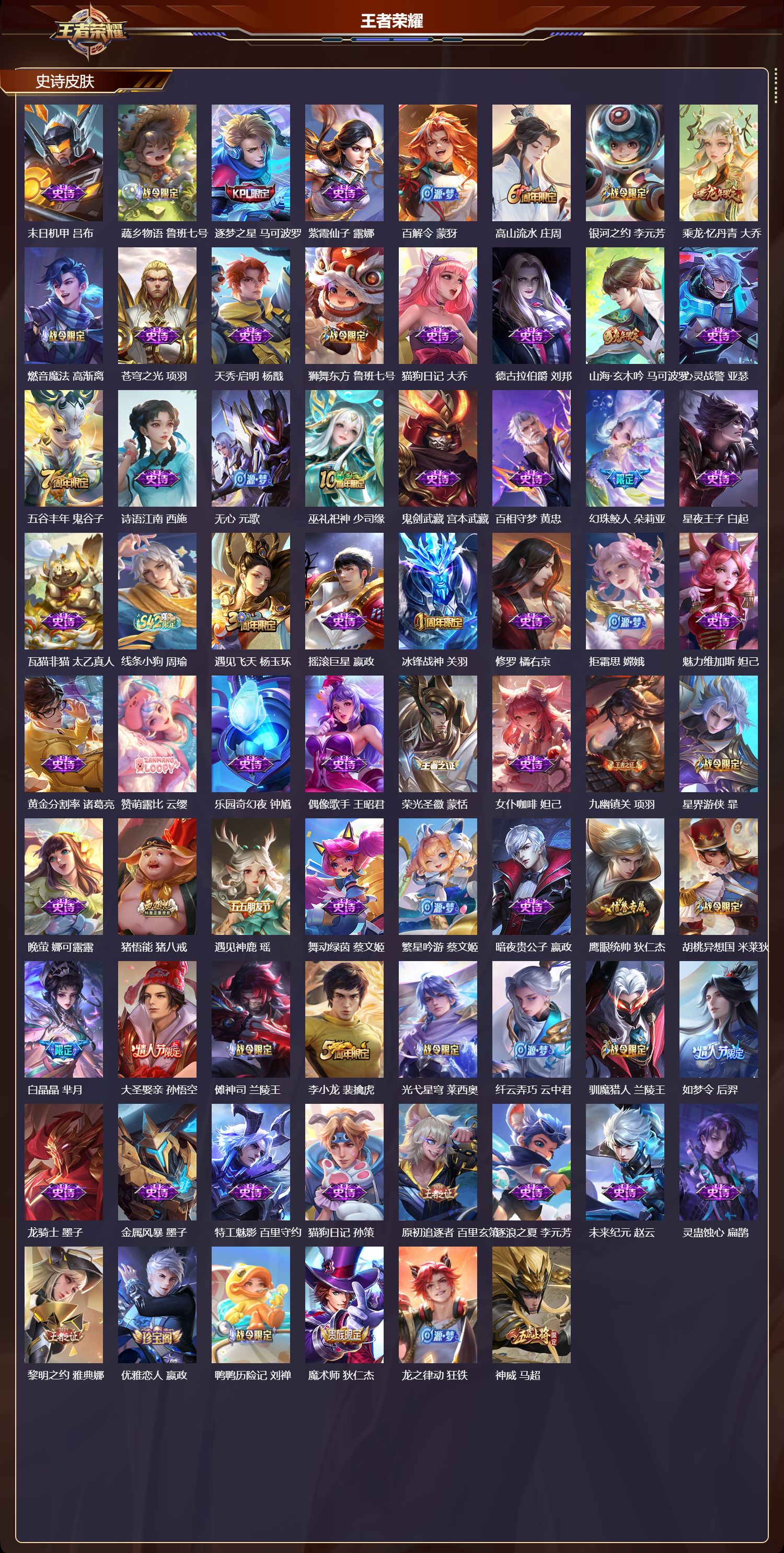 【132,史诗皮肤】,电玩小子,鲁班七号,末日机甲,吕布,蔬乡物语,鲁班七号,逐梦之星,马可波罗,紫霞仙子,露娜,百解令,蒙犽,高山流水,庄周,银河之约,李元芳,乘龙·忆丹青,大乔,燃音魔法,高渐离,苍穹之光,项羽,天秀·启明,杨戬,狮舞东方,鲁班七号,猫狗日记,大乔,德古拉伯爵,刘邦,山海·玄木吟,马可波罗,心灵战警,亚瑟,五谷丰年,鬼谷子,诗语江南,西施,无心,元歌,巫礼祀神,少司缘,鬼剑武藏,宫本武藏,百相守梦,黄忠,幻珠鲛人,朵莉亚,星夜王子,白起,瓦猫非猫,太乙真人,线条小狗,周瑜,遇见飞天,杨玉环,摇滚巨星,嬴政,冰锋战神,关羽,修罗,橘右京,拒霜思,嫦娥,魅力维加斯,妲己,黄金分割率,诸葛亮,赞萌露比,云缨,乐园奇幻夜,钟馗,偶像歌手,王昭君,荣光圣徽,蒙恬,女仆咖啡,妲己,九幽镇关,项羽,星界游侠,暃,晚萤,娜可露露,猪悟能,猪八戒,遇见神鹿,瑶,舞动绿茵,蔡文姬,繁星吟游,蔡文姬,暗夜贵公子,嬴政,鹰眼统帅,狄仁杰,胡桃异想国,米莱狄,白晶晶,芈月,大圣娶亲,孙悟空,傩神司,兰陵王,李小龙,裴擒虎,光弋星穹,莱西奥,纤云弄巧,云中君,驯魔猎人,兰陵王,如梦令,后羿,龙骑士,墨子,金属风暴,墨子,特工魅影,百里守约,猫狗日记,孙策,原初追逐者,百里玄策,逐浪之夏,李元芳,未来纪元,赵云,灵蛊蚀心,扁鹊,黎明之约,雅典娜,优雅恋人,嬴政,鸭鸭历险记,刘禅,魔术师,狄仁杰,龙之律动,狂铁,神威,马超,顽岩魄,蒙犽,皇家上将,赵云,冰冠公主,雅典娜,至尊宝,孙悟空,功夫厨神,程咬金,梁祝,上官婉儿,电玩·爆裂旋风,刘禅,天才门将,刘禅,圣诞恋歌,貂蝉,云间偶戏,元歌,水晶猎龙者,花木兰,撼地雄心,廉颇,涂山容容,公孙离,破空之剑,亚连,一生所爱,露娜,圣诞狂欢,吕布,魅语,不知火舞,天狼绘梦者,上官婉儿,罗小黑战记,百里玄策,夏日便利店,蔡文姬,圣诞老人,老夫子,天狼运算者,孙膑,星界战将,牛魔,地狱岩魂,廉颇,茶境仙,孙膑,蔷薇恋人,孙尚香,冰雪圆舞曲,甄姬,青蛇,小乔,默契交锋,花木兰,月团寄思,沈梦溪,千年之狐,李白,节奏热浪,阿轲,暗夜猫娘,阿轲,织梦人,西施,超时空战士,钟无艳,游园惊梦,甄姬,曙光守护者,铠,万灵启世,女娲,心灵骇客,安琪拉,乘龙·聚宝船,安琪拉,箭羽风息,伽罗,乱世虎臣,张飞,天狼征服者,曹操,百相守梦,周瑜,琥珀纪元,伽罗,万物之道,弈星,绅士熊喵,刘禅,缤纷独角兽,小乔,魔法小厨娘,安琪拉,线条小狗,小乔,蓝屏警告,典韦,天狼狩猎者,裴擒虎,时之恋人,孙尚香,水果甜心,孙尚香,狂想玩偶喵,蒙犽,化蝶舞,阿轲,江河有灵,阿古朵,绮世丹青,狄仁杰,幽灵船长,曹操,乘风破浪,夏侯惇,暗隐猎兽者,兰陵王,