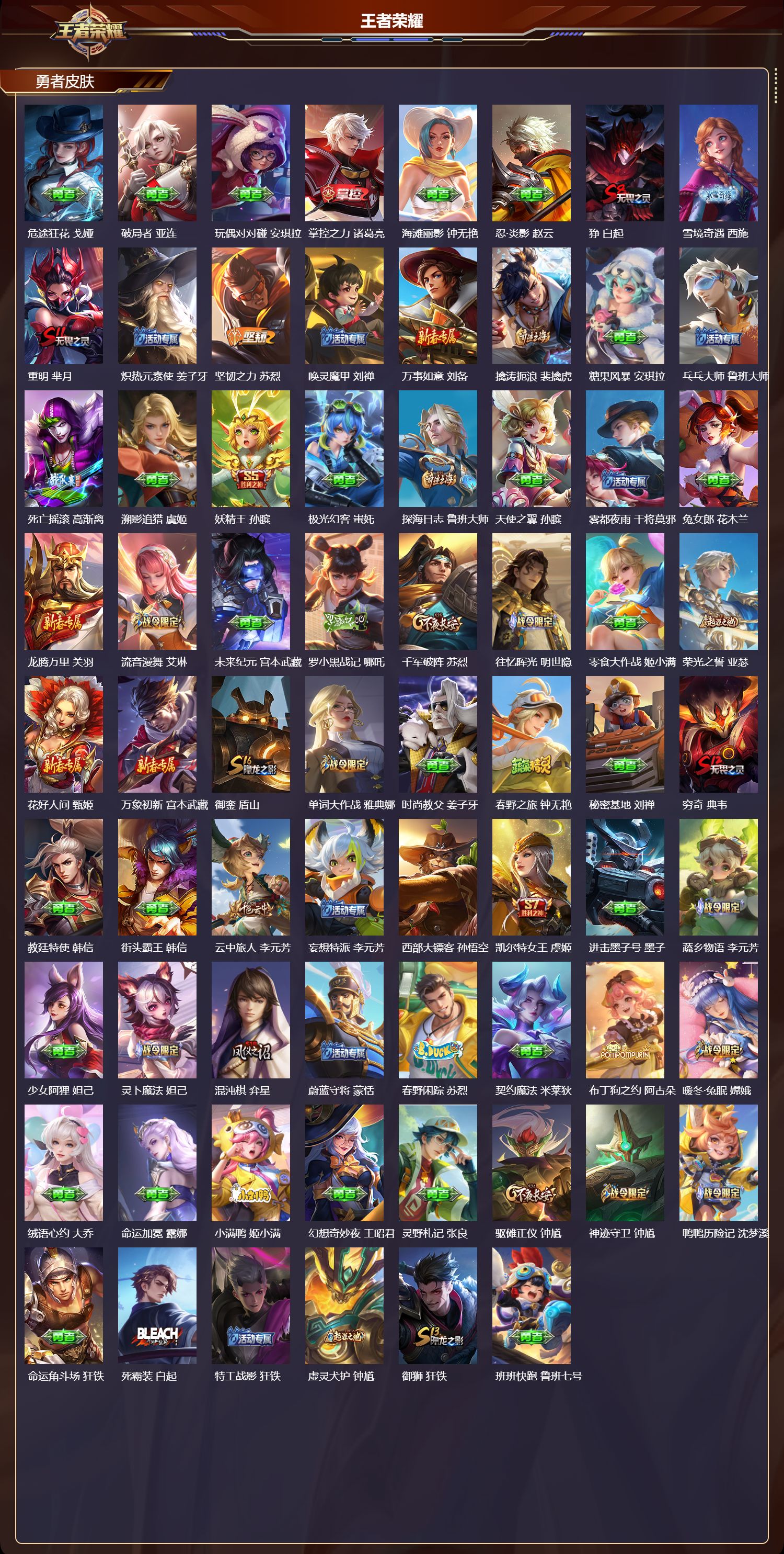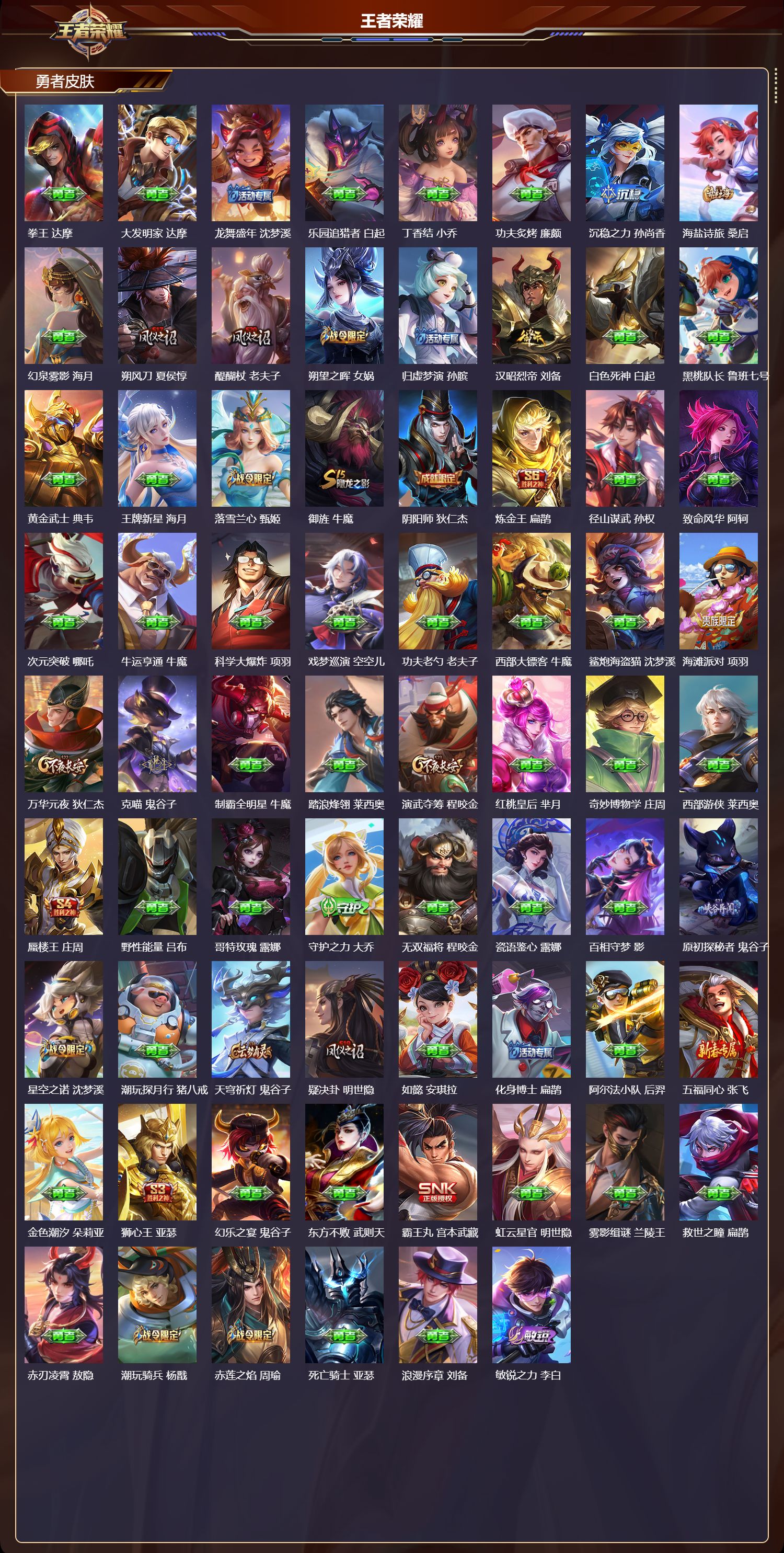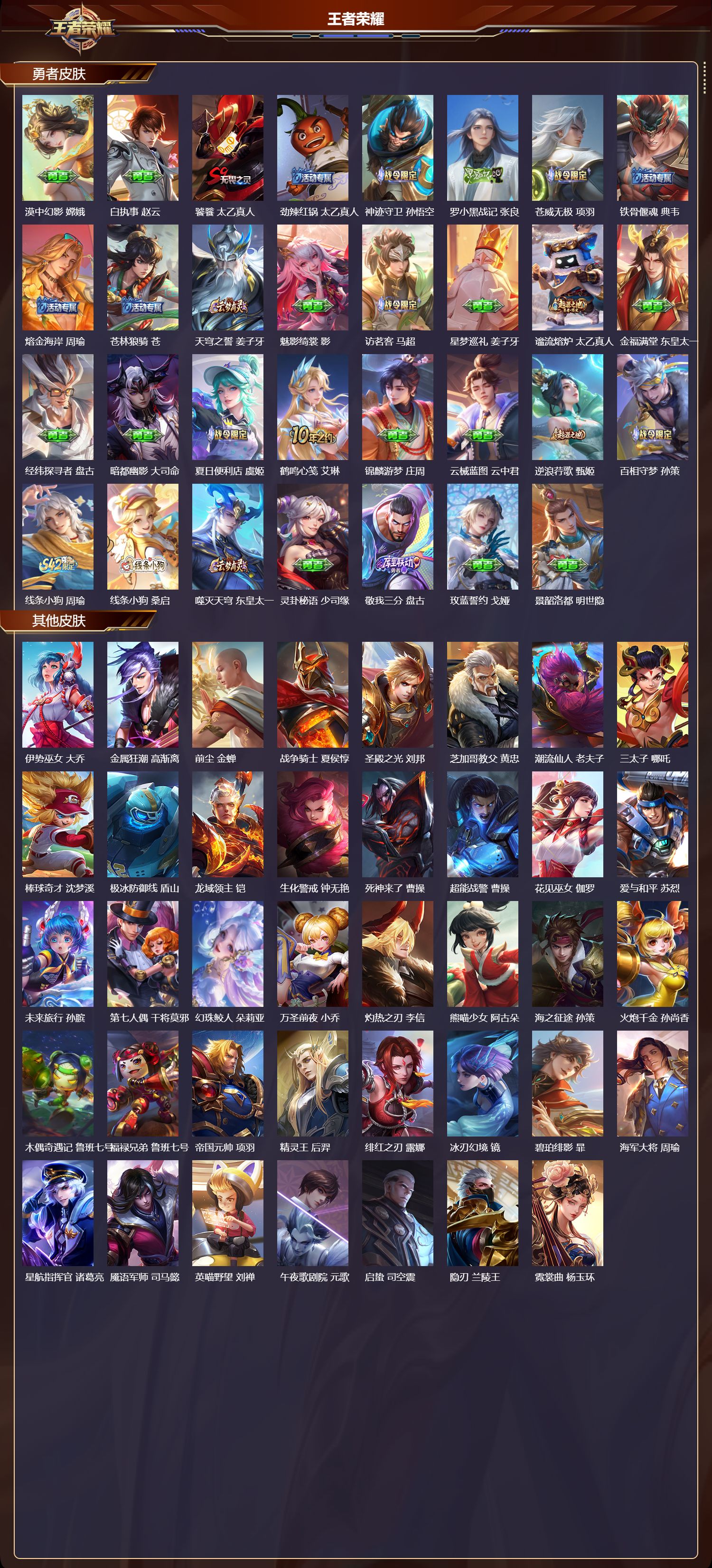 【180,勇者皮肤】,时空谍影,海诺,圆桌骑士,盾山,烛龙,曹操,爱心护理,阿轲,太极少年,赵怀真,沙漠行僧,达摩,大漠名商,沈梦溪,暖冬絮语,程咬金,纽约教父,刘备,拳王,达摩,大发明家,达摩,龙舞盛年,沈梦溪,乐园追猎者,白起,丁香结,小乔,功夫炙烤,廉颇,沉稳之力,孙尚香,海盐诗旅,桑启,幻泉雾影,海月,朔风刀,夏侯惇,醍醐杖,老夫子,朔望之晖,女娲,归虚梦演,孙膑,汉昭烈帝,刘备,白色死神,白起,黑桃队长,鲁班七号,黄金武士,典韦,王牌新星,海月,落雪兰心,甄姬,御旌,牛魔,阴阳师,狄仁杰,炼金王,扁鹊,径山谋武,孙权,致命风华,阿轲,次元突破,哪吒,牛运亨通,牛魔,科学大爆炸,项羽,戏梦巡演,空空儿,功夫老勺,老夫子,西部大镖客,牛魔,鲨炮海盗猫,沈梦溪,海滩派对,项羽,万华元夜,狄仁杰,克喵,鬼谷子,制霸全明星,牛魔,踏浪烽翎,莱西奥,演武夺筹,程咬金,红桃皇后,芈月,奇妙博物学,庄周,西部游侠,莱西奥,蜃楼王,庄周,野性能量,吕布,哥特玫瑰,露娜,守护之力,大乔,无双福将,程咬金,瓷语鉴心,露娜,百相守梦,影,原初探秘者,鬼谷子,星空之诺,沈梦溪,潮玩探月行,猪八戒,天穹祈灯,鬼谷子,疑决卦,明世隐,如懿,安琪拉,化身博士,扁鹊,阿尔法小队,后羿,五福同心,张飞,金色潮汐,朵莉亚,狮心王,亚瑟,幻乐之宴,鬼谷子,东方不败,武则天,霸王丸,宫本武藏,虹云星官,明世隐,雾影缉谜,兰陵王,救世之瞳,扁鹊,赤刃凌霄,敖隐,潮玩骑兵,杨戬,赤莲之焰,周瑜,死亡骑士,亚瑟,浪漫序章,刘备,敏锐之力,李白,危途狂花,戈娅,破局者,亚连,玩偶对对碰,安琪拉,掌控之力,诸葛亮,海滩丽影,钟无艳,忍·炎影,赵云,狰,白起,雪境奇遇,西施,重明,芈月,炽热元素使,姜子牙,坚韧之力,苏烈,唤灵魔甲,刘禅,万事如意,刘备,擒涛扼浪,裴擒虎,糖果风暴,安琪拉,乓乓大师,鲁班大师,死亡摇滚,高渐离,溯影追猎,虞姬,妖精王,孙膑,极光幻客,蚩奼,探海日志,鲁班大师,天使之翼,孙膑,雾都夜雨,干将莫邪,兔女郎,花木兰,龙腾万里,关羽,流音漫舞,艾琳,未来纪元,宫本武藏,罗小黑战记,哪吒,千军破阵,苏烈,往忆晖光,明世隐,零食大作战,姬小满,荣光之誓,亚瑟,花好人间,甄姬,万象初新,宫本武藏,御銮,盾山,单词大作战,雅典娜,时尚教父,姜子牙,春野之旅,钟无艳,秘密基地,刘禅,穷奇,典韦,教廷特使,韩信,街头霸王,韩信,云中旅人,李元芳,妄想特派,李元芳,西部大镖客,孙悟空,凯尔特女王,虞姬,进击墨子号,墨子,蔬乡物语,李元芳,少女阿狸,妲己,灵卜魔法,妲己,混沌棋,弈星,蔚蓝守将,蒙恬,春野闲踪,苏烈,契约魔法,米莱狄,布丁狗之约,阿古朵,暖冬·兔眠,嫦娥,绒语心约,大乔,命运加冕,露娜,小满鸭,姬小满,幻想奇妙夜,王昭君,灵野札记,张良,驱傩正仪,钟馗,神迹守卫,钟馗,鸭鸭历险记,沈梦溪,命运角斗场,狂铁,死霸装,白起,特工战影,狂铁,虚灵犬护,钟馗,御狮,狂铁,班班快跑,鲁班七号,漠中幻影,嫦娥,白执事,赵云,饕餮,太乙真人,劲辣红锅,太乙真人,神迹守卫,孙悟空,罗小黑战记,张良,苍威无极,项羽,铁骨偃魂,典韦,熔金海岸,周瑜,苍林狼骑,苍,天穹之誓,姜子牙,魅影绮裳,影,访茗客,马超,星梦巡礼,姜子牙,谧流熔炉,太乙真人,金福满堂,东皇太一,经纬探寻者,盘古,暗都幽影,大司命,夏日便利店,虞姬,鹤鸣心笺,艾琳,锦麟游梦,庄周,云械蓝图,云中君,逆浪荇歌,甄姬,百相守梦,孙策,线条小狗,周瑜,线条小狗,桑启,噬灭天穹,东皇太一,灵卦秘语,少司缘,敬我三分,盘古,玫蓝誓约,戈娅,景韶洛都,明世隐,