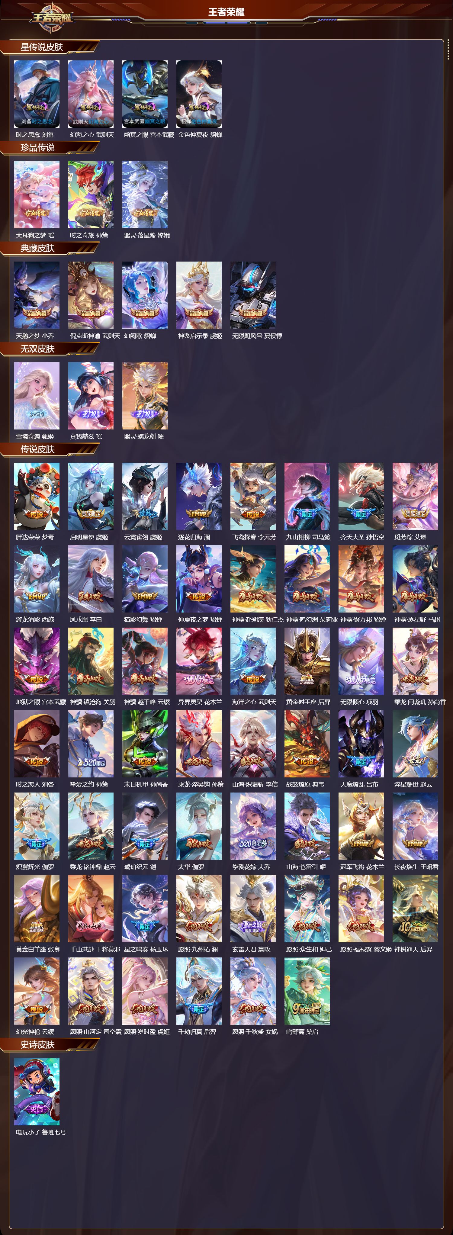 【54,传说皮肤】,胖达荣荣,梦奇,启明星使,虞姬,云霓雀翎,虞姬,逐花归海,澜,飞鸢探春,李元芳,九山相柳,司马懿,齐天大圣,孙悟空,觅芳踪,艾琳,游龙清影,西施,凤求凰,李白,猫影幻舞,貂蝉,仲夏夜之梦,貂蝉,神骥·赴朔漠,狄仁杰,神骥·鸣幻洲,朵莉亚,神骥·聚万邦,貂蝉,神骥·逐星野,马超,地狱之眼,宫本武藏,神骥·镇沧海,关羽,神骥·越千峰,云缨,异界灵契,花木兰,海洋之心,武则天,黄金射手座,后羿,无限倾心,项羽,乘龙·问璇玑,孙尚香,时之恋人,刘备,挚爱之约,孙策,末日机甲,孙尚香,乘龙·淬吴钩,孙策,山海·炽霜斩,李信,战鼓燎原,典韦,天魔缭乱,吕布,淬星耀世,赵云,炽翼辉光,伽罗,乘龙·铭钟鼎,赵云,琥珀纪元,铠,太华,伽罗,挚爱花嫁,大乔,山海·苍雷引,曜,冠军飞将,花木兰,长夜焕生,王昭君,黄金白羊座,张良,千山共赴,干将莫邪,星之鸣奏,杨玉环,愿照·九州拓,澜,玄雷天君,嬴政,愿照·众生和,妲己,愿照·福禄聚,蔡文姬,神树通天,后羿,幻光神枪,云缨,愿照·山河定,司空震,愿照·岁时盈,虞姬,千劫归真,后羿,愿照·千秋盛,女娲,鸣野蒿,桑启,