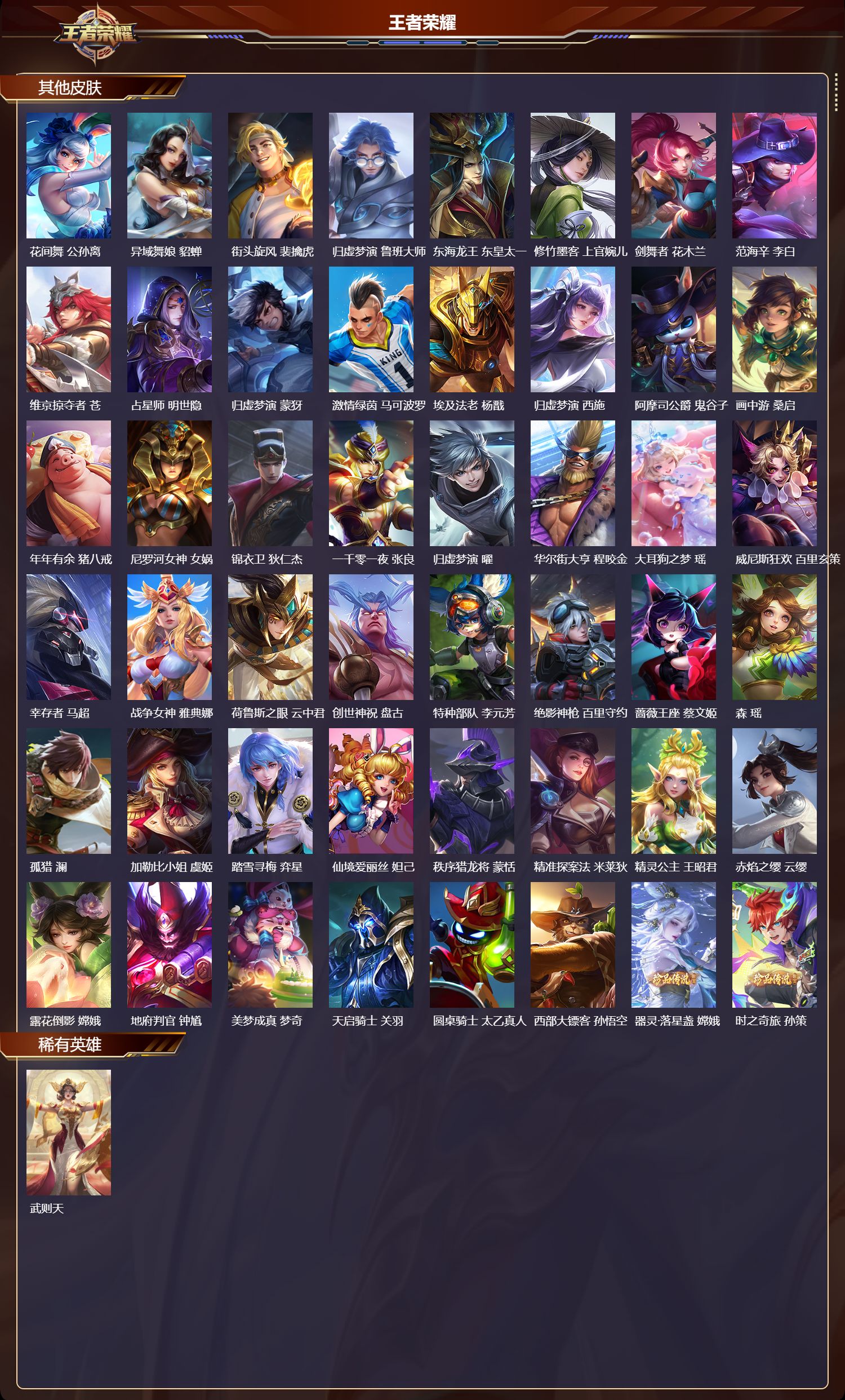 【87,其他皮肤】,伊势巫女,大乔,金属狂潮,高渐离,前尘,金蝉,战争骑士,夏侯惇,圣殿之光,刘邦,芝加哥教父,黄忠,潮流仙人,老夫子,三太子,哪吒,棒球奇才,沈梦溪,极冰防御线,盾山,龙域领主,铠,生化警戒,钟无艳,死神来了,曹操,超能战警,曹操,花见巫女,伽罗,爱与和平,苏烈,未来旅行,孙膑,第七人偶,干将莫邪,幻珠鲛人,朵莉亚,万圣前夜,小乔,灼热之刃,李信,熊喵少女,阿古朵,海之征途,孙策,火炮千金,孙尚香,木偶奇遇记,鲁班七号,福禄兄弟,鲁班七号,帝国元帅,项羽,精灵王,后羿,绯红之刃,露娜,冰刃幻境,镜,碧珀绯影,暃,海军大将,周瑜,星航指挥官,诸葛亮,魇语军师,司马懿,英喵野望,刘禅,午夜歌剧院,元歌,启蛰,司空震,隐刃,兰陵王,霓裳曲,杨玉环,花间舞,公孙离,异域舞娘,貂蝉,街头旋风,裴擒虎,归虚梦演,鲁班大师,东海龙王,东皇太一,修竹墨客,上官婉儿,剑舞者,花木兰,范海辛,李白,维京掠夺者,苍,占星师,明世隐,归虚梦演,蒙犽,激情绿茵,马可波罗,埃及法老,杨戬,归虚梦演,西施,阿摩司公爵,鬼谷子,画中游,桑启,年年有余,猪八戒,尼罗河女神,女娲,锦衣卫,狄仁杰,一千零一夜,张良,归虚梦演,曜,华尔街大亨,程咬金,大耳狗之梦,瑶,威尼斯狂欢,百里玄策,幸存者,马超,战争女神,雅典娜,荷鲁斯之眼,云中君,创世神祝,盘古,特种部队,李元芳,绝影神枪,百里守约,蔷薇王座,蔡文姬,森,瑶,孤猎,澜,加勒比小姐,虞姬,踏雪寻梅,弈星,仙境爱丽丝,妲己,秩序猎龙将,蒙恬,精准探案法,米莱狄,精灵公主,王昭君,赤焰之缨,云缨,露花倒影,嫦娥,地府判官,钟馗,美梦成真,梦奇,天启骑士,关羽,圆桌骑士,太乙真人,西部大镖客,孙悟空,器灵·落星盏,嫦娥,时之奇旅,孙策,