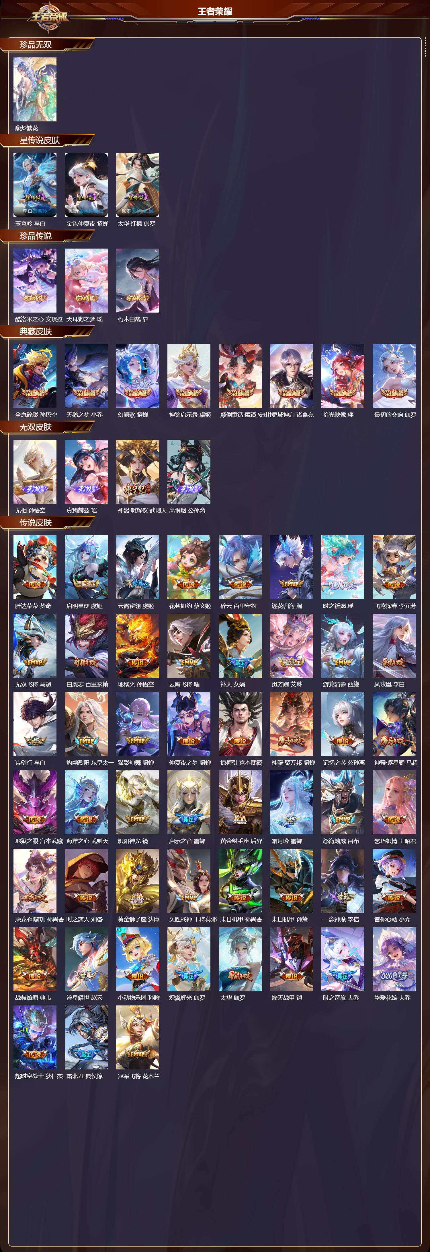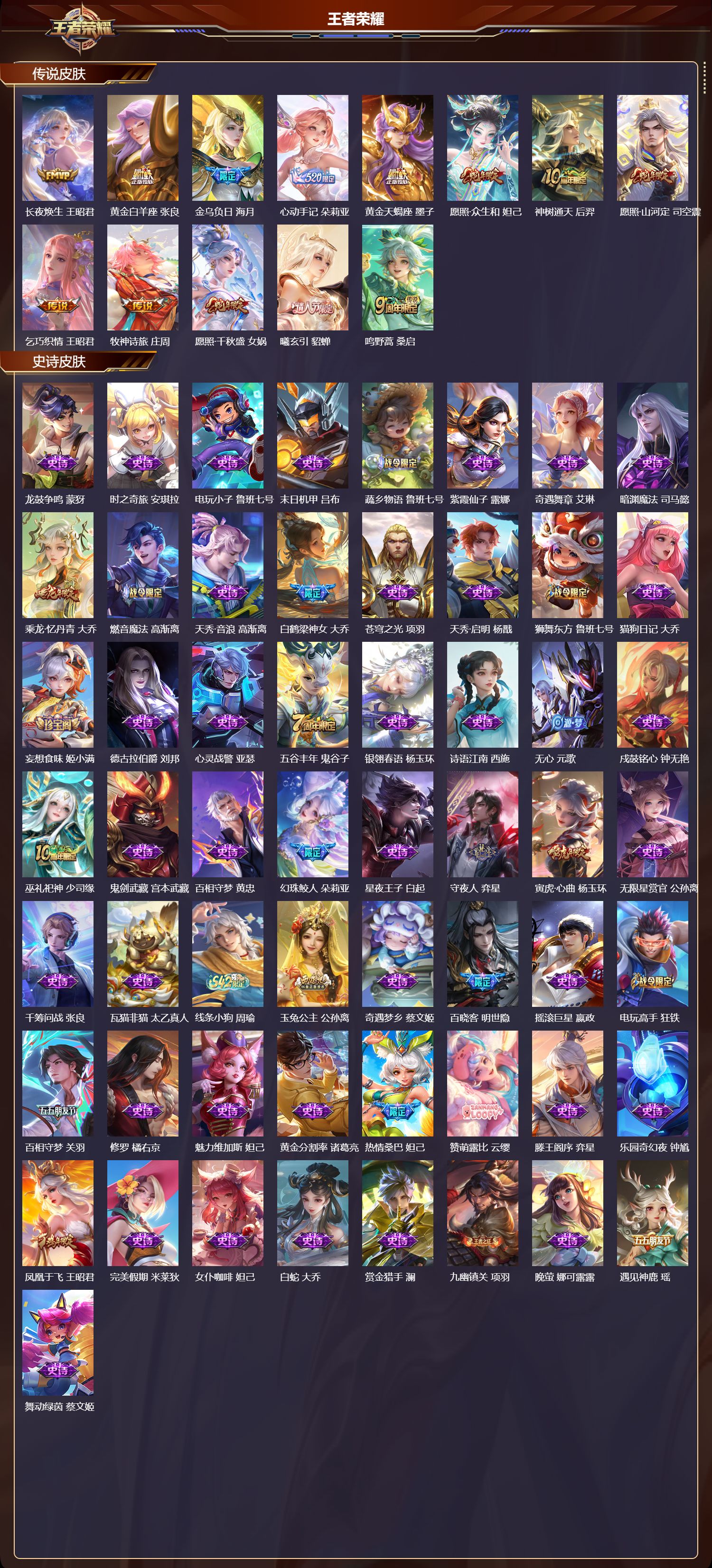 【63,传说皮肤】,胖达荣荣,梦奇,启明星使,虞姬,云霓雀翎,虞姬,花朝如约,蔡文姬,碎云,百里守约,逐花归海,澜,时之祈愿,瑶,飞鸢探春,李元芳,无双飞将,马超,白虎志,百里玄策,地狱火,孙悟空,云鹰飞将,曜,补天,女娲,觅芳踪,艾琳,游龙清影,西施,凤求凰,李白,诗剑行,李白,灼幽烈阳,东皇太一,猫影幻舞,貂蝉,仲夏夜之梦,貂蝉,惊梅引,宫本武藏,神骥·聚万邦,貂蝉,记忆之芯,公孙离,神骥·逐星野,马超,地狱之眼,宫本武藏,海洋之心,武则天,炽阳神光,镜,启示之音,露娜,黄金射手座,后羿,霜月吟,露娜,怒海麟威,吕布,乞巧织情,王昭君,乘龙·问璇玑,孙尚香,时之恋人,刘备,黄金狮子座,达摩,久胜战神,干将莫邪,末日机甲,孙尚香,末日机甲,孙策,一念神魔,李信,音你心动,小乔,战鼓燎原,典韦,淬星耀世,赵云,小动物乐团,孙膑,炽翼辉光,伽罗,太华,伽罗,绛天战甲,铠,时之奇旅,大乔,挚爱花嫁,大乔,超时空战士,狄仁杰,霜北刀,夏侯惇,冠军飞将,花木兰,长夜焕生,王昭君,黄金白羊座,张良,金乌负日,海月,心动手记,朵莉亚,黄金天蝎座,墨子,愿照·众生和,妲己,神树通天,后羿,愿照·山河定,司空震,牧神诗旅,庄周,愿照·千秋盛,女娲,曦玄引,貂蝉,鸣野蒿,桑启,