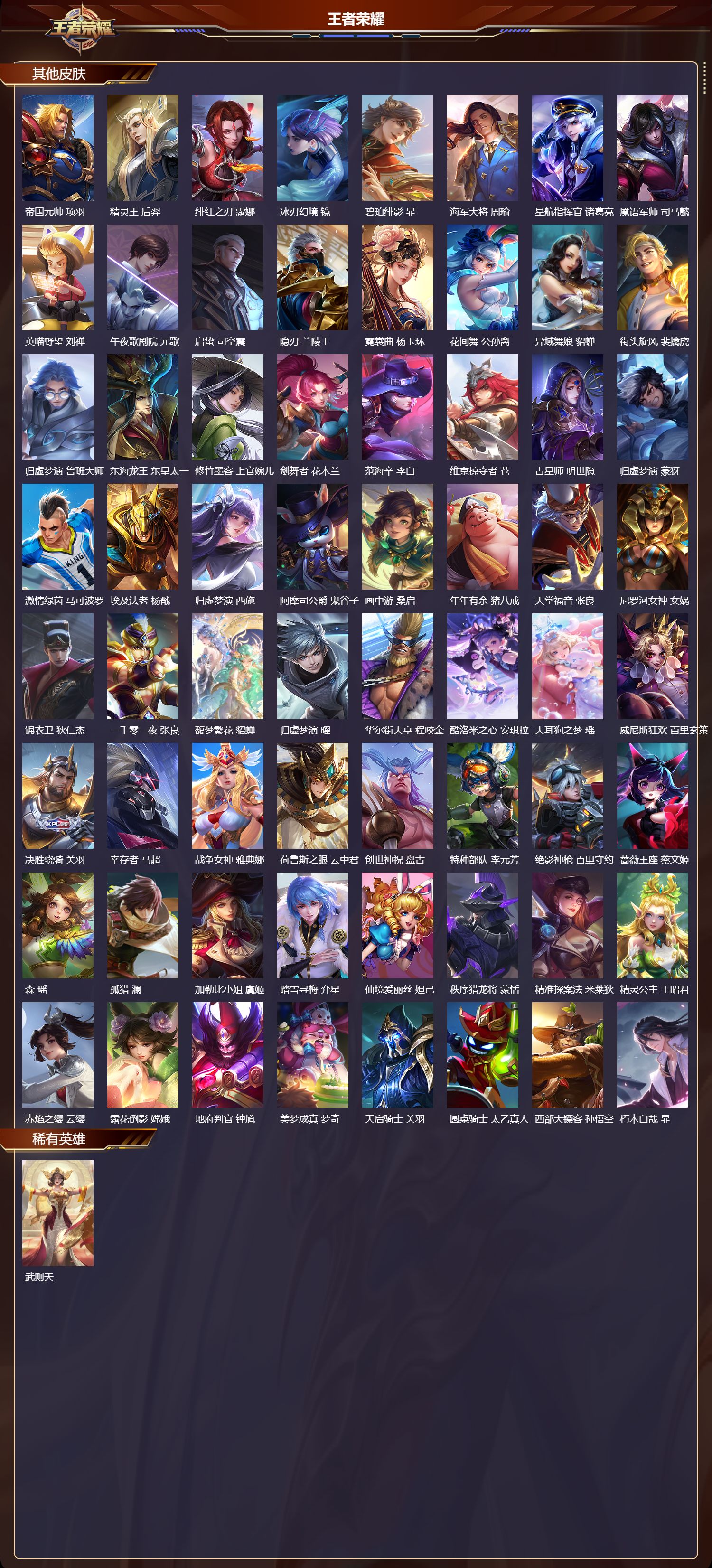 【88,其他皮肤】,伊势巫女,大乔,金属狂潮,高渐离,前尘,金蝉,战争骑士,夏侯惇,圣殿之光,刘邦,芝加哥教父,黄忠,潮流仙人,老夫子,三太子,哪吒,棒球奇才,沈梦溪,极冰防御线,盾山,龙域领主,铠,生化警戒,钟无艳,超能战警,曹操,花见巫女,伽罗,爱与和平,苏烈,未来旅行,孙膑,第七人偶,干将莫邪,幻珠鲛人,朵莉亚,万圣前夜,小乔,灼热之刃,李信,熊喵少女,阿古朵,海之征途,孙策,木偶奇遇记,鲁班七号,福禄兄弟,鲁班七号,帝国元帅,项羽,精灵王,后羿,绯红之刃,露娜,冰刃幻境,镜,碧珀绯影,暃,海军大将,周瑜,星航指挥官,诸葛亮,魇语军师,司马懿,英喵野望,刘禅,午夜歌剧院,元歌,启蛰,司空震,隐刃,兰陵王,霓裳曲,杨玉环,花间舞,公孙离,异域舞娘,貂蝉,街头旋风,裴擒虎,归虚梦演,鲁班大师,东海龙王,东皇太一,修竹墨客,上官婉儿,剑舞者,花木兰,范海辛,李白,维京掠夺者,苍,占星师,明世隐,归虚梦演,蒙犽,激情绿茵,马可波罗,埃及法老,杨戬,归虚梦演,西施,阿摩司公爵,鬼谷子,画中游,桑启,年年有余,猪八戒,天堂福音,张良,尼罗河女神,女娲,锦衣卫,狄仁杰,一千零一夜,张良,馥梦繁花,貂蝉,归虚梦演,曜,华尔街大亨,程咬金,酷洛米之心,安琪拉,大耳狗之梦,瑶,威尼斯狂欢,百里玄策,决胜骁骑,关羽,幸存者,马超,战争女神,雅典娜,荷鲁斯之眼,云中君,创世神祝,盘古,特种部队,李元芳,绝影神枪,百里守约,蔷薇王座,蔡文姬,森,瑶,孤猎,澜,加勒比小姐,虞姬,踏雪寻梅,弈星,仙境爱丽丝,妲己,秩序猎龙将,蒙恬,精准探案法,米莱狄,精灵公主,王昭君,赤焰之缨,云缨,露花倒影,嫦娥,地府判官,钟馗,美梦成真,梦奇,天启骑士,关羽,圆桌骑士,太乙真人,西部大镖客,孙悟空,朽木白哉,暃,
