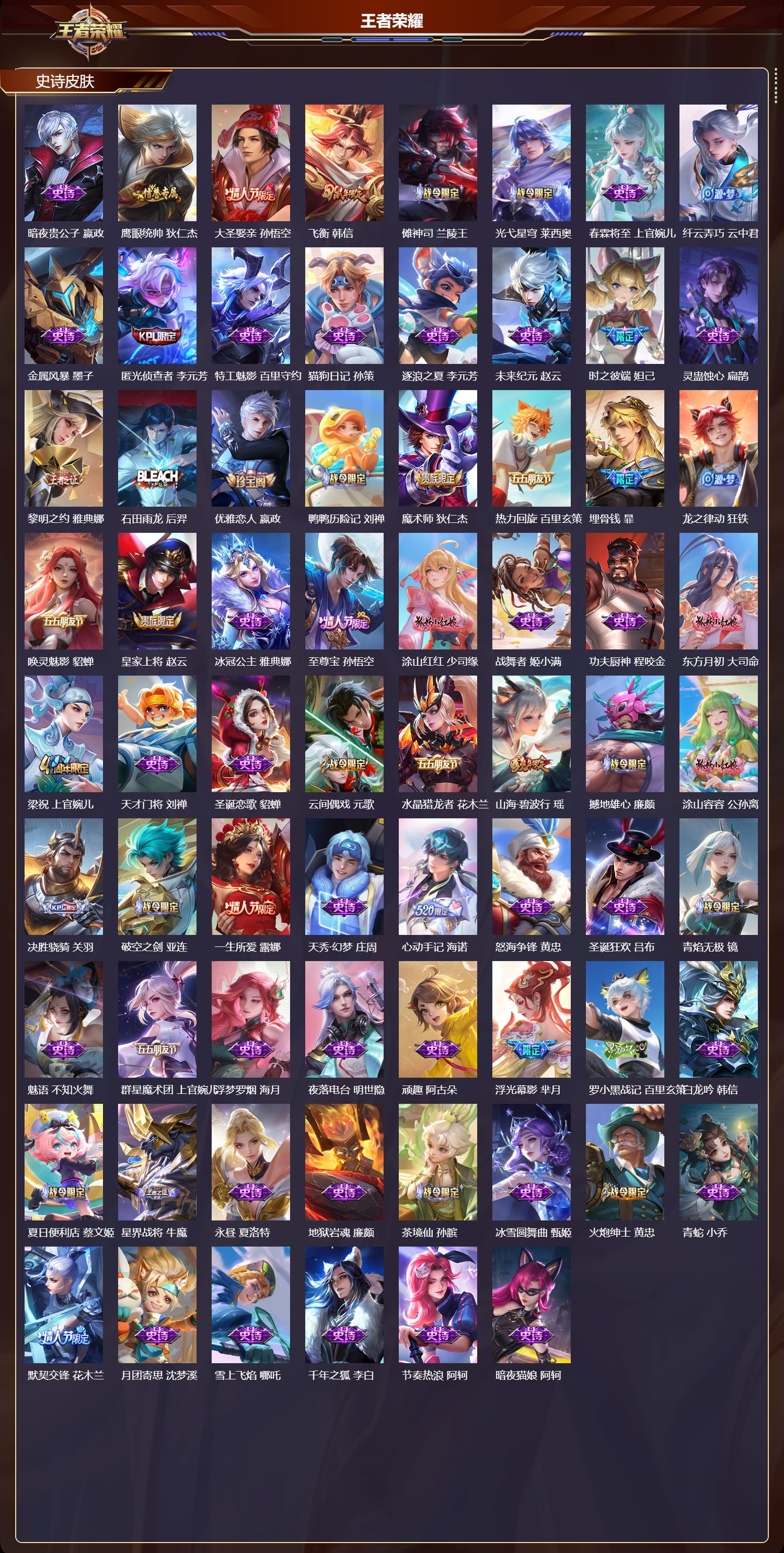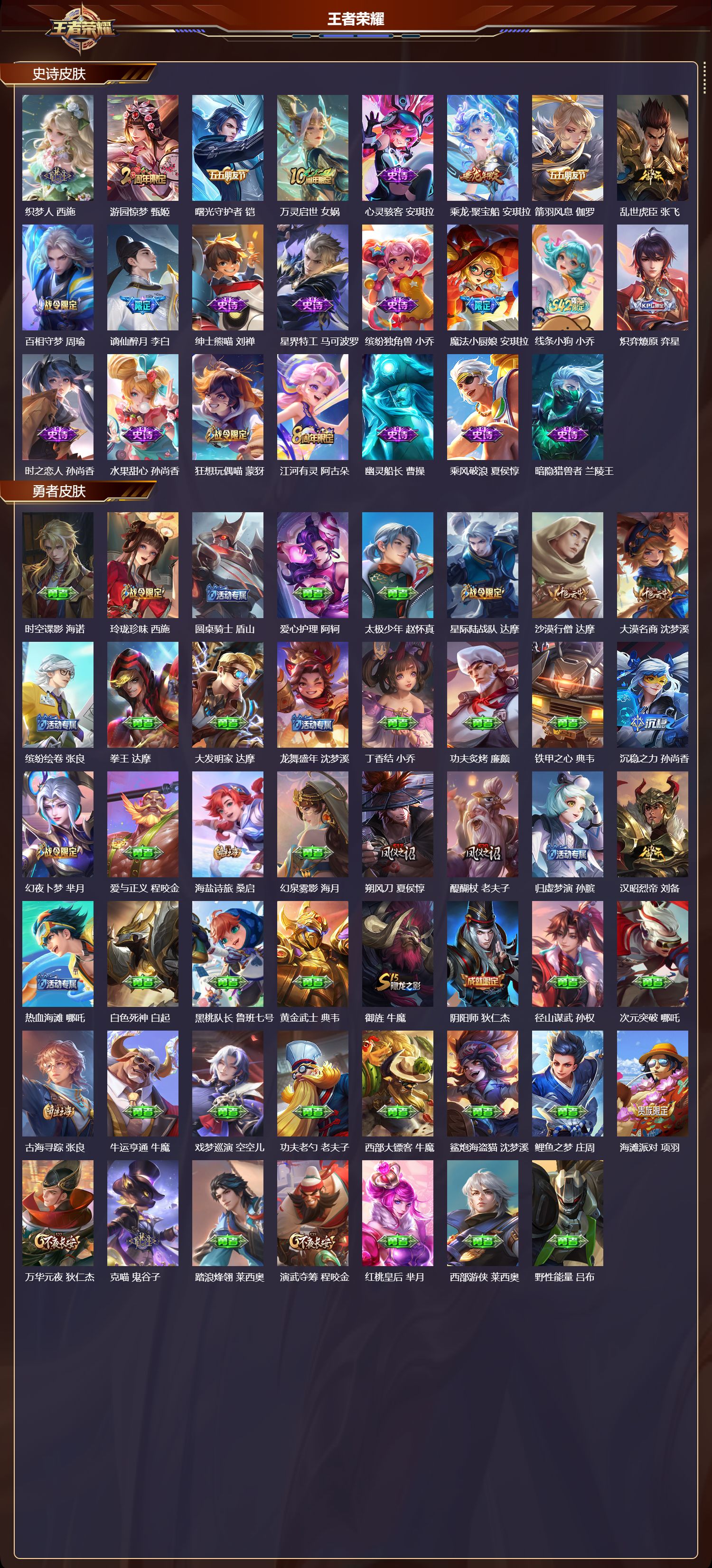 【150,史诗皮肤】,龙鼓争鸣,蒙犽,时之奇旅,安琪拉,电玩小子,鲁班七号,末日机甲,吕布,蔬乡物语,鲁班七号,紫霞仙子,露娜,奇遇舞章,艾琳,暗渊魔法,司马懿,乘龙·忆丹青,大乔,燃音魔法,高渐离,天秀·音浪,高渐离,白鹤梁神女,大乔,苍穹之光,项羽,天秀·启明,杨戬,狮舞东方,鲁班七号,猫狗日记,大乔,妄想食味,姬小满,德古拉伯爵,刘邦,心灵战警,亚瑟,五谷丰年,鬼谷子,银翎春语,杨玉环,诗语江南,西施,无心,元歌,戍鼓铭心,钟无艳,巫礼祀神,少司缘,鬼剑武藏,宫本武藏,百相守梦,黄忠,幻珠鲛人,朵莉亚,星夜王子,白起,守夜人,弈星,寅虎·心曲,杨玉环,无限星赏官,公孙离,千筹问战,张良,瓦猫非猫,太乙真人,线条小狗,周瑜,玉兔公主,公孙离,奇遇梦乡,蔡文姬,百晓客,明世隐,摇滚巨星,嬴政,电玩高手,狂铁,百相守梦,关羽,修罗,橘右京,魅力维加斯,妲己,黄金分割率,诸葛亮,热情桑巴,妲己,赞萌露比,云缨,滕王阁序,弈星,乐园奇幻夜,钟馗,凤凰于飞,王昭君,完美假期,米莱狄,女仆咖啡,妲己,白蛇,大乔,赏金猎手,澜,九幽镇关,项羽,晚萤,娜可露露,遇见神鹿,瑶,舞动绿茵,蔡文姬,暗夜贵公子,嬴政,鹰眼统帅,狄仁杰,大圣娶亲,孙悟空,飞衡,韩信,傩神司,兰陵王,光弋星穹,莱西奥,春霖将至,上官婉儿,纤云弄巧,云中君,金属风暴,墨子,匿光侦查者,李元芳,特工魅影,百里守约,猫狗日记,孙策,逐浪之夏,李元芳,未来纪元,赵云,时之彼端,妲己,灵蛊蚀心,扁鹊,黎明之约,雅典娜,石田雨龙,后羿,优雅恋人,嬴政,鸭鸭历险记,刘禅,魔术师,狄仁杰,热力回旋,百里玄策,埋骨钱,暃,龙之律动,狂铁,唤灵魅影,貂蝉,皇家上将,赵云,冰冠公主,雅典娜,至尊宝,孙悟空,涂山红红,少司缘,战舞者,姬小满,功夫厨神,程咬金,东方月初,大司命,梁祝,上官婉儿,天才门将,刘禅,圣诞恋歌,貂蝉,云间偶戏,元歌,水晶猎龙者,花木兰,山海·碧波行,瑶,撼地雄心,廉颇,涂山容容,公孙离,决胜骁骑,关羽,破空之剑,亚连,一生所爱,露娜,天秀·幻梦,庄周,心动手记,海诺,怒海争锋,黄忠,圣诞狂欢,吕布,青焰无极,镜,魅语,不知火舞,群星魔术团,上官婉儿,浮梦罗烟,海月,夜落电台,明世隐,顽趣,阿古朵,浮光幕影,芈月,罗小黑战记,百里玄策,白龙吟,韩信,夏日便利店,蔡文姬,星界战将,牛魔,永昼,夏洛特,地狱岩魂,廉颇,茶境仙,孙膑,冰雪圆舞曲,甄姬,火炮绅士,黄忠,青蛇,小乔,默契交锋,花木兰,月团寄思,沈梦溪,雪上飞焰,哪吒,千年之狐,李白,节奏热浪,阿轲,暗夜猫娘,阿轲,织梦人,西施,游园惊梦,甄姬,曙光守护者,铠,万灵启世,女娲,心灵骇客,安琪拉,乘龙·聚宝船,安琪拉,箭羽风息,伽罗,乱世虎臣,张飞,百相守梦,周瑜,谪仙醉月,李白,绅士熊喵,刘禅,星界特工,马可波罗,缤纷独角兽,小乔,魔法小厨娘,安琪拉,线条小狗,小乔,炽弈燎原,弈星,时之恋人,孙尚香,水果甜心,孙尚香,狂想玩偶喵,蒙犽,江河有灵,阿古朵,幽灵船长,曹操,乘风破浪,夏侯惇,暗隐猎兽者,兰陵王,