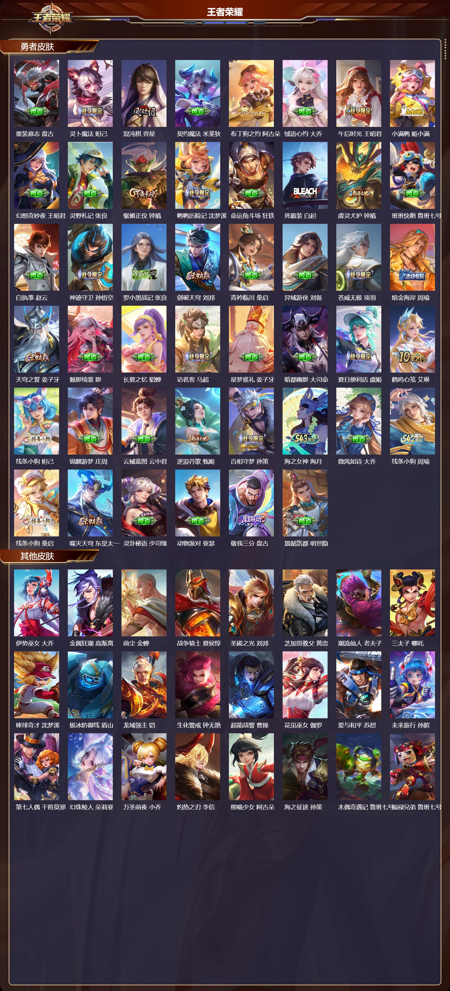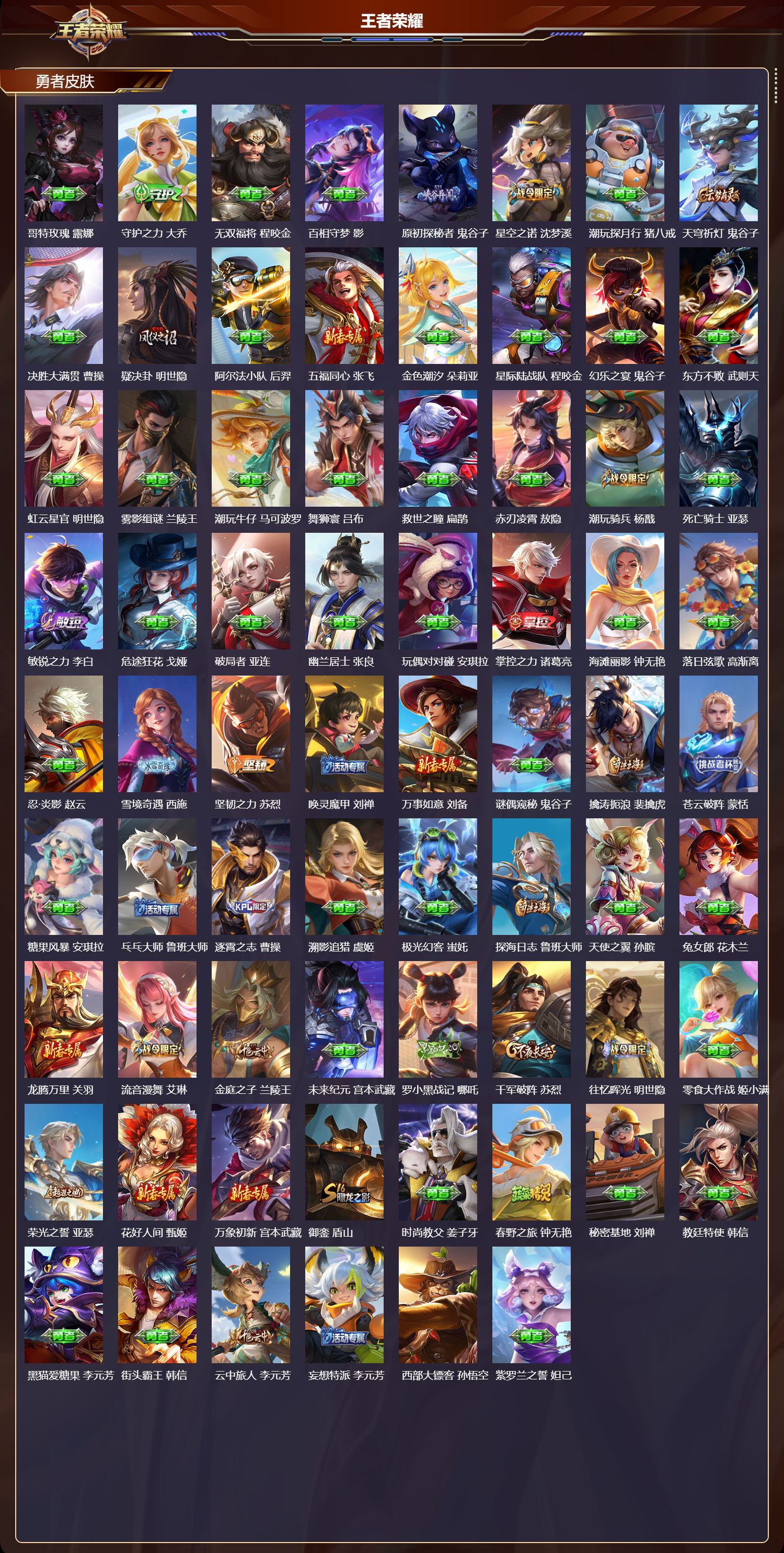 【163,勇者皮肤】,时空谍影,海诺,玲珑珍味,西施,圆桌骑士,盾山,爱心护理,阿轲,太极少年,赵怀真,星际陆战队,达摩,沙漠行僧,达摩,大漠名商,沈梦溪,缤纷绘卷,张良,拳王,达摩,大发明家,达摩,龙舞盛年,沈梦溪,丁香结,小乔,功夫炙烤,廉颇,铁甲之心,典韦,沉稳之力,孙尚香,幻夜卜梦,芈月,爱与正义,程咬金,海盐诗旅,桑启,幻泉雾影,海月,朔风刀,夏侯惇,醍醐杖,老夫子,归虚梦演,孙膑,汉昭烈帝,刘备,热血海滩,哪吒,白色死神,白起,黑桃队长,鲁班七号,黄金武士,典韦,御旌,牛魔,阴阳师,狄仁杰,径山谋武,孙权,次元突破,哪吒,古海寻踪,张良,牛运亨通,牛魔,戏梦巡演,空空儿,功夫老勺,老夫子,西部大镖客,牛魔,鲨炮海盗猫,沈梦溪,鲤鱼之梦,庄周,海滩派对,项羽,万华元夜,狄仁杰,克喵,鬼谷子,踏浪烽翎,莱西奥,演武夺筹,程咬金,红桃皇后,芈月,西部游侠,莱西奥,野性能量,吕布,哥特玫瑰,露娜,守护之力,大乔,无双福将,程咬金,百相守梦,影,原初探秘者,鬼谷子,星空之诺,沈梦溪,潮玩探月行,猪八戒,天穹祈灯,鬼谷子,决胜大满贯,曹操,疑决卦,明世隐,阿尔法小队,后羿,五福同心,张飞,金色潮汐,朵莉亚,星际陆战队,程咬金,幻乐之宴,鬼谷子,东方不败,武则天,虹云星官,明世隐,雾影缉谜,兰陵王,潮玩牛仔,马可波罗,舞狮寰,吕布,救世之瞳,扁鹊,赤刃凌霄,敖隐,潮玩骑兵,杨戬,死亡骑士,亚瑟,敏锐之力,李白,危途狂花,戈娅,破局者,亚连,幽兰居士,张良,玩偶对对碰,安琪拉,掌控之力,诸葛亮,海滩丽影,钟无艳,落日弦歌,高渐离,忍·炎影,赵云,雪境奇遇,西施,坚韧之力,苏烈,唤灵魔甲,刘禅,万事如意,刘备,谜偶窥秘,鬼谷子,擒涛扼浪,裴擒虎,苍云破阵,蒙恬,糖果风暴,安琪拉,乓乓大师,鲁班大师,逐霄之志,曹操,溯影追猎,虞姬,极光幻客,蚩奼,探海日志,鲁班大师,天使之翼,孙膑,兔女郎,花木兰,龙腾万里,关羽,流音漫舞,艾琳,金庭之子,兰陵王,未来纪元,宫本武藏,罗小黑战记,哪吒,千军破阵,苏烈,往忆晖光,明世隐,零食大作战,姬小满,荣光之誓,亚瑟,花好人间,甄姬,万象初新,宫本武藏,御銮,盾山,时尚教父,姜子牙,春野之旅,钟无艳,秘密基地,刘禅,教廷特使,韩信,黑猫爱糖果,李元芳,街头霸王,韩信,云中旅人,李元芳,妄想特派,李元芳,西部大镖客,孙悟空,紫罗兰之誓,妲己,重装意志,盘古,灵卜魔法,妲己,混沌棋,弈星,契约魔法,米莱狄,布丁狗之约,阿古朵,绒语心约,大乔,午后时光,王昭君,小满鸭,姬小满,幻想奇妙夜,王昭君,灵野札记,张良,驱傩正仪,钟馗,鸭鸭历险记,沈梦溪,命运角斗场,狂铁,死霸装,白起,虚灵犬护,钟馗,班班快跑,鲁班七号,白执事,赵云,神迹守卫,孙悟空,罗小黑战记,张良,剑破天穹,刘邦,青衿临川,桑启,异域游侠,刘备,苍威无极,项羽,熔金海岸,周瑜,天穹之誓,姜子牙,魅影绮裳,影,长夏之忆,貂蝉,访茗客,马超,星梦巡礼,姜子牙,暗都幽影,大司命,夏日便利店,虞姬,鹤鸣心笺,艾琳,线条小狗,妲己,锦麟游梦,庄周,云械蓝图,云中君,逆浪荇歌,甄姬,百相守梦,孙策,海之女神,海月,微风如诗,大乔,线条小狗,周瑜,线条小狗,桑启,噬灭天穹,东皇太一,灵卦秘语,少司缘,动物派对,亚瑟,敬我三分,盘古,景韶洛都,明世隐,