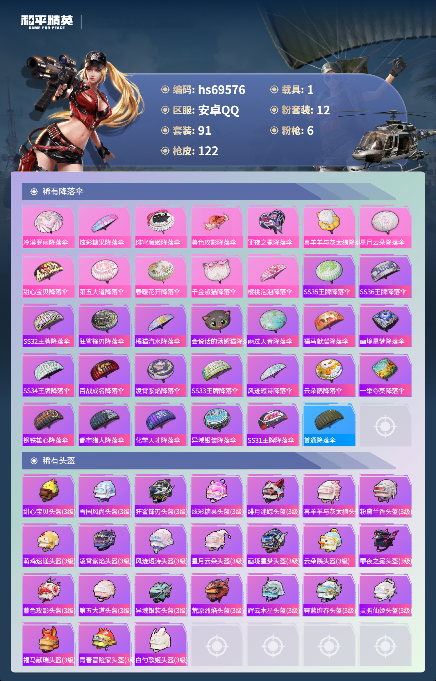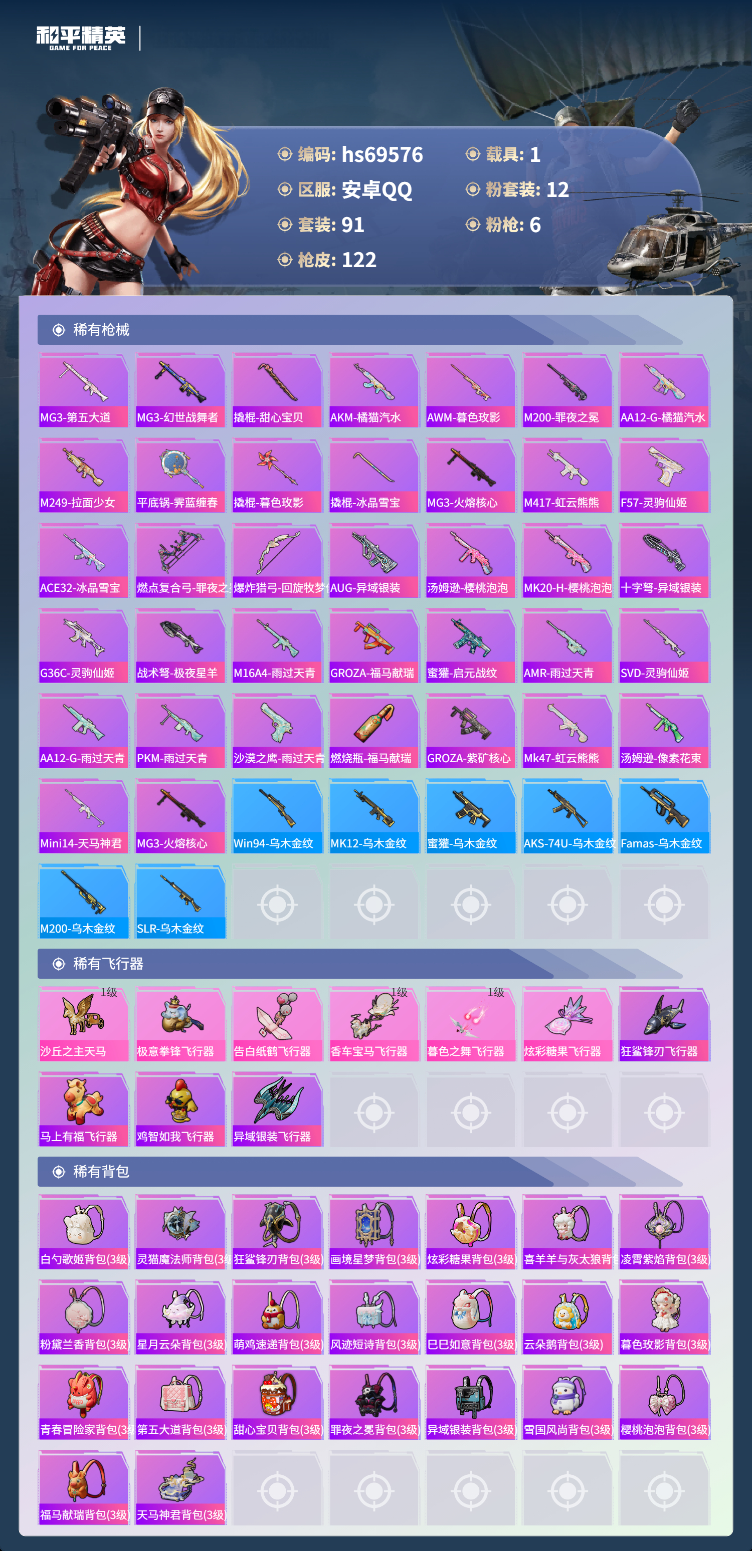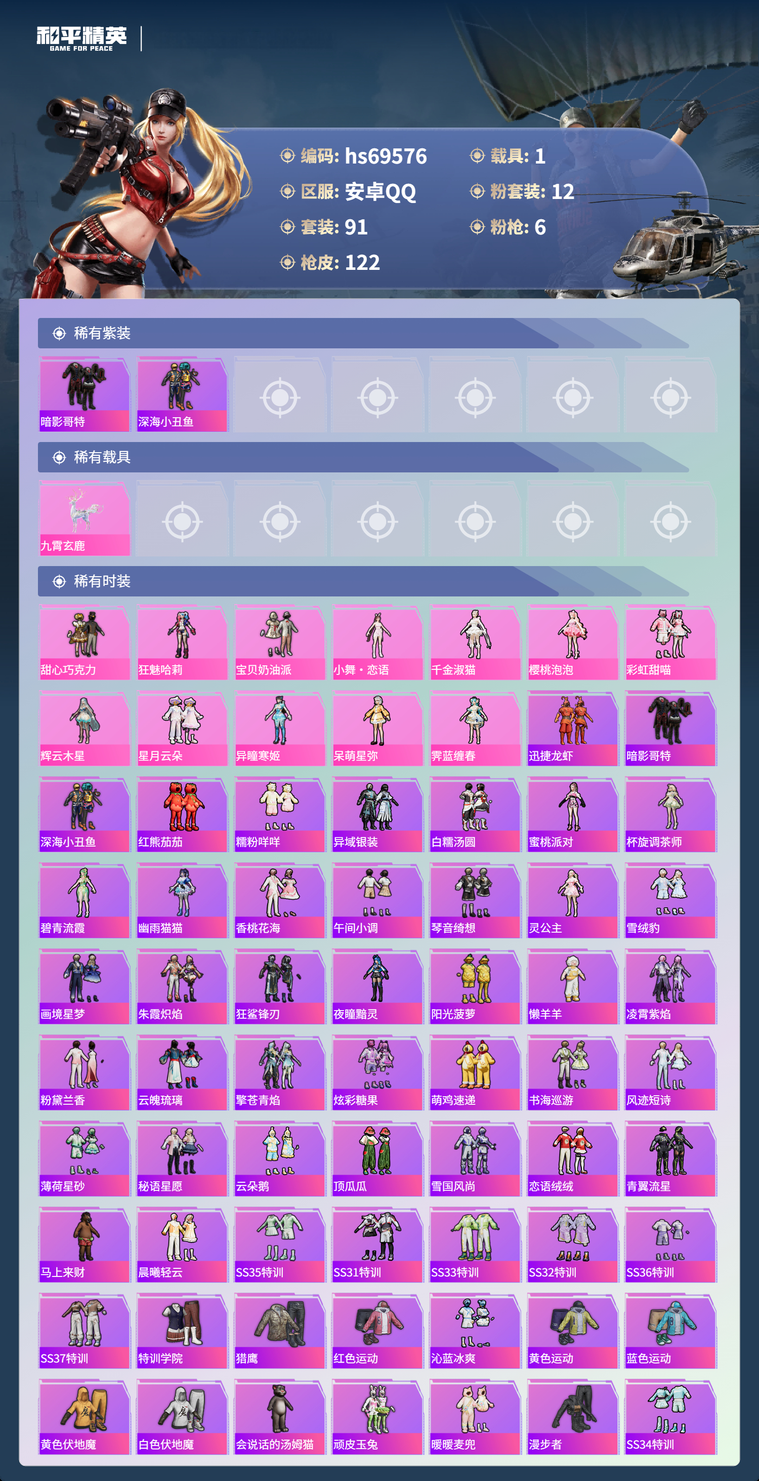 PX_2568090-,安卓手Q-7王牌印记-12粉装-6特效枪-1载具-39319热力值-91套装-122枪皮-3卓越印记-2传奇印记