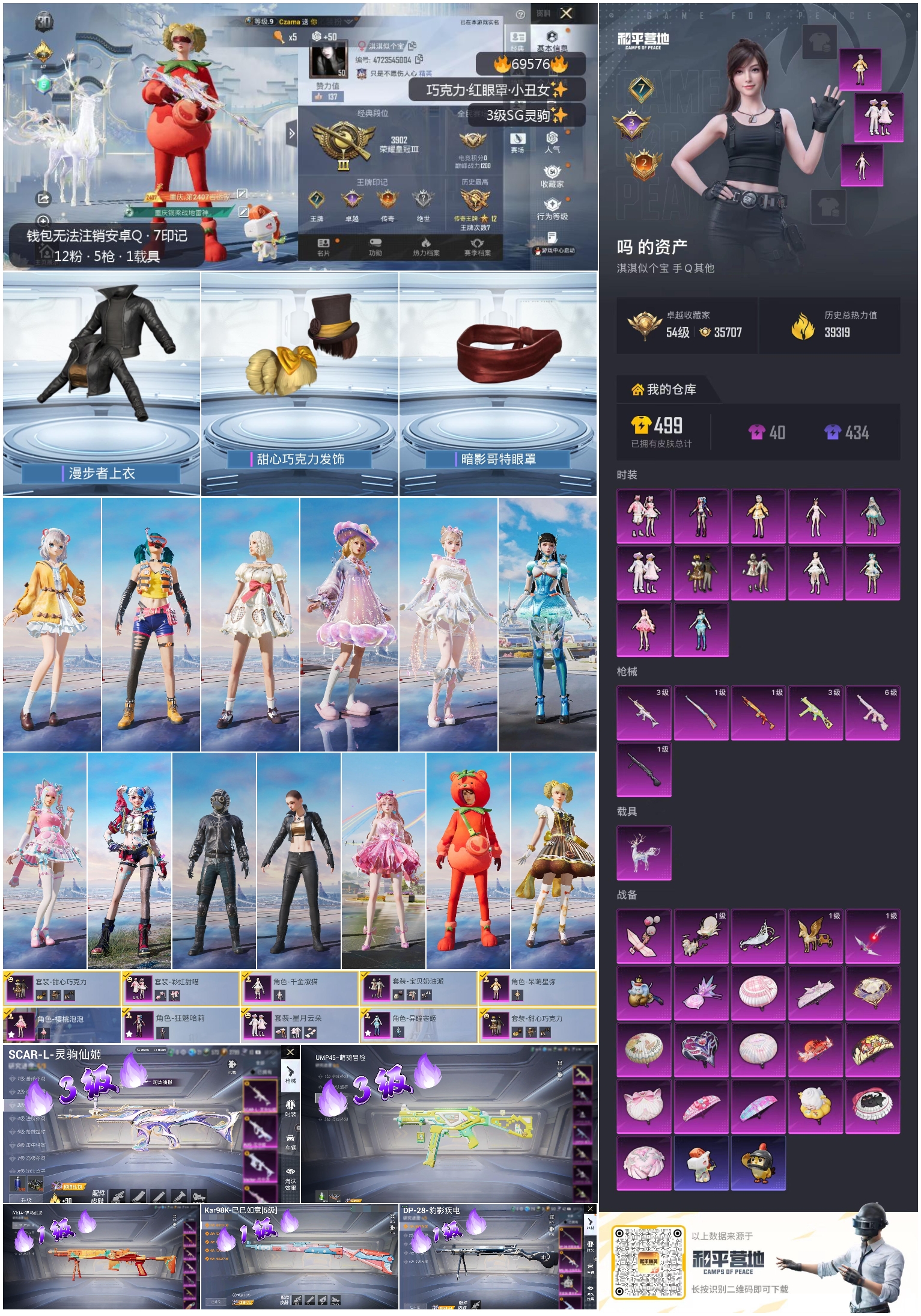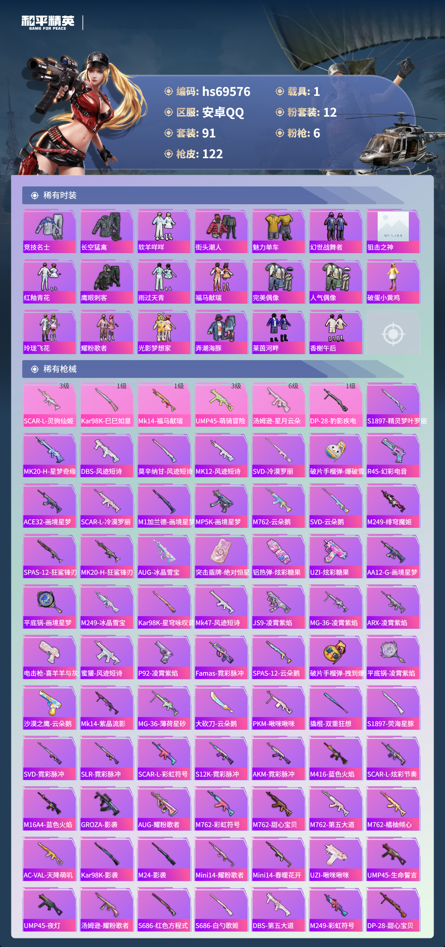 【121稀有枪械】SCAR-L-灵驹仙姬/3级,Kar98K-巳巳如意/1级,Mk14-福马献瑞/1级,UMP45-萌骑冒险/3级,汤姆逊-星月云朵/6级,DP-28-豹影疾电/1级,S1897-精灵梦叶罗丽,MK20-H-星梦奇缘,DBS-风迹短诗,莫辛纳甘-风迹短诗,Win94-乌木金纹,MK12-风迹短诗,MK12-乌木金纹,SVD-冷漠罗丽,破片手榴弹-爆破雪人,R45-幻彩电音,ACE32-画境星梦,SCAR-L-冷漠罗丽,M1加兰德-画境星梦,MP5K-画境星梦,蜜獾-乌木金纹,M762-云朵鹅,SVD-云朵鹅,M249-绯穹魔姬,SPAS-12-狂鲨锋刃,MK20-H-狂鲨锋刃,AUG-冰晶雪宝,突击盾牌-绝对恒星,铝热弹-炫彩糖果,UZI-炫彩糖果,AA12-G-画境星梦,平底锅-画境星梦,M249-冰晶雪宝,Kar98K-星穹咏叹调,Mk47-风迹短诗,JS9-凌霄紫焰,MG-36-凌霄紫焰,ARX-凌霄紫焰,AKS-74U-乌木金纹,电击枪-喜羊羊与灰太狼,蜜獾-风迹短诗,P92-凌霄紫焰,Famas-乌木金纹,Famas-霓彩脉冲,SPAS-12-云朵鹅,破片手榴弹-拽到爆炸,平底锅-凌霄紫焰,沙漠之鹰-云朵鹅,Mk14-紫晶流影,MG-36-薄荷星砂,大砍刀-云朵鹅,PKM-啾咪啾咪,撬棍-双重狂想,S1897-荧海星豚,SVD-霓彩脉冲,SLR-霓彩脉冲,SCAR-L-彩虹符号,S12K-霓彩脉冲,AKM-霓彩脉冲,M416-蓝色火焰,SCAR-L-炫彩节奏,M16A4-蓝色火焰,GROZA-影袭,AUG-耀粉歌者,M762-彩虹符号,M762-甜心宝贝,M762-第五大道,M762-橘柚倾心,AC-VAL-天降萌叽,Kar98K-影袭,M24-影袭,Mini14-耀粉歌者,Mini14-春暖花开,UZI-啾咪啾咪,UMP45-生命誓言,UMP45-夜灯,汤姆逊-耀粉歌者,S686-红色方程式,S686-白勺歌姬,DBS-第五大道,M249-彩虹符号,DP-28-甜心宝贝,MG3-第五大道,MG3-幻世战舞者,撬棍-甜心宝贝,AKM-橘猫汽水,AWM-暮色玫影,M200-罪夜之冕,AA12-G-橘猫汽水,M249-拉面少女,平底锅-霁蓝缠春,撬棍-暮色玫影,撬棍-冰晶雪宝,MG3-火熔核心,M417-虹云熊熊,F57-灵驹仙姬,ACE32-冰晶雪宝,燃点复合弓-罪夜之冕,爆炸猎弓-回旋牧梦使,AUG-异域银装,汤姆逊-樱桃泡泡,MK20-H-樱桃泡泡,M200-乌木金纹,十字弩-异域银装,G36C-灵驹仙姬,战术弩-极夜星羊,M16A4-雨过天青,GROZA-福马献瑞,蜜獾-启元战纹,AMR-雨过天青,SLR-乌木金纹,SVD-灵驹仙姬,AA12-G-雨过天青,PKM-雨过天青,沙漠之鹰-雨过天青,燃烧瓶-福马献瑞,GROZA-紫矿核心,Mk47-虹云熊熊,汤姆逊-像素花束,Mini14-天马神君,MG3-火熔核心