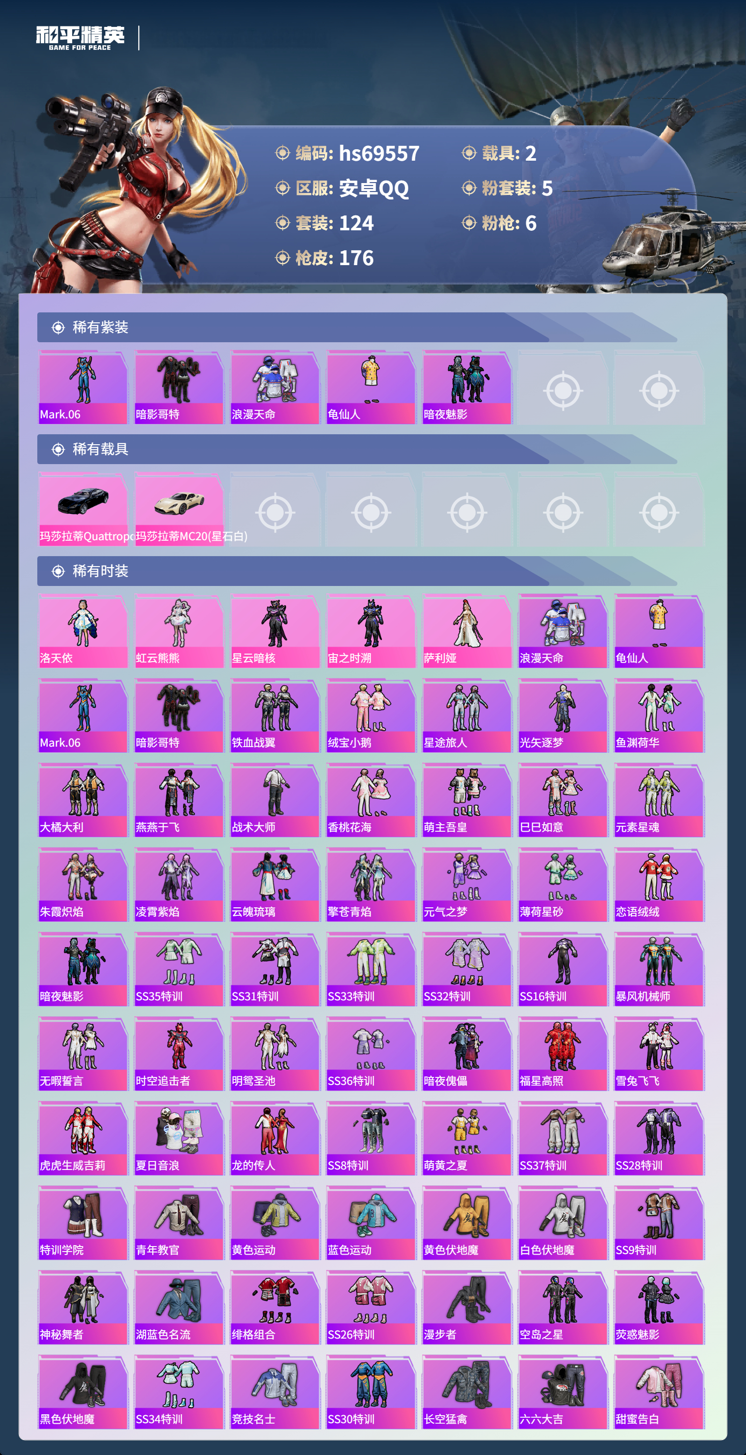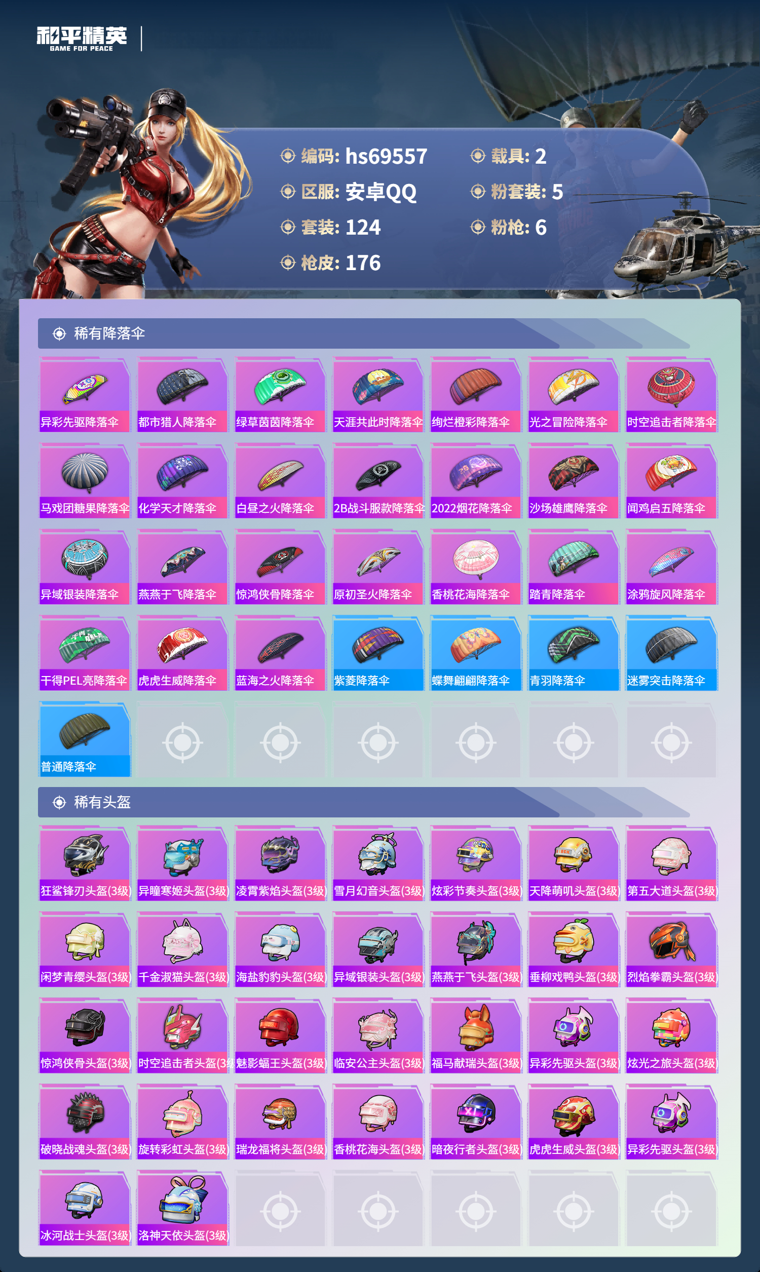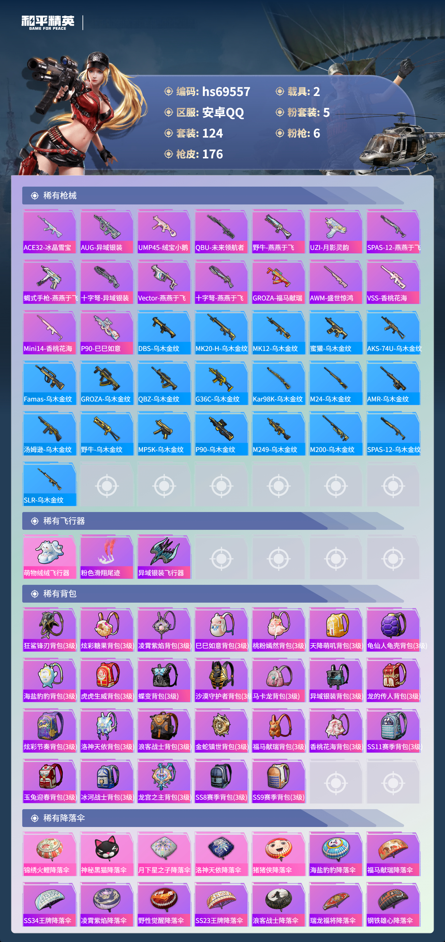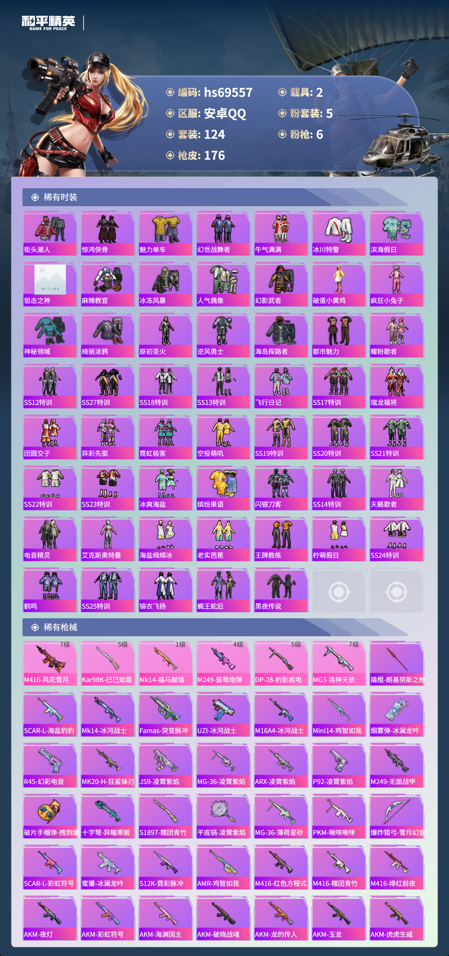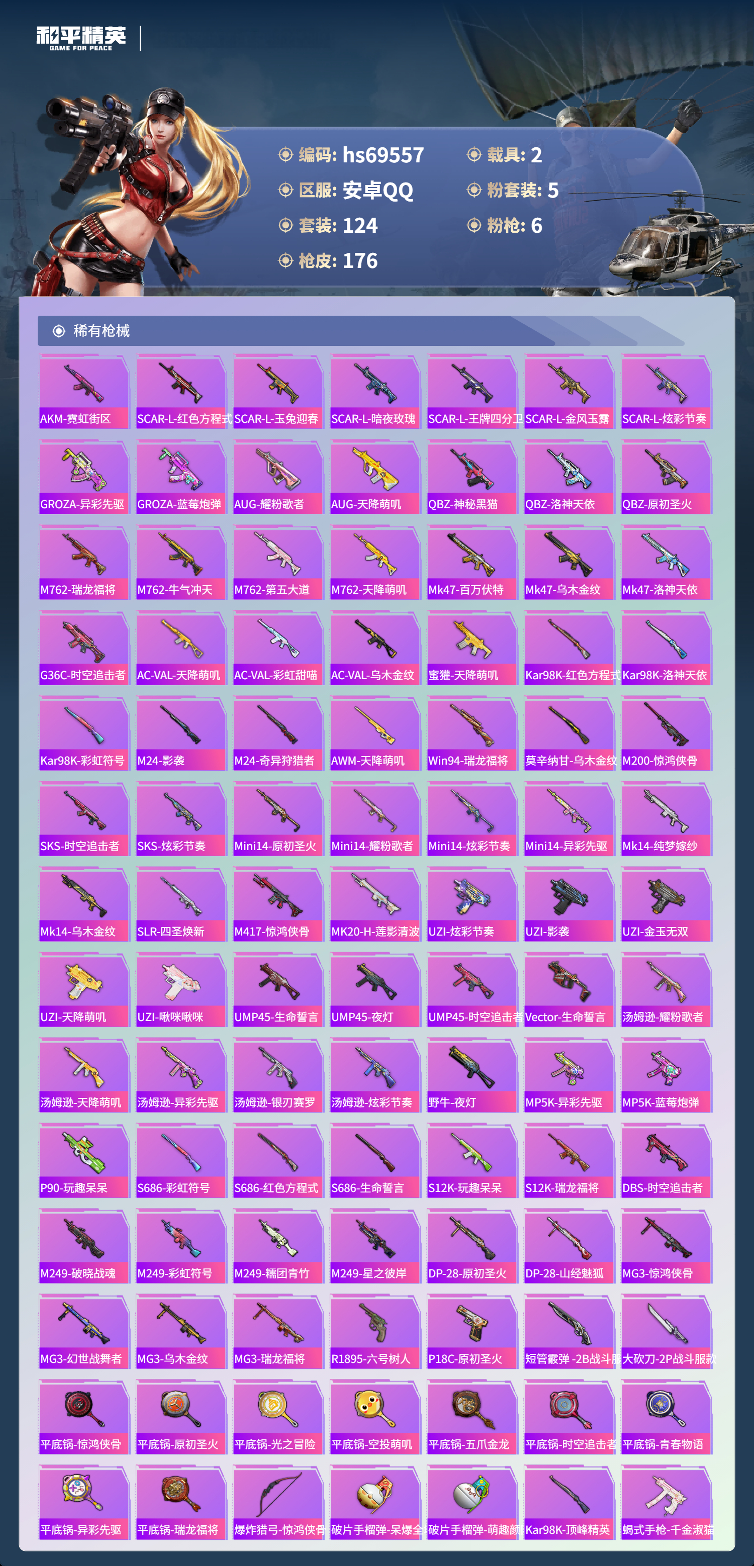 【176稀有枪械】M416-风花雪月/7级,Kar98K-巳巳如意/5级,Mk14-福马献瑞/1级,M249-蓝莓炮弹/4级,DP-28-豹影疾电/5级,MG3-洛神天依/7级,DBS-乌木金纹,撬棍-朗基努斯之枪,SCAR-L-海盐豹豹,Mk14-冰河战士,Famas-突变脉冲,UZI-冰河战士,M16A4-冰河战士,MK20-H-乌木金纹,Mini14-鸡智如我,MK12-乌木金纹,烟雾弹-冰澜龙吟,R45-幻彩电音,蜜獾-乌木金纹,MK20-H-狂鲨锋刃,JS9-凌霄紫焰,MG-36-凌霄紫焰,ARX-凌霄紫焰,AKS-74U-乌木金纹,P92-凌霄紫焰,Famas-乌木金纹,M249-无面战甲,破片手榴弹-拽到爆炸,十字弩-异瞳寒姬,S1897-糯团青竹,平底锅-凌霄紫焰,MG-36-薄荷星砂,PKM-啾咪啾咪,爆炸猎弓-雪月幻音,SCAR-L-彩虹符号,蜜獾-冰澜龙吟,S12K-霓彩脉冲,AMR-鸡智如我,M416-红色方程式,M416-糯团青竹,M416-绯红前夜,AKM-夜灯,AKM-彩虹符号,AKM-海渊国主,AKM-破晓战魂,AKM-龙的传人,AKM-玉龙,AKM-虎虎生威,AKM-霓虹街区,SCAR-L-红色方程式,SCAR-L-玉兔迎春,SCAR-L-暗夜玫瑰,SCAR-L-王牌四分卫,SCAR-L-金风玉露,SCAR-L-炫彩节奏,GROZA-乌木金纹,GROZA-异彩先驱,GROZA-蓝莓炮弹,AUG-耀粉歌者,AUG-天降萌叽,QBZ-神秘黑猫,QBZ-洛神天依,QBZ-原初圣火,QBZ-乌木金纹,M762-瑞龙福将,M762-牛气冲天,M762-第五大道,M762-天降萌叽,Mk47-百万伏特,Mk47-乌木金纹,Mk47-洛神天依,G36C-乌木金纹,G36C-时空追击者,AC-VAL-天降萌叽,AC-VAL-彩虹甜喵,AC-VAL-乌木金纹,蜜獾-天降萌叽,Kar98K-乌木金纹,Kar98K-红色方程式,Kar98K-洛神天依,Kar98K-彩虹符号,M24-乌木金纹,M24-影袭,M24-奇异狩猎者,AWM-天降萌叽,Win94-瑞龙福将,莫辛纳甘-乌木金纹,AMR-乌木金纹,M200-惊鸿侠骨,SKS-时空追击者,SKS-炫彩节奏,Mini14-原初圣火,Mini14-耀粉歌者,Mini14-炫彩节奏,Mini14-异彩先驱,Mk14-纯梦嫁纱,Mk14-乌木金纹,SLR-四圣焕新,M417-惊鸿侠骨,MK20-H-莲影清波,UZI-炫彩节奏,UZI-影袭,UZI-金玉无双,UZI-天降萌叽,UZI-啾咪啾咪,UMP45-生命誓言,UMP45-夜灯,UMP45-时空追击者,Vector-生命誓言,汤姆逊-耀粉歌者,汤姆逊-天降萌叽,汤姆逊-乌木金纹,汤姆逊-异彩先驱,汤姆逊-银刃赛罗,汤姆逊-炫彩节奏,野牛-乌木金纹,野牛-夜灯,MP5K-异彩先驱,MP5K-蓝莓炮弹,MP5K-乌木金纹,P90-乌木金纹,P90-玩趣呆呆,S686-彩虹符号,S686-红色方程式,S686-生命誓言,S12K-玩趣呆呆,S12K-瑞龙福将,DBS-时空追击者,M249-破晓战魂,M249-彩虹符号,M249-糯团青竹,M249-乌木金纹,M249-星之彼岸,DP-28-原初圣火,DP-28-山经魅狐,MG3-惊鸿侠骨,MG3-幻世战舞者,MG3-乌木金纹,MG3-瑞龙福将,R1895-六号树人,P18C-原初圣火,短管霰弹,-2B战斗服款,大砍刀-2P战斗服款,平底锅-惊鸿侠骨,平底锅-原初圣火,平底锅-光之冒险,平底锅-空投萌叽,平底锅-五爪金龙,平底锅-时空追击者,平底锅-青春物语,平底锅-异彩先驱,平底锅-瑞龙福将,爆炸猎弓-惊鸿侠骨,破片手榴弹-呆爆全场,破片手榴弹-萌趣颜团子,Kar98K-顶峰精英,蝎式手枪-千金淑猫,ACE32-冰晶雪宝,AUG-异域银装,UMP45-绒宝小鹅,QBU-未来领航者,野牛-燕燕于飞,UZI-月影灵韵,M200-乌木金纹,SPAS-12-燕燕于飞,蝎式手枪-燕燕于飞,十字弩-异域银装,SPAS-12-乌木金纹,Vector-燕燕于飞,十字弩-燕燕于飞,GROZA-福马献瑞,SLR-乌木金纹,AWM-盛世惊鸿,VSS-香桃花海,Mini14-香桃花海,P90-巳巳如意