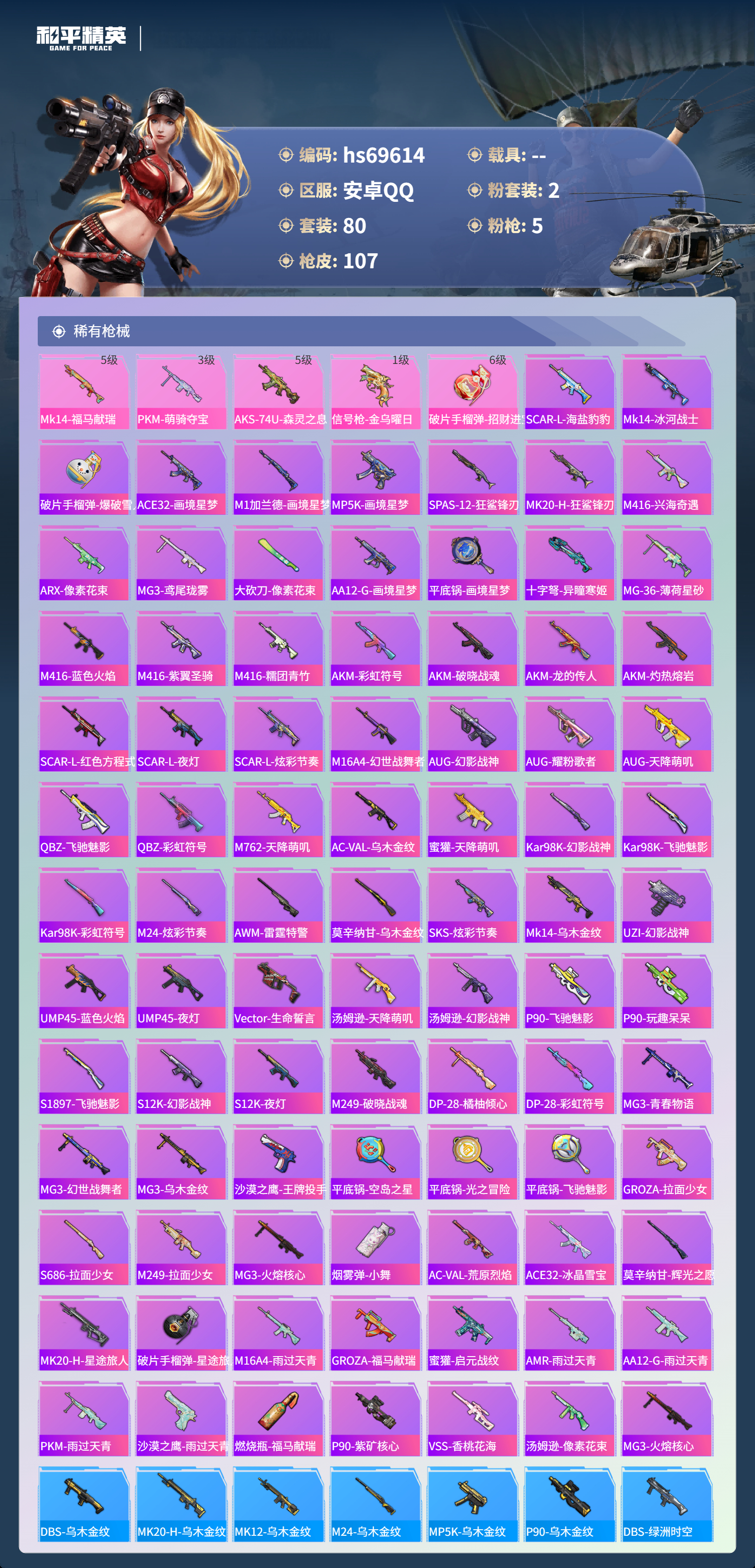 【101稀有枪械】Mk14-福马献瑞/5级,PKM-萌骑夺宝/3级,AKS-74U-森灵之息/5级,信号枪-金乌曜日/1级,破片手榴弹-招财进宝/6级,DBS-乌木金纹,SCAR-L-海盐豹豹,Mk14-冰河战士,MK20-H-乌木金纹,MK12-乌木金纹,破片手榴弹-爆破雪人,ACE32-画境星梦,M1加兰德-画境星梦,MP5K-画境星梦,SPAS-12-狂鲨锋刃,MK20-H-狂鲨锋刃,M416-兴海奇遇,ARX-像素花束,MG3-鸢尾珑雾,大砍刀-像素花束,AA12-G-画境星梦,平底锅-画境星梦,十字弩-异瞳寒姬,MG-36-薄荷星砂,M416-蓝色火焰,M416-紫翼圣骑,M416-糯团青竹,AKM-彩虹符号,AKM-破晓战魂,AKM-龙的传人,AKM-灼热熔岩,SCAR-L-红色方程式,SCAR-L-夜灯,SCAR-L-炫彩节奏,M16A4-幻世战舞者,AUG-幻影战神,AUG-耀粉歌者,AUG-天降萌叽,QBZ-飞驰魅影,QBZ-彩虹符号,M762-天降萌叽,AC-VAL-乌木金纹,蜜獾-天降萌叽,Kar98K-幻影战神,Kar98K-飞驰魅影,Kar98K-彩虹符号,M24-乌木金纹,M24-炫彩节奏,AWM-雷霆特警,莫辛纳甘-乌木金纹,SKS-炫彩节奏,Mk14-乌木金纹,UZI-幻影战神,UMP45-蓝色火焰,UMP45-夜灯,Vector-生命誓言,汤姆逊-天降萌叽,汤姆逊-幻影战神,MP5K-乌木金纹,P90-乌木金纹,P90-飞驰魅影,P90-玩趣呆呆,S1897-飞驰魅影,S12K-幻影战神,S12K-夜灯,M249-破晓战魂,DP-28-橘柚倾心,DP-28-彩虹符号,MG3-青春物语,MG3-幻世战舞者,MG3-乌木金纹,沙漠之鹰-王牌投手,平底锅-空岛之星,平底锅-光之冒险,平底锅-飞驰魅影,GROZA-拉面少女,S686-拉面少女,M249-拉面少女,DBS-绿洲时空,MG3-火熔核心,烟雾弹-小舞,AC-VAL-荒原烈焰,ACE32-冰晶雪宝,莫辛纳甘-辉光之愿,MK20-H-星途旅人,SPAS-12-乌木金纹,破片手榴弹-星途旅人,M16A4-雨过天青,GROZA-福马献瑞,蜜獾-启元战纹,AMR-雨过天青,SLR-乌木金纹,AA12-G-雨过天青,PKM-雨过天青,沙漠之鹰-雨过天青,燃烧瓶-福马献瑞,P90-紫矿核心,VSS-香桃花海,汤姆逊-像素花束,DBS-绿洲时空,MG3-火熔核心