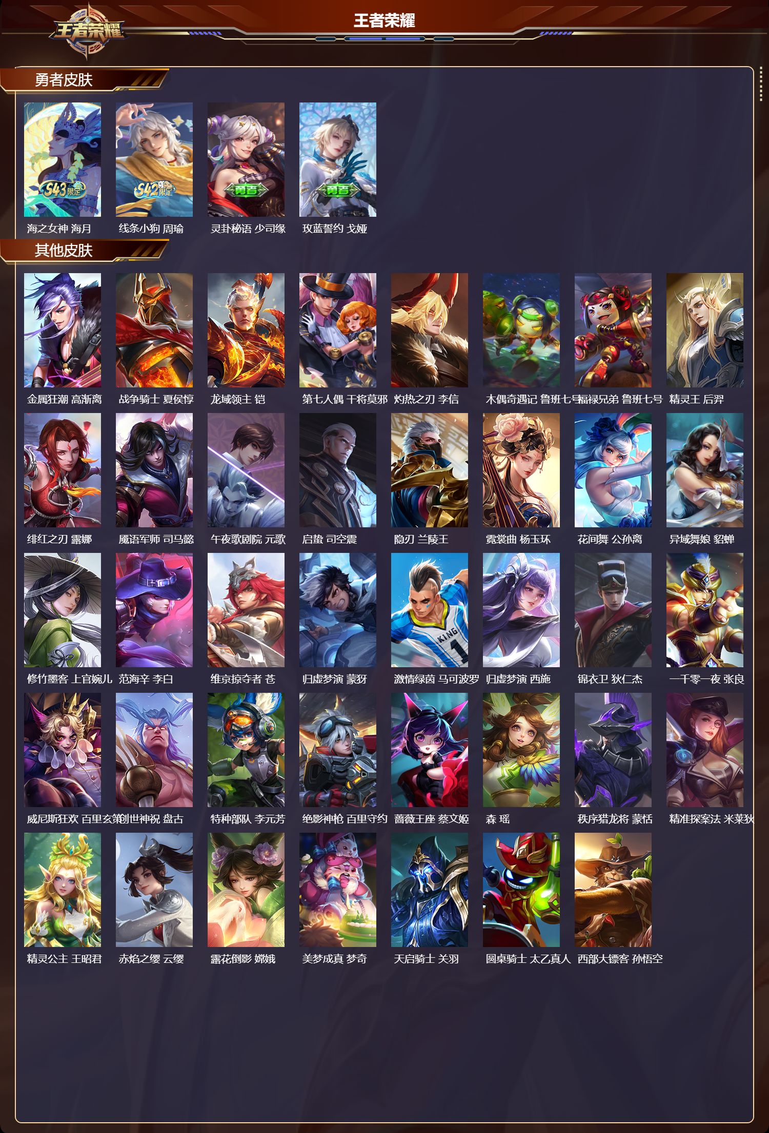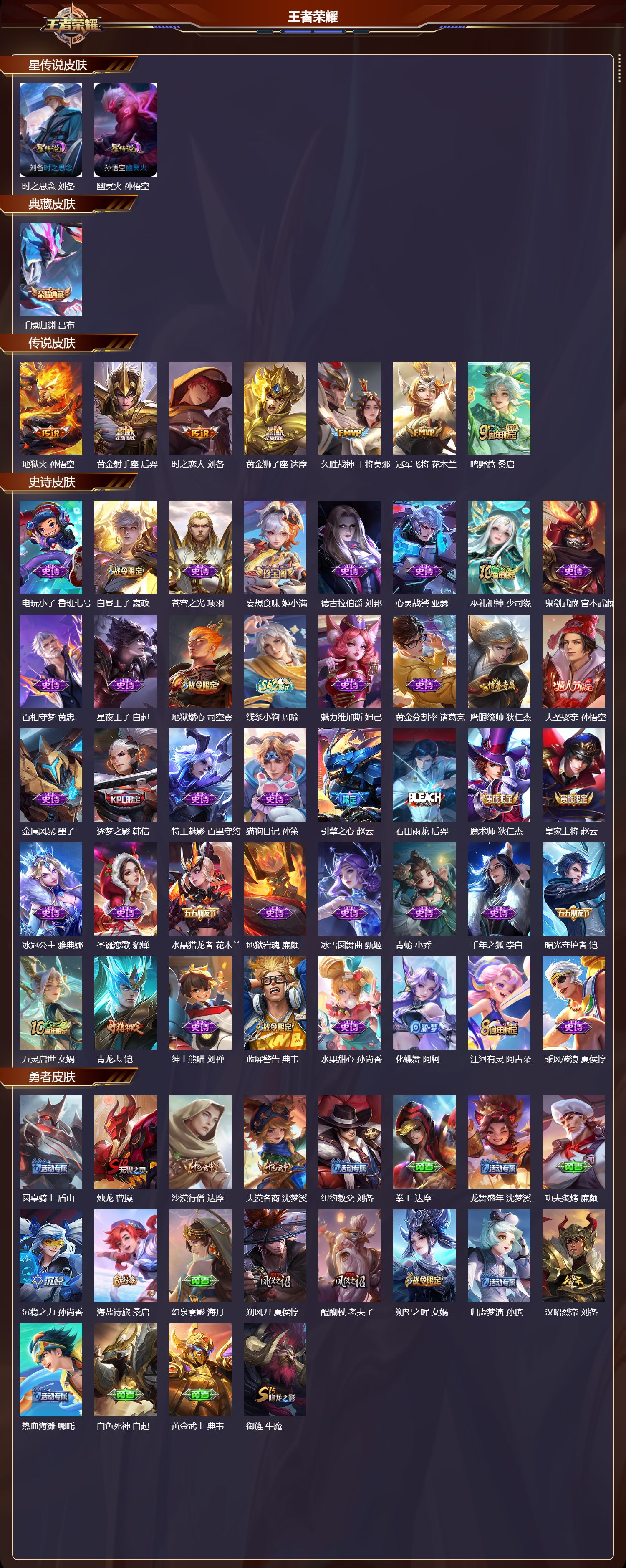 【40,史诗皮肤】,电玩小子,鲁班七号,白昼王子,嬴政,苍穹之光,项羽,妄想食味,姬小满,德古拉伯爵,刘邦,心灵战警,亚瑟,巫礼祀神,少司缘,鬼剑武藏,宫本武藏,百相守梦,黄忠,星夜王子,白起,地狱燃心,司空震,线条小狗,周瑜,魅力维加斯,妲己,黄金分割率,诸葛亮,鹰眼统帅,狄仁杰,大圣娶亲,孙悟空,金属风暴,墨子,逐梦之影,韩信,特工魅影,百里守约,猫狗日记,孙策,引擎之心,赵云,石田雨龙,后羿,魔术师,狄仁杰,皇家上将,赵云,冰冠公主,雅典娜,圣诞恋歌,貂蝉,水晶猎龙者,花木兰,地狱岩魂,廉颇,冰雪圆舞曲,甄姬,青蛇,小乔,千年之狐,李白,曙光守护者,铠,万灵启世,女娲,青龙志,铠,绅士熊喵,刘禅,蓝屏警告,典韦,水果甜心,孙尚香,化蝶舞,阿轲,江河有灵,阿古朵,乘风破浪,夏侯惇,