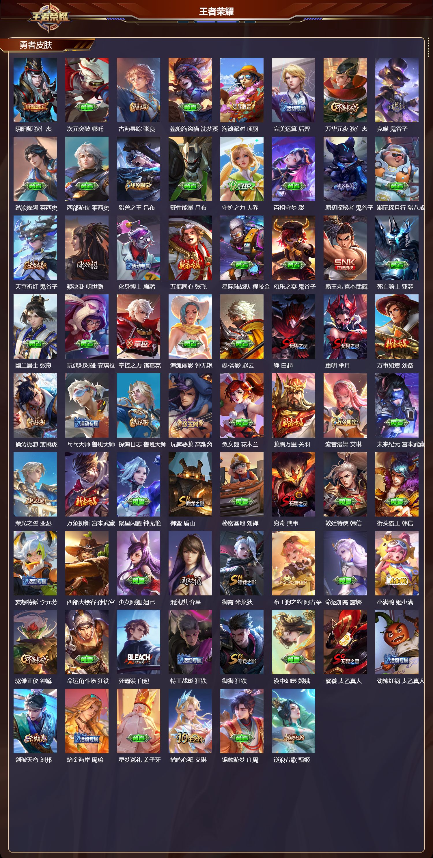【94,勇者皮肤】,圆桌骑士,盾山,烛龙,曹操,沙漠行僧,达摩,大漠名商,沈梦溪,纽约教父,刘备,拳王,达摩,龙舞盛年,沈梦溪,功夫炙烤,廉颇,沉稳之力,孙尚香,海盐诗旅,桑启,幻泉雾影,海月,朔风刀,夏侯惇,醍醐杖,老夫子,朔望之晖,女娲,归虚梦演,孙膑,汉昭烈帝,刘备,热血海滩,哪吒,白色死神,白起,黄金武士,典韦,御旌,牛魔,阴阳师,狄仁杰,次元突破,哪吒,古海寻踪,张良,鲨炮海盗猫,沈梦溪,海滩派对,项羽,完美运算,后羿,万华元夜,狄仁杰,克喵,鬼谷子,踏浪烽翎,莱西奥,西部游侠,莱西奥,猎兽之王,吕布,野性能量,吕布,守护之力,大乔,百相守梦,影,原初探秘者,鬼谷子,潮玩探月行,猪八戒,天穹祈灯,鬼谷子,疑决卦,明世隐,化身博士,扁鹊,五福同心,张飞,星际陆战队,程咬金,幻乐之宴,鬼谷子,霸王丸,宫本武藏,死亡骑士,亚瑟,幽兰居士,张良,玩偶对对碰,安琪拉,掌控之力,诸葛亮,海滩丽影,钟无艳,忍·炎影,赵云,狰,白起,重明,芈月,万事如意,刘备,擒涛扼浪,裴擒虎,乓乓大师,鲁班大师,探海日志,鲁班大师,玩趣恶龙,高渐离,兔女郎,花木兰,龙腾万里,关羽,流音漫舞,艾琳,未来纪元,宫本武藏,荣光之誓,亚瑟,万象初新,宫本武藏,聚星闪耀,钟无艳,御銮,盾山,秘密基地,刘禅,穷奇,典韦,教廷特使,韩信,街头霸王,韩信,妄想特派,李元芳,西部大镖客,孙悟空,少女阿狸,妲己,混沌棋,弈星,御霄,米莱狄,布丁狗之约,阿古朵,命运加冕,露娜,小满鸭,姬小满,驱傩正仪,钟馗,命运角斗场,狂铁,死霸装,白起,特工战影,狂铁,御狮,狂铁,漠中幻影,嫦娥,饕餮,太乙真人,劲辣红锅,太乙真人,剑破天穹,刘邦,熔金海岸,周瑜,星梦巡礼,姜子牙,鹤鸣心笺,艾琳,锦麟游梦,庄周,逆浪荇歌,甄姬,海之女神,海月,线条小狗,周瑜,灵卦秘语,少司缘,玫蓝誓约,戈娅,