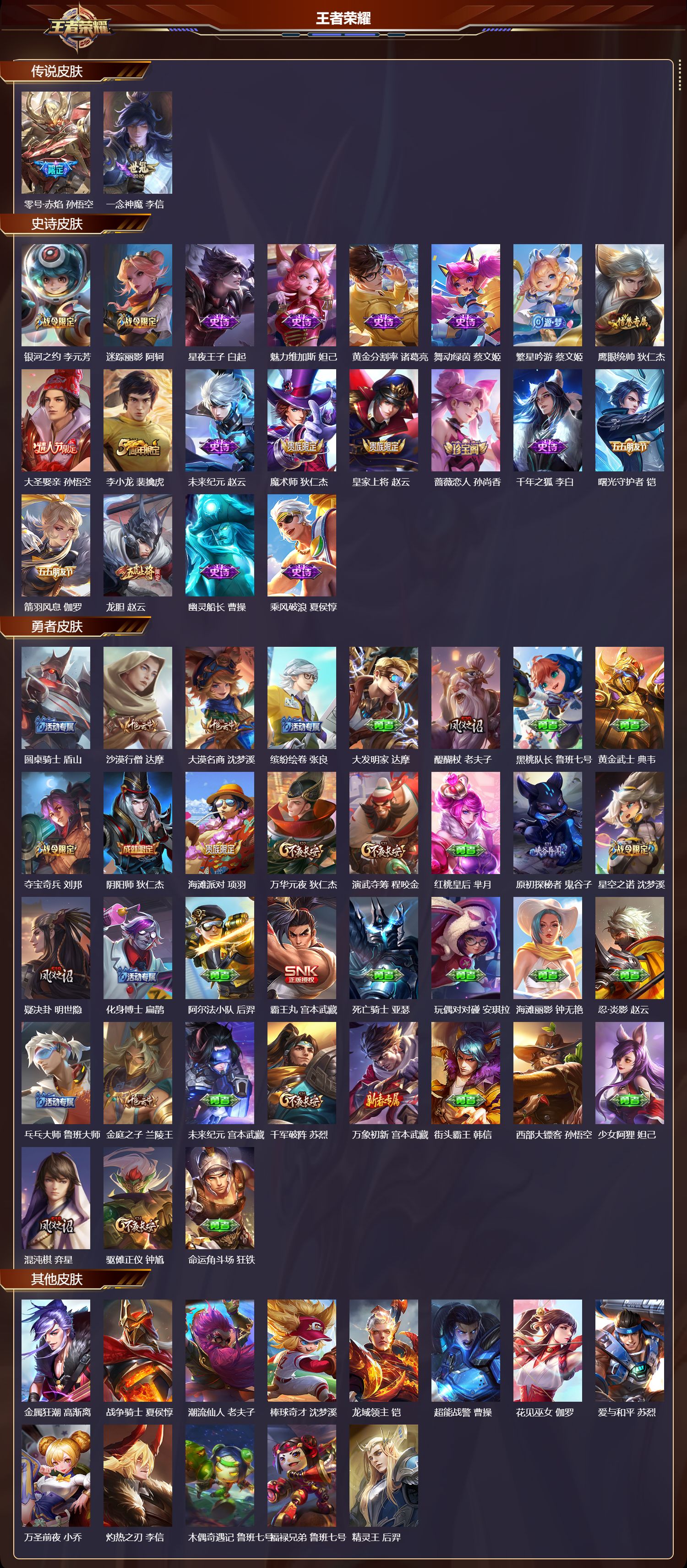 【35,勇者皮肤】,圆桌骑士,盾山,沙漠行僧,达摩,大漠名商,沈梦溪,缤纷绘卷,张良,大发明家,达摩,醍醐杖,老夫子,黑桃队长,鲁班七号,黄金武士,典韦,夺宝奇兵,刘邦,阴阳师,狄仁杰,海滩派对,项羽,万华元夜,狄仁杰,演武夺筹,程咬金,红桃皇后,芈月,原初探秘者,鬼谷子,星空之诺,沈梦溪,疑决卦,明世隐,化身博士,扁鹊,阿尔法小队,后羿,霸王丸,宫本武藏,死亡骑士,亚瑟,玩偶对对碰,安琪拉,海滩丽影,钟无艳,忍·炎影,赵云,乓乓大师,鲁班大师,金庭之子,兰陵王,未来纪元,宫本武藏,千军破阵,苏烈,万象初新,宫本武藏,街头霸王,韩信,西部大镖客,孙悟空,少女阿狸,妲己,混沌棋,弈星,驱傩正仪,钟馗,命运角斗场,狂铁,