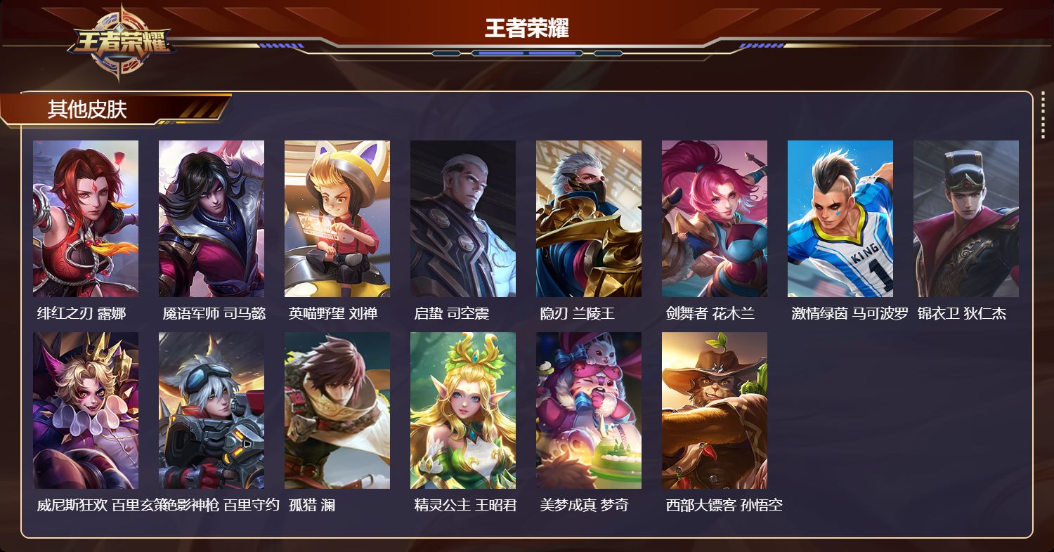 【27,其他皮肤】,金属狂潮,高渐离,战争骑士,夏侯惇,潮流仙人,老夫子,棒球奇才,沈梦溪,龙域领主,铠,超能战警,曹操,花见巫女,伽罗,爱与和平,苏烈,万圣前夜,小乔,灼热之刃,李信,木偶奇遇记,鲁班七号,福禄兄弟,鲁班七号,精灵王,后羿,绯红之刃,露娜,魇语军师,司马懿,英喵野望,刘禅,启蛰,司空震,隐刃,兰陵王,剑舞者,花木兰,激情绿茵,马可波罗,锦衣卫,狄仁杰,威尼斯狂欢,百里玄策,绝影神枪,百里守约,孤猎,澜,精灵公主,王昭君,美梦成真,梦奇,西部大镖客,孙悟空,