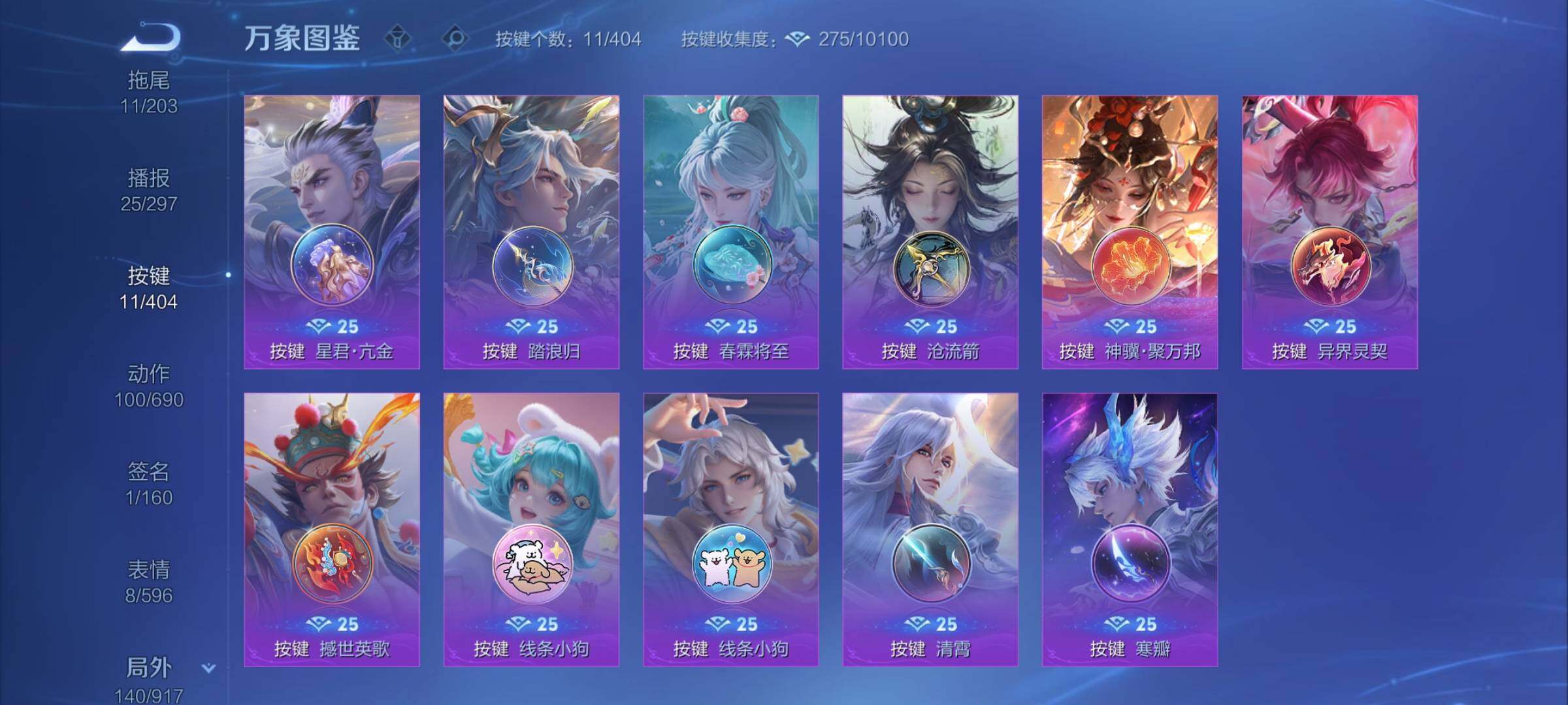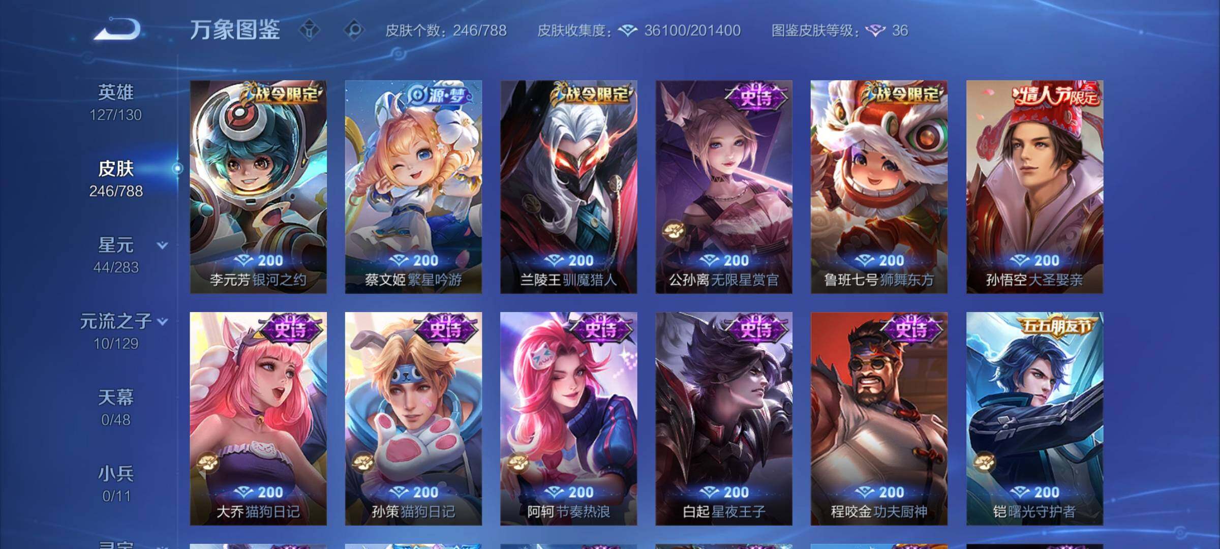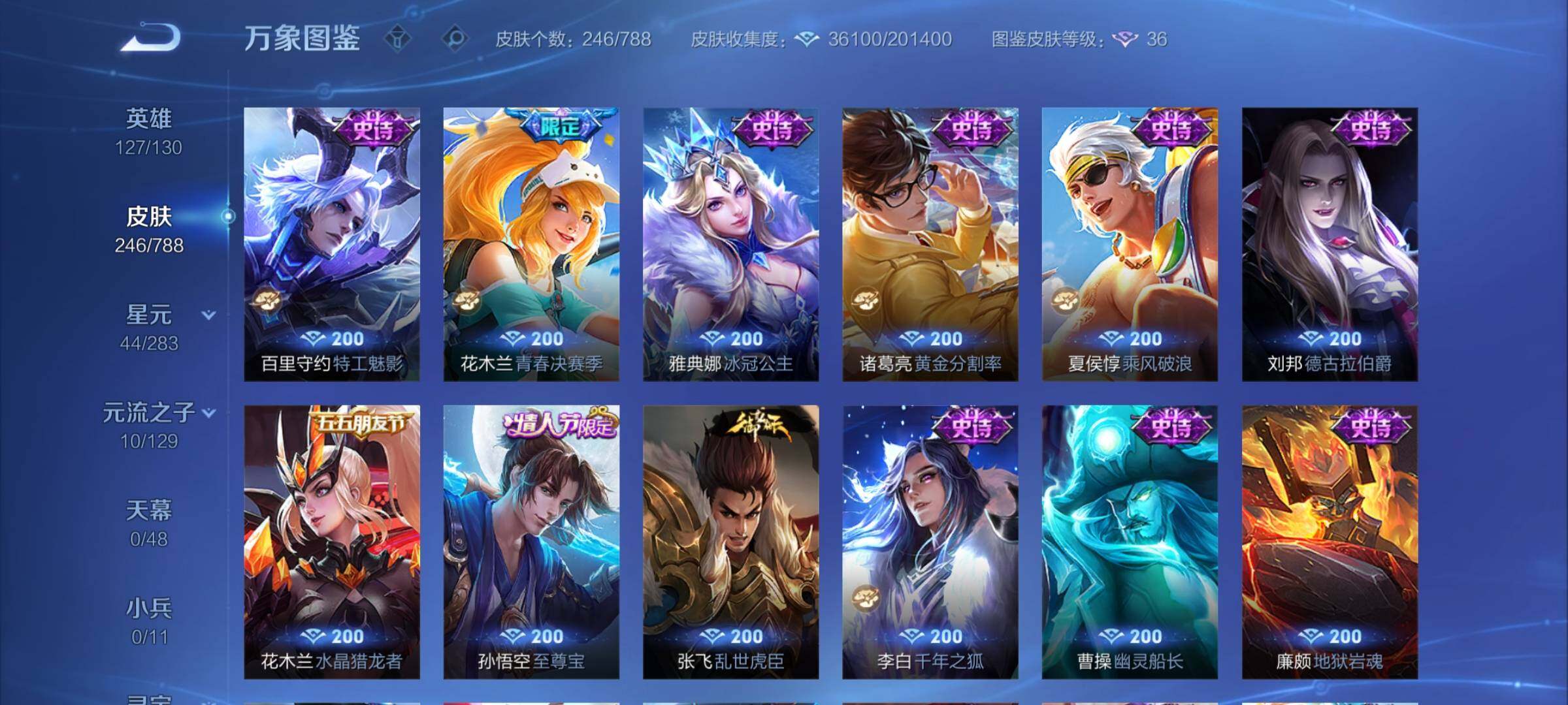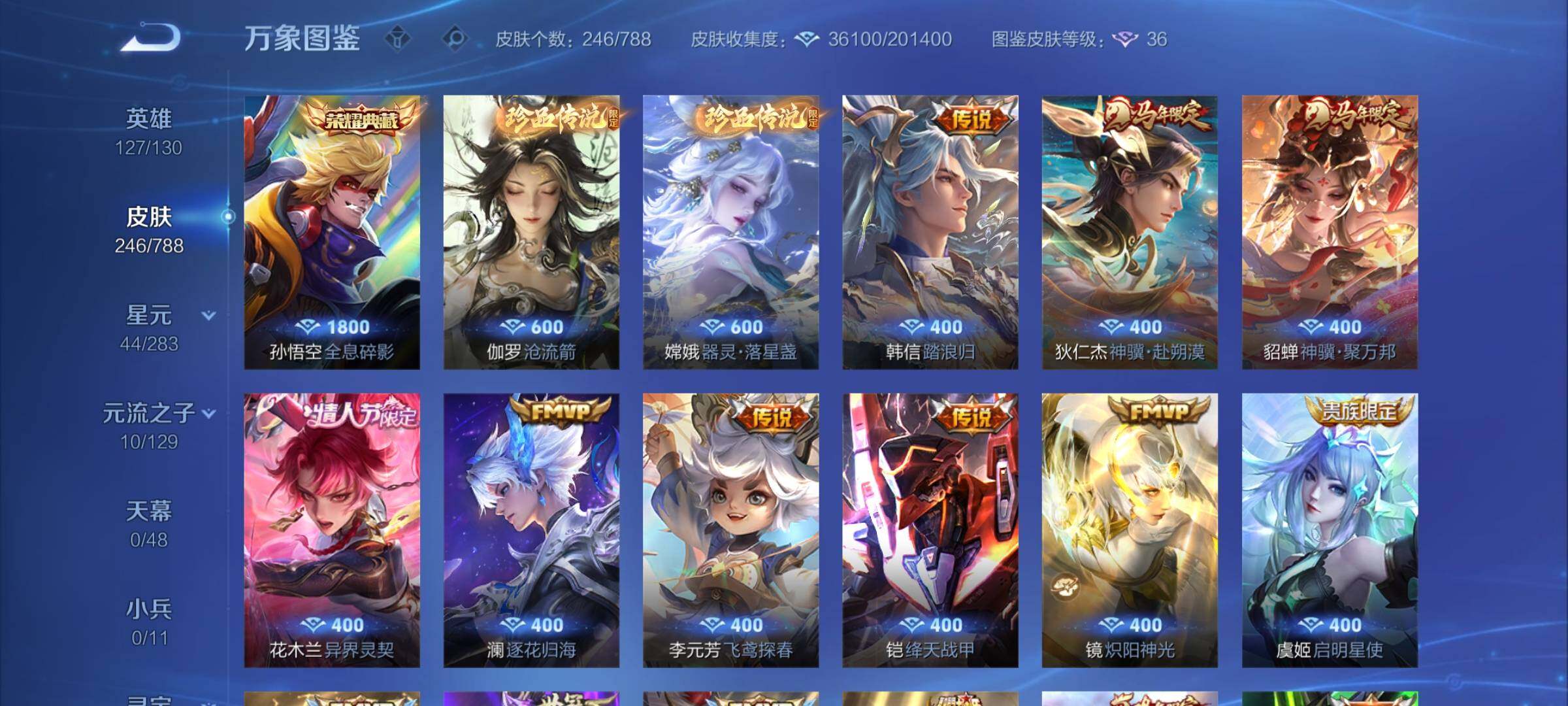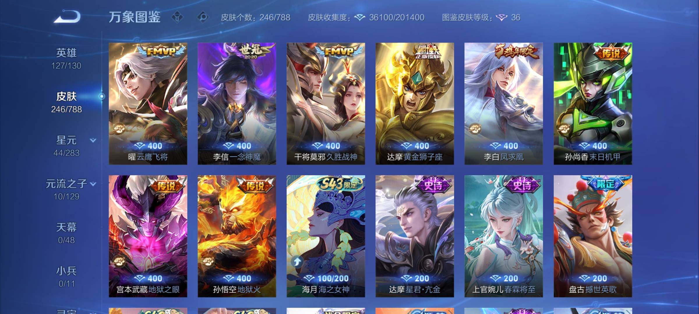 【限定皮肤】:狄仁杰阴阳师,赵云皇家上将,赵云龙胆,墨子神迹守卫,鲁班七号狮舞东方,高渐离玩趣恶龙,阿轲迷踪丽影,吕布御风骁将,周瑜赤莲之焰,元歌云间偶戏,元歌无心,夏侯惇朔风刀,典韦穷奇,典韦岱宗,马可波罗暗影游猎,狄仁杰魔术师,狄仁杰万华元夜,达摩沙漠行僧,项羽海滩派对,老夫子醍醐杖,老夫子航海奇遇记,程咬金演武夺筹,刘邦夺宝奇兵,兰陵王驯魔猎人,花木兰青春决赛季,亚瑟潮玩骑士王,孙悟空至尊宝,孙悟空大圣娶亲,张飞虎魄,李元芳银河之约,虞姬启明星使,钟馗神迹守卫,钟馗驱傩正仪,雅典娜单词大作战,蔡文姬繁星吟游,鬼谷子原初探秘者,苏烈千军破阵,弈星混沌棋,沈梦溪星空之诺,沈梦溪大漠名商,明世隐疑决卦,裴擒虎李小龙,狂铁御狮,米莱狄胡桃异想国,云中君纤云弄巧,盾山御銮,猪八戒西部大镖客,蒙犽狂想玩偶喵,桑启海盐诗旅,艾琳流音漫舞,张良古海寻踪,鬼谷子天穹祈灯,沈梦溪龙舞盛年【年限皮肤】:李白凤求凰,典韦岱宗,吕布御风骁将【赛季限定】:典韦穷奇,狂铁御狮,盾山御銮,夏侯惇朔风刀,弈星混沌棋,明世隐疑决卦,老夫子醍醐杖,鬼谷子原初探秘者,狄仁杰万华元夜,程咬金演武夺筹,钟馗驱傩正仪,苏烈千军破阵,达摩沙漠行僧,沈梦溪大漠名商,桑启海盐诗旅,张良古海寻踪,鬼谷子天穹祈灯,亚瑟荣光之誓【战令限定】:鲁班七号狮舞东方,钟馗神迹守卫,兰陵王驯魔猎人,周瑜赤莲之焰,李元芳银河之约,沈梦溪星空之诺,阿轲迷踪丽影,刘邦夺宝奇兵,马可波罗暗影游猎,猪八戒西部大镖客,蒙犽狂想玩偶喵,雅典娜单词大作战,元歌云间偶戏,亚瑟潮玩骑士王,米莱狄胡桃异想国,老夫子航海奇遇记,墨子神迹守卫,艾琳流音漫舞,莱西奥光弋星穹,明世隐往忆晖光,周瑜线条小狗,小乔线条小狗【史诗皮肤】:海月海之女神,达摩星君亢金,上官婉儿春霖将至,盘古撼世英歌,周瑜线条小狗,小乔线条小狗,莱西奥光弋星穹,狂铁龙之律动,百里守约真我赫兹,元歌无心,司马懿暗渊魔法,老夫子航海奇遇记,米莱狄胡桃异想国,吕布御风骁将,元歌云间偶戏,云中君纤云弄巧,裴擒虎李小龙,蒙犽狂想玩偶喵,张飞虎魄,马可波罗暗影游猎,孙尚香时之恋人,赵云龙胆,瑶遇见神鹿,马超神威,橘右京修罗,阿轲迷踪丽影,典韦岱宗,娜可露露晚萤,李元芳银河之约,蔡文姬繁星吟游,兰陵王驯魔猎人,公孙离无限星赏官,狄仁杰鹰眼统帅,鲁班七号狮舞东方,孙悟空大圣娶亲,大乔猫狗日记,孙策猫狗日记,阿轲节奏热浪,白起星夜王子,程咬金功夫厨神,铠曙光守护者,百里守约特工魅影,花木兰青春决赛季,雅典娜冰冠公主,诸葛亮黄金分割率,夏侯惇乘风破浪,刘邦德古拉伯爵,花木兰水晶猎龙者,孙悟空至尊宝,张飞乱世虎臣,李白千年之狐,曹操幽灵船长,吕布圣诞狂欢,墨子金属风暴,墨子龙骑士,妲己魅力维加斯,孙尚香水果甜心,宫本武藏鬼剑武藏,廉颇地狱岩魂,狄仁杰魔术师,王昭君偶像歌手,甄姬冰雪圆舞曲,貂蝉圣诞恋歌,赵云未来纪元,赵云皇家上将,阿轲暗夜猫娘,露娜紫霞仙子【其他皮肤】:影百相守梦,吕布舞狮寰,鲁班七号班班快跑,妲己线条小狗,桑启线条小狗,蒙恬苍云破阵,安琪拉糖果风暴,虞姬溯影追猎,蚩奼极光幻客,孙权径山谋武,明世隐往忆晖光,亚瑟荣光之誓,云中君云械蓝图,姜子牙星梦巡礼,西施雪境奇遇,影魅影绮裳,大司命暗都幽影,钟无艳春野之旅,沈梦溪龙舞盛年,海诺时空谍影,鬼谷子天穹祈灯,亚连破局者,张良古海寻踪,艾琳流音漫舞,猪八戒潮玩探月行,桑启海盐诗旅,戈娅危途狂花,沈梦溪大漠名商,程咬金无双福将,达摩沙漠行僧,马可波罗潮玩牛仔,苏烈千军破阵,鲁班大师乓乓大师,墨子神迹守卫,钟馗驱傩正仪,张良缤纷绘卷,程咬金演武夺筹,杨戬次元傲视,刘禅秘密基地,亚瑟潮玩骑士王,狄仁杰万华元夜,雅典娜单词大作战,鬼谷子原初探秘者,廉颇无尽征程,猪八戒西部大镖客,老夫子醍醐杖,盾山圆桌骑士,刘邦夺宝奇兵,明世隐疑决卦,鲁班七号黑桃队长,哪吒次元突破,弈星混沌棋,沈梦溪星空之诺,周瑜赤莲之焰,夏侯惇朔风刀,姜子牙炽热元素使,沈梦溪鲨炮海盗猫,高渐离玩趣恶龙,孙膑归虚梦演,盾山御銮,钟馗神迹守卫,吕布野性能量,小乔丁香结,明世隐虹云星官,大乔守护之力,苏烈坚韧之力,安琪拉如懿,狂铁御狮,鬼谷子幻乐之宴,李白敏锐之力,诸葛亮掌控之力,典韦穷奇,孙尚香沉稳之力,老夫子功夫老勺,狂铁命运角斗场,王昭君幻想奇妙夜,宫本武藏霸王丸,钟无艳海滩丽影,关羽龙腾万里,刘备汉昭烈帝,刘备纽约教父,狄仁杰阴阳师,后羿阿尔法小队,宫本武藏万象初新,甄姬花好人间,张飞五福同心,花木兰兔女郎,达摩拳王,亚瑟死亡骑士,典韦黄金武士,姜子牙时尚教父,安琪拉玩偶对对碰,宫本武藏未来纪元,扁鹊救世之瞳,扁鹊化身博士,牛魔西部大镖客,白起白色死神,芈月红桃皇后,赵云忍炎影,达摩大发明家,露娜哥特玫瑰,韩信街头霸王,韩信教廷特使,项羽海滩派对,暃碧珀绯影,金蝉前尘,云缨赤焰之缨,司空震启蛰,澜孤猎,阿古朵熊喵少女,蒙恬秩序猎龙将,镜冰刃幻境,蒙犽归虚梦演,鲁班大师归虚梦演,西施归虚梦演,马超幸存者,曜归虚梦演,云中君荷鲁斯之眼,瑶森,盘古创世神祝,猪八戒年年有余,嫦娥露花倒影,上官婉儿修竹墨客,李信灼热之刃,沈梦溪棒球奇才,伽罗花见巫女,司马懿魇语军师,元歌午夜歌剧院,米莱狄精准探案法,弈星踏雪寻梅,裴擒虎街头旋风,杨玉环