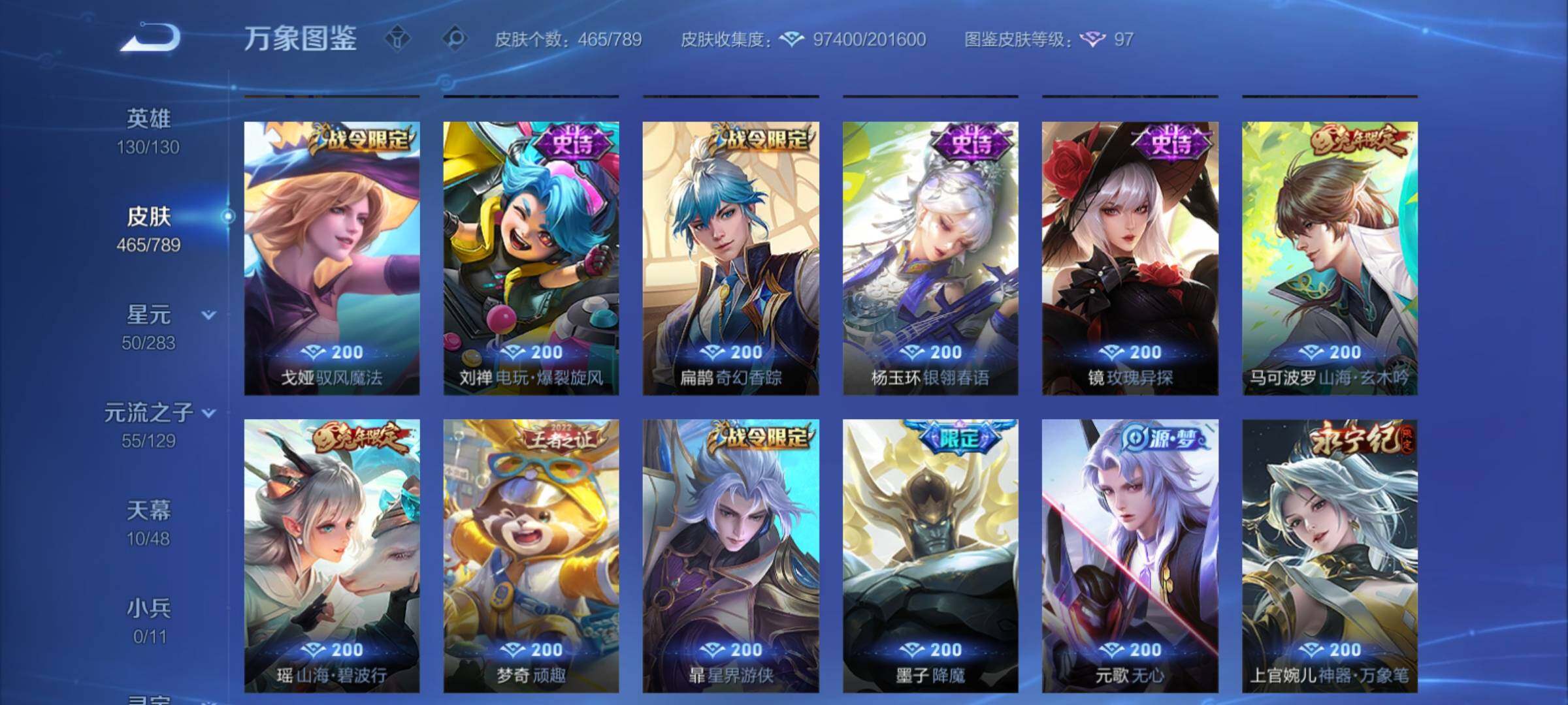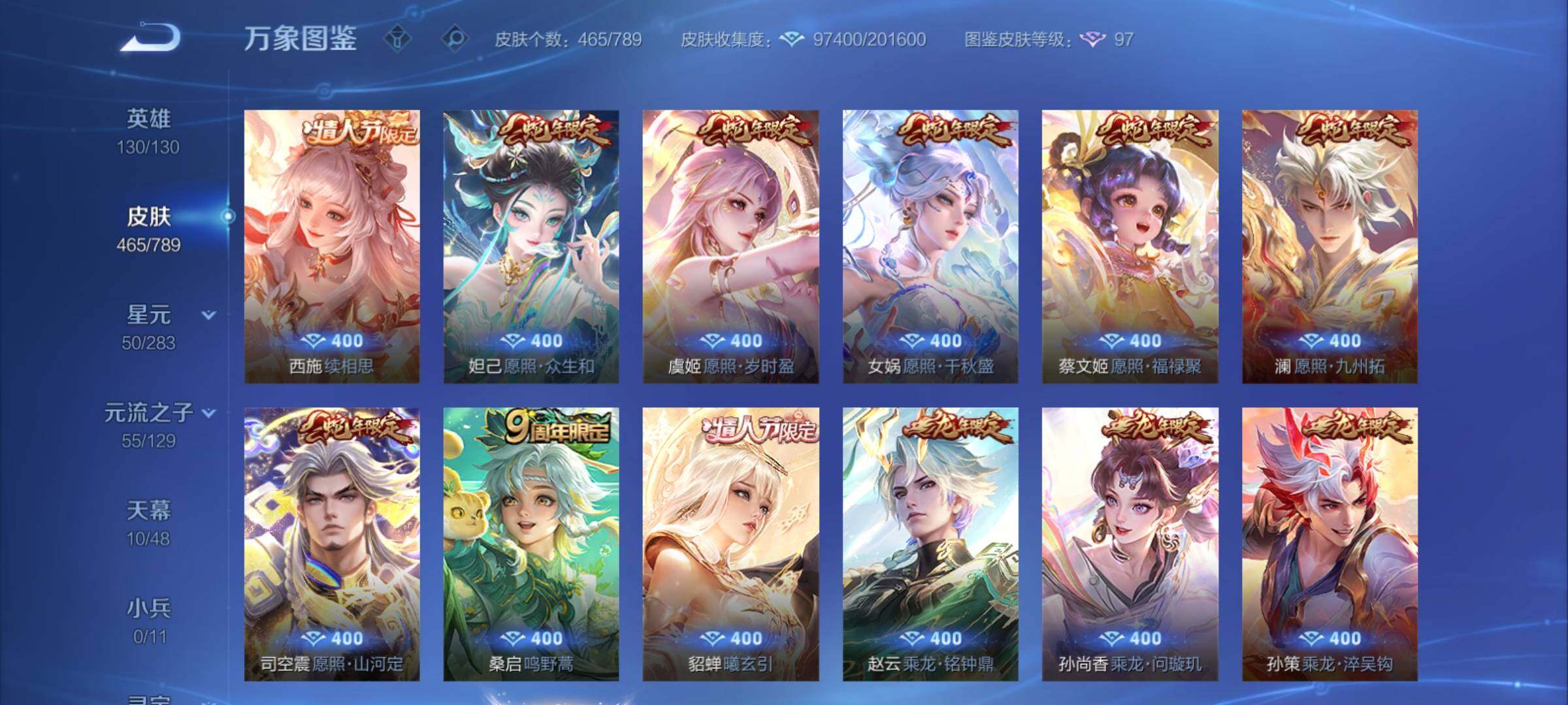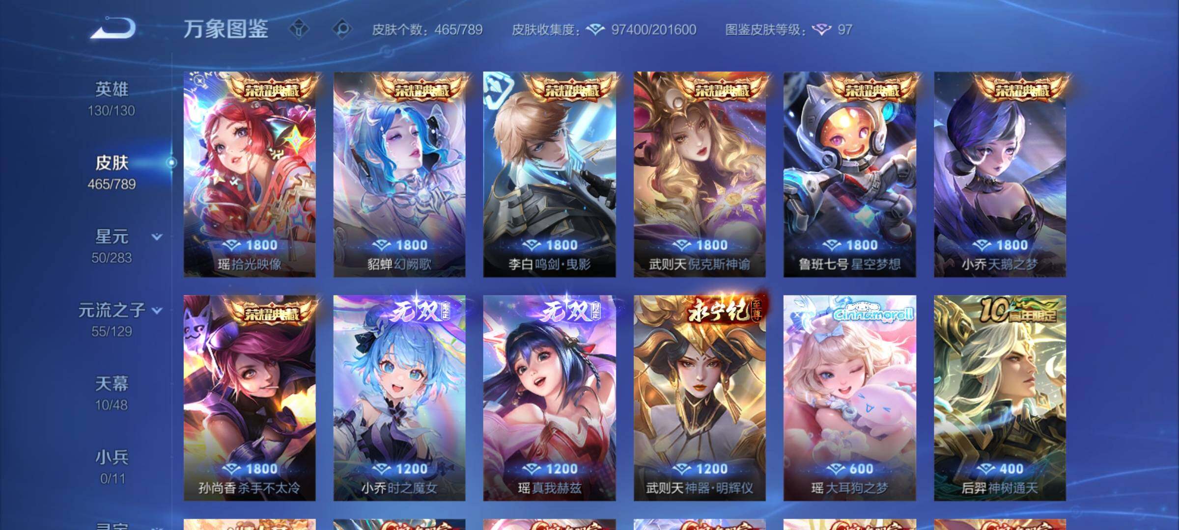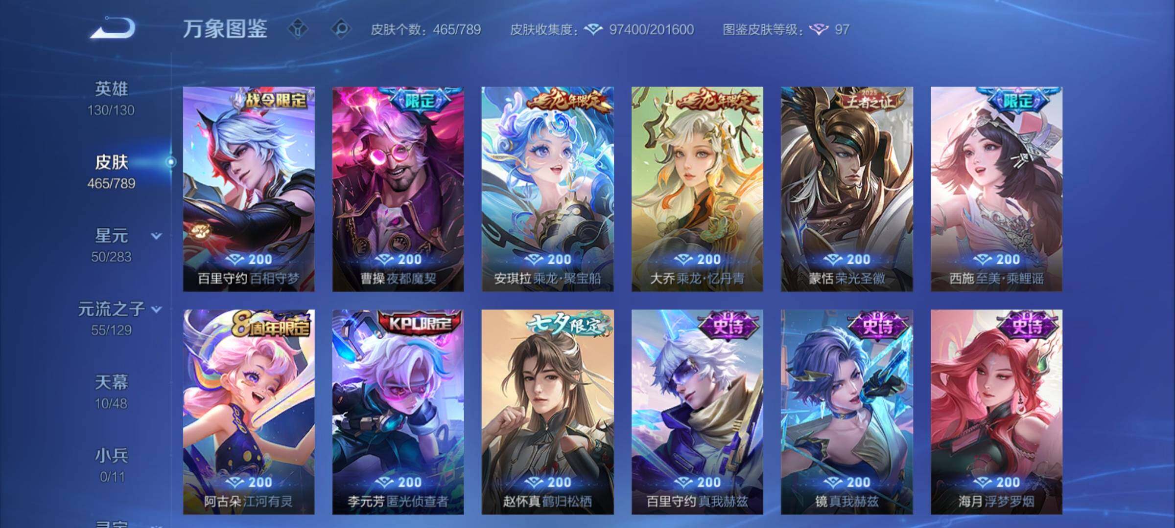 【年限皮肤】:百里守约朱雀志,铠青龙志,庄周玄嵩,甄姬幽恒,伽罗太华,韩信飞衡,公孙离祈雪灵祝,诸葛亮时雨天司,杨玉环寅虎心曲,小乔山海琳琅生,曜山海苍雷引,李信山海炽霜斩,瑶山海碧波行,马可波罗山海玄木吟,孙尚香乘龙问璇玑,孙策乘龙淬吴钩,赵云乘龙铭钟鼎,大乔乘龙忆丹青,安琪拉乘龙聚宝船,司空震愿照山河定,女娲愿照千秋盛,妲己愿照众生和,澜愿照九州拓,蔡文姬愿照福禄聚,虞姬愿照岁时盈【赛季限定】:达摩沙漠行僧,兰陵王金庭之子,沈梦溪大漠名商,李元芳云中旅人,桑启海盐诗旅,裴擒虎擒涛扼浪,鲁班大师探海日志,张良古海寻踪,鬼谷子天穹祈灯,刘邦剑破天穹,姜子牙天穹之誓,东皇太一噬灭天穹,太乙真人谧流熔炉,甄姬逆浪荇歌,亚瑟荣光之誓,梦奇顽趣,蒙恬荣光圣徽,项羽九幽镇关【战令限定】:李元芳银河之约,沈梦溪星空之诺,阿轲迷踪丽影,马可波罗暗影游猎,猪八戒西部大镖客,干将莫邪真爱魔法,明世隐吟游魔法,白起夜都怪侠,狂铁电玩高手,王昭君午后时光,钟无艳超时空战士,甄姬落雪兰心,暃星界游侠,嫦娥暖冬兔眠,扁鹊奇幻香踪,杨戬潮玩骑兵,戈娅驭风魔法,西施玲珑珍味,百里守约百相守梦,老夫子百相守梦,孙膑茶境仙,马超访茗客,周瑜线条小狗,小乔线条小狗【史诗皮肤】:海月海之女神,周瑜线条小狗,小乔线条小狗,项羽九幽镇关,少司缘巫礼祀神,百里玄策罗小黑战记,公孙离涂山容容,西施织梦人,黄忠百相守梦,后羿石田雨龙,百里守约雪豹霜爪,扁鹊灵蛊蚀心,阿轲化蝶舞,弈星万物之道,孙膑茶境仙,百里守约百相守梦,曹操夜都魔契,大乔乘龙忆丹青,安琪拉乘龙聚宝船,蒙恬荣光圣徽,西施至美乘鲤谣,阿古朵江河有灵,李元芳匿光侦查者,赵怀真鹤归松栖,百里守约真我赫兹,镜真我赫兹,海月浮梦罗烟,戈娅驭风魔法,刘禅电玩爆裂旋风,扁鹊奇幻香踪,杨玉环银翎春语,镜玫瑰异探,瑶山海碧波行,马可波罗山海玄木吟,暃星界游侠,梦奇顽趣,墨子降魔,元歌无心,上官婉儿神器万象笔,阿古朵顽趣,盾山梦圆繁星,鬼谷子五谷丰年,妲己时之奇旅,弈星滕王阁序,钟无艳超时空战士,庄周天秀幻梦,鲁班大师匿光启智者,金蝉唐三藏,张良千筹问战,狂铁电玩高手,高渐离天秀音浪,貂蝉唤灵魅影,夏侯惇匿光决锋者,明世隐吟游魔法,艾琳奇遇舞章,澜赏金猎手,夏洛特永昼,杨玉环寅虎心曲,韩信傲雪梅枪,嫦娥拒霜思,司马懿暗渊魔法,庄周高山流水,孙悟空孙行者,安琪拉时之奇旅,沈梦溪月团寄思,干将莫邪真爱魔法,杨戬天秀启明,鲁班七号乒乒小将,大乔白鹤梁神女,蒙犽龙鼓争鸣,百里玄策热力回旋,西施诗语江南,芈月白晶晶,孙膑天狼运算者,马可波罗暗影游猎,上官婉儿天狼绘梦者,孙尚香时之恋人,黄忠烈魂,瑶遇见神鹿,马超神威,橘右京修罗,阿轲迷踪丽影,不知火舞魅语,小乔青蛇,大乔白蛇,庄周玄嵩,甄姬幽恒,韩信飞衡,娜可露露晚萤,李元芳银河之约,蔡文姬繁星吟游,公孙离无限星赏官,狄仁杰鹰眼统帅,裴擒虎天狼狩猎者,伽罗箭羽风息,百里守约朱雀志,铠青龙志,大乔猫狗日记,孙策猫狗日记,蔡文姬奇迹圣诞,阿轲节奏热浪,白起星夜王子,程咬金功夫厨神,李元芳逐浪之夏,公孙离蜜橘之夏,刘禅天才门将,蔡文姬舞动绿茵,铠曙光守护者,百里守约特工魅影,庄周云端筑梦师,安琪拉心灵骇客,雅典娜冰冠公主,亚瑟心灵战警,诸葛亮黄金分割率,兰陵王暗隐猎兽者,小乔缤纷独角兽,夏侯惇乘风破浪,刘邦德古拉伯爵,花木兰水晶猎龙者,貂蝉逐梦之音,张飞乱世虎臣,妲己热情桑巴,吕布末日机甲,李白千年之狐,曹操幽灵船长,周瑜真爱至上,小乔纯白花嫁,刘禅绅士熊喵,吕布圣诞狂欢,墨子金属风暴,妲己女仆咖啡,妲己魅力维加斯,嬴政摇滚巨星,嬴政暗夜贵公子,孙尚香水果甜心,孙尚香蔷薇恋人,宫本武藏鬼剑武藏,廉颇地狱岩魂,狄仁杰魔术师,王昭君偶像歌手,甄姬冰雪圆舞曲,貂蝉圣诞恋歌,赵云未来纪元,赵云皇家上将,阿轲暗夜猫娘,露娜紫霞仙子,项羽苍穹之光,鲁班七号电玩小子【其他皮肤】:影百相守梦,鲁班七号班班快跑,桑启线条小狗,鬼谷子谜偶窥秘,虞姬溯影追猎,蚩奼极光幻客,艾琳鹤鸣心笺,孙权径山谋武,张良罗小黑战记,亚瑟荣光之誓,哪吒罗小黑战记,桑启青衿临川,鬼谷子克喵,莱西奥踏浪烽翎,云中君云械蓝图,甄姬逆浪荇歌,露娜命运加冕,阿古朵布丁狗之约,张良灵野札记,小乔秘证寻踪,苏烈春野闲踪,戈娅玫蓝誓约,明世隐景韶洛都,少司缘灵卦秘语,东皇太一金福满堂,姜子牙星梦巡礼,西施雪境奇遇,影魅影绮裳,马超访茗客,典韦铁骨偃魂,太乙真人谧流熔炉,苍苍林狼骑,干将莫邪雾都夜雨,老夫子百相守梦,东皇太一噬灭天穹,大乔绒语心约,周瑜熔金海岸,姜子牙天穹之誓,貂蝉长夏之忆,大司命暗都幽影,刘邦剑破天穹,扁鹊无尽旅途,钟无艳春野之旅,沈梦溪龙舞盛年,亚瑟鸿运当头,廉颇功夫炙烤,朵莉亚金色潮汐,嫦娥漠中幻影,海诺时空谍影,鬼谷子天穹祈灯,后羿完美运算,兰陵王幻夜行动,亚连破局者,海月王牌新星,钟无艳聚星闪耀,张良古海寻踪,姬小满零食大作战,西施玲珑珍味,鲁班大师探海日志,太乙真人劲辣红锅,杨戬潮玩骑兵,裴擒虎擒涛扼浪,赵怀真太极少年,白起乐园追猎者,牛魔牛运亨通,猪八戒潮玩探月行,海月幻泉雾影,嫦娥暖冬兔眠,桑启海盐诗旅,戈娅危途狂花,刘备潮玩造梦师,李元芳云中旅人,甄姬落雪兰心,蒙恬蔚蓝守将,沈梦溪大漠名商,王昭君午