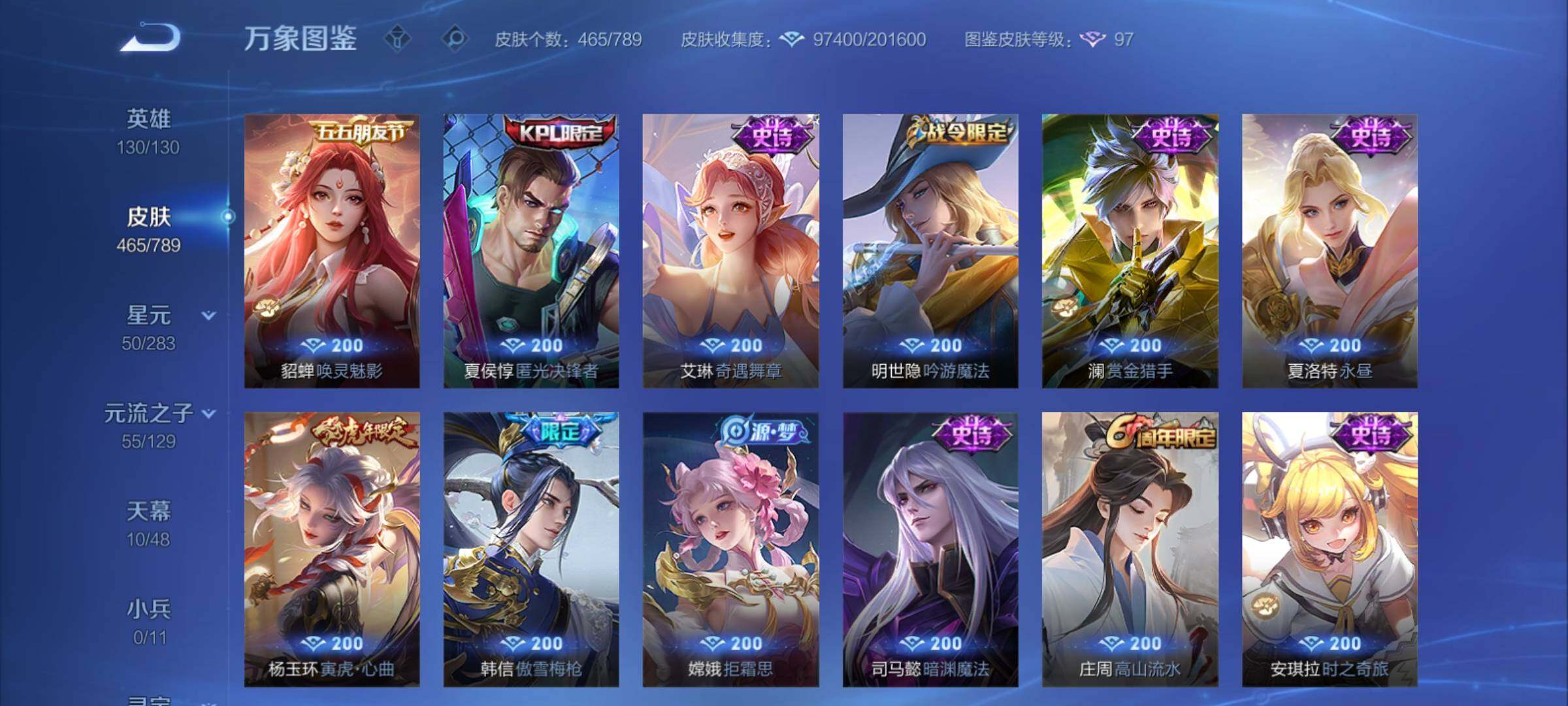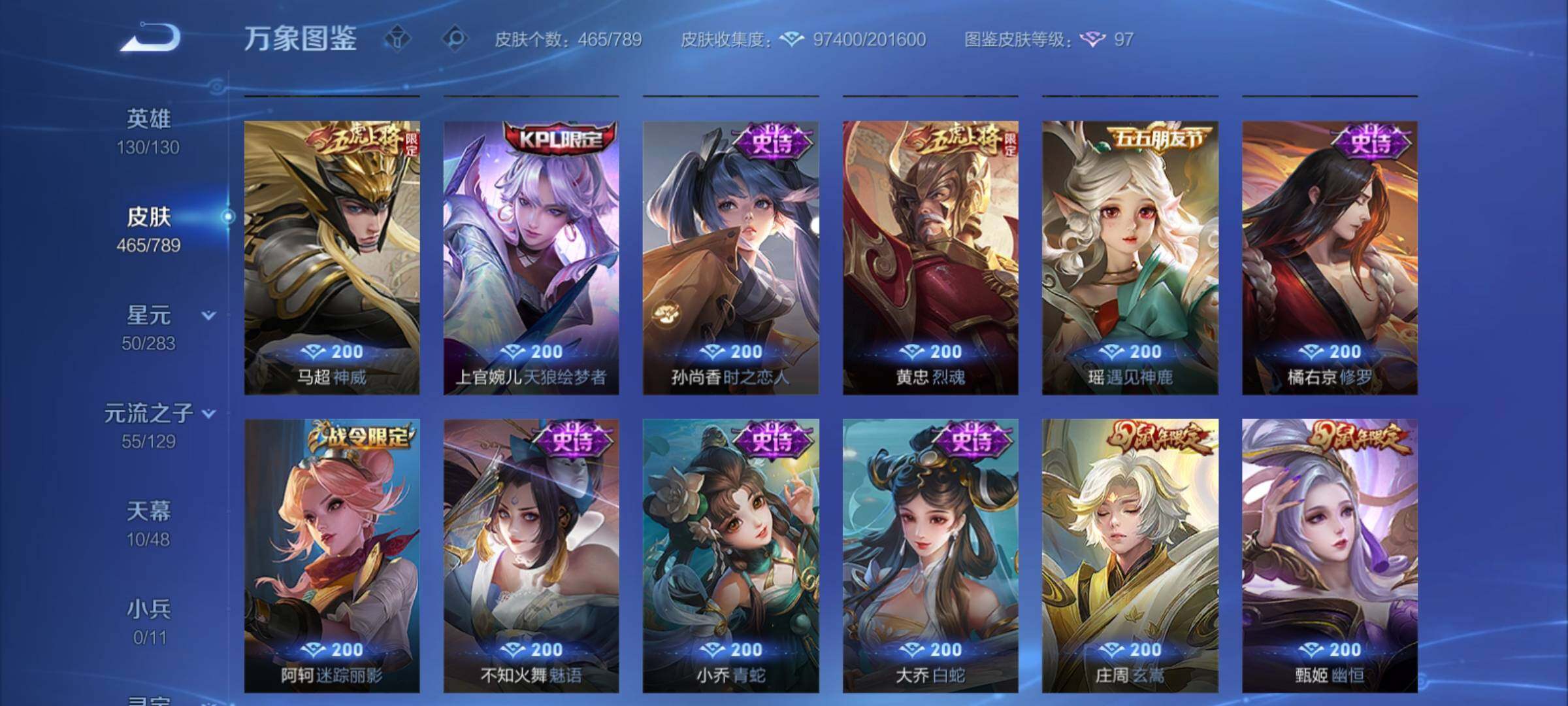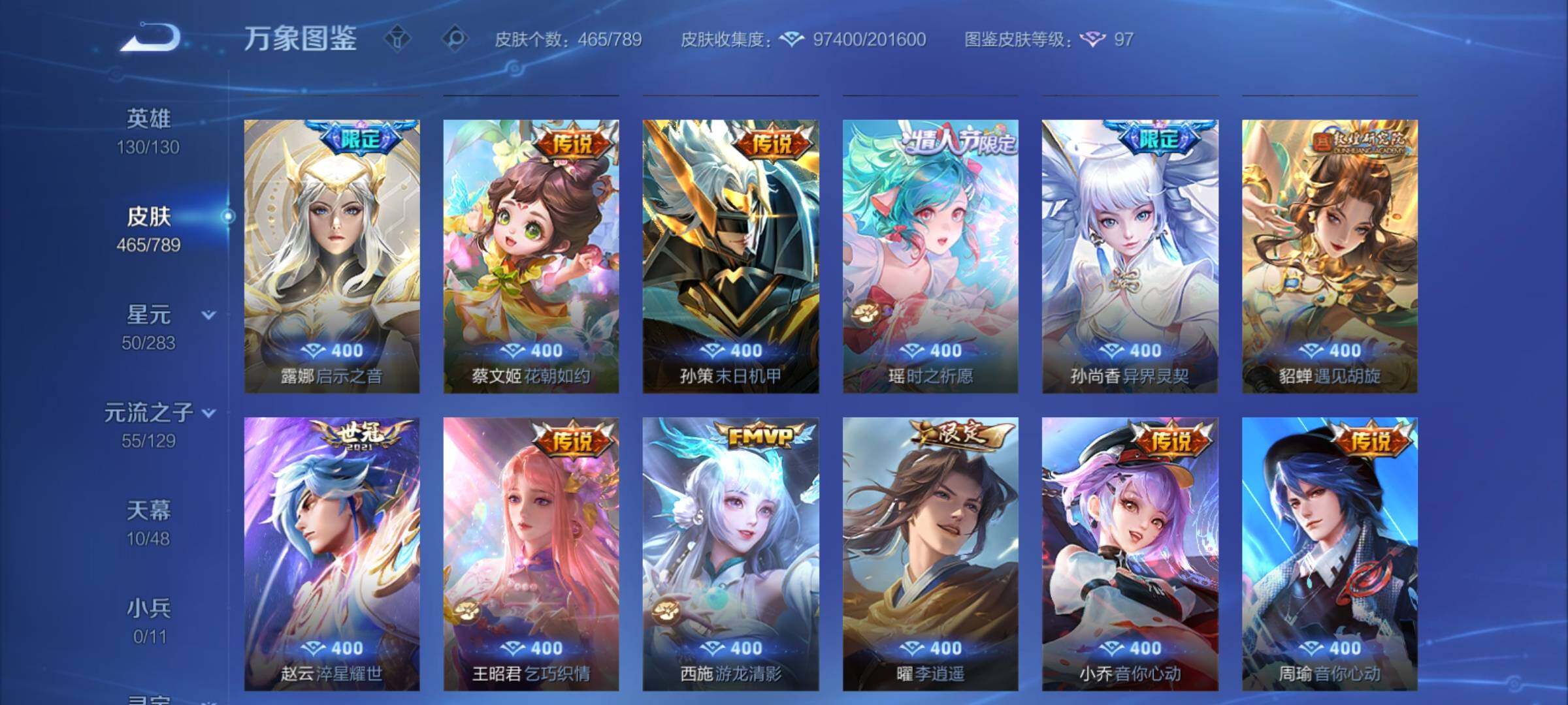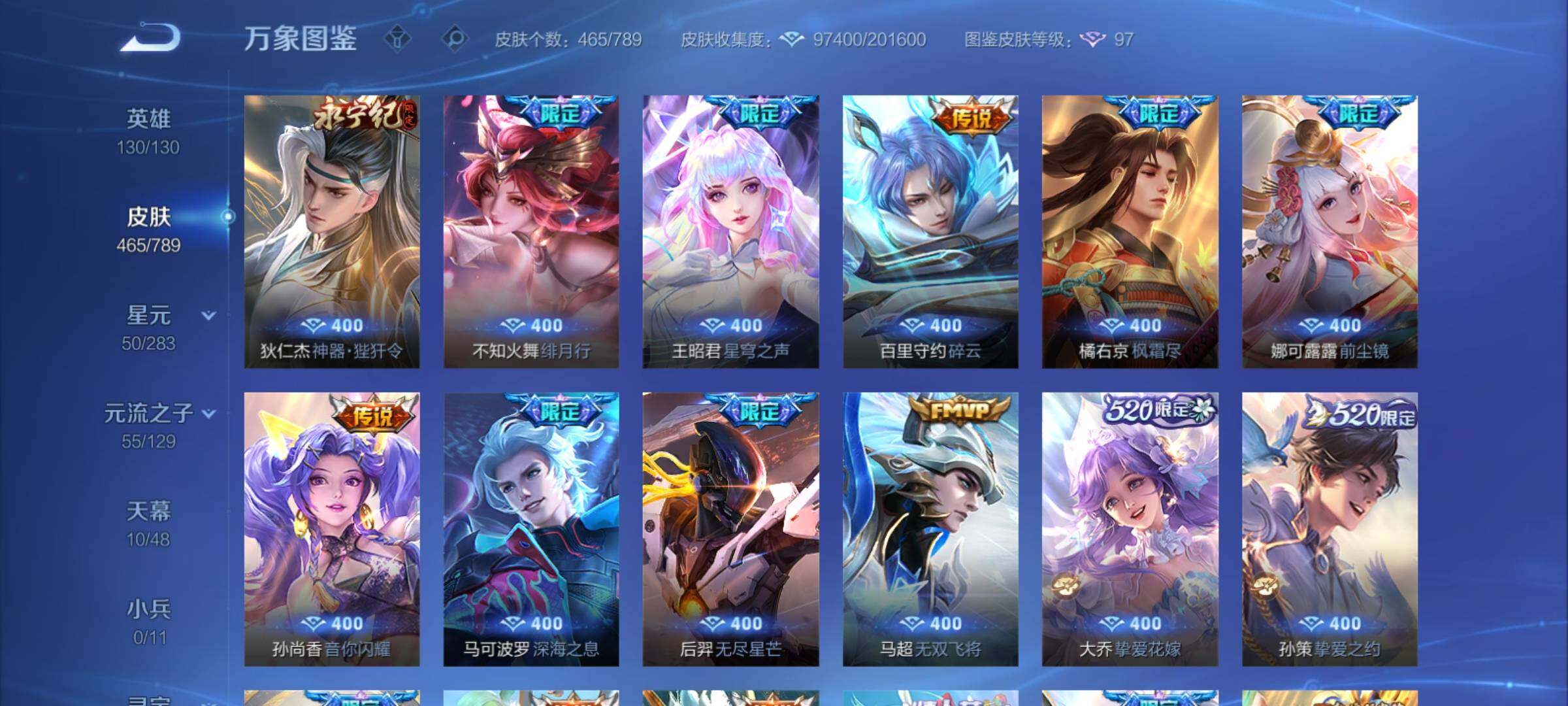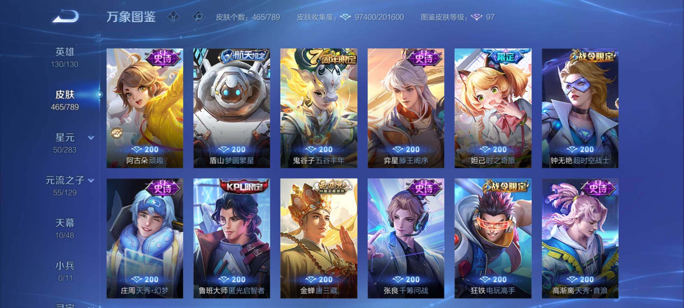 【年限皮肤】:百里守约朱雀志,铠青龙志,庄周玄嵩,甄姬幽恒,伽罗太华,韩信飞衡,公孙离祈雪灵祝,诸葛亮时雨天司,杨玉环寅虎心曲,小乔山海琳琅生,曜山海苍雷引,李信山海炽霜斩,瑶山海碧波行,马可波罗山海玄木吟,孙尚香乘龙问璇玑,孙策乘龙淬吴钩,赵云乘龙铭钟鼎,大乔乘龙忆丹青,安琪拉乘龙聚宝船,司空震愿照山河定,女娲愿照千秋盛,妲己愿照众生和,澜愿照九州拓,蔡文姬愿照福禄聚,虞姬愿照岁时盈【赛季限定】:达摩沙漠行僧,兰陵王金庭之子,沈梦溪大漠名商,李元芳云中旅人,桑启海盐诗旅,裴擒虎擒涛扼浪,鲁班大师探海日志,张良古海寻踪,鬼谷子天穹祈灯,刘邦剑破天穹,姜子牙天穹之誓,东皇太一噬灭天穹,太乙真人谧流熔炉,甄姬逆浪荇歌,亚瑟荣光之誓,梦奇顽趣,蒙恬荣光圣徽,项羽九幽镇关【战令限定】:李元芳银河之约,沈梦溪星空之诺,阿轲迷踪丽影,马可波罗暗影游猎,猪八戒西部大镖客,干将莫邪真爱魔法,明世隐吟游魔法,白起夜都怪侠,狂铁电玩高手,王昭君午后时光,钟无艳超时空战士,甄姬落雪兰心,暃星界游侠,嫦娥暖冬兔眠,扁鹊奇幻香踪,杨戬潮玩骑兵,戈娅驭风魔法,西施玲珑珍味,百里守约百相守梦,老夫子百相守梦,孙膑茶境仙,马超访茗客,周瑜线条小狗,小乔线条小狗【史诗皮肤】:海月海之女神,周瑜线条小狗,小乔线条小狗,项羽九幽镇关,少司缘巫礼祀神,百里玄策罗小黑战记,公孙离涂山容容,西施织梦人,黄忠百相守梦,后羿石田雨龙,百里守约雪豹霜爪,扁鹊灵蛊蚀心,阿轲化蝶舞,弈星万物之道,孙膑茶境仙,百里守约百相守梦,曹操夜都魔契,大乔乘龙忆丹青,安琪拉乘龙聚宝船,蒙恬荣光圣徽,西施至美乘鲤谣,阿古朵江河有灵,李元芳匿光侦查者,赵怀真鹤归松栖,百里守约真我赫兹,镜真我赫兹,海月浮梦罗烟,戈娅驭风魔法,刘禅电玩爆裂旋风,扁鹊奇幻香踪,杨玉环银翎春语,镜玫瑰异探,瑶山海碧波行,马可波罗山海玄木吟,暃星界游侠,梦奇顽趣,墨子降魔,元歌无心,上官婉儿神器万象笔,阿古朵顽趣,盾山梦圆繁星,鬼谷子五谷丰年,妲己时之奇旅,弈星滕王阁序,钟无艳超时空战士,庄周天秀幻梦,鲁班大师匿光启智者,金蝉唐三藏,张良千筹问战,狂铁电玩高手,高渐离天秀音浪,貂蝉唤灵魅影,夏侯惇匿光决锋者,明世隐吟游魔法,艾琳奇遇舞章,澜赏金猎手,夏洛特永昼,杨玉环寅虎心曲,韩信傲雪梅枪,嫦娥拒霜思,司马懿暗渊魔法,庄周高山流水,孙悟空孙行者,安琪拉时之奇旅,沈梦溪月团寄思,干将莫邪真爱魔法,杨戬天秀启明,鲁班七号乒乒小将,大乔白鹤梁神女,蒙犽龙鼓争鸣,百里玄策热力回旋,西施诗语江南,芈月白晶晶,孙膑天狼运算者,马可波罗暗影游猎,上官婉儿天狼绘梦者,孙尚香时之恋人,黄忠烈魂,瑶遇见神鹿,马超神威,橘右京修罗,阿轲迷踪丽影,不知火舞魅语,小乔青蛇,大乔白蛇,庄周玄嵩,甄姬幽恒,韩信飞衡,娜可露露晚萤,李元芳银河之约,蔡文姬繁星吟游,公孙离无限星赏官,狄仁杰鹰眼统帅,裴擒虎天狼狩猎者,伽罗箭羽风息,百里守约朱雀志,铠青龙志,大乔猫狗日记,孙策猫狗日记,蔡文姬奇迹圣诞,阿轲节奏热浪,白起星夜王子,程咬金功夫厨神,李元芳逐浪之夏,公孙离蜜橘之夏,刘禅天才门将,蔡文姬舞动绿茵,铠曙光守护者,百里守约特工魅影,庄周云端筑梦师,安琪拉心灵骇客,雅典娜冰冠公主,亚瑟心灵战警,诸葛亮黄金分割率,兰陵王暗隐猎兽者,小乔缤纷独角兽,夏侯惇乘风破浪,刘邦德古拉伯爵,花木兰水晶猎龙者,貂蝉逐梦之音,张飞乱世虎臣,妲己热情桑巴,吕布末日机甲,李白千年之狐,曹操幽灵船长,周瑜真爱至上,小乔纯白花嫁,刘禅绅士熊喵,吕布圣诞狂欢,墨子金属风暴,妲己女仆咖啡,妲己魅力维加斯,嬴政摇滚巨星,嬴政暗夜贵公子,孙尚香水果甜心,孙尚香蔷薇恋人,宫本武藏鬼剑武藏,廉颇地狱岩魂,狄仁杰魔术师,王昭君偶像歌手,甄姬冰雪圆舞曲,貂蝉圣诞恋歌,赵云未来纪元,赵云皇家上将,阿轲暗夜猫娘,露娜紫霞仙子,项羽苍穹之光,鲁班七号电玩小子【其他皮肤】:影百相守梦,鲁班七号班班快跑,桑启线条小狗,鬼谷子谜偶窥秘,虞姬溯影追猎,蚩奼极光幻客,艾琳鹤鸣心笺,孙权径山谋武,张良罗小黑战记,亚瑟荣光之誓,哪吒罗小黑战记,桑启青衿临川,鬼谷子克喵,莱西奥踏浪烽翎,云中君云械蓝图,甄姬逆浪荇歌,露娜命运加冕,阿古朵布丁狗之约,张良灵野札记,小乔秘证寻踪,苏烈春野闲踪,戈娅玫蓝誓约,明世隐景韶洛都,少司缘灵卦秘语,东皇太一金福满堂,姜子牙星梦巡礼,西施雪境奇遇,影魅影绮裳,马超访茗客,典韦铁骨偃魂,太乙真人谧流熔炉,苍苍林狼骑,干将莫邪雾都夜雨,老夫子百相守梦,东皇太一噬灭天穹,大乔绒语心约,周瑜熔金海岸,姜子牙天穹之誓,貂蝉长夏之忆,大司命暗都幽影,刘邦剑破天穹,扁鹊无尽旅途,钟无艳春野之旅,沈梦溪龙舞盛年,亚瑟鸿运当头,廉颇功夫炙烤,朵莉亚金色潮汐,嫦娥漠中幻影,海诺时空谍影,鬼谷子天穹祈灯,后羿完美运算,兰陵王幻夜行动,亚连破局者,海月王牌新星,钟无艳聚星闪耀,张良古海寻踪,姬小满零食大作战,西施玲珑珍味,鲁班大师探海日志,太乙真人劲辣红锅,杨戬潮玩骑兵,裴擒虎擒涛扼浪,赵怀真太极少年,白起乐园追猎者,牛魔牛运亨通,猪八戒潮玩探月行,海月幻泉雾影,嫦娥暖冬兔眠,桑启海盐诗旅,戈娅危途狂花,刘备潮玩造梦师,李元芳云中旅人,甄姬落雪兰心,蒙恬蔚蓝守将,沈梦溪大漠名商,王昭君午