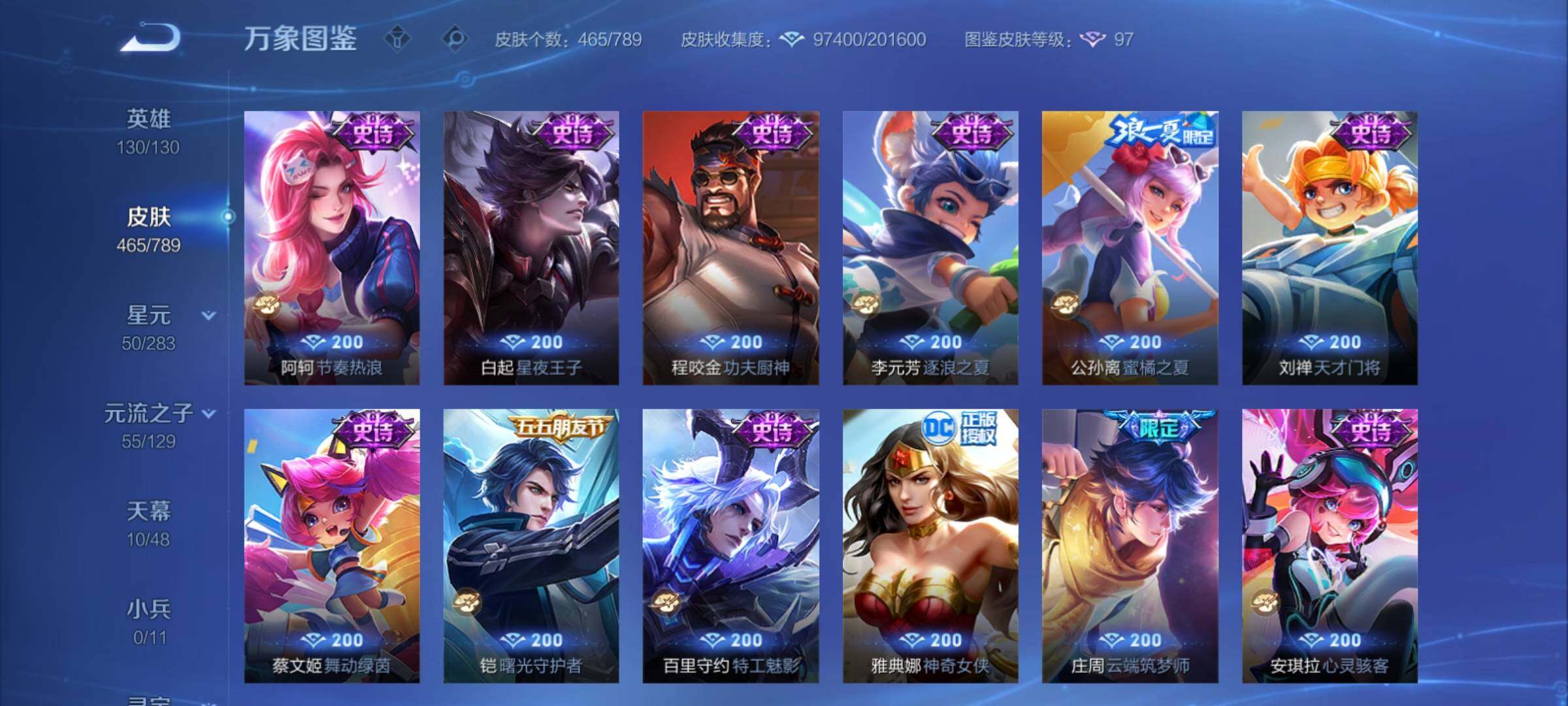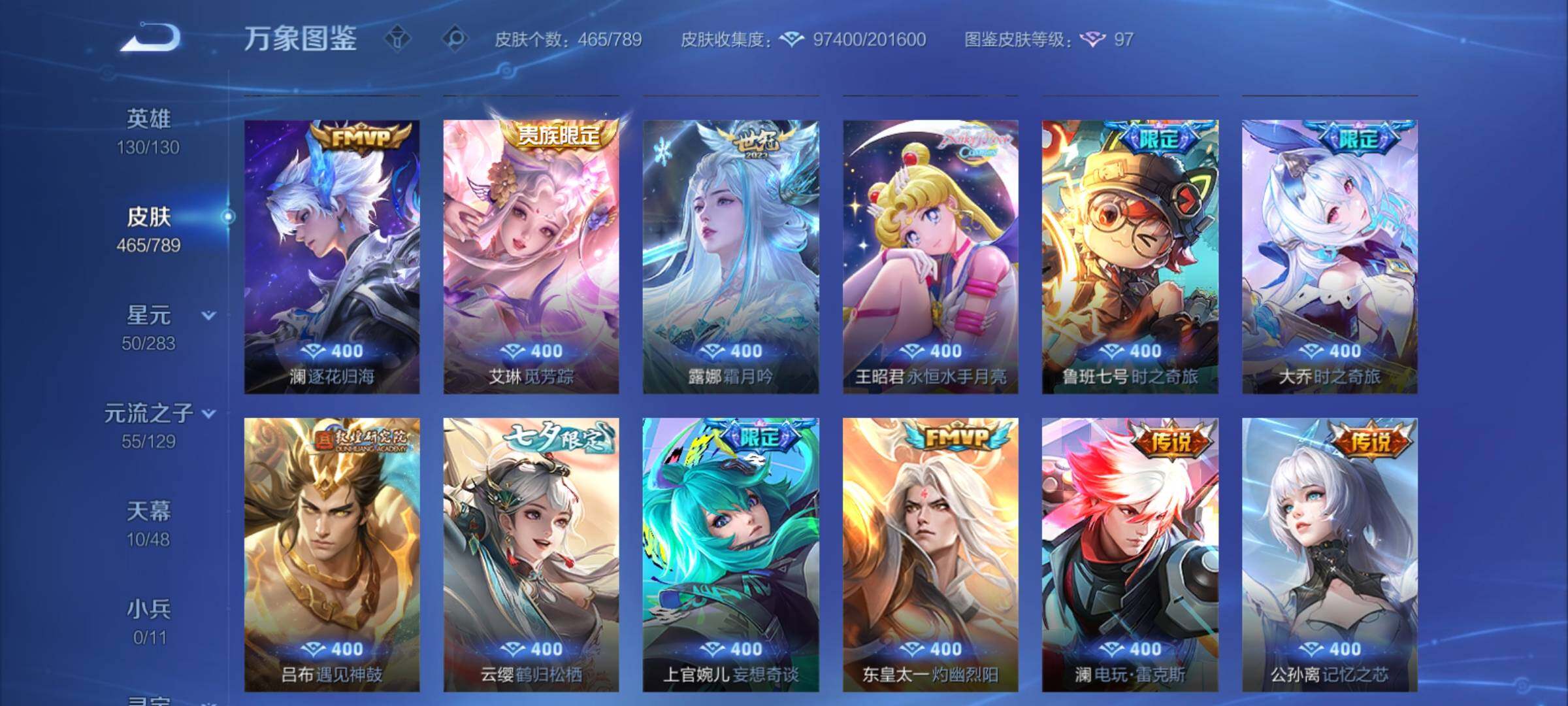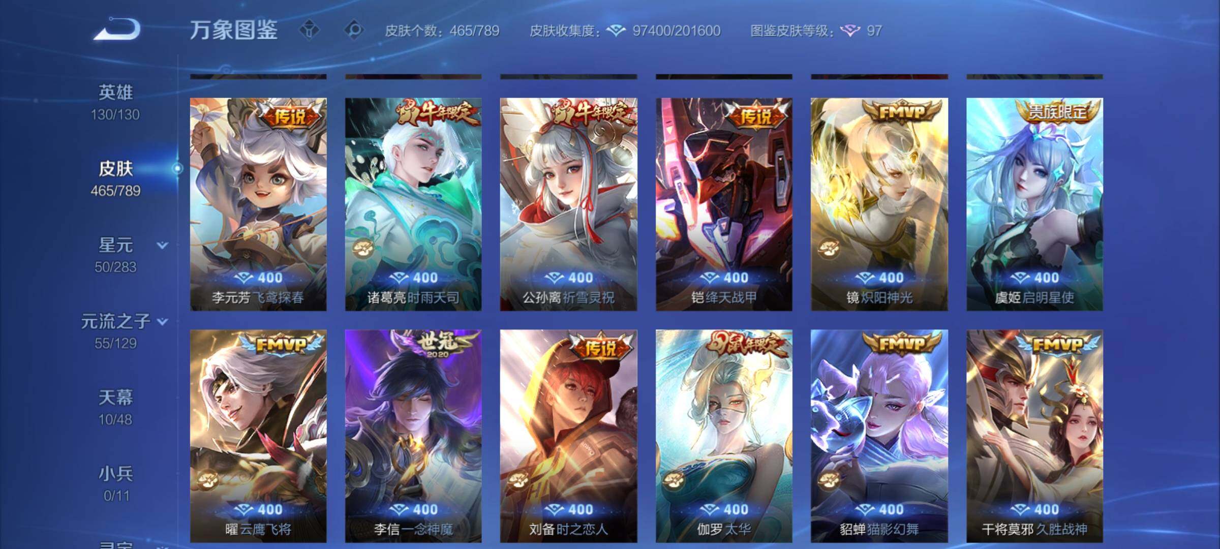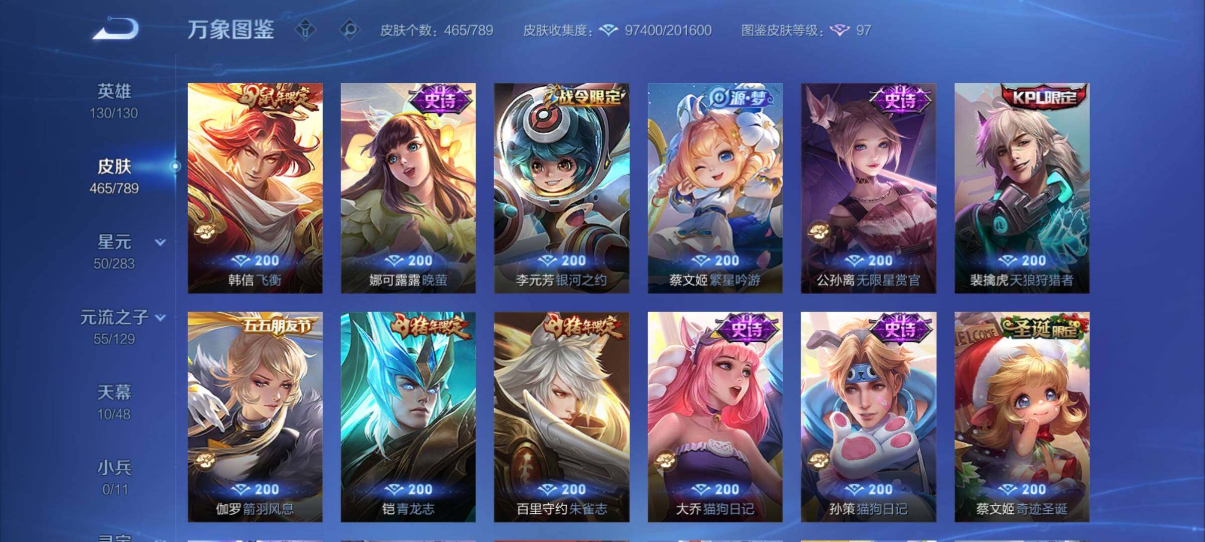 【年限皮肤】:百里守约朱雀志,铠青龙志,庄周玄嵩,甄姬幽恒,伽罗太华,韩信飞衡,公孙离祈雪灵祝,诸葛亮时雨天司,杨玉环寅虎心曲,小乔山海琳琅生,曜山海苍雷引,李信山海炽霜斩,瑶山海碧波行,马可波罗山海玄木吟,孙尚香乘龙问璇玑,孙策乘龙淬吴钩,赵云乘龙铭钟鼎,大乔乘龙忆丹青,安琪拉乘龙聚宝船,司空震愿照山河定,女娲愿照千秋盛,妲己愿照众生和,澜愿照九州拓,蔡文姬愿照福禄聚,虞姬愿照岁时盈【赛季限定】:达摩沙漠行僧,兰陵王金庭之子,沈梦溪大漠名商,李元芳云中旅人,桑启海盐诗旅,裴擒虎擒涛扼浪,鲁班大师探海日志,张良古海寻踪,鬼谷子天穹祈灯,刘邦剑破天穹,姜子牙天穹之誓,东皇太一噬灭天穹,太乙真人谧流熔炉,甄姬逆浪荇歌,亚瑟荣光之誓,梦奇顽趣,蒙恬荣光圣徽,项羽九幽镇关【战令限定】:李元芳银河之约,沈梦溪星空之诺,阿轲迷踪丽影,马可波罗暗影游猎,猪八戒西部大镖客,干将莫邪真爱魔法,明世隐吟游魔法,白起夜都怪侠,狂铁电玩高手,王昭君午后时光,钟无艳超时空战士,甄姬落雪兰心,暃星界游侠,嫦娥暖冬兔眠,扁鹊奇幻香踪,杨戬潮玩骑兵,戈娅驭风魔法,西施玲珑珍味,百里守约百相守梦,老夫子百相守梦,孙膑茶境仙,马超访茗客,周瑜线条小狗,小乔线条小狗【史诗皮肤】:海月海之女神,周瑜线条小狗,小乔线条小狗,项羽九幽镇关,少司缘巫礼祀神,百里玄策罗小黑战记,公孙离涂山容容,西施织梦人,黄忠百相守梦,后羿石田雨龙,百里守约雪豹霜爪,扁鹊灵蛊蚀心,阿轲化蝶舞,弈星万物之道,孙膑茶境仙,百里守约百相守梦,曹操夜都魔契,大乔乘龙忆丹青,安琪拉乘龙聚宝船,蒙恬荣光圣徽,西施至美乘鲤谣,阿古朵江河有灵,李元芳匿光侦查者,赵怀真鹤归松栖,百里守约真我赫兹,镜真我赫兹,海月浮梦罗烟,戈娅驭风魔法,刘禅电玩爆裂旋风,扁鹊奇幻香踪,杨玉环银翎春语,镜玫瑰异探,瑶山海碧波行,马可波罗山海玄木吟,暃星界游侠,梦奇顽趣,墨子降魔,元歌无心,上官婉儿神器万象笔,阿古朵顽趣,盾山梦圆繁星,鬼谷子五谷丰年,妲己时之奇旅,弈星滕王阁序,钟无艳超时空战士,庄周天秀幻梦,鲁班大师匿光启智者,金蝉唐三藏,张良千筹问战,狂铁电玩高手,高渐离天秀音浪,貂蝉唤灵魅影,夏侯惇匿光决锋者,明世隐吟游魔法,艾琳奇遇舞章,澜赏金猎手,夏洛特永昼,杨玉环寅虎心曲,韩信傲雪梅枪,嫦娥拒霜思,司马懿暗渊魔法,庄周高山流水,孙悟空孙行者,安琪拉时之奇旅,沈梦溪月团寄思,干将莫邪真爱魔法,杨戬天秀启明,鲁班七号乒乒小将,大乔白鹤梁神女,蒙犽龙鼓争鸣,百里玄策热力回旋,西施诗语江南,芈月白晶晶,孙膑天狼运算者,马可波罗暗影游猎,上官婉儿天狼绘梦者,孙尚香时之恋人,黄忠烈魂,瑶遇见神鹿,马超神威,橘右京修罗,阿轲迷踪丽影,不知火舞魅语,小乔青蛇,大乔白蛇,庄周玄嵩,甄姬幽恒,韩信飞衡,娜可露露晚萤,李元芳银河之约,蔡文姬繁星吟游,公孙离无限星赏官,狄仁杰鹰眼统帅,裴擒虎天狼狩猎者,伽罗箭羽风息,百里守约朱雀志,铠青龙志,大乔猫狗日记,孙策猫狗日记,蔡文姬奇迹圣诞,阿轲节奏热浪,白起星夜王子,程咬金功夫厨神,李元芳逐浪之夏,公孙离蜜橘之夏,刘禅天才门将,蔡文姬舞动绿茵,铠曙光守护者,百里守约特工魅影,庄周云端筑梦师,安琪拉心灵骇客,雅典娜冰冠公主,亚瑟心灵战警,诸葛亮黄金分割率,兰陵王暗隐猎兽者,小乔缤纷独角兽,夏侯惇乘风破浪,刘邦德古拉伯爵,花木兰水晶猎龙者,貂蝉逐梦之音,张飞乱世虎臣,妲己热情桑巴,吕布末日机甲,李白千年之狐,曹操幽灵船长,周瑜真爱至上,小乔纯白花嫁,刘禅绅士熊喵,吕布圣诞狂欢,墨子金属风暴,妲己女仆咖啡,妲己魅力维加斯,嬴政摇滚巨星,嬴政暗夜贵公子,孙尚香水果甜心,孙尚香蔷薇恋人,宫本武藏鬼剑武藏,廉颇地狱岩魂,狄仁杰魔术师,王昭君偶像歌手,甄姬冰雪圆舞曲,貂蝉圣诞恋歌,赵云未来纪元,赵云皇家上将,阿轲暗夜猫娘,露娜紫霞仙子,项羽苍穹之光,鲁班七号电玩小子【其他皮肤】:影百相守梦,鲁班七号班班快跑,桑启线条小狗,鬼谷子谜偶窥秘,虞姬溯影追猎,蚩奼极光幻客,艾琳鹤鸣心笺,孙权径山谋武,张良罗小黑战记,亚瑟荣光之誓,哪吒罗小黑战记,桑启青衿临川,鬼谷子克喵,莱西奥踏浪烽翎,云中君云械蓝图,甄姬逆浪荇歌,露娜命运加冕,阿古朵布丁狗之约,张良灵野札记,小乔秘证寻踪,苏烈春野闲踪,戈娅玫蓝誓约,明世隐景韶洛都,少司缘灵卦秘语,东皇太一金福满堂,姜子牙星梦巡礼,西施雪境奇遇,影魅影绮裳,马超访茗客,典韦铁骨偃魂,太乙真人谧流熔炉,苍苍林狼骑,干将莫邪雾都夜雨,老夫子百相守梦,东皇太一噬灭天穹,大乔绒语心约,周瑜熔金海岸,姜子牙天穹之誓,貂蝉长夏之忆,大司命暗都幽影,刘邦剑破天穹,扁鹊无尽旅途,钟无艳春野之旅,沈梦溪龙舞盛年,亚瑟鸿运当头,廉颇功夫炙烤,朵莉亚金色潮汐,嫦娥漠中幻影,海诺时空谍影,鬼谷子天穹祈灯,后羿完美运算,兰陵王幻夜行动,亚连破局者,海月王牌新星,钟无艳聚星闪耀,张良古海寻踪,姬小满零食大作战,西施玲珑珍味,鲁班大师探海日志,太乙真人劲辣红锅,杨戬潮玩骑兵,裴擒虎擒涛扼浪,赵怀真太极少年,白起乐园追猎者,牛魔牛运亨通,猪八戒潮玩探月行,海月幻泉雾影,嫦娥暖冬兔眠,桑启海盐诗旅,戈娅危途狂花,刘备潮玩造梦师,李元芳云中旅人,甄姬落雪兰心,蒙恬蔚蓝守将,沈梦溪大漠名商,王昭君午