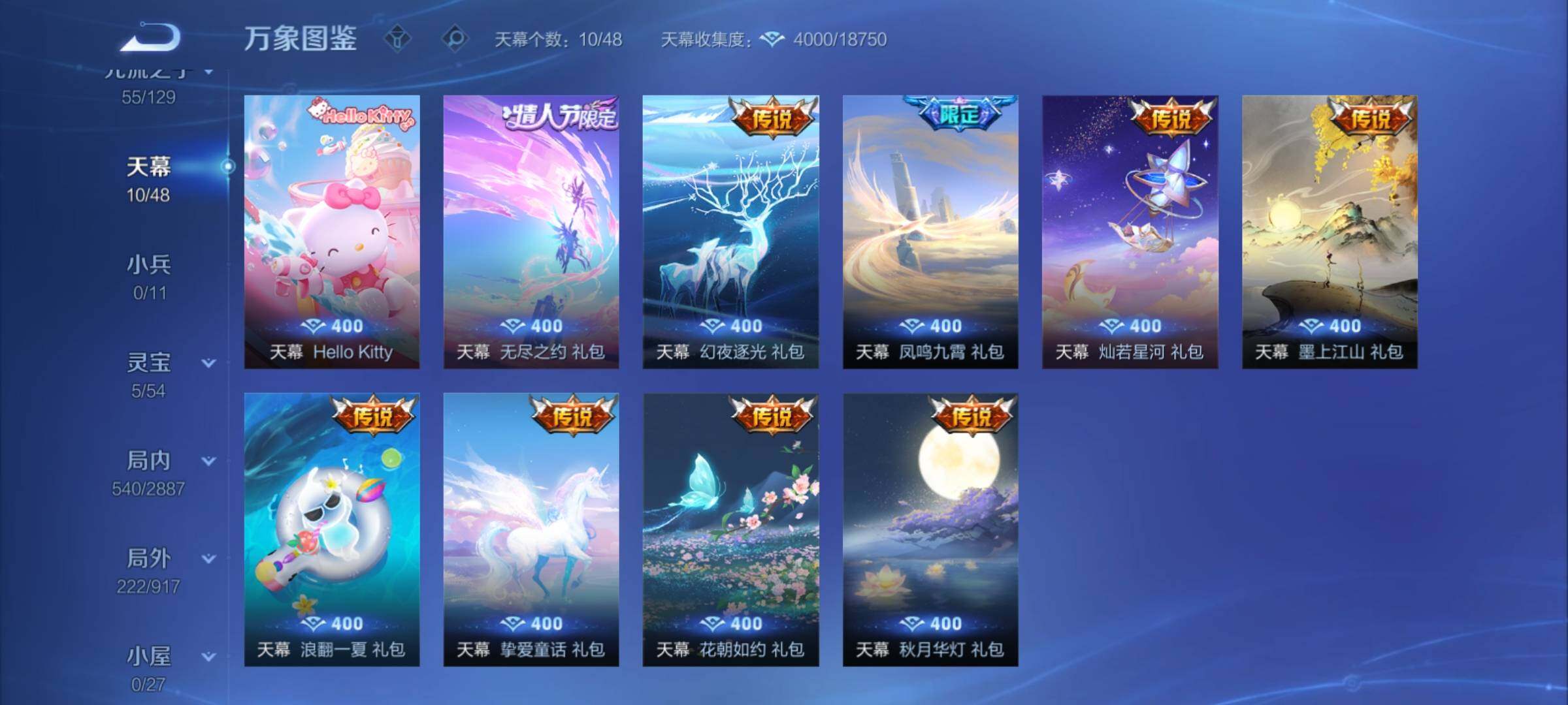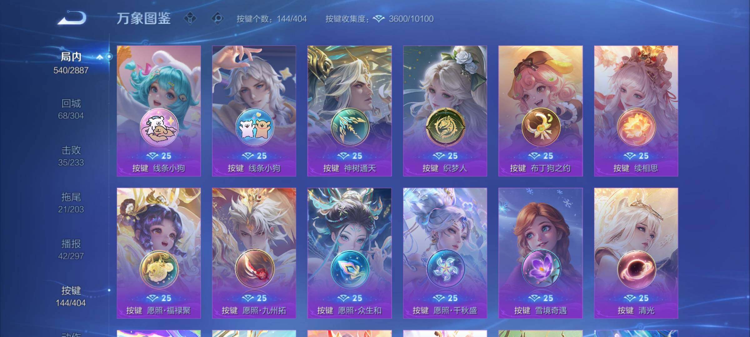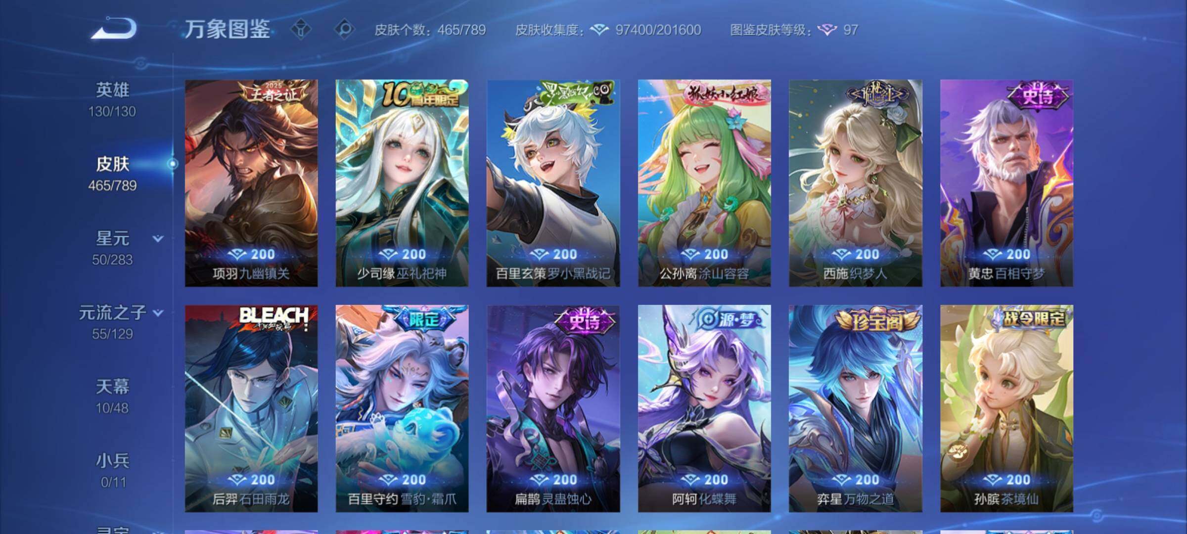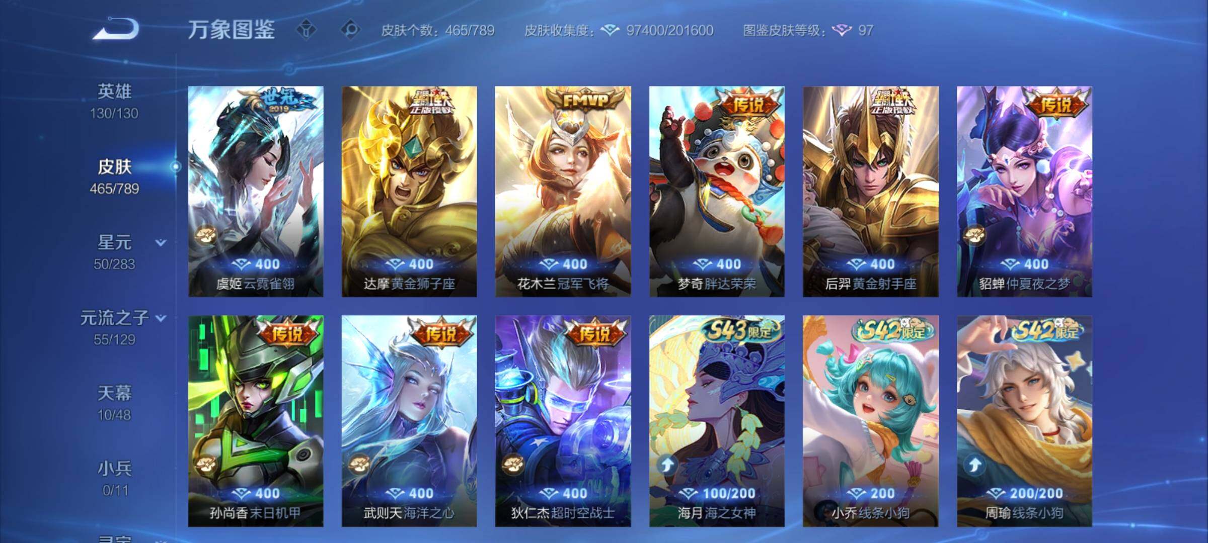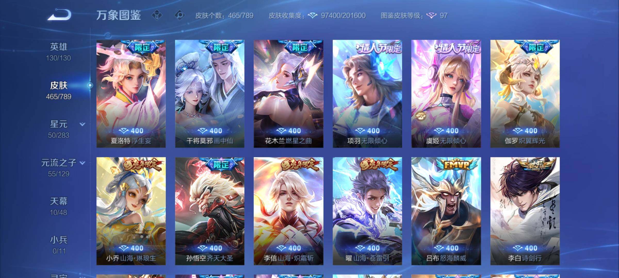 【年限皮肤】:百里守约朱雀志,铠青龙志,庄周玄嵩,甄姬幽恒,伽罗太华,韩信飞衡,公孙离祈雪灵祝,诸葛亮时雨天司,杨玉环寅虎心曲,小乔山海琳琅生,曜山海苍雷引,李信山海炽霜斩,瑶山海碧波行,马可波罗山海玄木吟,孙尚香乘龙问璇玑,孙策乘龙淬吴钩,赵云乘龙铭钟鼎,大乔乘龙忆丹青,安琪拉乘龙聚宝船,司空震愿照山河定,女娲愿照千秋盛,妲己愿照众生和,澜愿照九州拓,蔡文姬愿照福禄聚,虞姬愿照岁时盈【赛季限定】:达摩沙漠行僧,兰陵王金庭之子,沈梦溪大漠名商,李元芳云中旅人,桑启海盐诗旅,裴擒虎擒涛扼浪,鲁班大师探海日志,张良古海寻踪,鬼谷子天穹祈灯,刘邦剑破天穹,姜子牙天穹之誓,东皇太一噬灭天穹,太乙真人谧流熔炉,甄姬逆浪荇歌,亚瑟荣光之誓,梦奇顽趣,蒙恬荣光圣徽,项羽九幽镇关【战令限定】:李元芳银河之约,沈梦溪星空之诺,阿轲迷踪丽影,马可波罗暗影游猎,猪八戒西部大镖客,干将莫邪真爱魔法,明世隐吟游魔法,白起夜都怪侠,狂铁电玩高手,王昭君午后时光,钟无艳超时空战士,甄姬落雪兰心,暃星界游侠,嫦娥暖冬兔眠,扁鹊奇幻香踪,杨戬潮玩骑兵,戈娅驭风魔法,西施玲珑珍味,百里守约百相守梦,老夫子百相守梦,孙膑茶境仙,马超访茗客,周瑜线条小狗,小乔线条小狗【史诗皮肤】:海月海之女神,周瑜线条小狗,小乔线条小狗,项羽九幽镇关,少司缘巫礼祀神,百里玄策罗小黑战记,公孙离涂山容容,西施织梦人,黄忠百相守梦,后羿石田雨龙,百里守约雪豹霜爪,扁鹊灵蛊蚀心,阿轲化蝶舞,弈星万物之道,孙膑茶境仙,百里守约百相守梦,曹操夜都魔契,大乔乘龙忆丹青,安琪拉乘龙聚宝船,蒙恬荣光圣徽,西施至美乘鲤谣,阿古朵江河有灵,李元芳匿光侦查者,赵怀真鹤归松栖,百里守约真我赫兹,镜真我赫兹,海月浮梦罗烟,戈娅驭风魔法,刘禅电玩爆裂旋风,扁鹊奇幻香踪,杨玉环银翎春语,镜玫瑰异探,瑶山海碧波行,马可波罗山海玄木吟,暃星界游侠,梦奇顽趣,墨子降魔,元歌无心,上官婉儿神器万象笔,阿古朵顽趣,盾山梦圆繁星,鬼谷子五谷丰年,妲己时之奇旅,弈星滕王阁序,钟无艳超时空战士,庄周天秀幻梦,鲁班大师匿光启智者,金蝉唐三藏,张良千筹问战,狂铁电玩高手,高渐离天秀音浪,貂蝉唤灵魅影,夏侯惇匿光决锋者,明世隐吟游魔法,艾琳奇遇舞章,澜赏金猎手,夏洛特永昼,杨玉环寅虎心曲,韩信傲雪梅枪,嫦娥拒霜思,司马懿暗渊魔法,庄周高山流水,孙悟空孙行者,安琪拉时之奇旅,沈梦溪月团寄思,干将莫邪真爱魔法,杨戬天秀启明,鲁班七号乒乒小将,大乔白鹤梁神女,蒙犽龙鼓争鸣,百里玄策热力回旋,西施诗语江南,芈月白晶晶,孙膑天狼运算者,马可波罗暗影游猎,上官婉儿天狼绘梦者,孙尚香时之恋人,黄忠烈魂,瑶遇见神鹿,马超神威,橘右京修罗,阿轲迷踪丽影,不知火舞魅语,小乔青蛇,大乔白蛇,庄周玄嵩,甄姬幽恒,韩信飞衡,娜可露露晚萤,李元芳银河之约,蔡文姬繁星吟游,公孙离无限星赏官,狄仁杰鹰眼统帅,裴擒虎天狼狩猎者,伽罗箭羽风息,百里守约朱雀志,铠青龙志,大乔猫狗日记,孙策猫狗日记,蔡文姬奇迹圣诞,阿轲节奏热浪,白起星夜王子,程咬金功夫厨神,李元芳逐浪之夏,公孙离蜜橘之夏,刘禅天才门将,蔡文姬舞动绿茵,铠曙光守护者,百里守约特工魅影,庄周云端筑梦师,安琪拉心灵骇客,雅典娜冰冠公主,亚瑟心灵战警,诸葛亮黄金分割率,兰陵王暗隐猎兽者,小乔缤纷独角兽,夏侯惇乘风破浪,刘邦德古拉伯爵,花木兰水晶猎龙者,貂蝉逐梦之音,张飞乱世虎臣,妲己热情桑巴,吕布末日机甲,李白千年之狐,曹操幽灵船长,周瑜真爱至上,小乔纯白花嫁,刘禅绅士熊喵,吕布圣诞狂欢,墨子金属风暴,妲己女仆咖啡,妲己魅力维加斯,嬴政摇滚巨星,嬴政暗夜贵公子,孙尚香水果甜心,孙尚香蔷薇恋人,宫本武藏鬼剑武藏,廉颇地狱岩魂,狄仁杰魔术师,王昭君偶像歌手,甄姬冰雪圆舞曲,貂蝉圣诞恋歌,赵云未来纪元,赵云皇家上将,阿轲暗夜猫娘,露娜紫霞仙子,项羽苍穹之光,鲁班七号电玩小子【其他皮肤】:影百相守梦,鲁班七号班班快跑,桑启线条小狗,鬼谷子谜偶窥秘,虞姬溯影追猎,蚩奼极光幻客,艾琳鹤鸣心笺,孙权径山谋武,张良罗小黑战记,亚瑟荣光之誓,哪吒罗小黑战记,桑启青衿临川,鬼谷子克喵,莱西奥踏浪烽翎,云中君云械蓝图,甄姬逆浪荇歌,露娜命运加冕,阿古朵布丁狗之约,张良灵野札记,小乔秘证寻踪,苏烈春野闲踪,戈娅玫蓝誓约,明世隐景韶洛都,少司缘灵卦秘语,东皇太一金福满堂,姜子牙星梦巡礼,西施雪境奇遇,影魅影绮裳,马超访茗客,典韦铁骨偃魂,太乙真人谧流熔炉,苍苍林狼骑,干将莫邪雾都夜雨,老夫子百相守梦,东皇太一噬灭天穹,大乔绒语心约,周瑜熔金海岸,姜子牙天穹之誓,貂蝉长夏之忆,大司命暗都幽影,刘邦剑破天穹,扁鹊无尽旅途,钟无艳春野之旅,沈梦溪龙舞盛年,亚瑟鸿运当头,廉颇功夫炙烤,朵莉亚金色潮汐,嫦娥漠中幻影,海诺时空谍影,鬼谷子天穹祈灯,后羿完美运算,兰陵王幻夜行动,亚连破局者,海月王牌新星,钟无艳聚星闪耀,张良古海寻踪,姬小满零食大作战,西施玲珑珍味,鲁班大师探海日志,太乙真人劲辣红锅,杨戬潮玩骑兵,裴擒虎擒涛扼浪,赵怀真太极少年,白起乐园追猎者,牛魔牛运亨通,猪八戒潮玩探月行,海月幻泉雾影,嫦娥暖冬兔眠,桑启海盐诗旅,戈娅危途狂花,刘备潮玩造梦师,李元芳云中旅人,甄姬落雪兰心,蒙恬蔚蓝守将,沈梦溪大漠名商,王昭君午