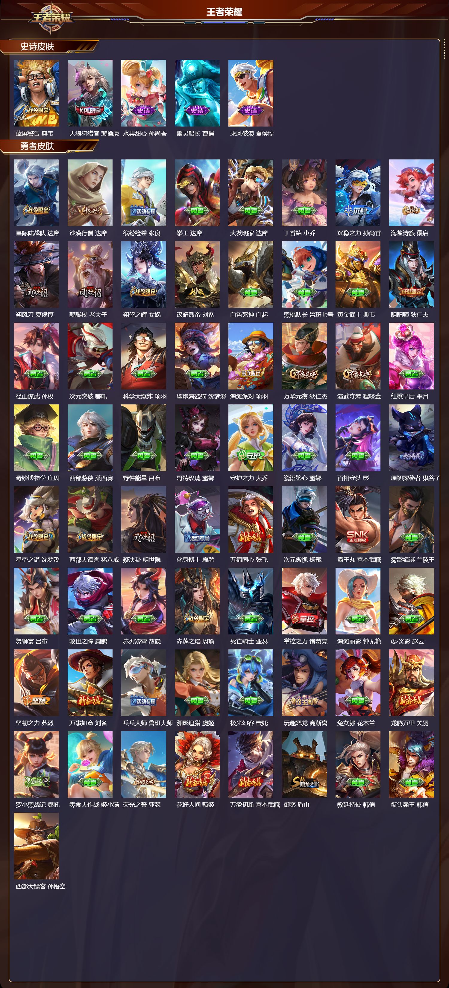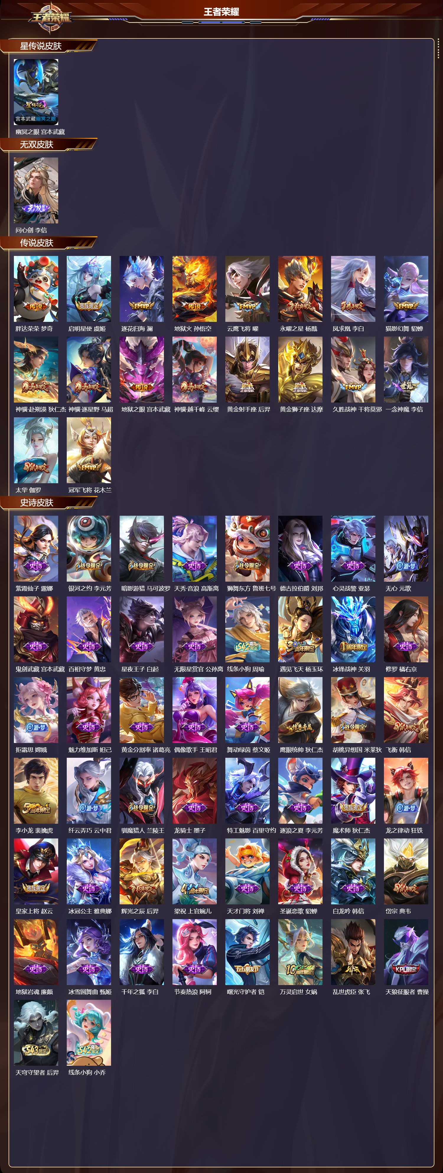 【55,史诗皮肤】,紫霞仙子,露娜,银河之约,李元芳,暗影游猎,马可波罗,天秀·音浪,高渐离,狮舞东方,鲁班七号,德古拉伯爵,刘邦,心灵战警,亚瑟,无心,元歌,鬼剑武藏,宫本武藏,百相守梦,黄忠,星夜王子,白起,无限星赏官,公孙离,线条小狗,周瑜,遇见飞天,杨玉环,冰锋战神,关羽,修罗,橘右京,拒霜思,嫦娥,魅力维加斯,妲己,黄金分割率,诸葛亮,偶像歌手,王昭君,舞动绿茵,蔡文姬,鹰眼统帅,狄仁杰,胡桃异想国,米莱狄,飞衡,韩信,李小龙,裴擒虎,纤云弄巧,云中君,驯魔猎人,兰陵王,龙骑士,墨子,特工魅影,百里守约,逐浪之夏,李元芳,魔术师,狄仁杰,龙之律动,狂铁,皇家上将,赵云,冰冠公主,雅典娜,辉光之辰,后羿,梁祝,上官婉儿,天才门将,刘禅,圣诞恋歌,貂蝉,白龙吟,韩信,岱宗,典韦,地狱岩魂,廉颇,冰雪圆舞曲,甄姬,千年之狐,李白,节奏热浪,阿轲,曙光守护者,铠,万灵启世,女娲,乱世虎臣,张飞,天狼征服者,曹操,天穹守望者,后羿,线条小狗,小乔,蓝屏警告,典韦,天狼狩猎者,裴擒虎,水果甜心,孙尚香,幽灵船长,曹操,乘风破浪,夏侯惇,