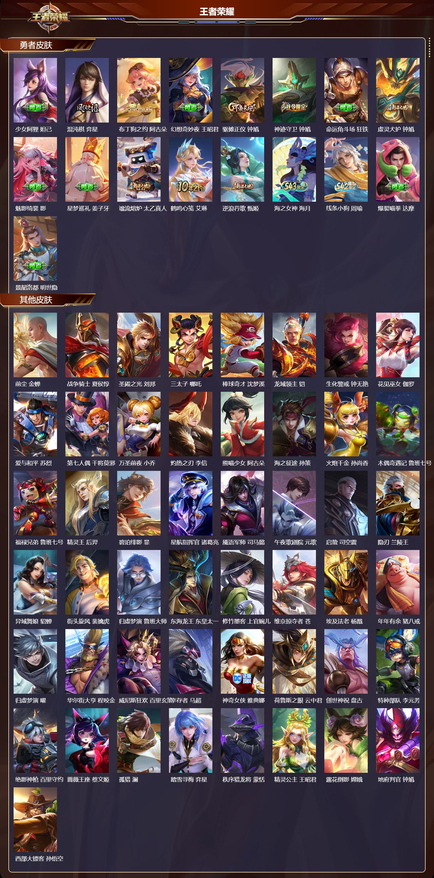 【49,其他皮肤】,前尘,金蝉,战争骑士,夏侯惇,圣殿之光,刘邦,三太子,哪吒,棒球奇才,沈梦溪,龙域领主,铠,生化警戒,钟无艳,花见巫女,伽罗,爱与和平,苏烈,第七人偶,干将莫邪,万圣前夜,小乔,灼热之刃,李信,熊喵少女,阿古朵,海之征途,孙策,火炮千金,孙尚香,木偶奇遇记,鲁班七号,福禄兄弟,鲁班七号,精灵王,后羿,碧珀绯影,暃,星航指挥官,诸葛亮,魇语军师,司马懿,午夜歌剧院,元歌,启蛰,司空震,隐刃,兰陵王,异域舞娘,貂蝉,街头旋风,裴擒虎,归虚梦演,鲁班大师,东海龙王,东皇太一,修竹墨客,上官婉儿,维京掠夺者,苍,埃及法老,杨戬,年年有余,猪八戒,归虚梦演,曜,华尔街大亨,程咬金,威尼斯狂欢,百里玄策,幸存者,马超,神奇女侠,雅典娜,荷鲁斯之眼,云中君,创世神祝,盘古,特种部队,李元芳,绝影神枪,百里守约,蔷薇王座,蔡文姬,孤猎,澜,踏雪寻梅,弈星,秩序猎龙将,蒙恬,精灵公主,王昭君,露花倒影,嫦娥,地府判官,钟馗,西部大镖客,孙悟空,
