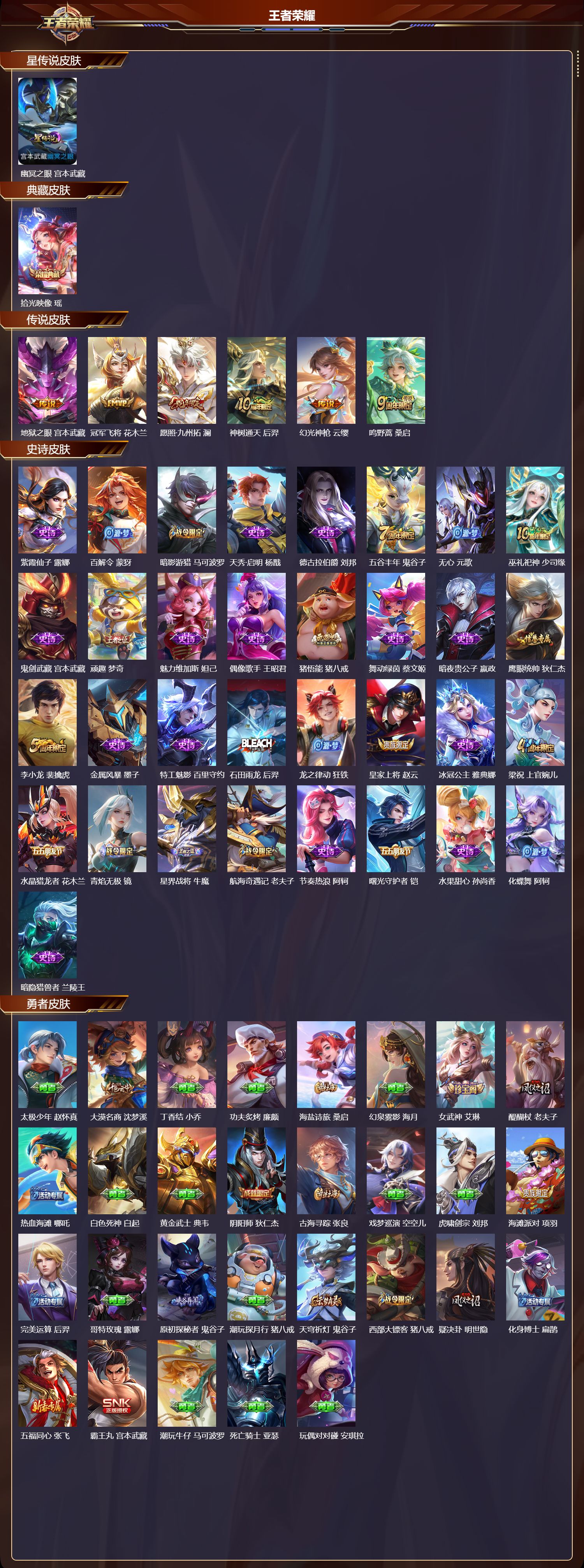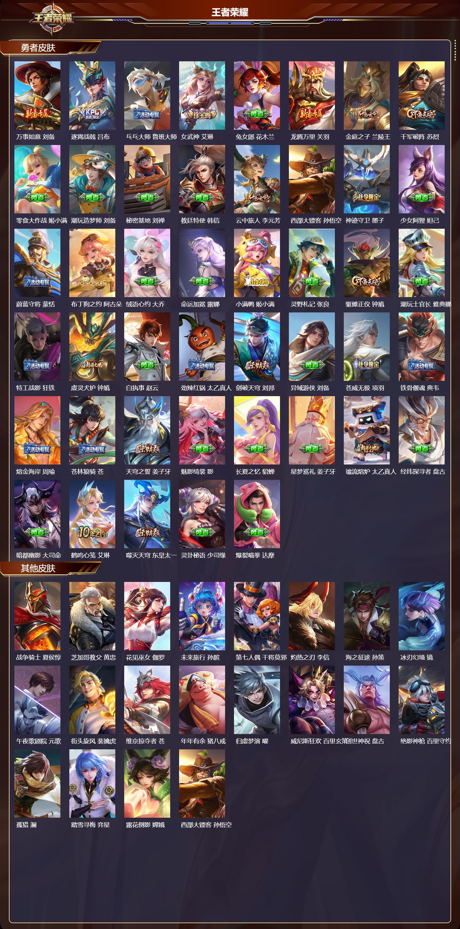 【73,勇者皮肤】,太极少年,赵怀真,大漠名商,沈梦溪,丁香结,小乔,功夫炙烤,廉颇,海盐诗旅,桑启,幻泉雾影,海月,醍醐杖,老夫子,热血海滩,哪吒,白色死神,白起,黄金武士,典韦,阴阳师,狄仁杰,古海寻踪,张良,戏梦巡演,空空儿,虎啸剑宗,刘邦,海滩派对,项羽,完美运算,后羿,哥特玫瑰,露娜,原初探秘者,鬼谷子,潮玩探月行,猪八戒,天穹祈灯,鬼谷子,西部大镖客,猪八戒,疑决卦,明世隐,化身博士,扁鹊,五福同心,张飞,霸王丸,宫本武藏,潮玩牛仔,马可波罗,死亡骑士,亚瑟,玩偶对对碰,安琪拉,万事如意,刘备,逐霄战戟,吕布,乓乓大师,鲁班大师,女武神,艾琳,兔女郎,花木兰,龙腾万里,关羽,金庭之子,兰陵王,千军破阵,苏烈,零食大作战,姬小满,潮玩造梦师,刘备,秘密基地,刘禅,教廷特使,韩信,云中旅人,李元芳,西部大镖客,孙悟空,神迹守卫,墨子,少女阿狸,妲己,蔚蓝守将,蒙恬,布丁狗之约,阿古朵,绒语心约,大乔,命运加冕,露娜,小满鸭,姬小满,灵野札记,张良,驱傩正仪,钟馗,潮玩士官长,雅典娜,特工战影,狂铁,虚灵犬护,钟馗,白执事,赵云,劲辣红锅,太乙真人,剑破天穹,刘邦,异域游侠,刘备,苍威无极,项羽,铁骨偃魂,典韦,熔金海岸,周瑜,苍林狼骑,苍,天穹之誓,姜子牙,魅影绮裳,影,长夏之忆,貂蝉,星梦巡礼,姜子牙,谧流熔炉,太乙真人,经纬探寻者,盘古,暗都幽影,大司命,鹤鸣心笺,艾琳,噬灭天穹,东皇太一,灵卦秘语,少司缘,爆裂喵拳,达摩,