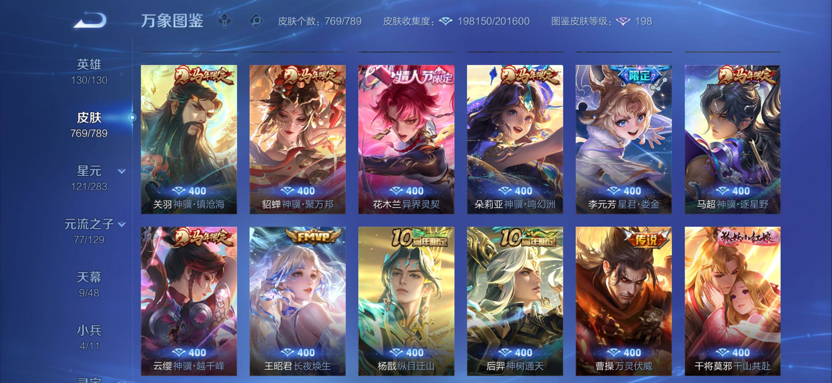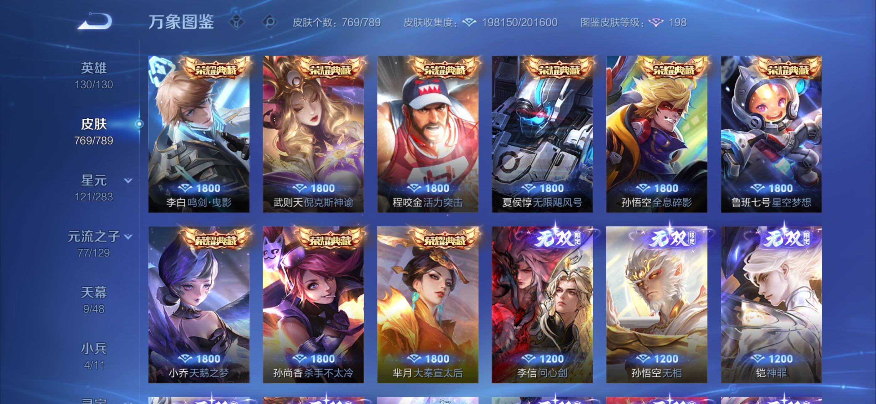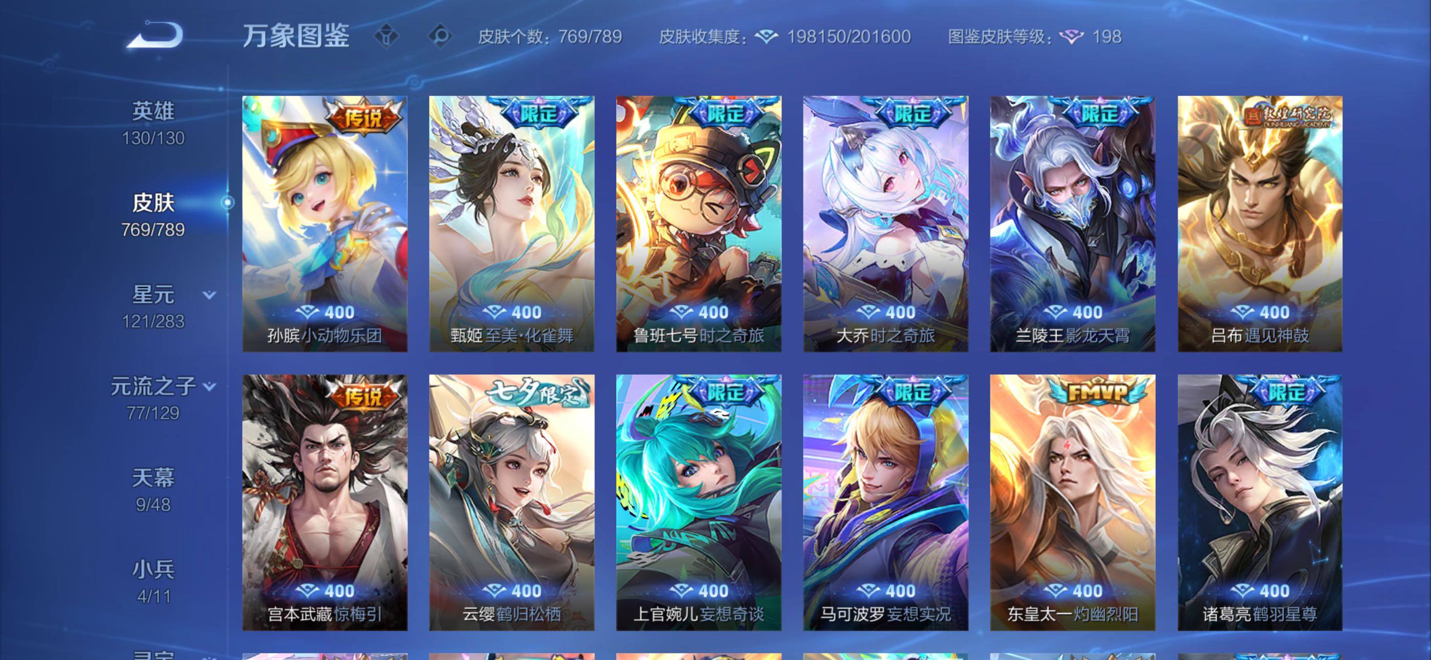 【史诗皮肤】:后羿天穹守望者,海月海之女神,达摩星君亢金,上官婉儿春霖将至,太乙真人瓦猫非猫,明世隐百晓客,盘古撼世英歌,蔡文姬奇遇梦乡,周瑜线条小狗,小乔线条小狗,项羽九幽镇关,少司缘巫礼祀神,女娲万灵启世,百里玄策罗小黑战记,兰陵王傩神司,莱西奥光弋星穹,公孙离涂山容容,弈星守夜人,西施织梦人,朵莉亚幻珠鲛人,黄忠百相守梦,云缨赞萌露比,钟无艳戍鼓铭心,周瑜百相守梦,后羿石田雨龙,牛魔小牛鸭,亚瑟布丁狗之誓,老夫子藏狐褐绒,百里守约雪豹霜爪,扁鹊灵蛊蚀心,狂铁龙之律动,刘禅鸭鸭历险记,阿轲化蝶舞,芈月瑰影绮梦,狄仁杰绮世丹青,苍狼魂孤将,亚连糖绘人间,赵怀真器灵浮梦炉,弈星万物之道,白起苍鳞隐世,姬小满飞车小橘子,孙膑茶境仙,牛魔星界战将,百里守约百相守梦,艾琳陌上桑,李白谪仙醉月,马可波罗星界特工,弈星炽弈燎原,亚连破空之剑,廉颇撼地雄心,姬小满战舞者,大司命东方月初,少司缘涂山红红,暃埋骨钱,蔡文姬夏日便利店,芈月浮光幕影,黄忠怒海争锋,海诺心动手记,明世隐夜落电台,关羽决胜骁骑,镜青焰无极,上官婉儿群星魔术团,桑启奇遇星旅,鲁班七号蔬乡物语,曹操夜都魔契,大乔乘龙忆丹青,安琪拉乘龙聚宝船,百里玄策超元猎域,姬小满妄想食味,伽罗琥珀纪元,蒙恬荣光圣徽,高渐离燃音魔法,妲己灵卜魔法,周瑜雪夜绮愿,姜子牙闲日渔趣,西施至美乘鲤谣,阿古朵江河有灵,司空震地狱燃心,李元芳匿光侦查者,莱西奥末日机甲,赵怀真鹤归松栖,百里守约真我赫兹,镜真我赫兹,海月浮梦罗烟,米莱狄完美假期,戈娅驭风魔法,刘禅电玩爆裂旋风,蔡文姬电玩兔顽号,沈梦溪匿光破解者,关羽百相守梦,刘备百相守梦,杨玉环银翎春语,镜玫瑰异探,瑶山海碧波行,盘古冰霜神祇,马可波罗山海玄木吟,暃星界游侠,梦奇顽趣,墨子降魔,元歌无心,上官婉儿神器万象笔,阿古朵顽趣,梦奇天降福星,盾山梦圆繁星,鬼谷子五谷丰年,妲己时之奇旅,弈星滕王阁序,钟无艳超时空战士,庄周天秀幻梦,鲁班大师匿光启智者,金蝉唐三藏,张良千筹问战,狂铁电玩高手,高渐离天秀音浪,貂蝉唤灵魅影,夏侯惇匿光决锋者,明世隐吟游魔法,艾琳奇遇舞章,澜赏金猎手,公孙离玉兔公主,赵云百木心枪,夏洛特永昼,云中君时之祈愿,哪吒雪上飞焰,孙膑寅虎展翼,廉颇寅虎御盾,杨玉环寅虎心曲,韩信傲雪梅枪,甄姬女儿国国王,雅典娜黎明之约,黄忠火炮绅士,镜匿光追影者,嫦娥拒霜思,司马懿暗渊魔法,庄周高山流水,猪八戒猪悟能,孙悟空孙行者,安琪拉时之奇旅,钟馗乐园奇幻夜,沈梦溪月团寄思,干将莫邪真爱魔法,杨戬天秀启明,鲁班七号乒乒小将,大乔白鹤梁神女,伽罗天狼溯光者,老夫子航海奇遇记,蒙犽龙鼓争鸣,百里玄策热力回旋,西施诗语江南,米莱狄胡桃异想国,花木兰默契交锋,吕布御风骁将,牛魔奔雷神使,芈月白晶晶,元歌云间偶戏,孙膑天狼运算者,云中君纤云弄巧,裴擒虎李小龙,百里玄策原初追逐者,蒙犽狂想玩偶喵,张飞虎魄,马可波罗暗影游猎,上官婉儿天狼绘梦者,孙尚香时之恋人,黄忠烈魂,赵云龙胆,瑶遇见神鹿,马超神威,橘右京修罗,阿轲迷踪丽影,不知火舞魅语,小乔青蛇,大乔白蛇,后羿如梦令,嫦娥如梦令,庄周玄嵩,甄姬幽恒,妲己时之彼端,典韦岱宗,韩信飞衡,娜可露露晚萤,李元芳银河之约,蔡文姬繁星吟游,曹操天狼征服者,上官婉儿梁祝,兰陵王驯魔猎人,公孙离无限星赏官,狄仁杰鹰眼统帅,鲁班七号狮舞东方,裴擒虎天狼狩猎者,伽罗箭羽风息,典韦蓝屏警告,花木兰瑞麟志,苏烈玄武志,孙悟空大圣娶亲,露娜一生所爱,干将莫邪冰霜恋舞曲,百里守约朱雀志,铠青龙志,大乔猫狗日记,孙策猫狗日记,嬴政白昼王子,蔡文姬奇迹圣诞,东皇太一逐梦之光,杨玉环遇见飞天,阿轲节奏热浪,白起星夜王子,程咬金功夫厨神,李元芳逐浪之夏,公孙离蜜橘之夏,刘禅天才门将,哪吒逐梦之翼,裴擒虎梅西,蔡文姬舞动绿茵,铠曙光守护者,百里守约特工魅影,花木兰青春决赛季,庄周云端筑梦师,后羿辉光之辰,安琪拉心灵骇客,雅典娜冰冠公主,亚瑟心灵战警,马可波罗逐梦之星,甄姬游园惊梦,诸葛亮黄金分割率,兰陵王暗隐猎兽者,小乔缤纷独角兽,夏侯惇乘风破浪,韩信逐梦之影,刘邦德古拉伯爵,花木兰水晶猎龙者,赵云引擎之心,孙悟空至尊宝,王昭君凤凰于飞,貂蝉逐梦之音,关羽冰锋战神,虞姬霸王别姬,项羽霸王别姬,韩信白龙吟,张飞乱世虎臣,妲己热情桑巴,吕布末日机甲,李白千年之狐,曹操幽灵船长,周瑜真爱至上,小乔纯白花嫁,刘禅绅士熊喵,吕布圣诞狂欢,墨子金属风暴,墨子龙骑士,妲己女仆咖啡,妲己魅力维加斯,嬴政摇滚巨星,嬴政暗夜贵公子,孙尚香水果甜心,孙尚香蔷薇恋人,宫本武藏鬼剑武藏,廉颇地狱岩魂,狄仁杰魔术师,王昭君偶像歌手,甄姬冰雪圆舞曲,老夫子圣诞老人,貂蝉圣诞恋歌,赵云未来纪元,赵云皇家上将,赵云嘻哈天王,钟无艳王者之锤,阿轲暗夜猫娘,露娜紫霞仙子,项羽苍穹之光,项羽职棒王牌,鲁班七号电玩小子