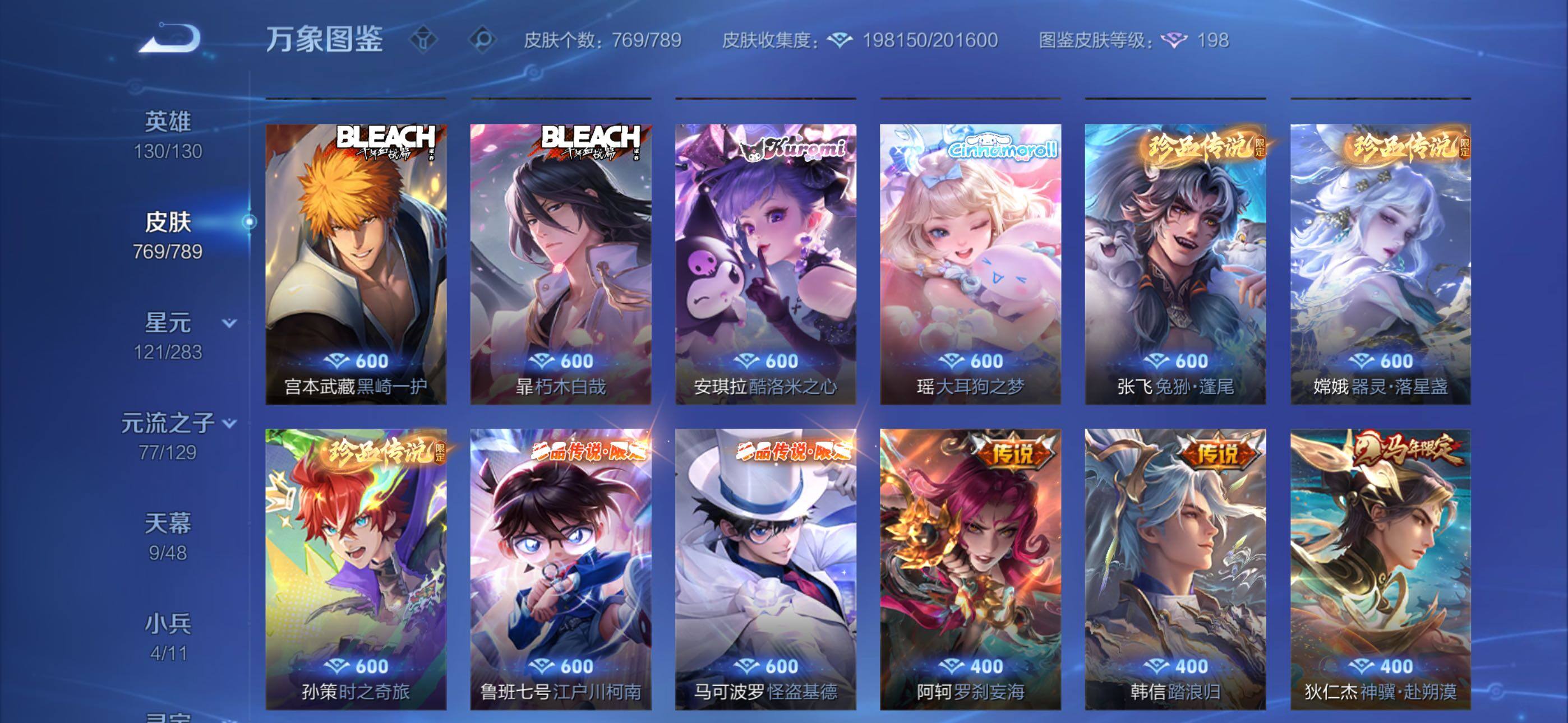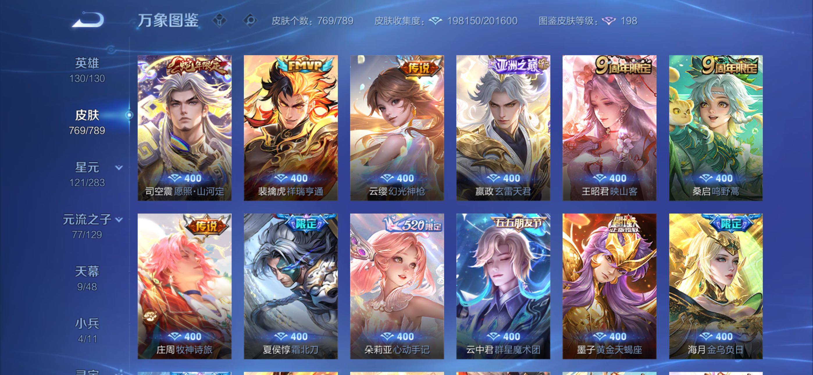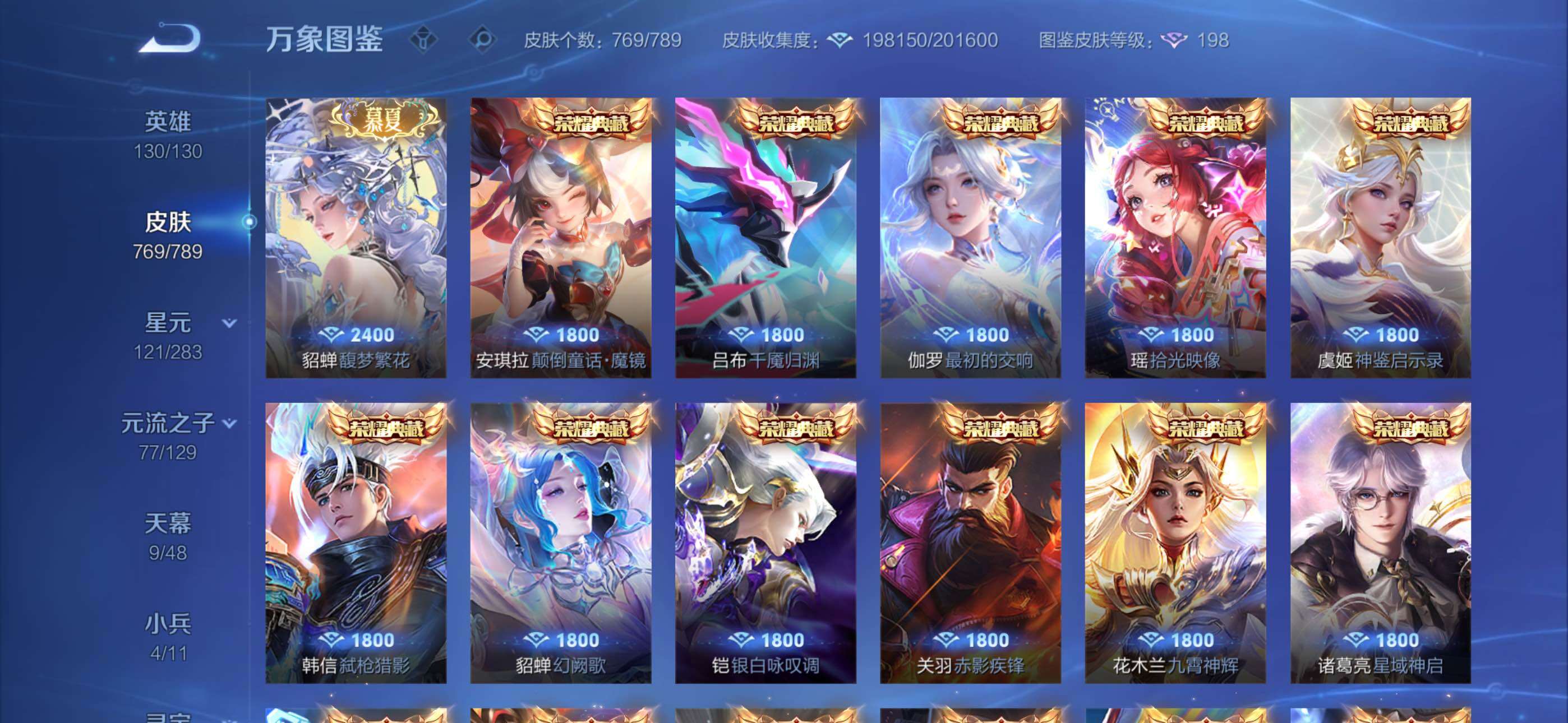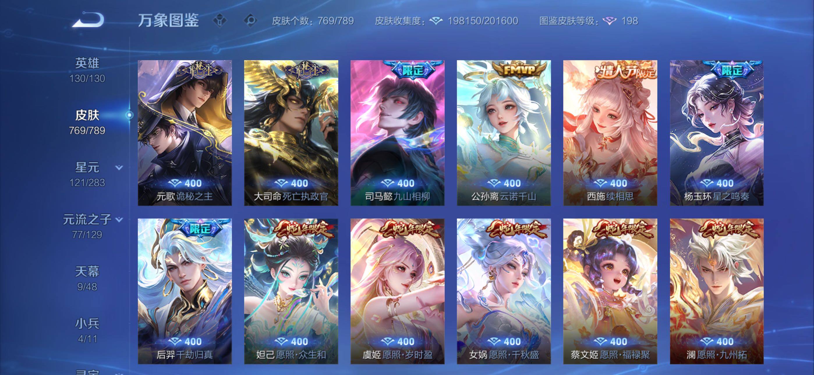 【史诗皮肤】:后羿天穹守望者,海月海之女神,达摩星君亢金,上官婉儿春霖将至,太乙真人瓦猫非猫,明世隐百晓客,盘古撼世英歌,蔡文姬奇遇梦乡,周瑜线条小狗,小乔线条小狗,项羽九幽镇关,少司缘巫礼祀神,女娲万灵启世,百里玄策罗小黑战记,兰陵王傩神司,莱西奥光弋星穹,公孙离涂山容容,弈星守夜人,西施织梦人,朵莉亚幻珠鲛人,黄忠百相守梦,云缨赞萌露比,钟无艳戍鼓铭心,周瑜百相守梦,后羿石田雨龙,牛魔小牛鸭,亚瑟布丁狗之誓,老夫子藏狐褐绒,百里守约雪豹霜爪,扁鹊灵蛊蚀心,狂铁龙之律动,刘禅鸭鸭历险记,阿轲化蝶舞,芈月瑰影绮梦,狄仁杰绮世丹青,苍狼魂孤将,亚连糖绘人间,赵怀真器灵浮梦炉,弈星万物之道,白起苍鳞隐世,姬小满飞车小橘子,孙膑茶境仙,牛魔星界战将,百里守约百相守梦,艾琳陌上桑,李白谪仙醉月,马可波罗星界特工,弈星炽弈燎原,亚连破空之剑,廉颇撼地雄心,姬小满战舞者,大司命东方月初,少司缘涂山红红,暃埋骨钱,蔡文姬夏日便利店,芈月浮光幕影,黄忠怒海争锋,海诺心动手记,明世隐夜落电台,关羽决胜骁骑,镜青焰无极,上官婉儿群星魔术团,桑启奇遇星旅,鲁班七号蔬乡物语,曹操夜都魔契,大乔乘龙忆丹青,安琪拉乘龙聚宝船,百里玄策超元猎域,姬小满妄想食味,伽罗琥珀纪元,蒙恬荣光圣徽,高渐离燃音魔法,妲己灵卜魔法,周瑜雪夜绮愿,姜子牙闲日渔趣,西施至美乘鲤谣,阿古朵江河有灵,司空震地狱燃心,李元芳匿光侦查者,莱西奥末日机甲,赵怀真鹤归松栖,百里守约真我赫兹,镜真我赫兹,海月浮梦罗烟,米莱狄完美假期,戈娅驭风魔法,刘禅电玩爆裂旋风,蔡文姬电玩兔顽号,沈梦溪匿光破解者,关羽百相守梦,刘备百相守梦,杨玉环银翎春语,镜玫瑰异探,瑶山海碧波行,盘古冰霜神祇,马可波罗山海玄木吟,暃星界游侠,梦奇顽趣,墨子降魔,元歌无心,上官婉儿神器万象笔,阿古朵顽趣,梦奇天降福星,盾山梦圆繁星,鬼谷子五谷丰年,妲己时之奇旅,弈星滕王阁序,钟无艳超时空战士,庄周天秀幻梦,鲁班大师匿光启智者,金蝉唐三藏,张良千筹问战,狂铁电玩高手,高渐离天秀音浪,貂蝉唤灵魅影,夏侯惇匿光决锋者,明世隐吟游魔法,艾琳奇遇舞章,澜赏金猎手,公孙离玉兔公主,赵云百木心枪,夏洛特永昼,云中君时之祈愿,哪吒雪上飞焰,孙膑寅虎展翼,廉颇寅虎御盾,杨玉环寅虎心曲,韩信傲雪梅枪,甄姬女儿国国王,雅典娜黎明之约,黄忠火炮绅士,镜匿光追影者,嫦娥拒霜思,司马懿暗渊魔法,庄周高山流水,猪八戒猪悟能,孙悟空孙行者,安琪拉时之奇旅,钟馗乐园奇幻夜,沈梦溪月团寄思,干将莫邪真爱魔法,杨戬天秀启明,鲁班七号乒乒小将,大乔白鹤梁神女,伽罗天狼溯光者,老夫子航海奇遇记,蒙犽龙鼓争鸣,百里玄策热力回旋,西施诗语江南,米莱狄胡桃异想国,花木兰默契交锋,吕布御风骁将,牛魔奔雷神使,芈月白晶晶,元歌云间偶戏,孙膑天狼运算者,云中君纤云弄巧,裴擒虎李小龙,百里玄策原初追逐者,蒙犽狂想玩偶喵,张飞虎魄,马可波罗暗影游猎,上官婉儿天狼绘梦者,孙尚香时之恋人,黄忠烈魂,赵云龙胆,瑶遇见神鹿,马超神威,橘右京修罗,阿轲迷踪丽影,不知火舞魅语,小乔青蛇,大乔白蛇,后羿如梦令,嫦娥如梦令,庄周玄嵩,甄姬幽恒,妲己时之彼端,典韦岱宗,韩信飞衡,娜可露露晚萤,李元芳银河之约,蔡文姬繁星吟游,曹操天狼征服者,上官婉儿梁祝,兰陵王驯魔猎人,公孙离无限星赏官,狄仁杰鹰眼统帅,鲁班七号狮舞东方,裴擒虎天狼狩猎者,伽罗箭羽风息,典韦蓝屏警告,花木兰瑞麟志,苏烈玄武志,孙悟空大圣娶亲,露娜一生所爱,干将莫邪冰霜恋舞曲,百里守约朱雀志,铠青龙志,大乔猫狗日记,孙策猫狗日记,嬴政白昼王子,蔡文姬奇迹圣诞,东皇太一逐梦之光,杨玉环遇见飞天,阿轲节奏热浪,白起星夜王子,程咬金功夫厨神,李元芳逐浪之夏,公孙离蜜橘之夏,刘禅天才门将,哪吒逐梦之翼,裴擒虎梅西,蔡文姬舞动绿茵,铠曙光守护者,百里守约特工魅影,花木兰青春决赛季,庄周云端筑梦师,后羿辉光之辰,安琪拉心灵骇客,雅典娜冰冠公主,亚瑟心灵战警,马可波罗逐梦之星,甄姬游园惊梦,诸葛亮黄金分割率,兰陵王暗隐猎兽者,小乔缤纷独角兽,夏侯惇乘风破浪,韩信逐梦之影,刘邦德古拉伯爵,花木兰水晶猎龙者,赵云引擎之心,孙悟空至尊宝,王昭君凤凰于飞,貂蝉逐梦之音,关羽冰锋战神,虞姬霸王别姬,项羽霸王别姬,韩信白龙吟,张飞乱世虎臣,妲己热情桑巴,吕布末日机甲,李白千年之狐,曹操幽灵船长,周瑜真爱至上,小乔纯白花嫁,刘禅绅士熊喵,吕布圣诞狂欢,墨子金属风暴,墨子龙骑士,妲己女仆咖啡,妲己魅力维加斯,嬴政摇滚巨星,嬴政暗夜贵公子,孙尚香水果甜心,孙尚香蔷薇恋人,宫本武藏鬼剑武藏,廉颇地狱岩魂,狄仁杰魔术师,王昭君偶像歌手,甄姬冰雪圆舞曲,老夫子圣诞老人,貂蝉圣诞恋歌,赵云未来纪元,赵云皇家上将,赵云嘻哈天王,钟无艳王者之锤,阿轲暗夜猫娘,露娜紫霞仙子,项羽苍穹之光,项羽职棒王牌,鲁班七号电玩小子