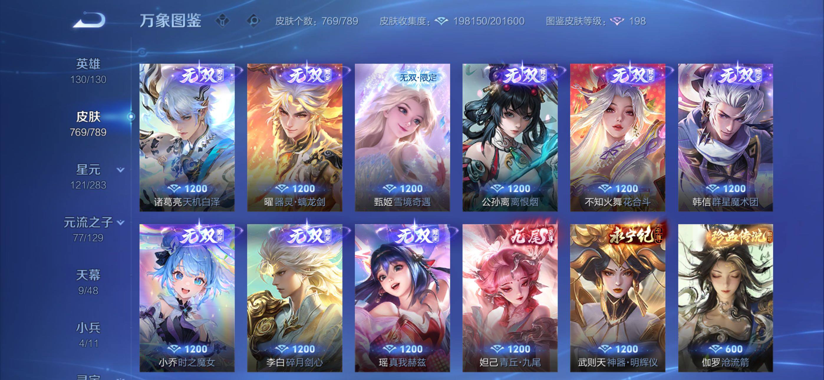 【无双皮肤】:李信问心剑,孙悟空无相,铠神罪,诸葛亮天机白泽,曜器灵螭龙剑,甄姬雪境奇遇,公孙离离恨烟,不知火舞花合斗,韩信群星魔术团,小乔时之魔女,李白碎月剑心,瑶真我赫兹,妲己青丘九尾,武则天神器明辉仪