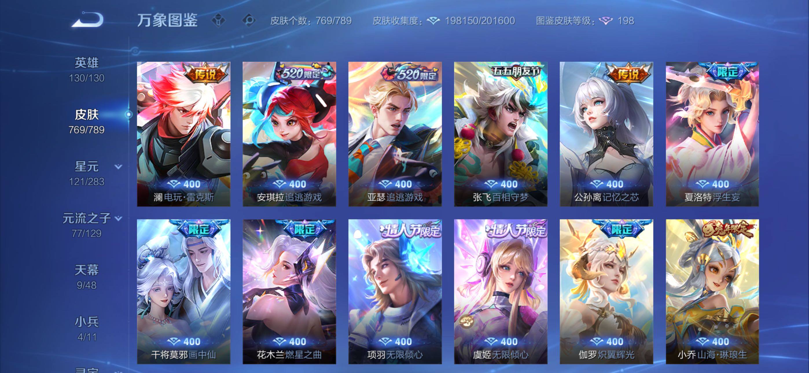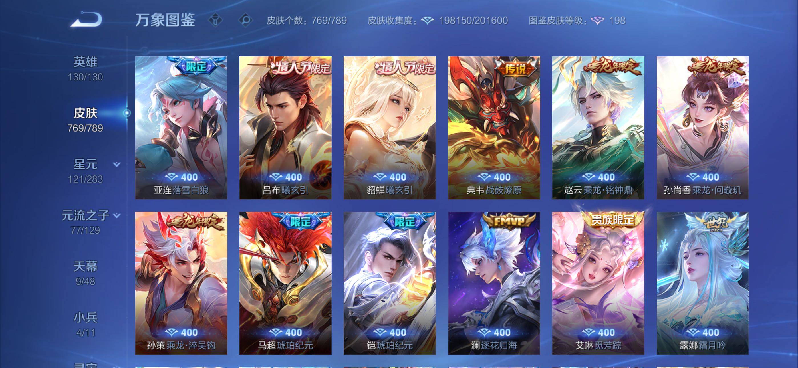 【限定皮肤】:白起狰,公孙离离恨烟,夏侯惇霜北刀,暃埋骨钱,蔡文姬夏日便利店,大乔绒语心约,虞姬夏日便利店,姜子牙天穹之誓,李白谪仙醉月,狄仁杰阴阳师,小乔纯白花嫁,虞姬凯尔特女王,廉颇寅虎御盾,小乔山海琳琅生,赵云皇家上将,赵云引擎之心,赵云龙胆,赵云百木心枪,墨子神迹守卫,墨子降魔,妲己热情桑巴,妲己时之彼端,妲己时之奇旅,嬴政白昼王子,孙尚香蔷薇恋人,孙尚香异界灵契,鲁班七号狮舞东方,鲁班七号乒乒小将,鲁班七号寅虎瑞焰,鲁班七号时之奇旅,庄周蜃楼王,庄周云端筑梦师,庄周玄嵩,庄周高山流水,高渐离死亡摇滚,高渐离玩趣恶龙,阿轲迷踪丽影,钟无艳王者之锤,钟无艳超时空战士,孙膑妖精王,孙膑天狼运算者,孙膑寅虎展翼,扁鹊炼金王,白起夜都怪侠,芈月白晶晶,芈月幻夜卜梦,吕布天魔缭乱,吕布猎兽之王,吕布御风骁将,吕布遇见神鼓,周瑜真爱至上,周瑜赤莲之焰,元歌云间偶戏,元歌无心,夏侯惇朔风刀,夏侯惇匿光决锋者,甄姬幽恒,甄姬女儿国国王,甄姬游园惊梦,甄姬落雪兰心,甄姬至美化雀舞,曹操烛龙,曹操天狼征服者,典韦穷奇,典韦蓝屏警告,典韦岱宗,马可波罗逐梦之星,马可波罗暗影游猎,马可波罗深海之息,马可波罗山海玄木吟,马可波罗妄想实况,狄仁杰魔术师,狄仁杰万华元夜,狄仁杰神器狴犴令,达摩星际陆战队,达摩沙漠行僧,项羽海滩派对,项羽霸王别姬,项羽无限倾心,老夫子圣诞老人,老夫子醍醐杖,老夫子航海奇遇记,关羽冰锋战神,关羽武圣,关羽百相守梦,貂蝉逐梦之音,貂蝉遇见胡旋,安琪拉追逃游戏,程咬金演武夺筹,露娜一生所爱,露娜启示之音,刘邦夺宝奇兵,韩信逐梦之影,韩信飞衡,韩信傲雪梅枪,王昭君凤凰于飞,王昭君午后时光,王昭君星穹之声,兰陵王默契交锋,兰陵王影龙天霄,兰陵王驯魔猎人,兰陵王金庭之子,花木兰青春决赛季,花木兰瑞麟志,花木兰默契交锋,花木兰燃星之曲,不知火舞绯月行,娜可露露前尘镜,橘右京枫霜尽,亚瑟狮心王,亚瑟潮玩骑士王,亚瑟追逃游戏,孙悟空美猴王,孙悟空至尊宝,孙悟空大圣娶亲,孙悟空零号赤焰,孙悟空孙行者,孙悟空齐天大圣,牛魔御旌,牛魔奔雷神使,后羿辉光之辰,后羿如梦令,后羿圣弓游侠,后羿无尽星芒,刘备百相守梦,张飞虎魄,张飞百相守梦,李元芳银河之约,李元芳匿光侦查者,李元芳云中旅人,虞姬霸王别姬,虞姬启明星使,虞姬无限倾心,钟馗神迹守卫,钟馗驱傩正仪,杨玉环遇见飞天,杨玉环寅虎心曲,杨戬永曜之星,杨戬潮玩骑兵,女娲朔望之晖,女娲补天,哪吒逐梦之翼,干将莫邪冰霜恋舞曲,干将莫邪胡桃夹子,干将莫邪真爱魔法,干将莫邪画中仙,雅典娜单词大作战,雅典娜黎明之约,蔡文姬奇迹圣诞,蔡文姬繁星吟游,太乙真人饕餮,东皇太一逐梦之光,鬼谷子原初探秘者,鬼谷子五谷丰年,诸葛亮武陵仙君,诸葛亮时雨天司,诸葛亮鹤羽星尊,大乔白鹤梁神女,大乔挚爱花嫁,大乔时之奇旅,黄忠烈魂,黄忠火炮绅士,铠青龙志,苏烈玄武志,苏烈千军破阵,百里玄策白虎志,百里玄策原初追逐者,百里守约朱雀志,弈星混沌棋,梦奇顽趣,梦奇天降福星,公孙离蜜橘之夏,公孙离祈雪灵祝,公孙离玉兔公主,沈梦溪星空之诺,沈梦溪大漠名商,沈梦溪匿光破解者,明世隐疑决卦,明世隐吟游魔法,裴擒虎天狼狩猎者,裴擒虎李小龙,裴擒虎寅虎赤拳,裴擒虎擒涛扼浪,狂铁御狮,狂铁电玩高手,米莱狄御霄,米莱狄胡桃异想国,瑶时之祈愿,瑶山海碧波行,云中君纤云弄巧,云中君时之祈愿,李信山海炽霜斩,伽罗太华,伽罗天狼溯光者,伽罗炽翼辉光,盾山御銮,盾山梦圆繁星,孙策挚爱之约,猪八戒西部大镖客,猪八戒猪悟能,上官婉儿梁祝,上官婉儿天狼绘梦者,上官婉儿神器万象笔,上官婉儿妄想奇谈,嫦娥如梦令,嫦娥拒霜思,嫦娥暖冬兔眠,曜李逍遥,,曜山海苍雷引,西施玲珑珍味,西施至美乘鲤谣,蒙犽狂想玩偶喵,鲁班大师匿光启智者,鲁班大师探海日志,盘古冰霜神祇,镜匿光追影者,桑启海盐诗旅,夏洛特浮生妄,金蝉唐三藏,暃星界游侠,戈娅驭风魔法,艾琳女武神,艾琳流音漫舞,赵怀真鹤归松栖,云缨鹤归松栖,司空震地狱燃心,阿古朵江河有灵,张良古海寻踪,裴擒虎梅西,艾琳觅芳踪,蒙恬荣光圣徽,高渐离燃音魔法,妲己灵卜魔法,鬼谷子天穹祈灯,李白碎月剑心,伽罗琥珀纪元,铠琥珀纪元,马超琥珀纪元,姬小满妄想食味,小乔时之魔女,大乔乘龙忆丹青,安琪拉乘龙聚宝船,孙尚香乘龙问璇玑,孙策乘龙淬吴钩,赵云乘龙铭钟鼎,吕布曦玄引,貂蝉曦玄引,百里玄策超元猎域,亚连落雪白狼,沈梦溪龙舞盛年,曹操夜都魔契,鲁班七号蔬乡物语,李元芳蔬乡物语,海月金乌负日,上官婉儿群星魔术团,韩信群星魔术团,云中君群星魔术团,关羽决胜骁骑,镜青焰无极,项羽苍威无极,朵莉亚心动手记,海诺心动手记,刘备异域游侠,芈月浮光幕影,不知火舞花合斗