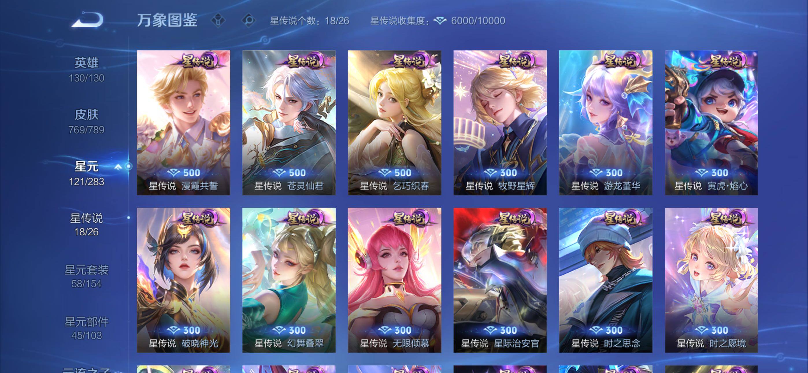 【星元皮肤】:孙策漫霞共誓,诸葛亮苍灵仙君,王昭君乞巧织春,庄周牧野星辉,西施游龙堇华,鲁班七号寅虎焰心,镜破晓神光,貂蝉幻舞叠翠,虞姬无限倾慕,狄仁杰星际治安官,刘备时之思念,瑶时之愿境,孙悟空零号雷霆,孙尚香未来机甲,武则天幻海之心,孙悟空幽冥火,宫本武藏幽冥之眼,貂蝉金色仲夏夜