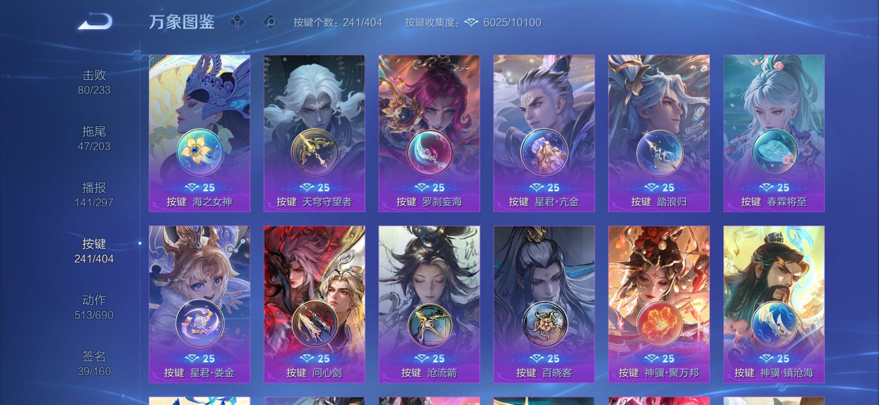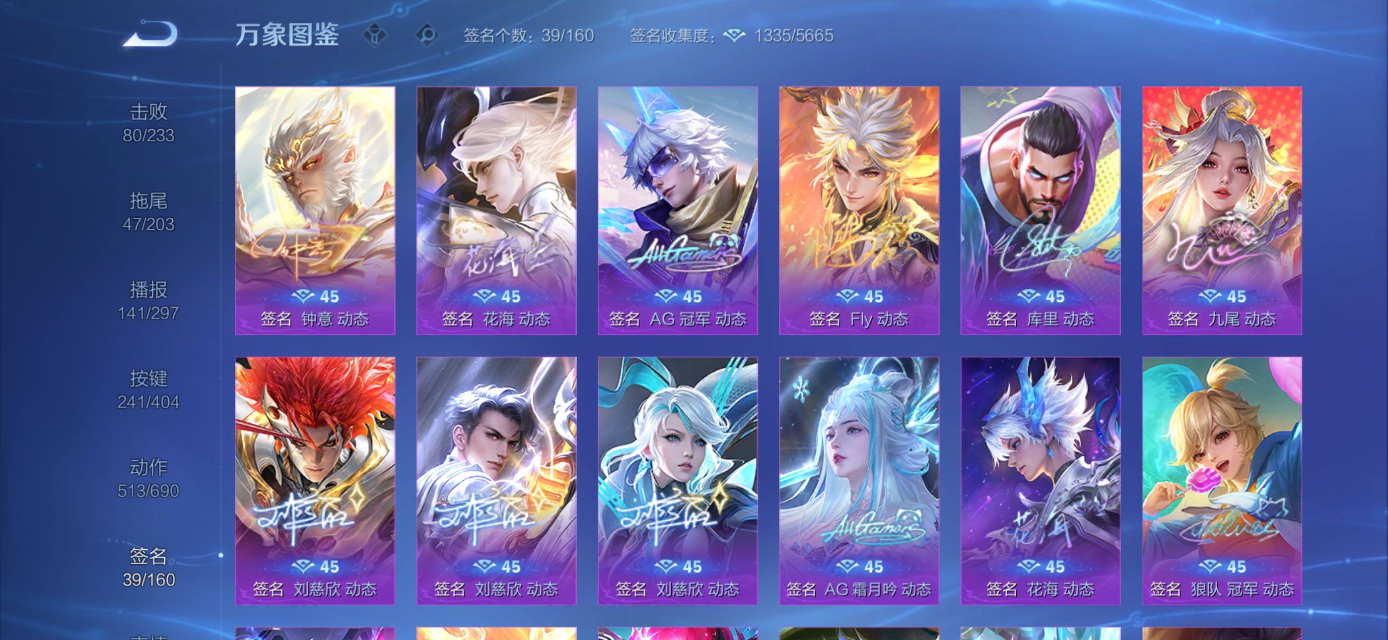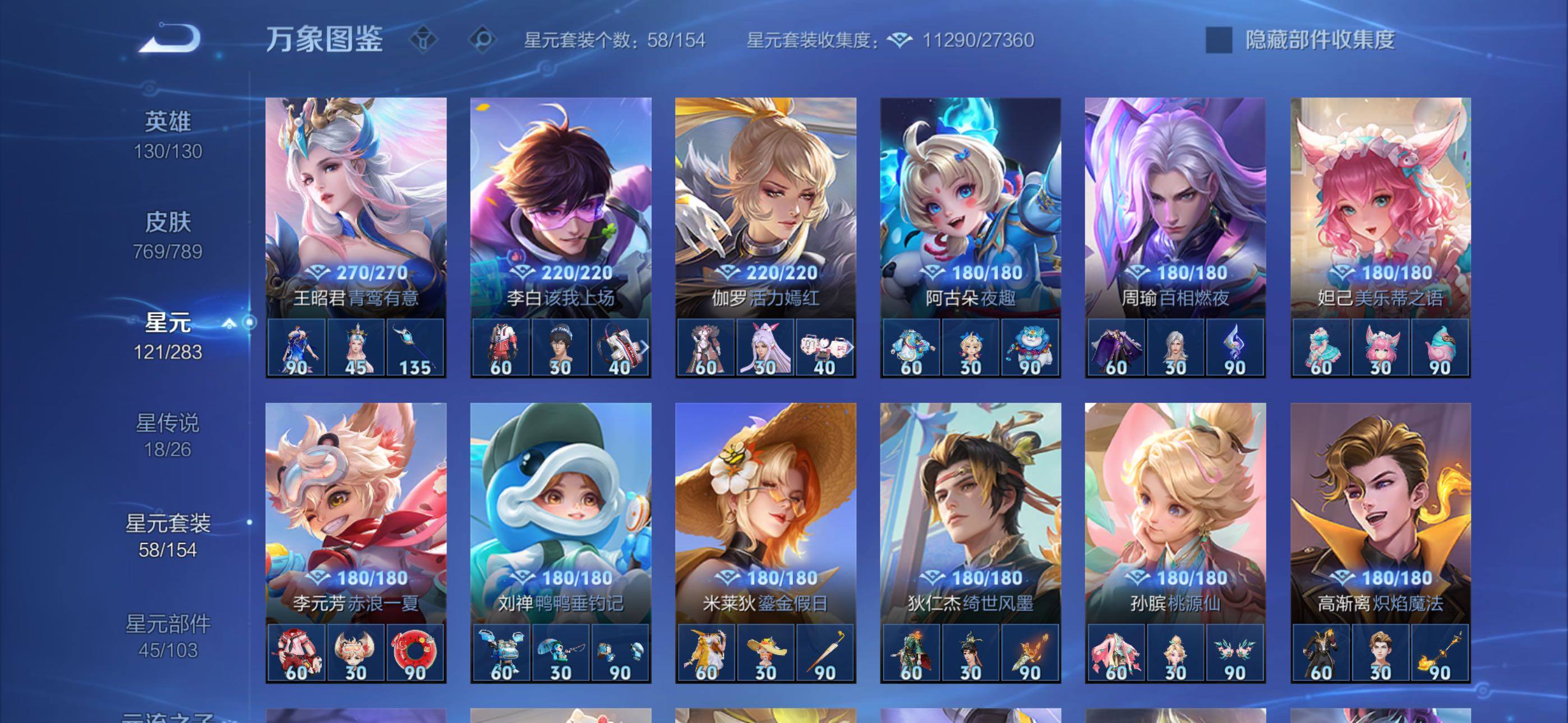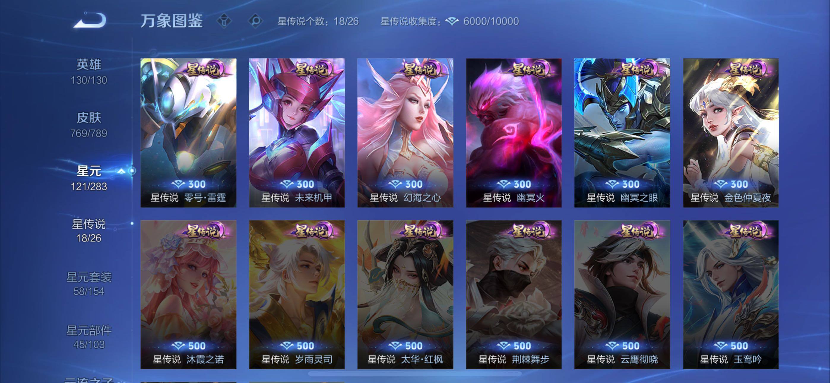 【荣耀典藏】:武则天英雄,孙悟空全息碎影,武则天倪克斯神谕,夏侯惇无限飓风号,小乔天鹅之梦,孙尚香杀手不太冷,鲁班七号星空梦想,芈月大秦宣太后,程咬金活力突击,李白鸣剑曳影,诸葛亮星域神启,花木兰九霄神辉,关羽赤影疾锋,铠银白咏叹调,貂蝉幻阙歌,韩信弑枪猎影,虞姬神鉴启示录,瑶拾光映像,伽罗最初的交响,吕布千魇归渊,安琪拉颠倒童话魔镜