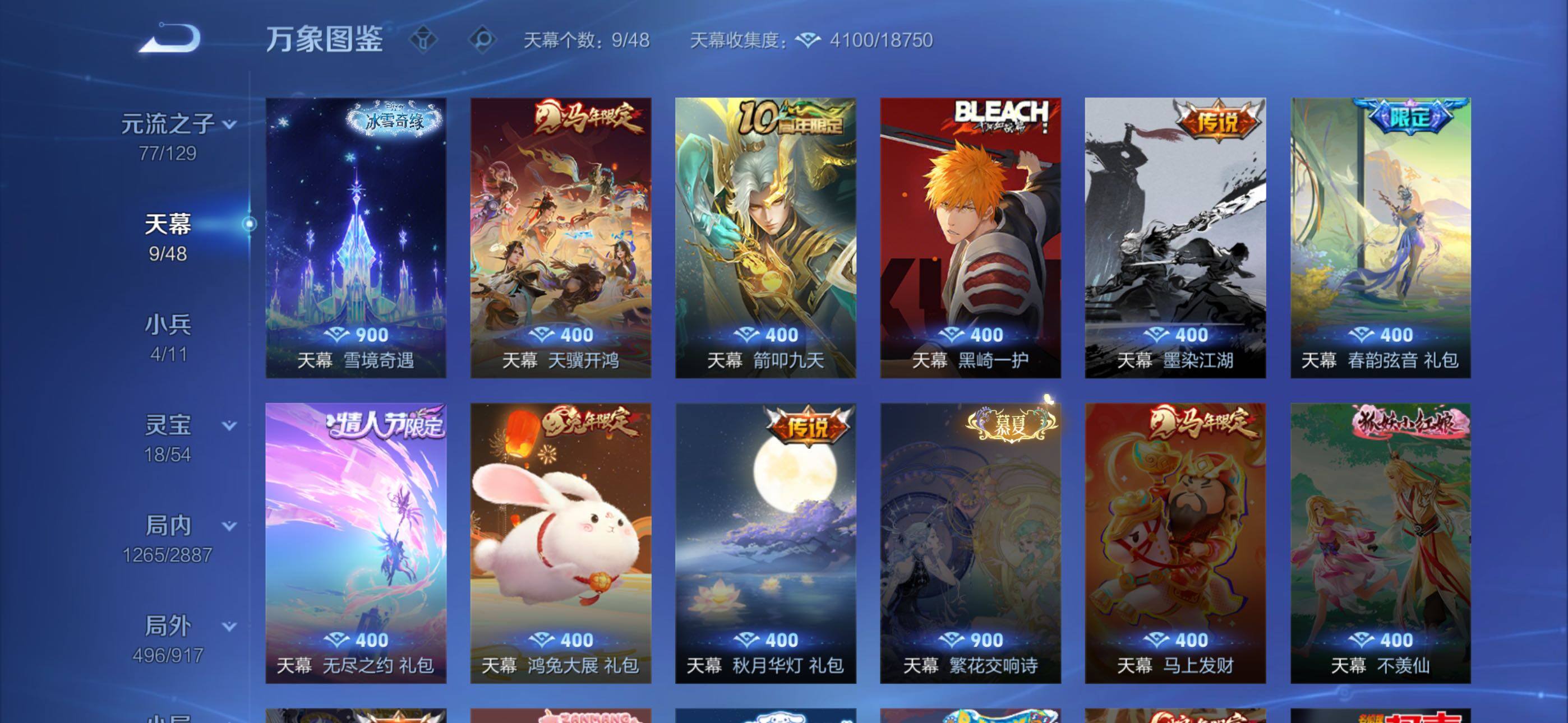 【天幕】:雪境奇遇天幕,天骥开鸿天幕,箭叩九天天幕,黑崎一护天幕,墨染江湖天幕,春韵弦音天幕,无尽之约天幕,鸿兔大展天幕,秋月华灯天幕