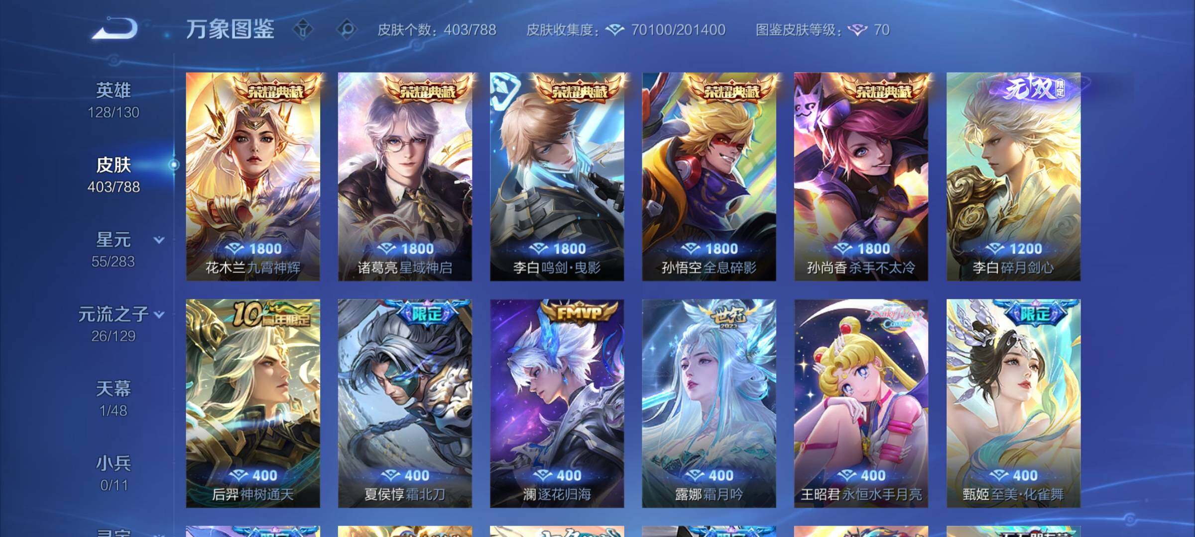 【限定皮肤】:夏侯惇霜北刀,暃埋骨钱,蔡文姬夏日便利店,大乔绒语心约,虞姬夏日便利店,姜子牙天穹之誓,杨戬破阵退雄兵,狄仁杰阴阳师,赵云皇家上将,赵云引擎之心,墨子神迹守卫,墨子降魔,孙尚香蔷薇恋人,鲁班七号寅虎瑞焰,庄周高山流水,阿轲迷踪丽影,钟无艳超时空战士,扁鹊奇幻香踪,白起夜都怪侠,芈月幻夜卜梦,吕布遇见神鼓,元歌云间偶戏,元歌无心,甄姬游园惊梦,甄姬落雪兰心,甄姬至美化雀舞,典韦岱宗,马可波罗暗影游猎,马可波罗深海之息,马可波罗山海玄木吟,狄仁杰魔术师,狄仁杰万华元夜,达摩星际陆战队,达摩沙漠行僧,项羽海滩派对,老夫子醍醐杖,老夫子航海奇遇记,关羽百相守梦,程咬金演武夺筹,刘邦夺宝奇兵,韩信傲雪梅枪,王昭君凤凰于飞,王昭君午后时光,兰陵王默契交锋,兰陵王金庭之子,花木兰燃星之曲,不知火舞绯月行,亚瑟潮玩骑士王,亚瑟追逃游戏,孙悟空美猴王,孙悟空至尊宝,孙悟空零号赤焰,孙悟空孙行者,孙悟空齐天大圣,后羿圣弓游侠,刘备百相守梦,张飞百相守梦,李元芳匿光侦查者,李元芳云中旅人,虞姬启明星使,钟馗驱傩正仪,杨玉环遇见飞天,杨戬潮玩骑兵,干将莫邪真爱魔法,雅典娜单词大作战,雅典娜黎明之约,鬼谷子原初探秘者,鬼谷子五谷丰年,诸葛亮武陵仙君,诸葛亮时雨天司,诸葛亮鹤羽星尊,大乔时之奇旅,黄忠火炮绅士,苏烈千军破阵,百里玄策白虎志,百里玄策原初追逐者,百里守约朱雀志,弈星混沌棋,梦奇顽趣,公孙离玉兔公主,沈梦溪大漠名商,沈梦溪匿光破解者,明世隐疑决卦,明世隐吟游魔法,裴擒虎李小龙,裴擒虎擒涛扼浪,狂铁电玩高手,米莱狄胡桃异想国,云中君纤云弄巧,伽罗天狼溯光者,猪八戒西部大镖客,上官婉儿梁祝,嫦娥拒霜思,嫦娥暖冬兔眠,曜李逍遥,,曜山海苍雷引,西施玲珑珍味,西施至美乘鲤谣,蒙犽狂想玩偶喵,鲁班大师探海日志,镜匿光追影者,桑启海盐诗旅,夏洛特浮生妄,暃星界游侠,戈娅驭风魔法,艾琳女武神,艾琳流音漫舞,赵怀真鹤归松栖,云缨鹤归松栖,司空震地狱燃心,阿古朵江河有灵,张良古海寻踪,王昭君永恒水手月亮,蒙犽百解令,蒙恬荣光圣徽,高渐离燃音魔法,妲己灵卜魔法,鬼谷子天穹祈灯,李白碎月剑心,伽罗琥珀纪元,沈梦溪龙舞盛年,刘邦剑破天穹,程咬金群星魔术团,镜青焰无极,项羽苍威无极,海诺心动手记,周瑜熔金海岸