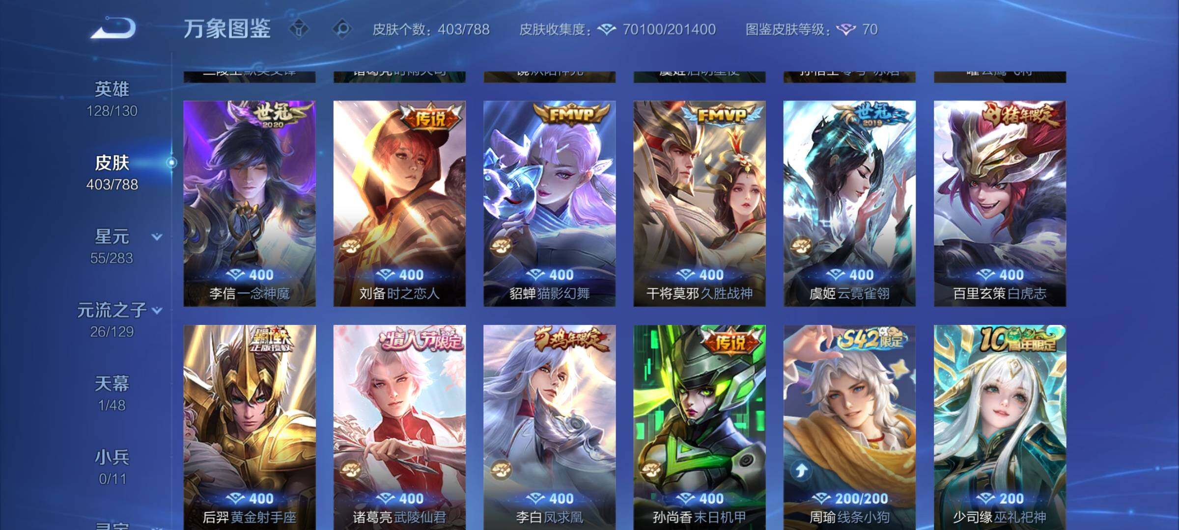 【史诗皮肤】:周瑜线条小狗,少司缘巫礼祀神,百里玄策罗小黑战记,莱西奥光弋星穹,公孙离涂山容容,后羿石田雨龙,扁鹊灵蛊蚀心,狂铁龙之律动,弈星万物之道,牛魔星界战将,暃埋骨钱,蔡文姬夏日便利店,海诺心动手记,镜青焰无极,伽罗琥珀纪元,蒙恬荣光圣徽,高渐离燃音魔法,妲己灵卜魔法,蒙犽百解令,西施至美乘鲤谣,阿古朵江河有灵,司空震地狱燃心,李元芳匿光侦查者,莱西奥末日机甲,赵怀真鹤归松栖,镜真我赫兹,戈娅驭风魔法,沈梦溪匿光破解者,关羽百相守梦,刘备百相守梦,扁鹊奇幻香踪,镜玫瑰异探,马可波罗山海玄木吟,暃星界游侠,梦奇顽趣,墨子降魔,元歌无心,鬼谷子五谷丰年,钟无艳超时空战士,狂铁电玩高手,高渐离天秀音浪,貂蝉唤灵魅影,明世隐吟游魔法,澜赏金猎手,公孙离玉兔公主,夏洛特永昼,韩信傲雪梅枪,雅典娜黎明之约,黄忠火炮绅士,镜匿光追影者,嫦娥拒霜思,司马懿暗渊魔法,庄周高山流水,孙悟空孙行者,干将莫邪真爱魔法,杨戬天秀启明,伽罗天狼溯光者,老夫子航海奇遇记,米莱狄胡桃异想国,元歌云间偶戏,云中君纤云弄巧,裴擒虎李小龙,百里玄策原初追逐者,蒙犽狂想玩偶喵,马可波罗暗影游猎,孙尚香时之恋人,马超神威,橘右京修罗,阿轲迷踪丽影,不知火舞魅语,大乔白蛇,典韦岱宗,上官婉儿梁祝,狄仁杰鹰眼统帅,伽罗箭羽风息,百里守约朱雀志,大乔猫狗日记,孙策猫狗日记,杨玉环遇见飞天,阿轲节奏热浪,白起星夜王子,程咬金功夫厨神,李元芳逐浪之夏,刘禅天才门将,蔡文姬舞动绿茵,铠曙光守护者,百里守约特工魅影,安琪拉心灵骇客,雅典娜冰冠公主,亚瑟心灵战警,甄姬游园惊梦,诸葛亮黄金分割率,兰陵王暗隐猎兽者,小乔缤纷独角兽,夏侯惇乘风破浪,刘邦德古拉伯爵,花木兰水晶猎龙者,赵云引擎之心,孙悟空至尊宝,王昭君凤凰于飞,张飞乱世虎臣,吕布末日机甲,李白千年之狐,曹操幽灵船长,刘禅绅士熊喵,吕布圣诞狂欢,墨子金属风暴,墨子龙骑士,妲己女仆咖啡,妲己魅力维加斯,嬴政摇滚巨星,嬴政暗夜贵公子,孙尚香水果甜心,孙尚香蔷薇恋人,宫本武藏鬼剑武藏,廉颇地狱岩魂,狄仁杰魔术师,王昭君偶像歌手,甄姬冰雪圆舞曲,貂蝉圣诞恋歌,赵云未来纪元,赵云皇家上将,阿轲暗夜猫娘,露娜紫霞仙子,鲁班七号电玩小子