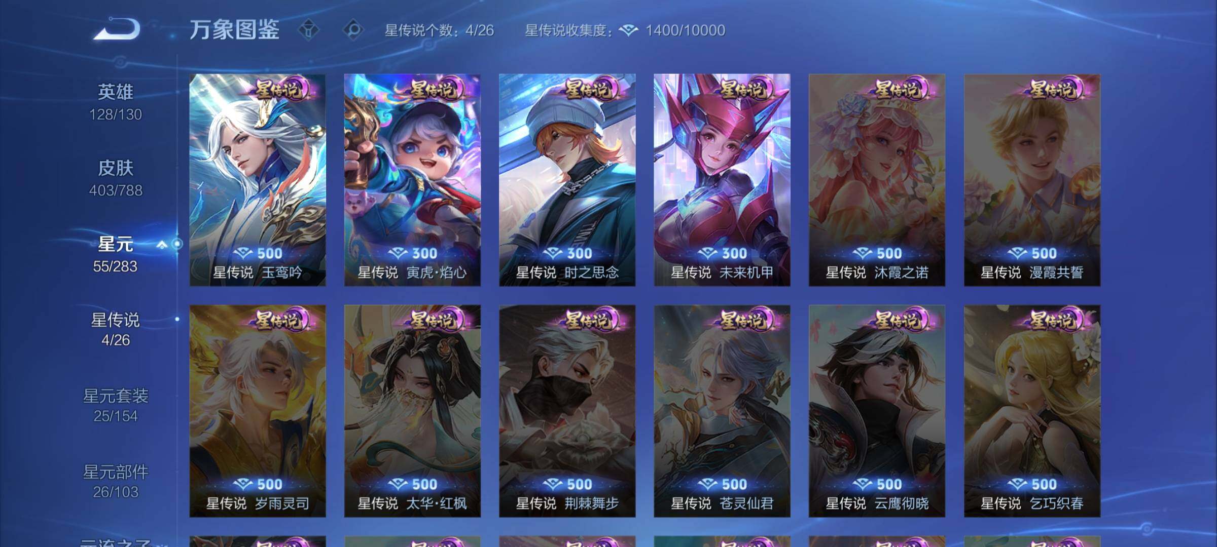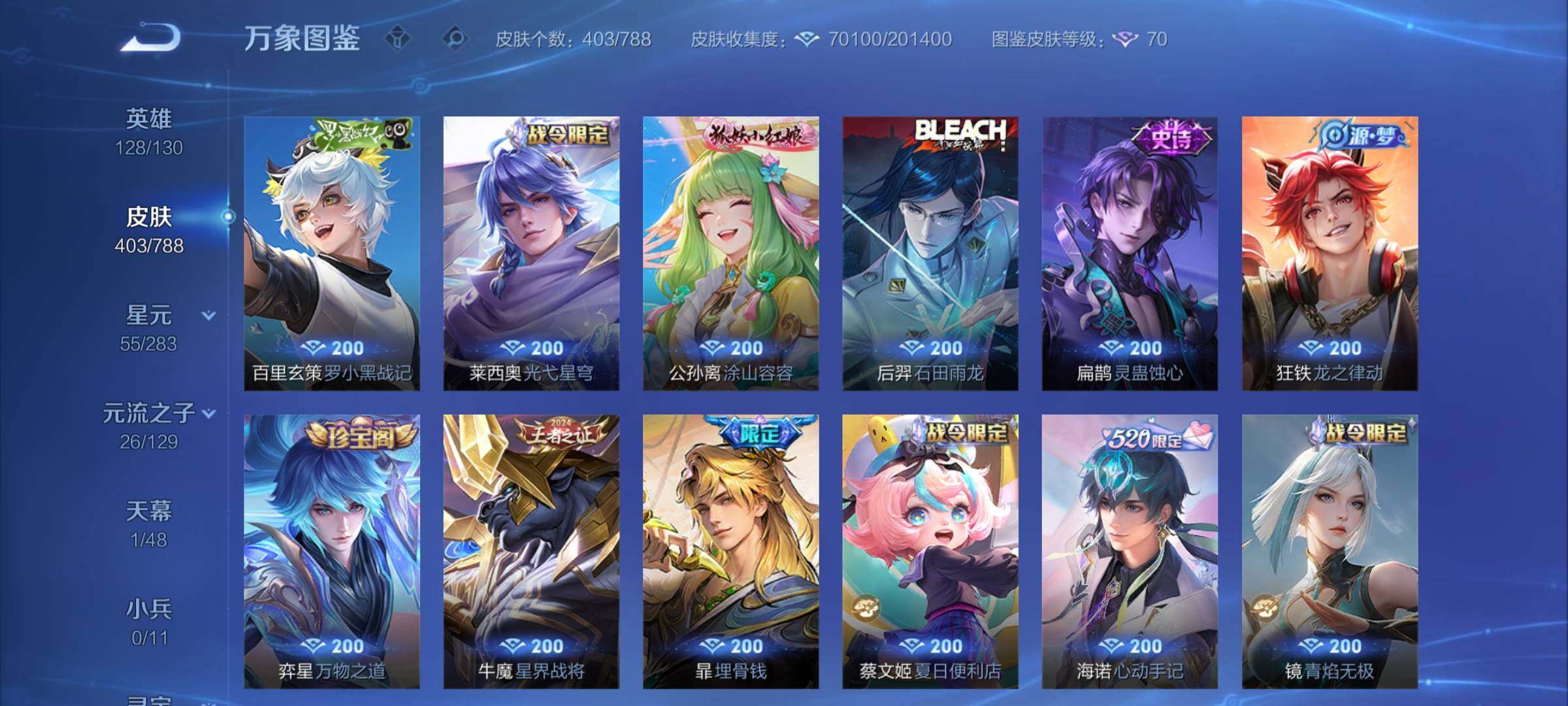 【战令限定】:阿轲迷踪丽影,刘邦夺宝奇兵,马可波罗暗影游猎,猪八戒西部大镖客,蒙犽狂想玩偶喵,雅典娜单词大作战,元歌云间偶戏,亚瑟潮玩骑士王,米莱狄胡桃异想国,达摩星际陆战队,老夫子航海奇遇记,墨子神迹守卫,干将莫邪真爱魔法,后羿圣弓游侠,黄忠火炮绅士,芈月幻夜卜梦,明世隐吟游魔法,白起夜都怪侠,狂铁电玩高手,王昭君午后时光,钟无艳超时空战士,甄姬落雪兰心,暃星界游侠,嫦娥暖冬兔眠,扁鹊奇幻香踪,杨戬潮玩骑兵,戈娅驭风魔法,西施玲珑珍味,司空震地狱燃心,艾琳流音漫舞,高渐离燃音魔法,妲己灵卜魔法,镜青焰无极,项羽苍威无极,蔡文姬夏日便利店,虞姬夏日便利店,莱西奥光弋星穹,明世隐往忆晖光,周瑜线条小狗