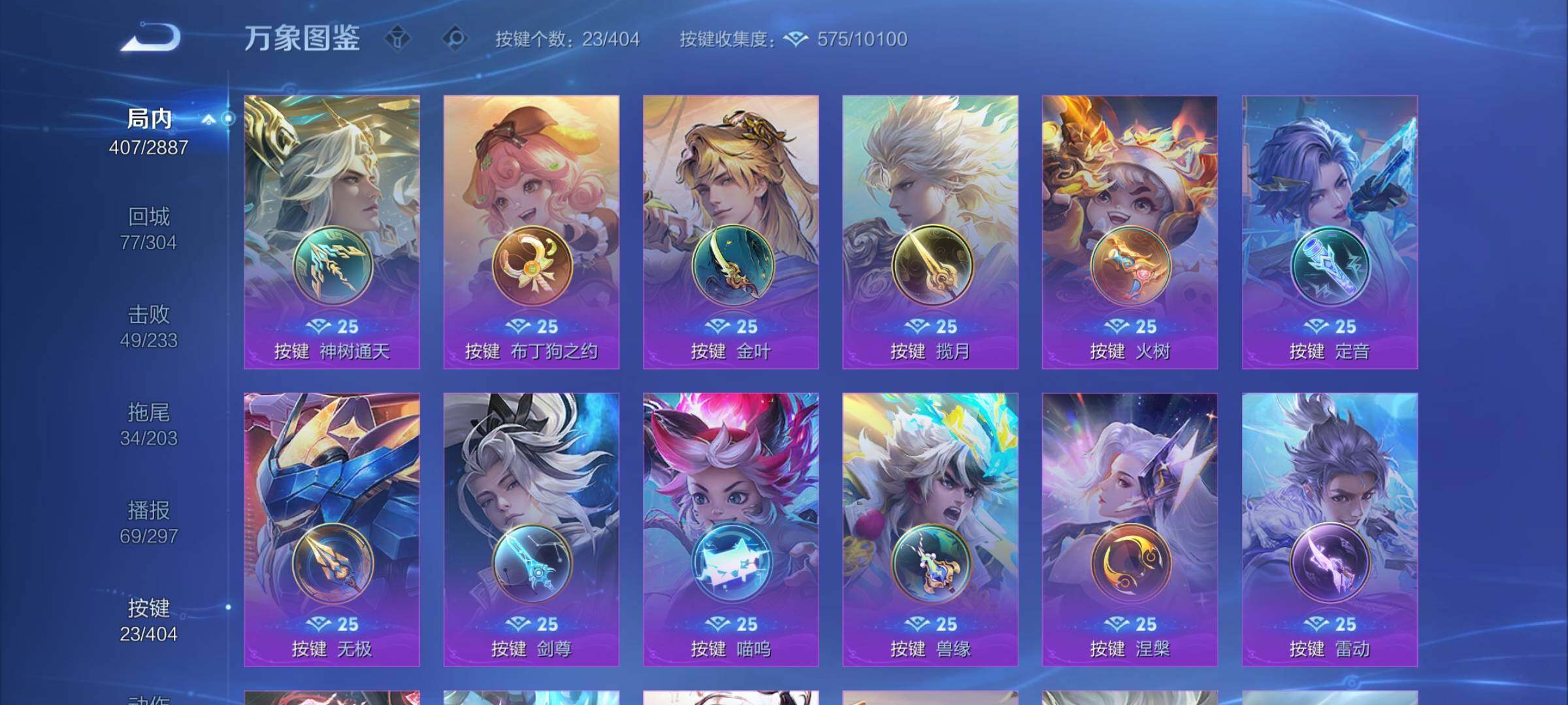 【其他皮肤】:兰陵王雾影缉谜,妲己线条小狗,桑启线条小狗,安琪拉糖果风暴,鬼谷子谜偶窥秘,虞姬溯影追猎,蚩奼极光幻客,曹操逐霄之志,艾琳鹤鸣心笺,孙权径山谋武,明世隐往忆晖光,亚瑟荣光之誓,哪吒罗小黑战记,莱西奥踏浪烽翎,空空儿戏梦巡演,云中君云械蓝图,甄姬逆浪荇歌,阿古朵布丁狗之约,张良灵野札记,钟馗虚灵犬护,戈娅玫蓝誓约,姜子牙星梦巡礼,西施雪境奇遇,太乙真人谧流熔炉,大乔绒语心约,虞姬夏日便利店,周瑜熔金海岸,姜子牙天穹之誓,杨戬破阵退雄兵,项羽苍威无极,程咬金群星魔术团,刘邦剑破天穹,沈梦溪龙舞盛年,廉颇功夫炙烤,朵莉亚金色潮汐,嫦娥漠中幻影,海诺时空谍影,妲己灵卜魔法,鬼谷子天穹祈灯,程咬金暖冬絮语,后羿完美运算,曹操决胜大满贯,兰陵王幻夜行动,亚连破局者,海月王牌新星,钟无艳聚星闪耀,张良古海寻踪,艾琳流音漫舞,姬小满零食大作战,西施玲珑珍味,鲁班大师探海日志,莱西奥西部游侠,太乙真人劲辣红锅,杨戬潮玩骑兵,裴擒虎擒涛扼浪,赵怀真太极少年,白起乐园追猎者,牛魔牛运亨通,猪八戒潮玩探月行,海月幻泉雾影,嫦娥暖冬兔眠,桑启海盐诗旅,戈娅危途狂花,刘备潮玩造梦师,李元芳云中旅人,甄姬落雪兰心,蒙恬蔚蓝守将,沈梦溪大漠名商,王昭君午后时光,米莱狄契约魔法,刘禅唤灵魔甲,兰陵王金庭之子,白起夜都怪侠,刘邦虎啸剑宗,程咬金无双福将,芈月幻夜卜梦,达摩沙漠行僧,后羿圣弓游侠,苏烈千军破阵,鲁班大师乓乓大师,墨子神迹守卫,钟馗驱傩正仪,盘古重装意志,张良缤纷绘卷,程咬金演武夺筹,达摩星际陆战队,露娜瓷语鉴心,刘禅秘密基地,亚瑟潮玩骑士王,狄仁杰万华元夜,雅典娜单词大作战,鬼谷子原初探秘者,狂铁特工战影,猪八戒西部大镖客,老夫子醍醐杖,盾山圆桌骑士,刘邦夺宝奇兵,明世隐疑决卦,哪吒次元突破,弈星混沌棋,姜子牙炽热元素使,沈梦溪鲨炮海盗猫,孙膑归虚梦演,吕布野性能量,小乔丁香结,庄周奇妙博物学,明世隐虹云星官,大乔守护之力,苏烈坚韧之力,鬼谷子幻乐之宴,李白敏锐之力,诸葛亮掌控之力,孙尚香沉稳之力,老夫子功夫老勺,狂铁命运角斗场,王昭君幻想奇妙夜,钟无艳海滩丽影,墨子进击墨子号,关羽龙腾万里,刘备汉昭烈帝,刘备纽约教父,狄仁杰阴阳师,后羿阿尔法小队,宫本武藏万象初新,刘备万事如意,甄姬花好人间,张飞五福同心,花木兰兔女郎,孙悟空美猴王,达摩拳王,亚瑟死亡骑士,典韦黄金武士,妲己少女阿狸,姜子牙时尚教父,孙膑天使之翼,安琪拉玩偶对对碰,宫本武藏未来纪元,扁鹊救世之瞳,扁鹊化身博士,武则天东方不败,牛魔西部大镖客,白起白色死神,程咬金星际陆战队,艾琳女武神,芈月红桃皇后,赵云忍炎影,赵云白执事,达摩大发明家,阿轲爱心护理,露娜哥特玫瑰,韩信街头霸王,韩信教廷特使,项羽海滩派对,桑启画中游,暃碧珀绯影,金蝉前尘,云缨赤焰之缨,司空震启蛰,澜孤猎,阿古朵熊喵少女,蒙恬秩序猎龙将,镜冰刃幻境,蒙犽归虚梦演,鲁班大师归虚梦演,西施归虚梦演,马超幸存者,曜归虚梦演,云中君荷鲁斯之眼,瑶森,盘古创世神祝,猪八戒年年有余,嫦娥露花倒影,上官婉儿修竹墨客,李信灼热之刃,沈梦溪棒球奇才,伽罗花见巫女,盾山极冰防御线,司马懿魇语军师,孙策海之征途,元歌午夜歌剧院,米莱狄精准探案法,弈星踏雪寻梅,裴擒虎街头旋风,杨玉环霓裳曲,公孙离花间舞,明世隐占星师,女娲尼罗河女神,梦奇美梦成真,苏烈爱与和平,百里玄策威尼斯狂欢,百里守约绝影神枪,铠龙域领主,鬼谷子阿摩司公爵,干将莫邪第七人偶,东皇太一东海龙王,大乔伊势巫女,黄忠芝加哥教父,诸葛亮星航指挥官,哪吒三太子,太乙真人圆桌骑士,杨戬埃及法老,苍维京掠夺者,马可波罗激情绿茵,雅典娜战争女神,夏侯惇战争骑士,蔡文姬蔷薇王座,关羽天启骑士,虞姬加勒比小姐,刘邦圣殿之光,李元芳特种部队,钟馗地府判官,李白范海辛,兰陵王隐刃,刘禅英喵野望,后羿精灵王,周瑜海军大将,孙悟空西部大镖客,孙膑未来旅行,小乔万圣前夜,张良一千零一夜,曹操超能战警,曹操死神来了,狄仁杰锦衣卫,王昭君精灵公主,老夫子潮流仙人,花木兰剑舞者,貂蝉异域舞娘,钟无艳生化警戒,露娜绯红之刃,项羽帝国元帅,高渐离金属狂潮,鲁班七号木偶奇遇记,鲁班七号福禄兄弟