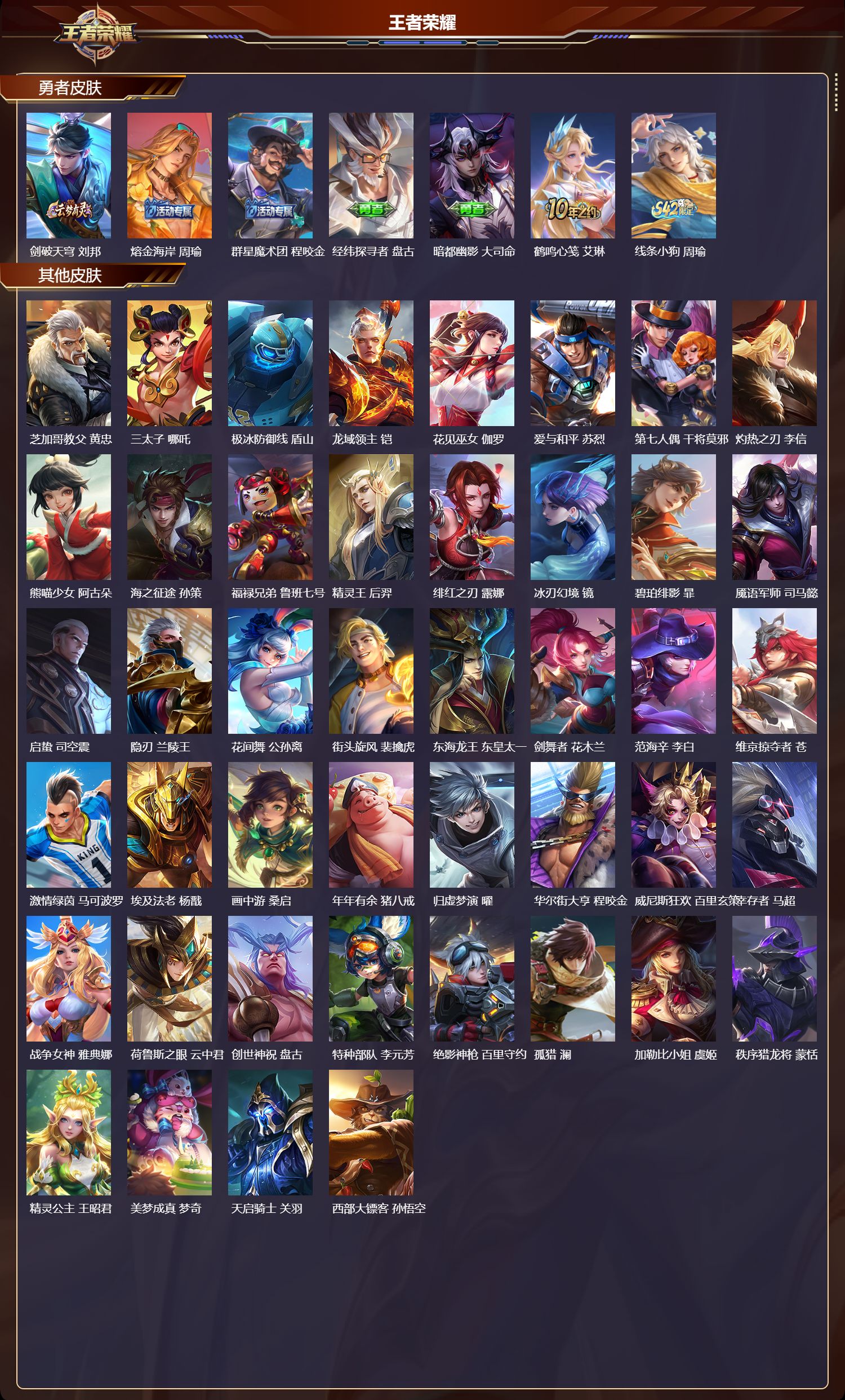 【44,其他皮肤】芝加哥教父,黄忠,三太子,哪吒,极冰防御线,盾山,龙域领主,铠,花见巫女,伽罗,爱与和平,苏烈,第七人偶,干将莫邪,灼热之刃,李信,熊喵少女,阿古朵,海之征途,孙策,福禄兄弟,鲁班七号,精灵王,后羿,绯红之刃,露娜,冰刃幻境,镜,碧珀绯影,暃,魇语军师,司马懿,启蛰,司空震,隐刃,兰陵王,花间舞,公孙离,街头旋风,裴擒虎,东海龙王,东皇太一,剑舞者,花木兰,范海辛,李白,维京掠夺者,苍,激情绿茵,马可波罗,埃及法老,杨戬,画中游,桑启,年年有余,猪八戒,归虚梦演,曜,华尔街大亨,程咬金,威尼斯狂欢,百里玄策,幸存者,马超,战争女神,雅典娜,荷鲁斯之眼,云中君,创世神祝,盘古,特种部队,李元芳,绝影神枪,百里守约,孤猎,澜,加勒比小姐,虞姬,秩序猎龙将,蒙恬,精灵公主,王昭君,美梦成真,梦奇,天启骑士,关羽,西部大镖客,孙悟空,