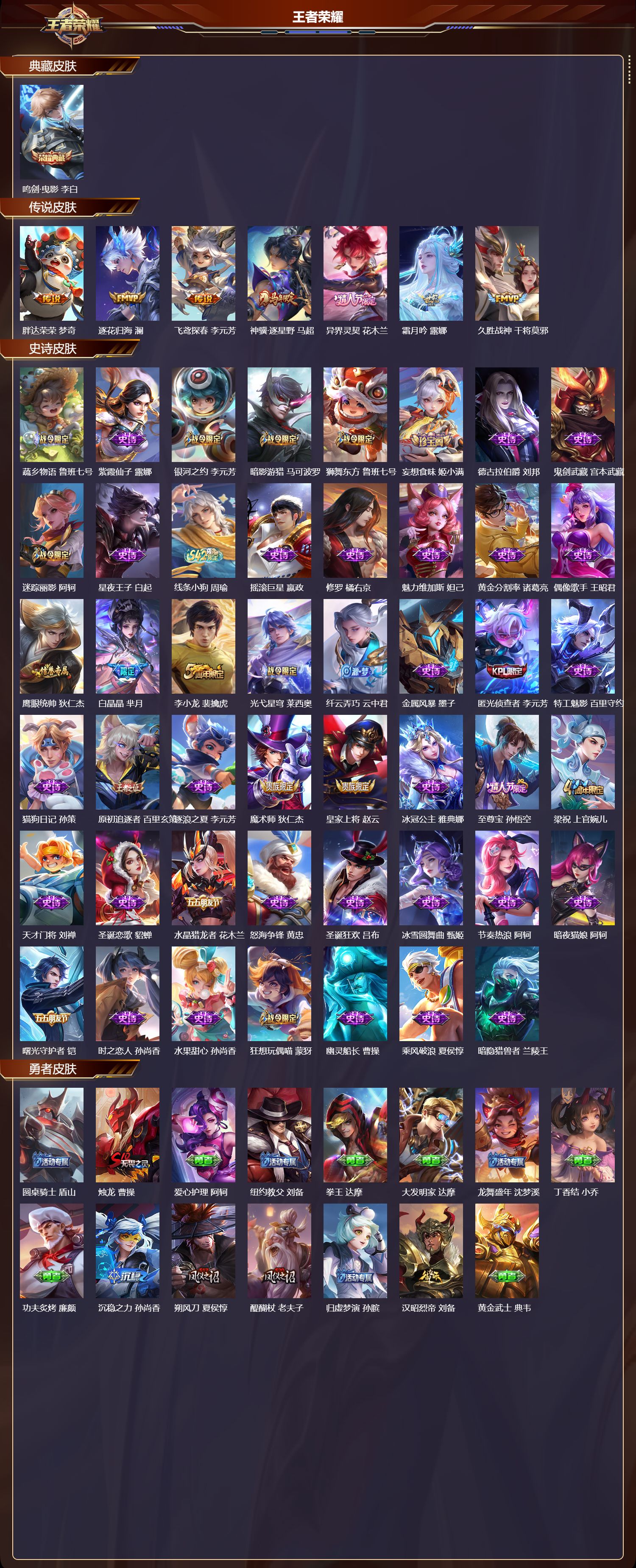 【47,史诗皮肤】蔬乡物语,鲁班七号,紫霞仙子,露娜,银河之约,李元芳,暗影游猎,马可波罗,狮舞东方,鲁班七号,妄想食味,姬小满,德古拉伯爵,刘邦,鬼剑武藏,宫本武藏,迷踪丽影,阿轲,星夜王子,白起,线条小狗,周瑜,摇滚巨星,嬴政,修罗,橘右京,魅力维加斯,妲己,黄金分割率,诸葛亮,偶像歌手,王昭君,鹰眼统帅,狄仁杰,白晶晶,芈月,李小龙,裴擒虎,光弋星穹,莱西奥,纤云弄巧,云中君,金属风暴,墨子,匿光侦查者,李元芳,特工魅影,百里守约,猫狗日记,孙策,原初追逐者,百里玄策,逐浪之夏,李元芳,魔术师,狄仁杰,皇家上将,赵云,冰冠公主,雅典娜,至尊宝,孙悟空,梁祝,上官婉儿,天才门将,刘禅,圣诞恋歌,貂蝉,水晶猎龙者,花木兰,怒海争锋,黄忠,圣诞狂欢,吕布,冰雪圆舞曲,甄姬,节奏热浪,阿轲,暗夜猫娘,阿轲,曙光守护者,铠,时之恋人,孙尚香,水果甜心,孙尚香,狂想玩偶喵,蒙犽,幽灵船长,曹操,乘风破浪,夏侯惇,暗隐猎兽者,兰陵王,