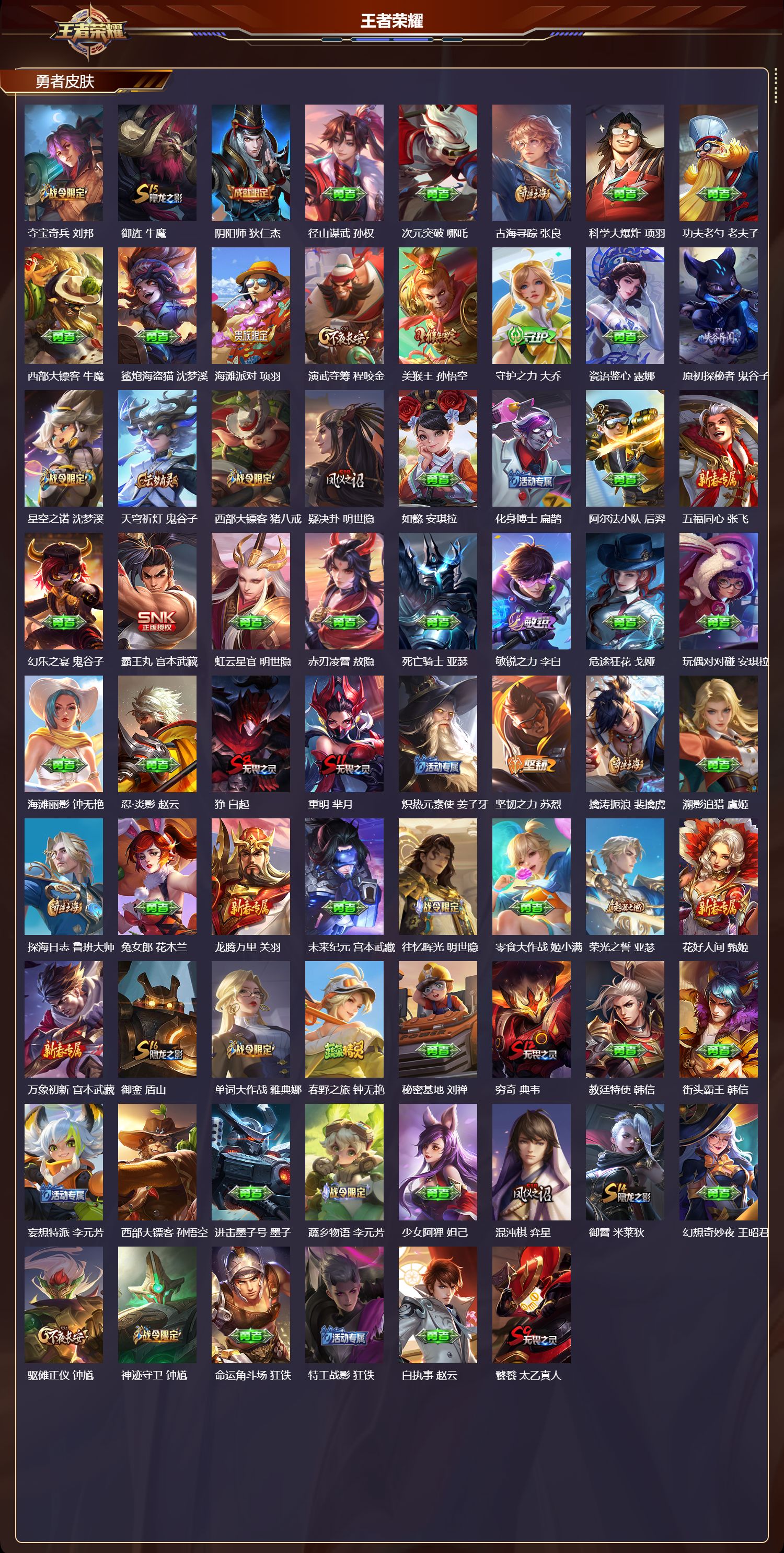 【92,勇者皮肤】圆桌骑士,盾山,烛龙,曹操,爱心护理,阿轲,纽约教父,刘备,拳王,达摩,大发明家,达摩,龙舞盛年,沈梦溪,丁香结,小乔,功夫炙烤,廉颇,沉稳之力,孙尚香,朔风刀,夏侯惇,醍醐杖,老夫子,归虚梦演,孙膑,汉昭烈帝,刘备,黄金武士,典韦,夺宝奇兵,刘邦,御旌,牛魔,阴阳师,狄仁杰,径山谋武,孙权,次元突破,哪吒,古海寻踪,张良,科学大爆炸,项羽,功夫老勺,老夫子,西部大镖客,牛魔,鲨炮海盗猫,沈梦溪,海滩派对,项羽,演武夺筹,程咬金,美猴王,孙悟空,守护之力,大乔,瓷语鉴心,露娜,原初探秘者,鬼谷子,星空之诺,沈梦溪,天穹祈灯,鬼谷子,西部大镖客,猪八戒,疑决卦,明世隐,如懿,安琪拉,化身博士,扁鹊,阿尔法小队,后羿,五福同心,张飞,幻乐之宴,鬼谷子,霸王丸,宫本武藏,虹云星官,明世隐,赤刃凌霄,敖隐,死亡骑士,亚瑟,敏锐之力,李白,危途狂花,戈娅,玩偶对对碰,安琪拉,海滩丽影,钟无艳,忍·炎影,赵云,狰,白起,重明,芈月,炽热元素使,姜子牙,坚韧之力,苏烈,擒涛扼浪,裴擒虎,溯影追猎,虞姬,探海日志,鲁班大师,兔女郎,花木兰,龙腾万里,关羽,未来纪元,宫本武藏,往忆晖光,明世隐,零食大作战,姬小满,荣光之誓,亚瑟,花好人间,甄姬,万象初新,宫本武藏,御銮,盾山,单词大作战,雅典娜,春野之旅,钟无艳,秘密基地,刘禅,穷奇,典韦,教廷特使,韩信,街头霸王,韩信,妄想特派,李元芳,西部大镖客,孙悟空,进击墨子号,墨子,蔬乡物语,李元芳,少女阿狸,妲己,混沌棋,弈星,御霄,米莱狄,幻想奇妙夜,王昭君,驱傩正仪,钟馗,神迹守卫,钟馗,命运角斗场,狂铁,特工战影,狂铁,白执事,赵云,饕餮,太乙真人,剑破天穹,刘邦,熔金海岸,周瑜,群星魔术团,程咬金,经纬探寻者,盘古,暗都幽影,大司命,鹤鸣心笺,艾琳,线条小狗,周瑜,