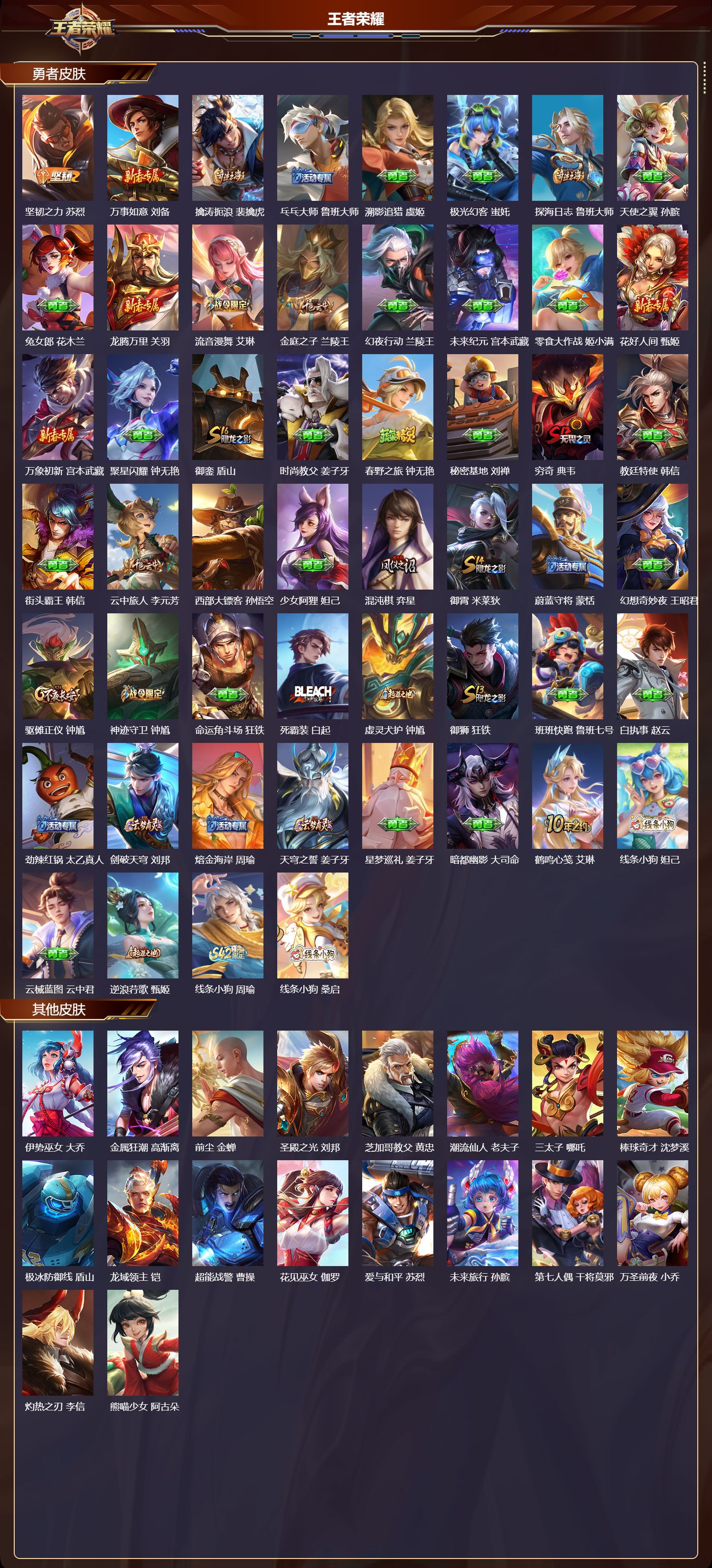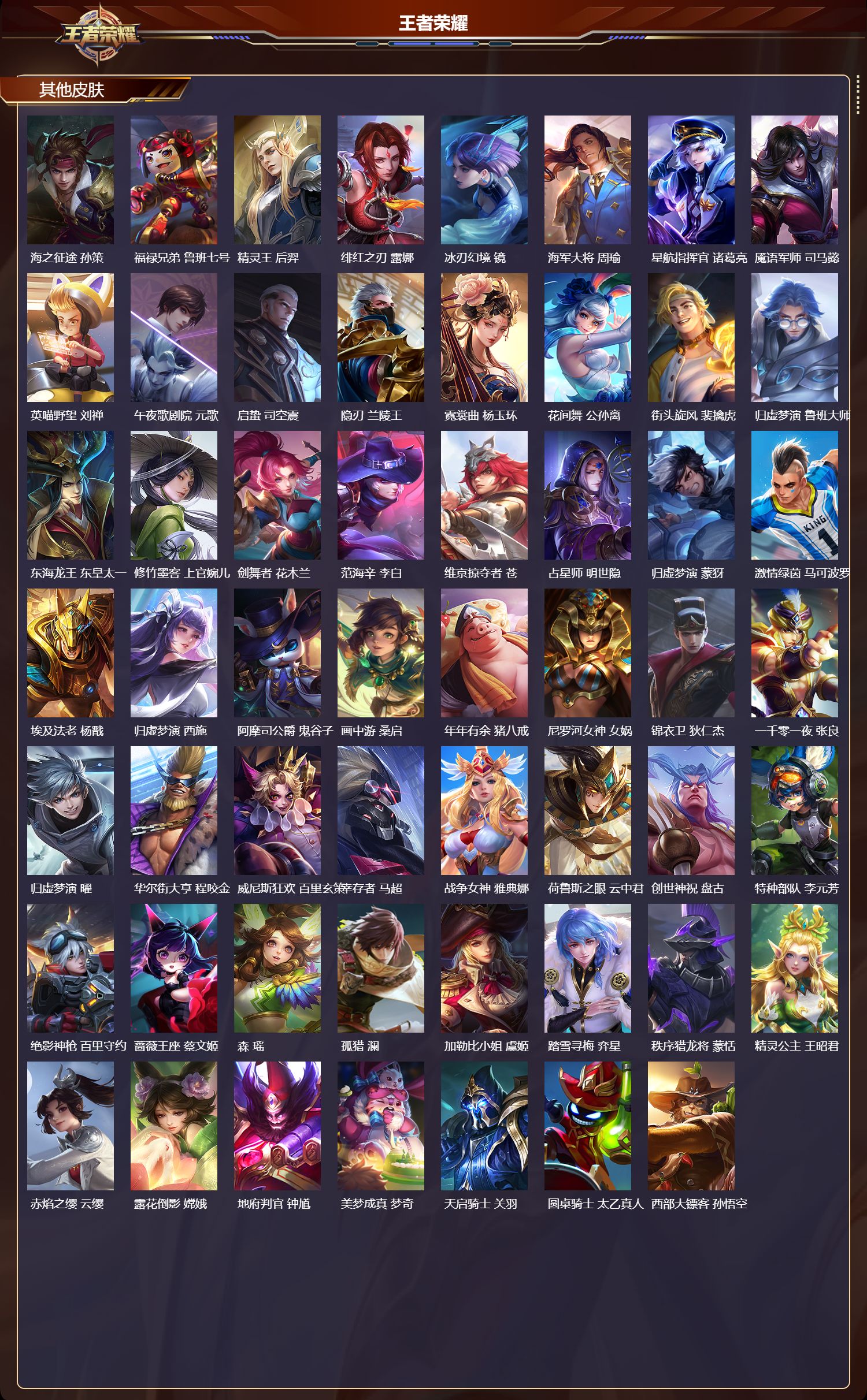 【73,其他皮肤】伊势巫女,大乔,金属狂潮,高渐离,前尘,金蝉,圣殿之光,刘邦,芝加哥教父,黄忠,潮流仙人,老夫子,三太子,哪吒,棒球奇才,沈梦溪,极冰防御线,盾山,龙域领主,铠,超能战警,曹操,花见巫女,伽罗,爱与和平,苏烈,未来旅行,孙膑,第七人偶,干将莫邪,万圣前夜,小乔,灼热之刃,李信,熊喵少女,阿古朵,海之征途,孙策,福禄兄弟,鲁班七号,精灵王,后羿,绯红之刃,露娜,冰刃幻境,镜,海军大将,周瑜,星航指挥官,诸葛亮,魇语军师,司马懿,英喵野望,刘禅,午夜歌剧院,元歌,启蛰,司空震,隐刃,兰陵王,霓裳曲,杨玉环,花间舞,公孙离,街头旋风,裴擒虎,归虚梦演,鲁班大师,东海龙王,东皇太一,修竹墨客,上官婉儿,剑舞者,花木兰,范海辛,李白,维京掠夺者,苍,占星师,明世隐,归虚梦演,蒙犽,激情绿茵,马可波罗,埃及法老,杨戬,归虚梦演,西施,阿摩司公爵,鬼谷子,画中游,桑启,年年有余,猪八戒,尼罗河女神,女娲,锦衣卫,狄仁杰,一千零一夜,张良,归虚梦演,曜,华尔街大亨,程咬金,威尼斯狂欢,百里玄策,幸存者,马超,战争女神,雅典娜,荷鲁斯之眼,云中君,创世神祝,盘古,特种部队,李元芳,绝影神枪,百里守约,蔷薇王座,蔡文姬,森,瑶,孤猎,澜,加勒比小姐,虞姬,踏雪寻梅,弈星,秩序猎龙将,蒙恬,精灵公主,王昭君,赤焰之缨,云缨,露花倒影,嫦娥,地府判官,钟馗,美梦成真,梦奇,天启骑士,关羽,圆桌骑士,太乙真人,西部大镖客,孙悟空,