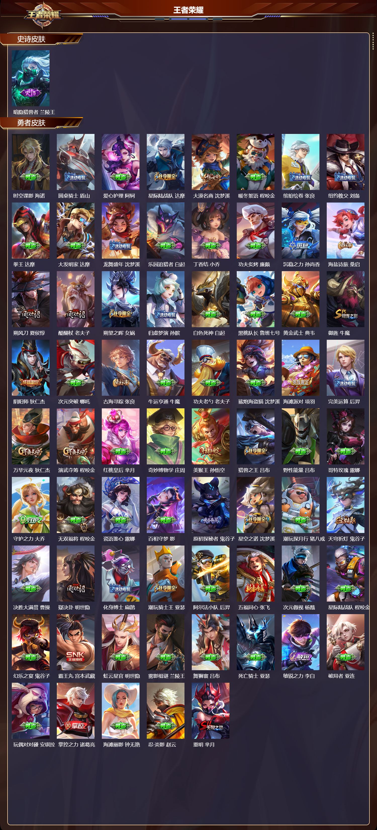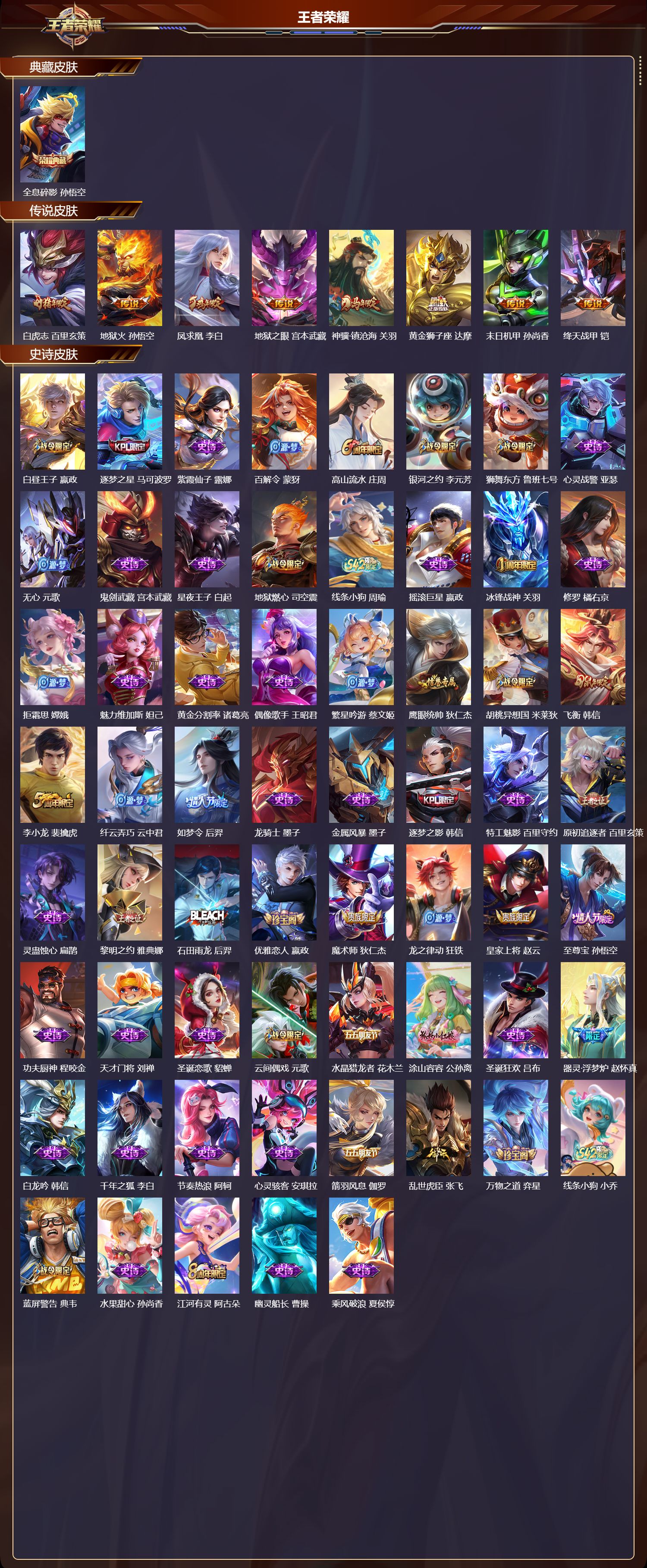 【62,史诗皮肤】白昼王子,嬴政,逐梦之星,马可波罗,紫霞仙子,露娜,百解令,蒙犽,高山流水,庄周,银河之约,李元芳,狮舞东方,鲁班七号,心灵战警,亚瑟,无心,元歌,鬼剑武藏,宫本武藏,星夜王子,白起,地狱燃心,司空震,线条小狗,周瑜,摇滚巨星,嬴政,冰锋战神,关羽,修罗,橘右京,拒霜思,嫦娥,魅力维加斯,妲己,黄金分割率,诸葛亮,偶像歌手,王昭君,繁星吟游,蔡文姬,鹰眼统帅,狄仁杰,胡桃异想国,米莱狄,飞衡,韩信,李小龙,裴擒虎,纤云弄巧,云中君,如梦令,后羿,龙骑士,墨子,金属风暴,墨子,逐梦之影,韩信,特工魅影,百里守约,原初追逐者,百里玄策,灵蛊蚀心,扁鹊,黎明之约,雅典娜,石田雨龙,后羿,优雅恋人,嬴政,魔术师,狄仁杰,龙之律动,狂铁,皇家上将,赵云,至尊宝,孙悟空,功夫厨神,程咬金,天才门将,刘禅,圣诞恋歌,貂蝉,云间偶戏,元歌,水晶猎龙者,花木兰,涂山容容,公孙离,圣诞狂欢,吕布,器灵·浮梦炉,赵怀真,白龙吟,韩信,千年之狐,李白,节奏热浪,阿轲,心灵骇客,安琪拉,箭羽风息,伽罗,乱世虎臣,张飞,万物之道,弈星,线条小狗,小乔,蓝屏警告,典韦,水果甜心,孙尚香,江河有灵,阿古朵,幽灵船长,曹操,乘风破浪,夏侯惇,暗隐猎兽者,兰陵王,