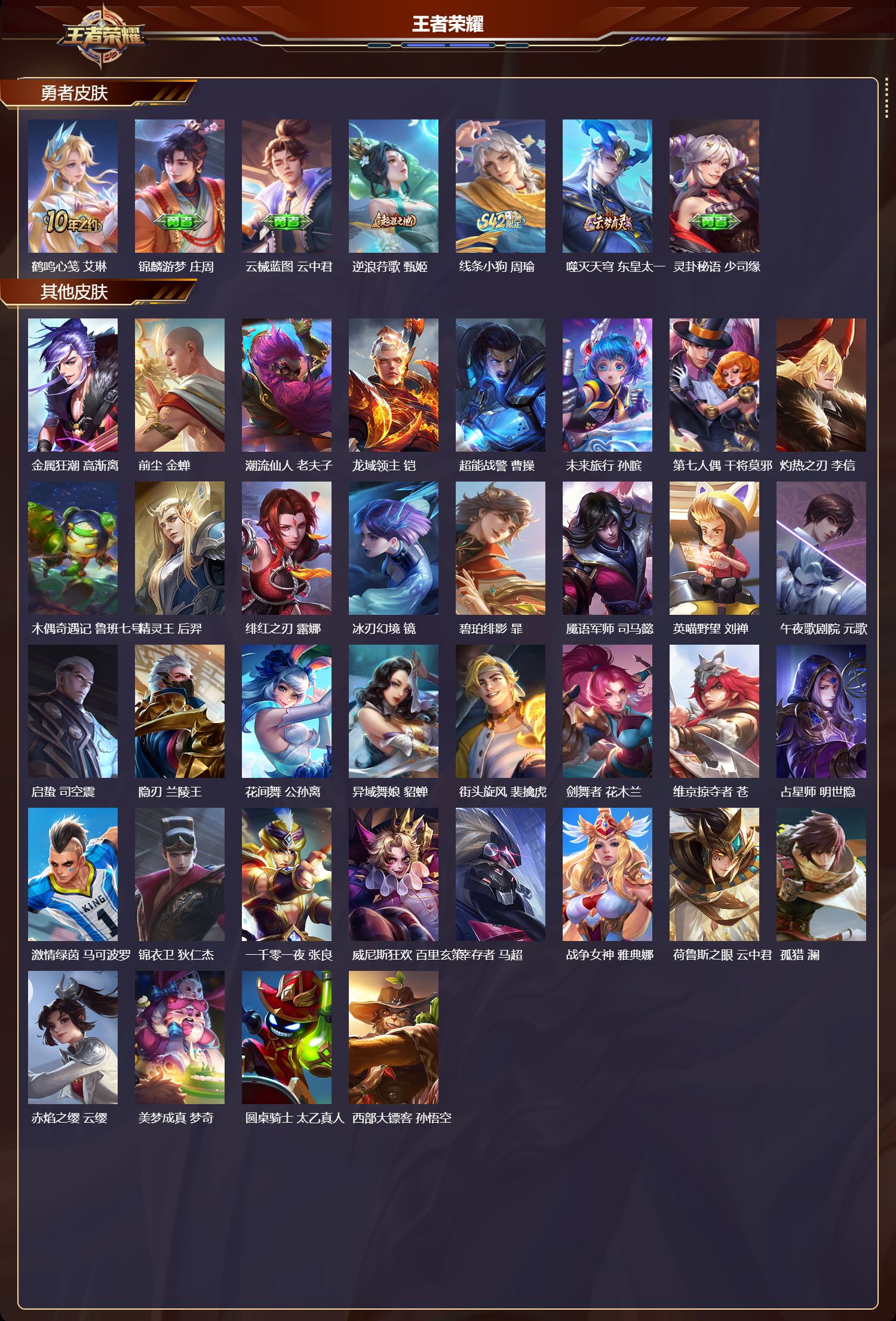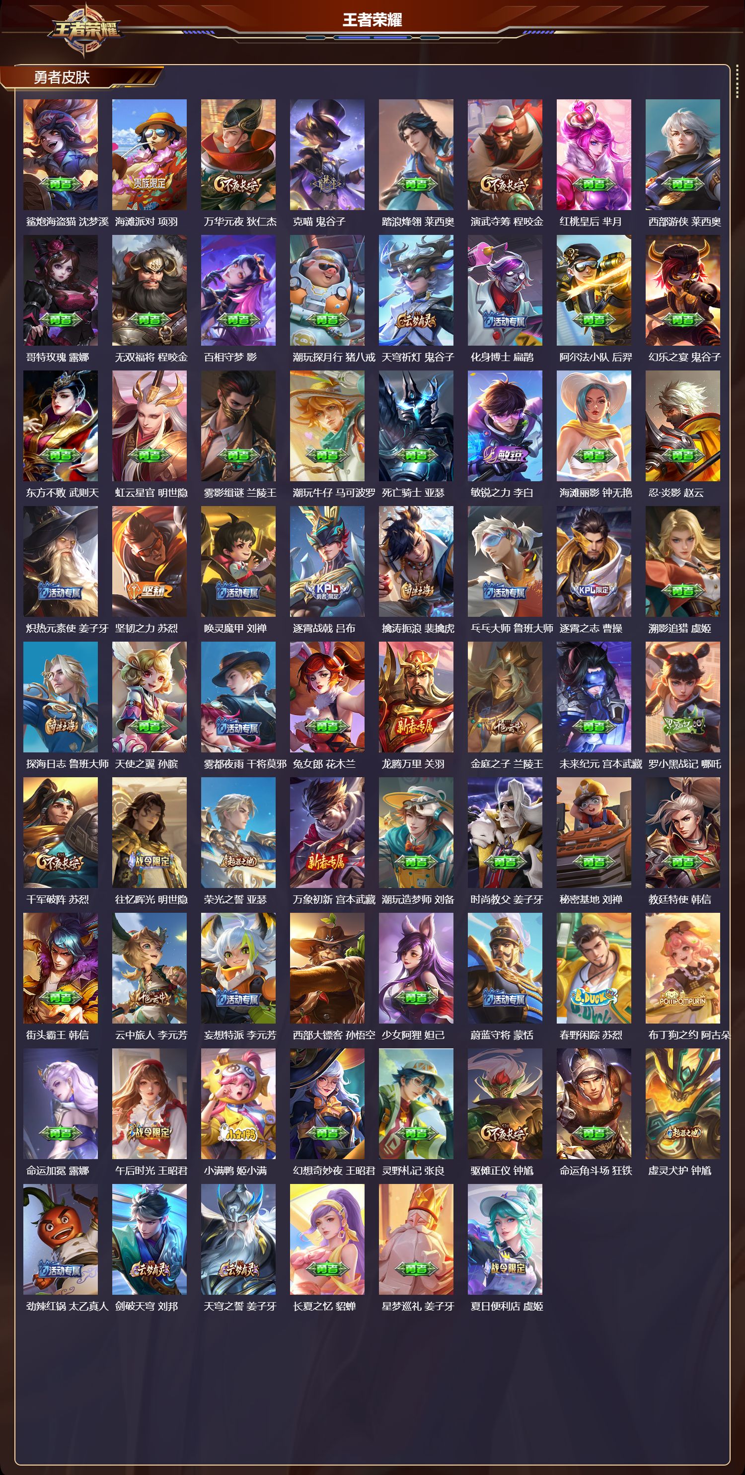 【97,勇者皮肤】胡桃夹子,干将莫邪,太极少年,赵怀真,沙漠行僧,达摩,大漠名商,沈梦溪,纽约教父,刘备,大发明家,达摩,龙舞盛年,沈梦溪,丁香结,小乔,功夫炙烤,廉颇,沉稳之力,孙尚香,海盐诗旅,桑启,幻泉雾影,海月,白色死神,白起,黑桃队长,鲁班七号,落雪兰心,甄姬,阴阳师,狄仁杰,次元突破,哪吒,古海寻踪,张良,功夫老勺,老夫子,西部大镖客,牛魔,鲨炮海盗猫,沈梦溪,海滩派对,项羽,万华元夜,狄仁杰,克喵,鬼谷子,踏浪烽翎,莱西奥,演武夺筹,程咬金,红桃皇后,芈月,西部游侠,莱西奥,哥特玫瑰,露娜,无双福将,程咬金,百相守梦,影,潮玩探月行,猪八戒,天穹祈灯,鬼谷子,化身博士,扁鹊,阿尔法小队,后羿,幻乐之宴,鬼谷子,东方不败,武则天,虹云星官,明世隐,雾影缉谜,兰陵王,潮玩牛仔,马可波罗,死亡骑士,亚瑟,敏锐之力,李白,海滩丽影,钟无艳,忍·炎影,赵云,炽热元素使,姜子牙,坚韧之力,苏烈,唤灵魔甲,刘禅,逐霄战戟,吕布,擒涛扼浪,裴擒虎,乓乓大师,鲁班大师,逐霄之志,曹操,溯影追猎,虞姬,探海日志,鲁班大师,天使之翼,孙膑,雾都夜雨,干将莫邪,兔女郎,花木兰,龙腾万里,关羽,金庭之子,兰陵王,未来纪元,宫本武藏,罗小黑战记,哪吒,千军破阵,苏烈,往忆晖光,明世隐,荣光之誓,亚瑟,万象初新,宫本武藏,潮玩造梦师,刘备,时尚教父,姜子牙,秘密基地,刘禅,教廷特使,韩信,街头霸王,韩信,云中旅人,李元芳,妄想特派,李元芳,西部大镖客,孙悟空,少女阿狸,妲己,蔚蓝守将,蒙恬,春野闲踪,苏烈,布丁狗之约,阿古朵,命运加冕,露娜,午后时光,王昭君,小满鸭,姬小满,幻想奇妙夜,王昭君,灵野札记,张良,驱傩正仪,钟馗,命运角斗场,狂铁,虚灵犬护,钟馗,劲辣红锅,太乙真人,剑破天穹,刘邦,天穹之誓,姜子牙,长夏之忆,貂蝉,星梦巡礼,姜子牙,夏日便利店,虞姬,鹤鸣心笺,艾琳,锦麟游梦,庄周,云械蓝图,云中君,逆浪荇歌,甄姬,线条小狗,周瑜,噬灭天穹,东皇太一,灵卦秘语,少司缘,