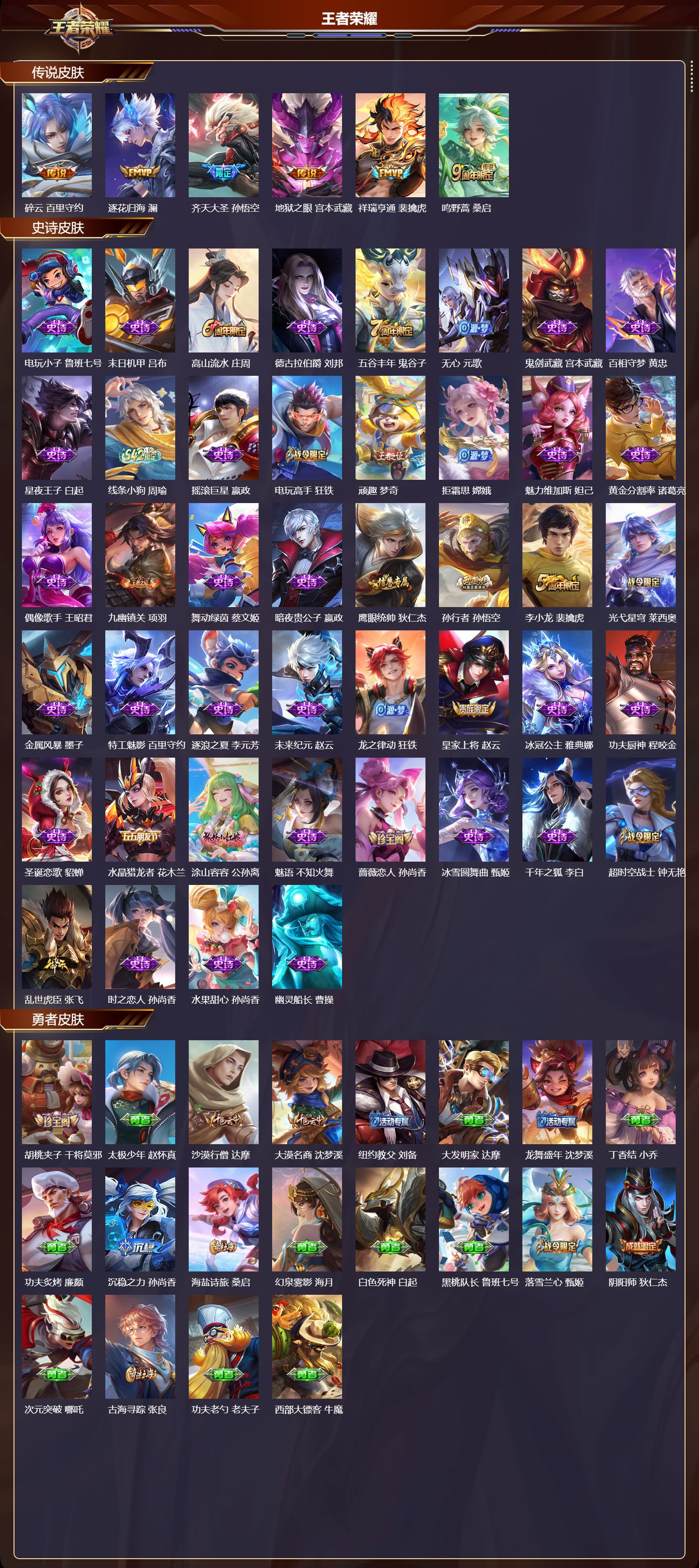 【44,史诗皮肤】电玩小子,鲁班七号,末日机甲,吕布,高山流水,庄周,德古拉伯爵,刘邦,五谷丰年,鬼谷子,无心,元歌,鬼剑武藏,宫本武藏,百相守梦,黄忠,星夜王子,白起,线条小狗,周瑜,摇滚巨星,嬴政,电玩高手,狂铁,顽趣,梦奇,拒霜思,嫦娥,魅力维加斯,妲己,黄金分割率,诸葛亮,偶像歌手,王昭君,九幽镇关,项羽,舞动绿茵,蔡文姬,暗夜贵公子,嬴政,鹰眼统帅,狄仁杰,孙行者,孙悟空,李小龙,裴擒虎,光弋星穹,莱西奥,金属风暴,墨子,特工魅影,百里守约,逐浪之夏,李元芳,未来纪元,赵云,龙之律动,狂铁,皇家上将,赵云,冰冠公主,雅典娜,功夫厨神,程咬金,圣诞恋歌,貂蝉,水晶猎龙者,花木兰,涂山容容,公孙离,魅语,不知火舞,蔷薇恋人,孙尚香,冰雪圆舞曲,甄姬,千年之狐,李白,超时空战士,钟无艳,乱世虎臣,张飞,时之恋人,孙尚香,水果甜心,孙尚香,幽灵船长,曹操,