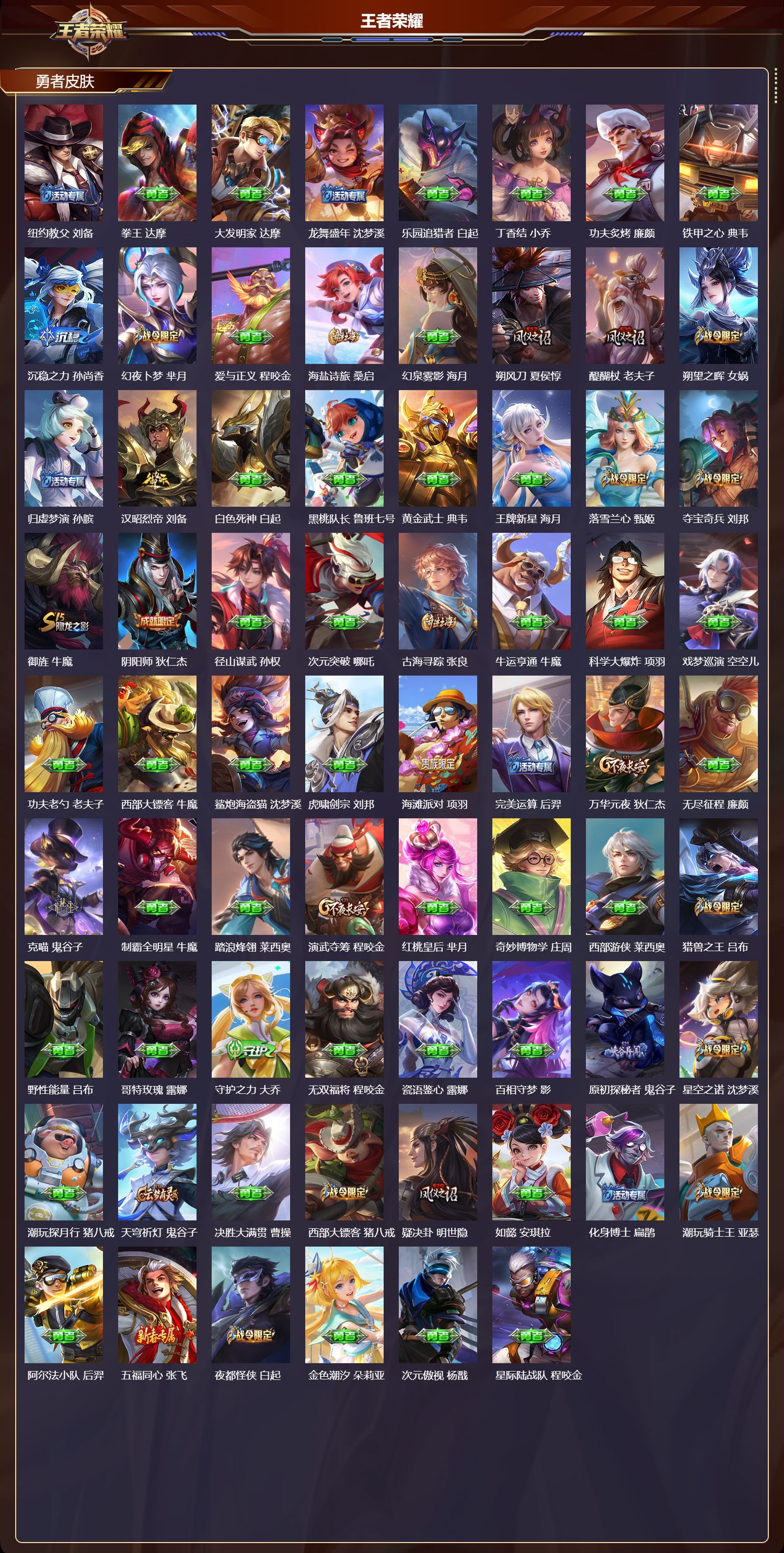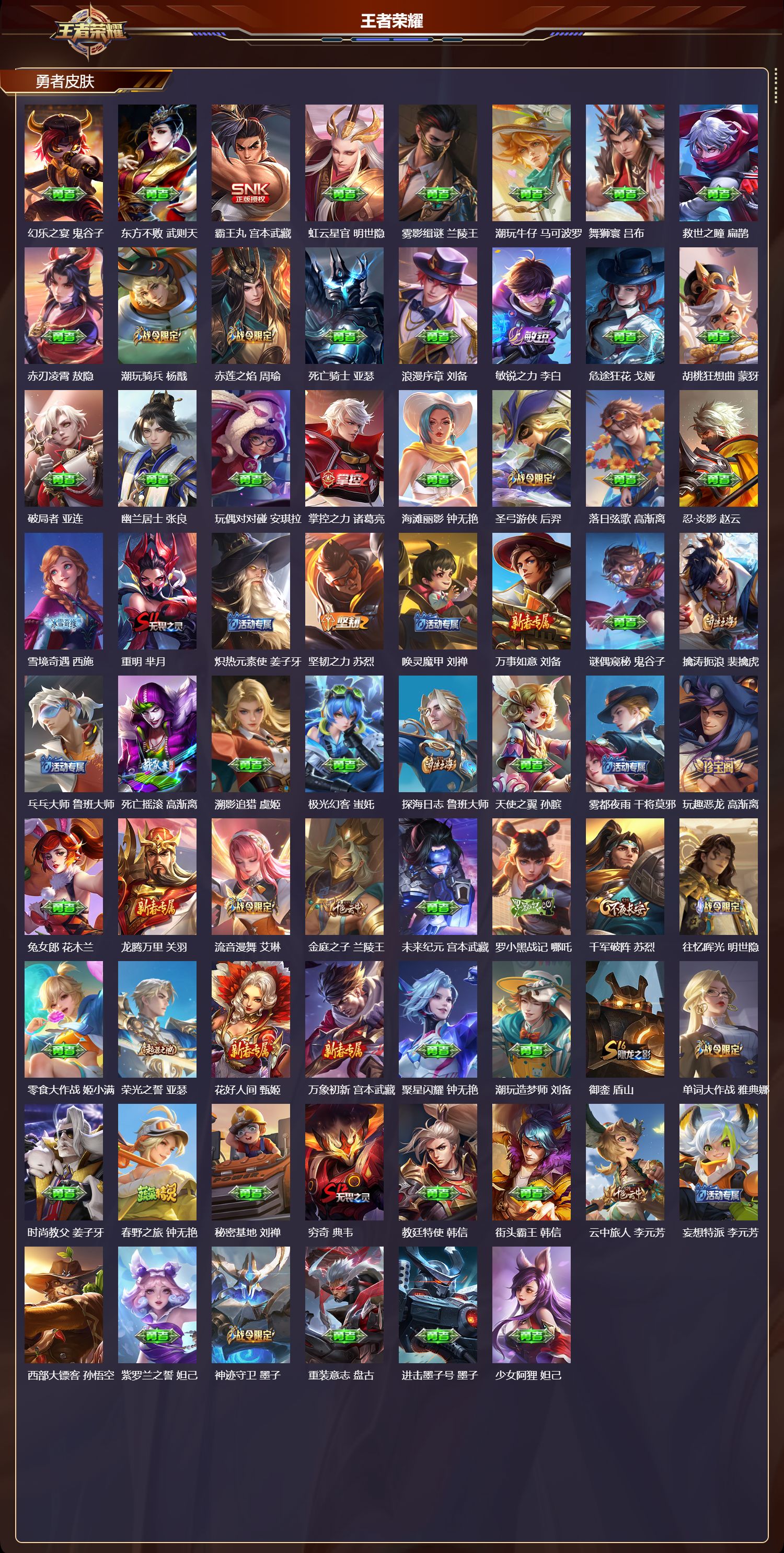 【205,勇者皮肤】时空谍影,海诺,玲珑珍味,西施,圆桌骑士,盾山,烛龙,曹操,爱心护理,阿轲,太极少年,赵怀真,星际陆战队,达摩,沙漠行僧,达摩,大漠名商,沈梦溪,缤纷绘卷,张良,纽约教父,刘备,拳王,达摩,大发明家,达摩,龙舞盛年,沈梦溪,乐园追猎者,白起,丁香结,小乔,功夫炙烤,廉颇,铁甲之心,典韦,沉稳之力,孙尚香,幻夜卜梦,芈月,爱与正义,程咬金,海盐诗旅,桑启,幻泉雾影,海月,朔风刀,夏侯惇,醍醐杖,老夫子,朔望之晖,女娲,归虚梦演,孙膑,汉昭烈帝,刘备,白色死神,白起,黑桃队长,鲁班七号,黄金武士,典韦,王牌新星,海月,落雪兰心,甄姬,夺宝奇兵,刘邦,御旌,牛魔,阴阳师,狄仁杰,径山谋武,孙权,次元突破,哪吒,古海寻踪,张良,牛运亨通,牛魔,科学大爆炸,项羽,戏梦巡演,空空儿,功夫老勺,老夫子,西部大镖客,牛魔,鲨炮海盗猫,沈梦溪,虎啸剑宗,刘邦,海滩派对,项羽,完美运算,后羿,万华元夜,狄仁杰,无尽征程,廉颇,克喵,鬼谷子,制霸全明星,牛魔,踏浪烽翎,莱西奥,演武夺筹,程咬金,红桃皇后,芈月,奇妙博物学,庄周,西部游侠,莱西奥,猎兽之王,吕布,野性能量,吕布,哥特玫瑰,露娜,守护之力,大乔,无双福将,程咬金,瓷语鉴心,露娜,百相守梦,影,原初探秘者,鬼谷子,星空之诺,沈梦溪,潮玩探月行,猪八戒,天穹祈灯,鬼谷子,决胜大满贯,曹操,西部大镖客,猪八戒,疑决卦,明世隐,如懿,安琪拉,化身博士,扁鹊,潮玩骑士王,亚瑟,阿尔法小队,后羿,五福同心,张飞,夜都怪侠,白起,金色潮汐,朵莉亚,次元傲视,杨戬,星际陆战队,程咬金,幻乐之宴,鬼谷子,东方不败,武则天,霸王丸,宫本武藏,虹云星官,明世隐,雾影缉谜,兰陵王,潮玩牛仔,马可波罗,舞狮寰,吕布,救世之瞳,扁鹊,赤刃凌霄,敖隐,潮玩骑兵,杨戬,赤莲之焰,周瑜,死亡骑士,亚瑟,浪漫序章,刘备,敏锐之力,李白,危途狂花,戈娅,胡桃狂想曲,蒙犽,破局者,亚连,幽兰居士,张良,玩偶对对碰,安琪拉,掌控之力,诸葛亮,海滩丽影,钟无艳,圣弓游侠,后羿,落日弦歌,高渐离,忍·炎影,赵云,雪境奇遇,西施,重明,芈月,炽热元素使,姜子牙,坚韧之力,苏烈,唤灵魔甲,刘禅,万事如意,刘备,谜偶窥秘,鬼谷子,擒涛扼浪,裴擒虎,乓乓大师,鲁班大师,死亡摇滚,高渐离,溯影追猎,虞姬,极光幻客,蚩奼,探海日志,鲁班大师,天使之翼,孙膑,雾都夜雨,干将莫邪,玩趣恶龙,高渐离,兔女郎,花木兰,龙腾万里,关羽,流音漫舞,艾琳,金庭之子,兰陵王,未来纪元,宫本武藏,罗小黑战记,哪吒,千军破阵,苏烈,往忆晖光,明世隐,零食大作战,姬小满,荣光之誓,亚瑟,花好人间,甄姬,万象初新,宫本武藏,聚星闪耀,钟无艳,潮玩造梦师,刘备,御銮,盾山,单词大作战,雅典娜,时尚教父,姜子牙,春野之旅,钟无艳,秘密基地,刘禅,穷奇,典韦,教廷特使,韩信,街头霸王,韩信,云中旅人,李元芳,妄想特派,李元芳,西部大镖客,孙悟空,紫罗兰之誓,妲己,神迹守卫,墨子,重装意志,盘古,进击墨子号,墨子,少女阿狸,妲己,灵卜魔法,妲己,混沌棋,弈星,御霄,米莱狄,蔚蓝守将,蒙恬,春野闲踪,苏烈,契约魔法,米莱狄,布丁狗之约,阿古朵,暖冬·兔眠,嫦娥,命运加冕,露娜,午后时光,王昭君,小满鸭,姬小满,幻想奇妙夜,王昭君,灵野札记,张良,驱傩正仪,钟馗,神迹守卫,钟馗,鸭鸭历险记,沈梦溪,命运角斗场,狂铁,死霸装,白起,特工战影,狂铁,虚灵犬护,钟馗,御狮,狂铁,班班快跑,鲁班七号,漠中幻影,嫦娥,白执事,赵云,华丽摇滚,太乙真人,劲辣红锅,太乙真人,罗小黑战记,张良,剑破天穹,刘邦,苍威无极,项羽,铁骨偃魂,典韦,熔金海岸,周瑜,苍林狼骑,苍,天穹之誓,姜子牙,魅影绮裳,影,访茗客,马超,星梦巡礼,姜子牙,破阵·退雄兵,杨戬,谧流熔炉,太乙真人,群星魔术团,程咬金,暗都幽影,大司命,夏日便利店,虞姬,鹤鸣心笺,艾琳,锦麟游梦,庄周,云械蓝图,云中君,逆浪荇歌,甄姬,百相守梦,孙策,海之女神,海月,微风如诗,大乔,线条小狗,周瑜,线条小狗,桑启,百相守梦,老夫子,噬灭天穹,东皇太一,灵卦秘语,少司缘,敬我三分,盘古,景韶洛都,明世隐,