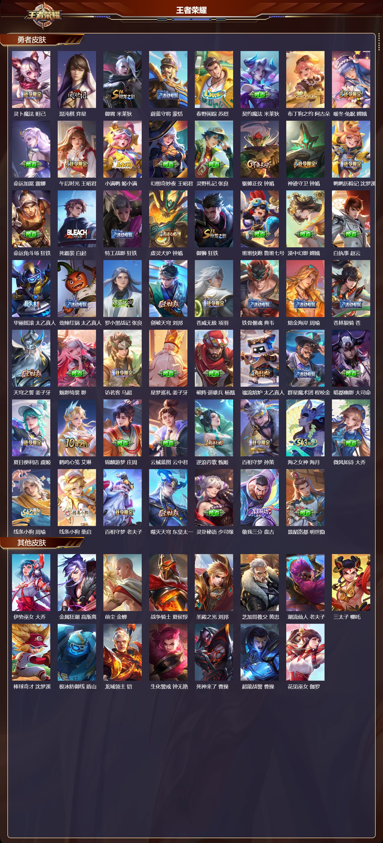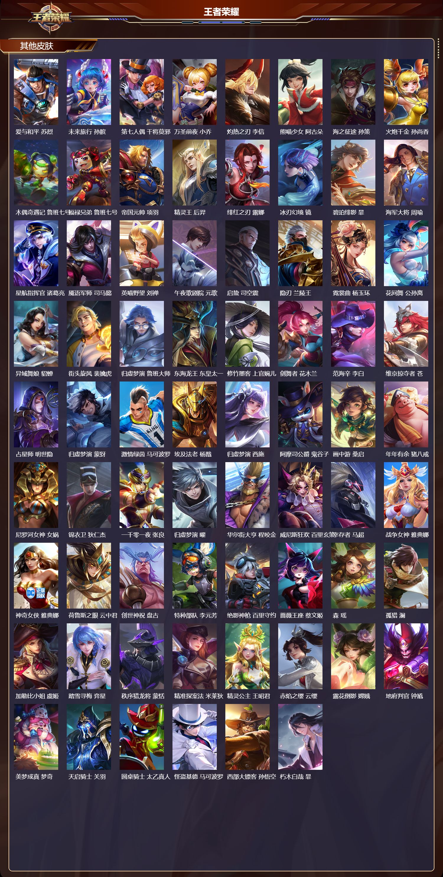【86,其他皮肤】伊势巫女,大乔,金属狂潮,高渐离,前尘,金蝉,战争骑士,夏侯惇,圣殿之光,刘邦,芝加哥教父,黄忠,潮流仙人,老夫子,三太子,哪吒,棒球奇才,沈梦溪,极冰防御线,盾山,龙域领主,铠,生化警戒,钟无艳,死神来了,曹操,超能战警,曹操,花见巫女,伽罗,爱与和平,苏烈,未来旅行,孙膑,第七人偶,干将莫邪,万圣前夜,小乔,灼热之刃,李信,熊喵少女,阿古朵,海之征途,孙策,火炮千金,孙尚香,木偶奇遇记,鲁班七号,福禄兄弟,鲁班七号,帝国元帅,项羽,精灵王,后羿,绯红之刃,露娜,冰刃幻境,镜,碧珀绯影,暃,海军大将,周瑜,星航指挥官,诸葛亮,魇语军师,司马懿,英喵野望,刘禅,午夜歌剧院,元歌,启蛰,司空震,隐刃,兰陵王,霓裳曲,杨玉环,花间舞,公孙离,异域舞娘,貂蝉,街头旋风,裴擒虎,归虚梦演,鲁班大师,东海龙王,东皇太一,修竹墨客,上官婉儿,剑舞者,花木兰,范海辛,李白,维京掠夺者,苍,占星师,明世隐,归虚梦演,蒙犽,激情绿茵,马可波罗,埃及法老,杨戬,归虚梦演,西施,阿摩司公爵,鬼谷子,画中游,桑启,年年有余,猪八戒,尼罗河女神,女娲,锦衣卫,狄仁杰,一千零一夜,张良,归虚梦演,曜,华尔街大亨,程咬金,威尼斯狂欢,百里玄策,幸存者,马超,战争女神,雅典娜,神奇女侠,雅典娜,荷鲁斯之眼,云中君,创世神祝,盘古,特种部队,李元芳,绝影神枪,百里守约,蔷薇王座,蔡文姬,森,瑶,孤猎,澜,加勒比小姐,虞姬,踏雪寻梅,弈星,秩序猎龙将,蒙恬,精准探案法,米莱狄,精灵公主,王昭君,赤焰之缨,云缨,露花倒影,嫦娥,地府判官,钟馗,美梦成真,梦奇,天启骑士,关羽,圆桌骑士,太乙真人,怪盗基德,马可波罗,西部大镖客,孙悟空,朽木白哉,暃,时之奇旅,孙策,