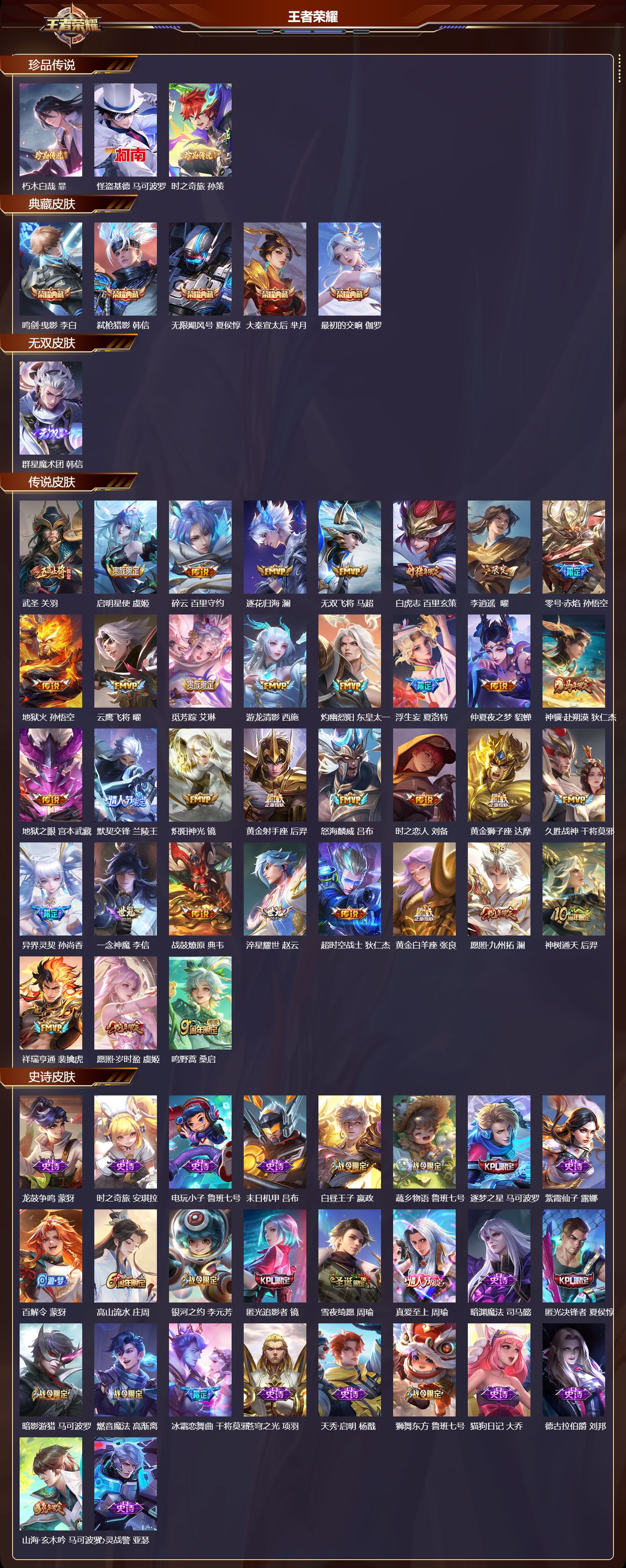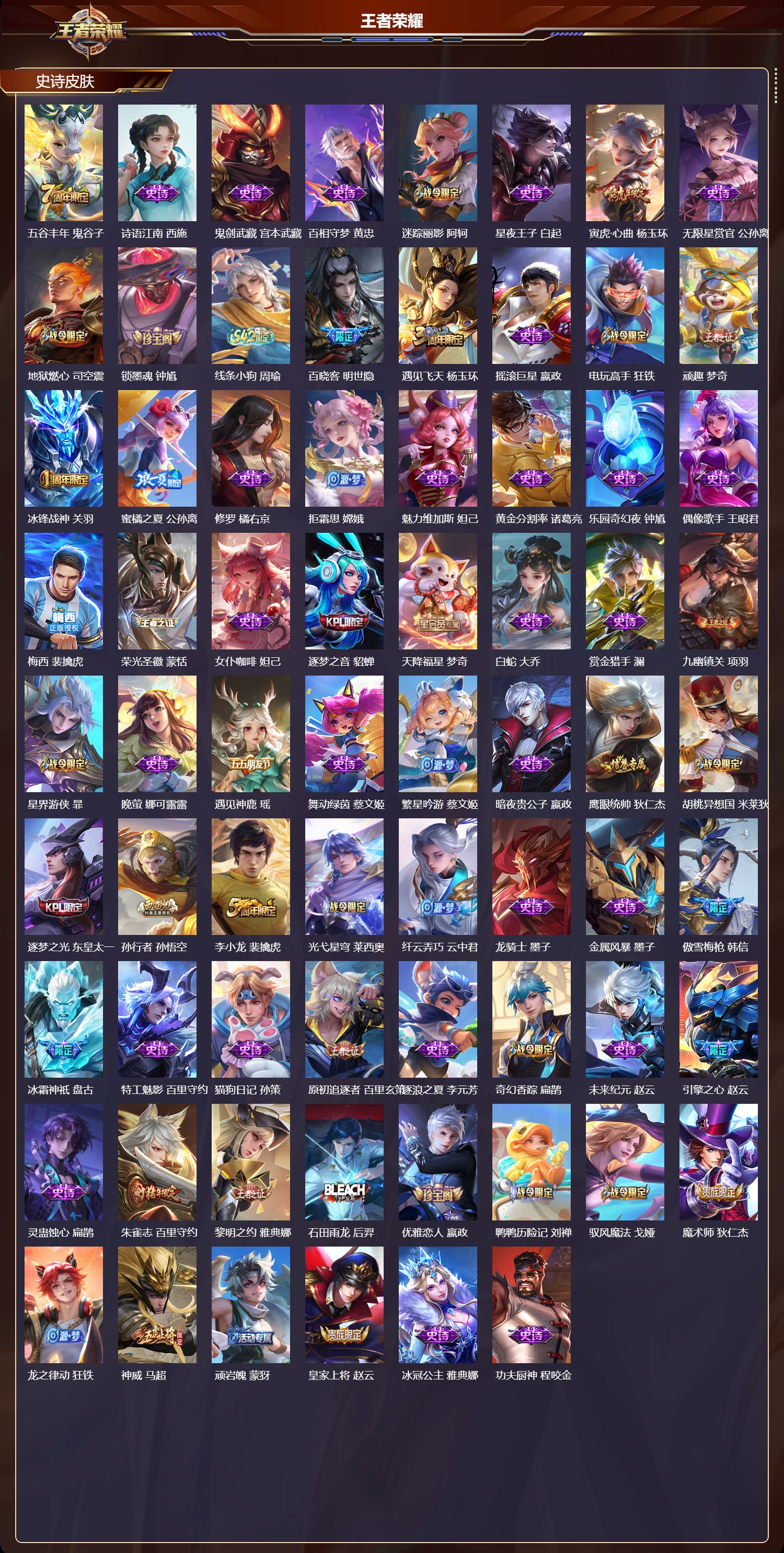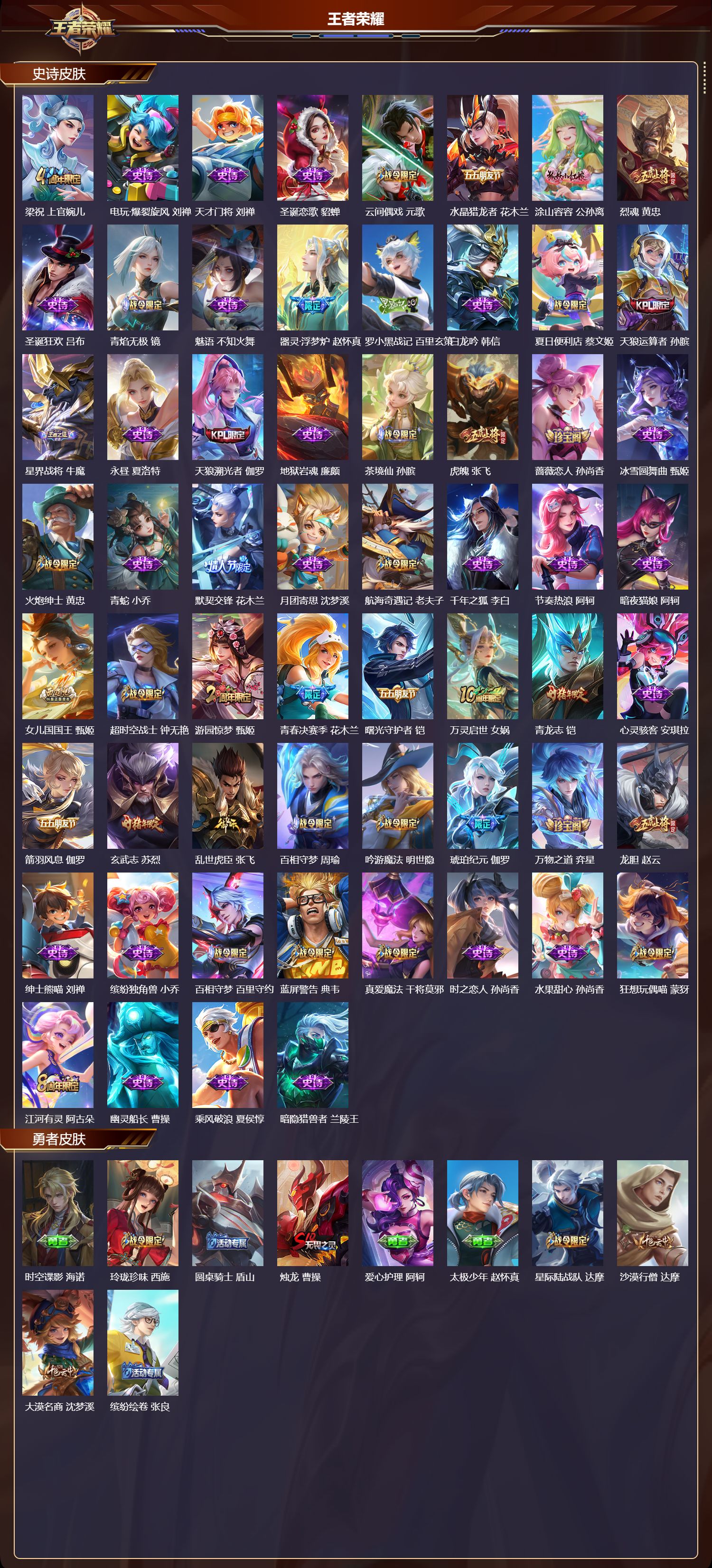 【156,史诗皮肤】龙鼓争鸣,蒙犽,时之奇旅,安琪拉,电玩小子,鲁班七号,末日机甲,吕布,白昼王子,嬴政,蔬乡物语,鲁班七号,逐梦之星,马可波罗,紫霞仙子,露娜,百解令,蒙犽,高山流水,庄周,银河之约,李元芳,匿光追影者,镜,雪夜绮愿,周瑜,真爱至上,周瑜,暗渊魔法,司马懿,匿光决锋者,夏侯惇,暗影游猎,马可波罗,燃音魔法,高渐离,冰霜恋舞曲,干将莫邪,苍穹之光,项羽,天秀·启明,杨戬,狮舞东方,鲁班七号,猫狗日记,大乔,德古拉伯爵,刘邦,山海·玄木吟,马可波罗,心灵战警,亚瑟,五谷丰年,鬼谷子,诗语江南,西施,鬼剑武藏,宫本武藏,百相守梦,黄忠,迷踪丽影,阿轲,星夜王子,白起,寅虎·心曲,杨玉环,无限星赏官,公孙离,地狱燃心,司空震,锁墨魂,钟馗,线条小狗,周瑜,百晓客,明世隐,遇见飞天,杨玉环,摇滚巨星,嬴政,电玩高手,狂铁,顽趣,梦奇,冰锋战神,关羽,蜜橘之夏,公孙离,修罗,橘右京,拒霜思,嫦娥,魅力维加斯,妲己,黄金分割率,诸葛亮,乐园奇幻夜,钟馗,偶像歌手,王昭君,梅西,裴擒虎,荣光圣徽,蒙恬,女仆咖啡,妲己,逐梦之音,貂蝉,天降福星,梦奇,白蛇,大乔,赏金猎手,澜,九幽镇关,项羽,星界游侠,暃,晚萤,娜可露露,遇见神鹿,瑶,舞动绿茵,蔡文姬,繁星吟游,蔡文姬,暗夜贵公子,嬴政,鹰眼统帅,狄仁杰,胡桃异想国,米莱狄,逐梦之光,东皇太一,孙行者,孙悟空,李小龙,裴擒虎,光弋星穹,莱西奥,纤云弄巧,云中君,龙骑士,墨子,金属风暴,墨子,傲雪梅枪,韩信,冰霜神祇,盘古,特工魅影,百里守约,猫狗日记,孙策,原初追逐者,百里玄策,逐浪之夏,李元芳,奇幻香踪,扁鹊,未来纪元,赵云,引擎之心,赵云,灵蛊蚀心,扁鹊,朱雀志,百里守约,黎明之约,雅典娜,石田雨龙,后羿,优雅恋人,嬴政,鸭鸭历险记,刘禅,驭风魔法,戈娅,魔术师,狄仁杰,龙之律动,狂铁,神威,马超,顽岩魄,蒙犽,皇家上将,赵云,冰冠公主,雅典娜,功夫厨神,程咬金,梁祝,上官婉儿,电玩·爆裂旋风,刘禅,天才门将,刘禅,圣诞恋歌,貂蝉,云间偶戏,元歌,水晶猎龙者,花木兰,涂山容容,公孙离,烈魂,黄忠,圣诞狂欢,吕布,青焰无极,镜,魅语,不知火舞,器灵·浮梦炉,赵怀真,罗小黑战记,百里玄策,白龙吟,韩信,夏日便利店,蔡文姬,天狼运算者,孙膑,星界战将,牛魔,永昼,夏洛特,天狼溯光者,伽罗,地狱岩魂,廉颇,茶境仙,孙膑,虎魄,张飞,蔷薇恋人,孙尚香,冰雪圆舞曲,甄姬,火炮绅士,黄忠,青蛇,小乔,默契交锋,花木兰,月团寄思,沈梦溪,航海奇遇记,老夫子,千年之狐,李白,节奏热浪,阿轲,暗夜猫娘,阿轲,女儿国国王,甄姬,超时空战士,钟无艳,游园惊梦,甄姬,青春决赛季,花木兰,曙光守护者,铠,万灵启世,女娲,青龙志,铠,心灵骇客,安琪拉,箭羽风息,伽罗,玄武志,苏烈,乱世虎臣,张飞,百相守梦,周瑜,吟游魔法,明世隐,琥珀纪元,伽罗,万物之道,弈星,龙胆,赵云,绅士熊喵,刘禅,缤纷独角兽,小乔,百相守梦,百里守约,蓝屏警告,典韦,真爱魔法,干将莫邪,时之恋人,孙尚香,水果甜心,孙尚香,狂想玩偶喵,蒙犽,江河有灵,阿古朵,幽灵船长,曹操,乘风破浪,夏侯惇,暗隐猎兽者,兰陵王,