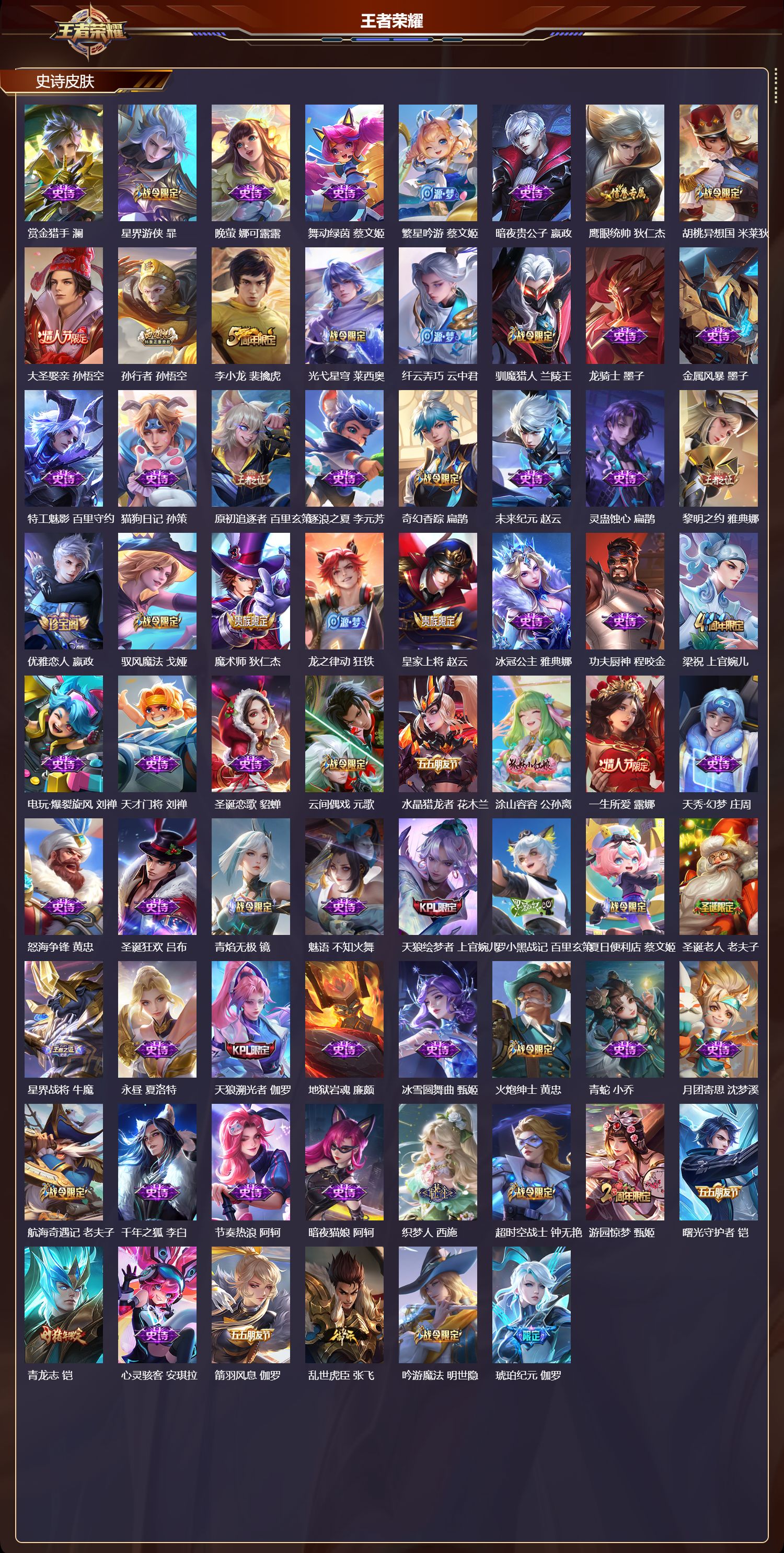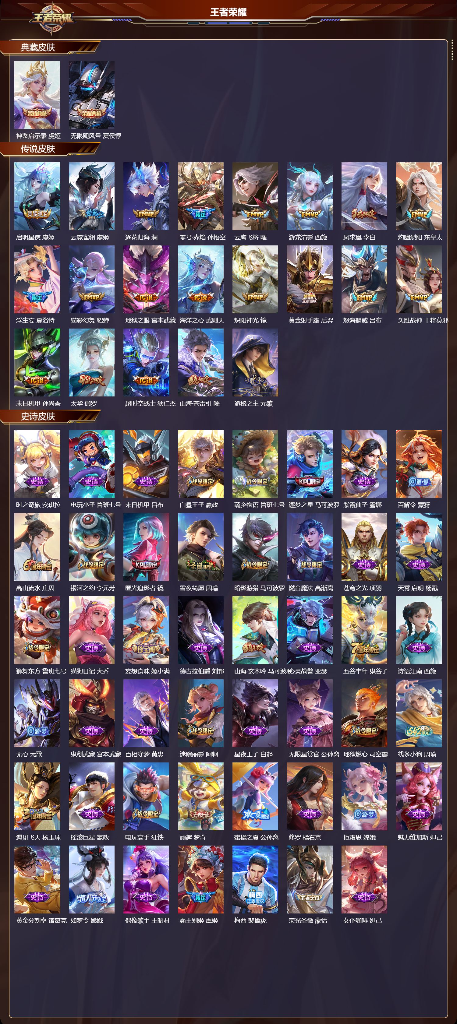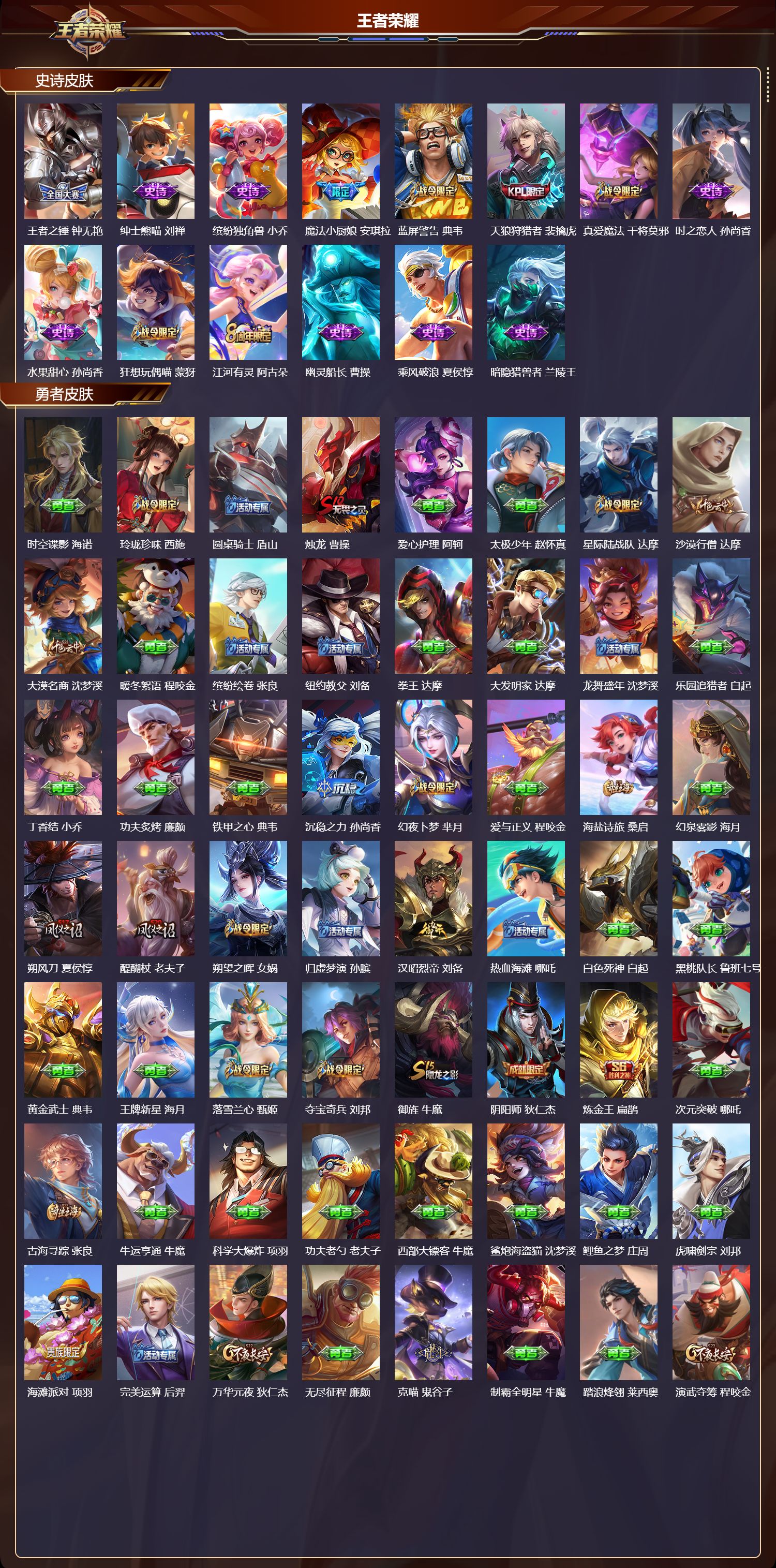 【131,史诗皮肤】时之奇旅,安琪拉,电玩小子,鲁班七号,末日机甲,吕布,白昼王子,嬴政,蔬乡物语,鲁班七号,逐梦之星,马可波罗,紫霞仙子,露娜,百解令,蒙犽,高山流水,庄周,银河之约,李元芳,匿光追影者,镜,雪夜绮愿,周瑜,暗影游猎,马可波罗,燃音魔法,高渐离,苍穹之光,项羽,天秀·启明,杨戬,狮舞东方,鲁班七号,猫狗日记,大乔,妄想食味,姬小满,德古拉伯爵,刘邦,山海·玄木吟,马可波罗,心灵战警,亚瑟,五谷丰年,鬼谷子,诗语江南,西施,无心,元歌,鬼剑武藏,宫本武藏,百相守梦,黄忠,迷踪丽影,阿轲,星夜王子,白起,无限星赏官,公孙离,地狱燃心,司空震,线条小狗,周瑜,遇见飞天,杨玉环,摇滚巨星,嬴政,电玩高手,狂铁,顽趣,梦奇,蜜橘之夏,公孙离,修罗,橘右京,拒霜思,嫦娥,魅力维加斯,妲己,黄金分割率,诸葛亮,如梦令,嫦娥,偶像歌手,王昭君,霸王别姬,虞姬,梅西,裴擒虎,荣光圣徽,蒙恬,女仆咖啡,妲己,赏金猎手,澜,星界游侠,暃,晚萤,娜可露露,舞动绿茵,蔡文姬,繁星吟游,蔡文姬,暗夜贵公子,嬴政,鹰眼统帅,狄仁杰,胡桃异想国,米莱狄,大圣娶亲,孙悟空,孙行者,孙悟空,李小龙,裴擒虎,光弋星穹,莱西奥,纤云弄巧,云中君,驯魔猎人,兰陵王,龙骑士,墨子,金属风暴,墨子,特工魅影,百里守约,猫狗日记,孙策,原初追逐者,百里玄策,逐浪之夏,李元芳,奇幻香踪,扁鹊,未来纪元,赵云,灵蛊蚀心,扁鹊,黎明之约,雅典娜,优雅恋人,嬴政,驭风魔法,戈娅,魔术师,狄仁杰,龙之律动,狂铁,皇家上将,赵云,冰冠公主,雅典娜,功夫厨神,程咬金,梁祝,上官婉儿,电玩·爆裂旋风,刘禅,天才门将,刘禅,圣诞恋歌,貂蝉,云间偶戏,元歌,水晶猎龙者,花木兰,涂山容容,公孙离,一生所爱,露娜,天秀·幻梦,庄周,怒海争锋,黄忠,圣诞狂欢,吕布,青焰无极,镜,魅语,不知火舞,天狼绘梦者,上官婉儿,罗小黑战记,百里玄策,夏日便利店,蔡文姬,圣诞老人,老夫子,星界战将,牛魔,永昼,夏洛特,天狼溯光者,伽罗,地狱岩魂,廉颇,冰雪圆舞曲,甄姬,火炮绅士,黄忠,青蛇,小乔,月团寄思,沈梦溪,航海奇遇记,老夫子,千年之狐,李白,节奏热浪,阿轲,暗夜猫娘,阿轲,织梦人,西施,超时空战士,钟无艳,游园惊梦,甄姬,曙光守护者,铠,青龙志,铠,心灵骇客,安琪拉,箭羽风息,伽罗,乱世虎臣,张飞,吟游魔法,明世隐,琥珀纪元,伽罗,王者之锤,钟无艳,绅士熊喵,刘禅,缤纷独角兽,小乔,魔法小厨娘,安琪拉,蓝屏警告,典韦,天狼狩猎者,裴擒虎,真爱魔法,干将莫邪,时之恋人,孙尚香,水果甜心,孙尚香,狂想玩偶喵,蒙犽,江河有灵,阿古朵,幽灵船长,曹操,乘风破浪,夏侯惇,暗隐猎兽者,兰陵王,