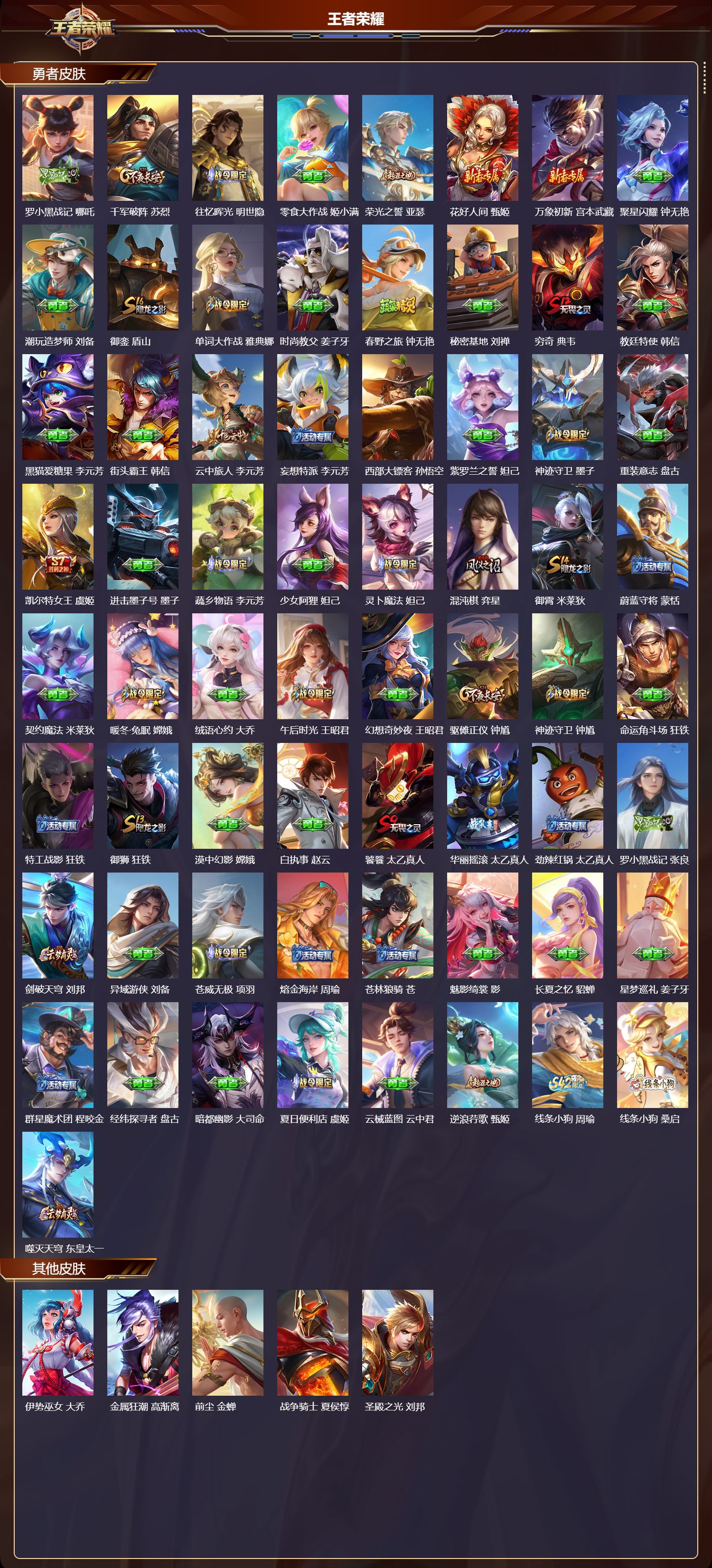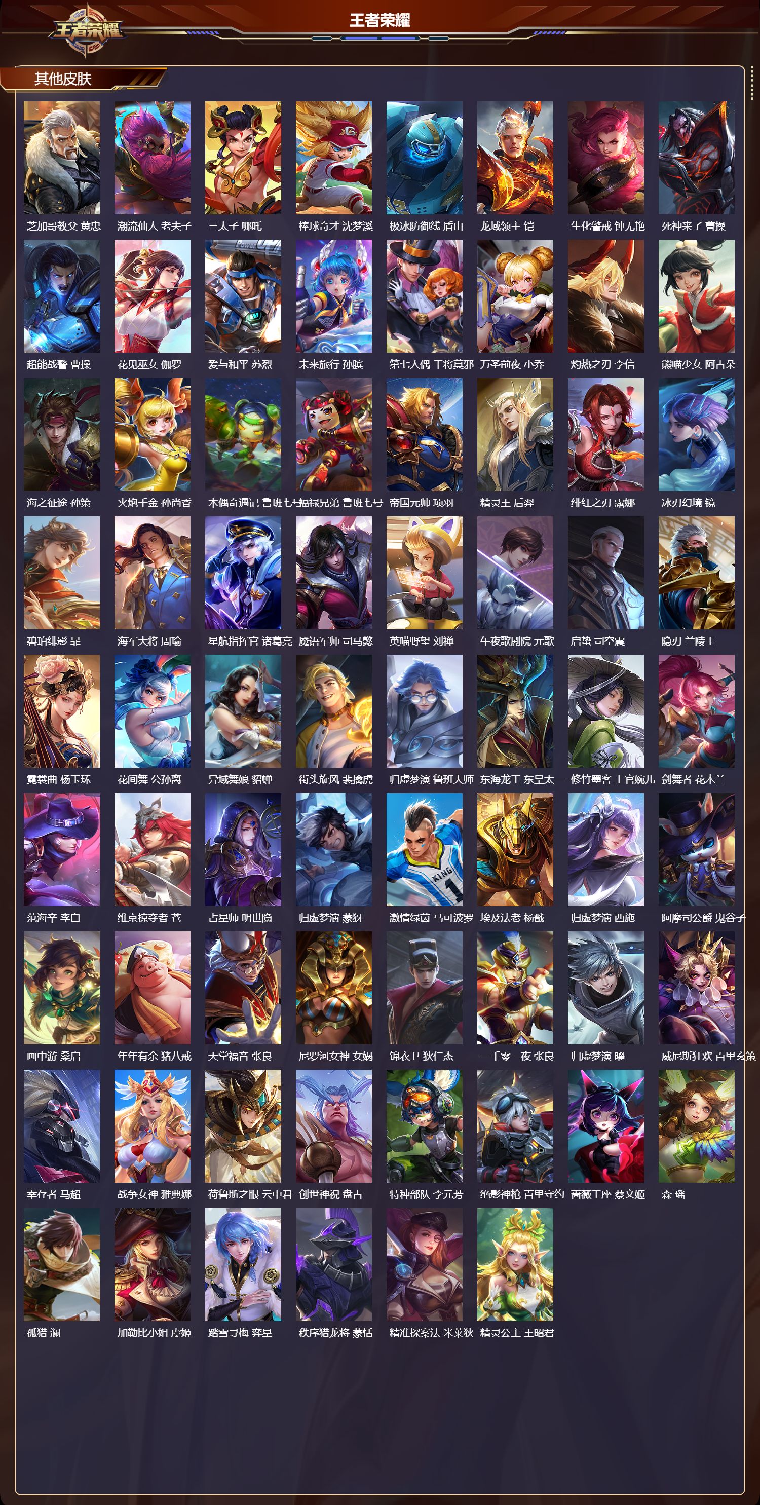 【82,其他皮肤】伊势巫女,大乔,金属狂潮,高渐离,前尘,金蝉,战争骑士,夏侯惇,圣殿之光,刘邦,芝加哥教父,黄忠,潮流仙人,老夫子,三太子,哪吒,棒球奇才,沈梦溪,极冰防御线,盾山,龙域领主,铠,生化警戒,钟无艳,死神来了,曹操,超能战警,曹操,花见巫女,伽罗,爱与和平,苏烈,未来旅行,孙膑,第七人偶,干将莫邪,万圣前夜,小乔,灼热之刃,李信,熊喵少女,阿古朵,海之征途,孙策,火炮千金,孙尚香,木偶奇遇记,鲁班七号,福禄兄弟,鲁班七号,帝国元帅,项羽,精灵王,后羿,绯红之刃,露娜,冰刃幻境,镜,碧珀绯影,暃,海军大将,周瑜,星航指挥官,诸葛亮,魇语军师,司马懿,英喵野望,刘禅,午夜歌剧院,元歌,启蛰,司空震,隐刃,兰陵王,霓裳曲,杨玉环,花间舞,公孙离,异域舞娘,貂蝉,街头旋风,裴擒虎,归虚梦演,鲁班大师,东海龙王,东皇太一,修竹墨客,上官婉儿,剑舞者,花木兰,范海辛,李白,维京掠夺者,苍,占星师,明世隐,归虚梦演,蒙犽,激情绿茵,马可波罗,埃及法老,杨戬,归虚梦演,西施,阿摩司公爵,鬼谷子,画中游,桑启,年年有余,猪八戒,天堂福音,张良,尼罗河女神,女娲,锦衣卫,狄仁杰,一千零一夜,张良,归虚梦演,曜,威尼斯狂欢,百里玄策,幸存者,马超,战争女神,雅典娜,荷鲁斯之眼,云中君,创世神祝,盘古,特种部队,李元芳,绝影神枪,百里守约,蔷薇王座,蔡文姬,森,瑶,孤猎,澜,加勒比小姐,虞姬,踏雪寻梅,弈星,秩序猎龙将,蒙恬,精准探案法,米莱狄,精灵公主,王昭君,赤焰之缨,云缨,露花倒影,嫦娥,地府判官,钟馗,美梦成真,梦奇,天启骑士,关羽,圆桌骑士,太乙真人,西部大镖客,孙悟空,
