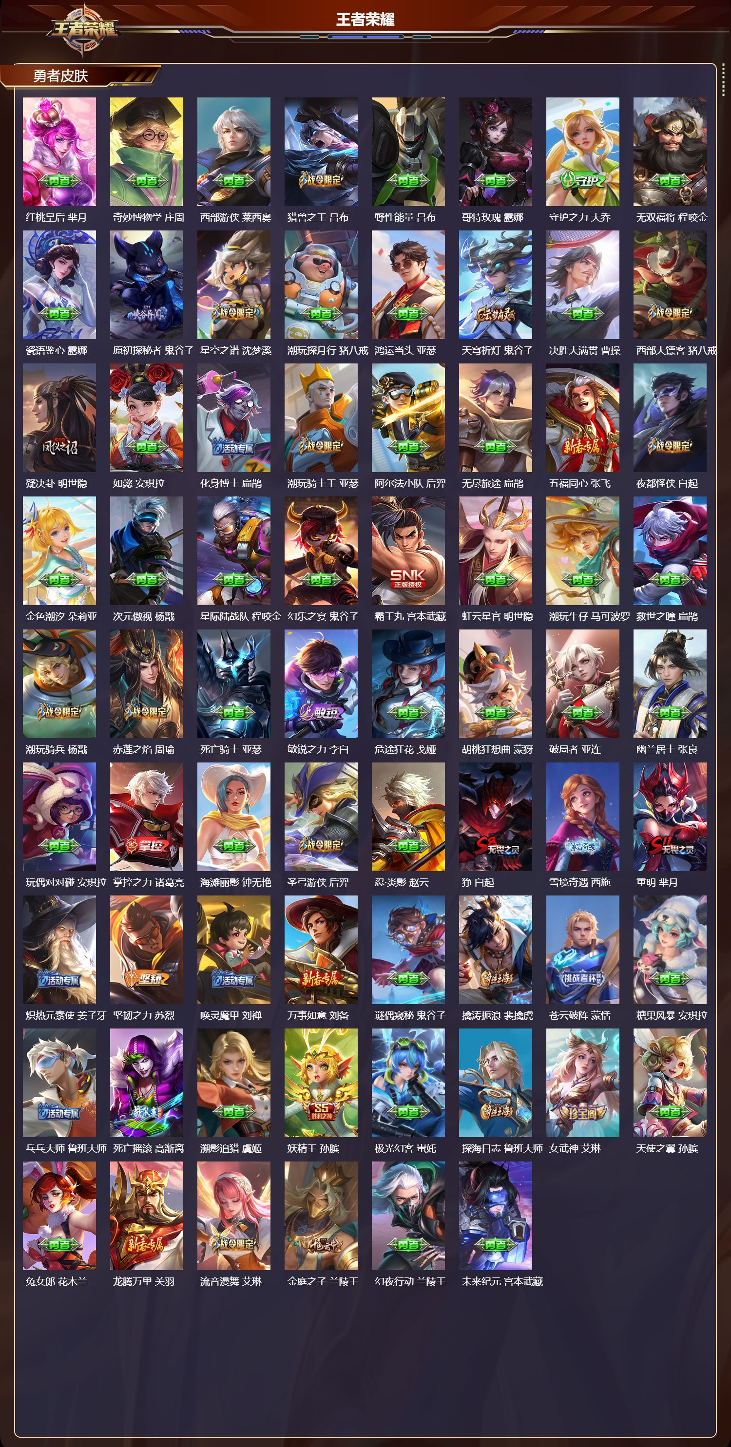 【191,勇者皮肤】时空谍影,海诺,玲珑珍味,西施,圆桌骑士,盾山,烛龙,曹操,爱心护理,阿轲,太极少年,赵怀真,星际陆战队,达摩,沙漠行僧,达摩,大漠名商,沈梦溪,暖冬絮语,程咬金,缤纷绘卷,张良,纽约教父,刘备,拳王,达摩,大发明家,达摩,龙舞盛年,沈梦溪,乐园追猎者,白起,丁香结,小乔,功夫炙烤,廉颇,铁甲之心,典韦,沉稳之力,孙尚香,幻夜卜梦,芈月,爱与正义,程咬金,海盐诗旅,桑启,幻泉雾影,海月,朔风刀,夏侯惇,醍醐杖,老夫子,朔望之晖,女娲,归虚梦演,孙膑,汉昭烈帝,刘备,热血海滩,哪吒,白色死神,白起,黑桃队长,鲁班七号,黄金武士,典韦,王牌新星,海月,落雪兰心,甄姬,夺宝奇兵,刘邦,御旌,牛魔,阴阳师,狄仁杰,炼金王,扁鹊,次元突破,哪吒,古海寻踪,张良,牛运亨通,牛魔,科学大爆炸,项羽,功夫老勺,老夫子,西部大镖客,牛魔,鲨炮海盗猫,沈梦溪,鲤鱼之梦,庄周,虎啸剑宗,刘邦,海滩派对,项羽,完美运算,后羿,万华元夜,狄仁杰,无尽征程,廉颇,克喵,鬼谷子,制霸全明星,牛魔,踏浪烽翎,莱西奥,演武夺筹,程咬金,红桃皇后,芈月,奇妙博物学,庄周,西部游侠,莱西奥,猎兽之王,吕布,野性能量,吕布,哥特玫瑰,露娜,守护之力,大乔,无双福将,程咬金,瓷语鉴心,露娜,原初探秘者,鬼谷子,星空之诺,沈梦溪,潮玩探月行,猪八戒,鸿运当头,亚瑟,天穹祈灯,鬼谷子,决胜大满贯,曹操,西部大镖客,猪八戒,疑决卦,明世隐,如懿,安琪拉,化身博士,扁鹊,潮玩骑士王,亚瑟,阿尔法小队,后羿,无尽旅途,扁鹊,五福同心,张飞,夜都怪侠,白起,金色潮汐,朵莉亚,次元傲视,杨戬,星际陆战队,程咬金,幻乐之宴,鬼谷子,霸王丸,宫本武藏,虹云星官,明世隐,潮玩牛仔,马可波罗,救世之瞳,扁鹊,潮玩骑兵,杨戬,赤莲之焰,周瑜,死亡骑士,亚瑟,敏锐之力,李白,危途狂花,戈娅,胡桃狂想曲,蒙犽,破局者,亚连,幽兰居士,张良,玩偶对对碰,安琪拉,掌控之力,诸葛亮,海滩丽影,钟无艳,圣弓游侠,后羿,忍·炎影,赵云,狰,白起,雪境奇遇,西施,重明,芈月,炽热元素使,姜子牙,坚韧之力,苏烈,唤灵魔甲,刘禅,万事如意,刘备,谜偶窥秘,鬼谷子,擒涛扼浪,裴擒虎,苍云破阵,蒙恬,糖果风暴,安琪拉,乓乓大师,鲁班大师,死亡摇滚,高渐离,溯影追猎,虞姬,妖精王,孙膑,极光幻客,蚩奼,探海日志,鲁班大师,女武神,艾琳,天使之翼,孙膑,兔女郎,花木兰,龙腾万里,关羽,流音漫舞,艾琳,金庭之子,兰陵王,幻夜行动,兰陵王,未来纪元,宫本武藏,罗小黑战记,哪吒,千军破阵,苏烈,往忆晖光,明世隐,零食大作战,姬小满,荣光之誓,亚瑟,花好人间,甄姬,万象初新,宫本武藏,聚星闪耀,钟无艳,潮玩造梦师,刘备,御銮,盾山,单词大作战,雅典娜,时尚教父,姜子牙,春野之旅,钟无艳,秘密基地,刘禅,穷奇,典韦,教廷特使,韩信,黑猫爱糖果,李元芳,街头霸王,韩信,云中旅人,李元芳,妄想特派,李元芳,西部大镖客,孙悟空,紫罗兰之誓,妲己,神迹守卫,墨子,重装意志,盘古,凯尔特女王,虞姬,进击墨子号,墨子,蔬乡物语,李元芳,少女阿狸,妲己,灵卜魔法,妲己,混沌棋,弈星,御霄,米莱狄,蔚蓝守将,蒙恬,契约魔法,米莱狄,暖冬·兔眠,嫦娥,绒语心约,大乔,午后时光,王昭君,幻想奇妙夜,王昭君,驱傩正仪,钟馗,神迹守卫,钟馗,命运角斗场,狂铁,特工战影,狂铁,御狮,狂铁,漠中幻影,嫦娥,白执事,赵云,饕餮,太乙真人,华丽摇滚,太乙真人,劲辣红锅,太乙真人,罗小黑战记,张良,剑破天穹,刘邦,异域游侠,刘备,苍威无极,项羽,熔金海岸,周瑜,苍林狼骑,苍,魅影绮裳,影,长夏之忆,貂蝉,星梦巡礼,姜子牙,群星魔术团,程咬金,经纬探寻者,盘古,暗都幽影,大司命,夏日便利店,虞姬,云械蓝图,云中君,逆浪荇歌,甄姬,线条小狗,周瑜,线条小狗,桑启,噬灭天穹,东皇太一,