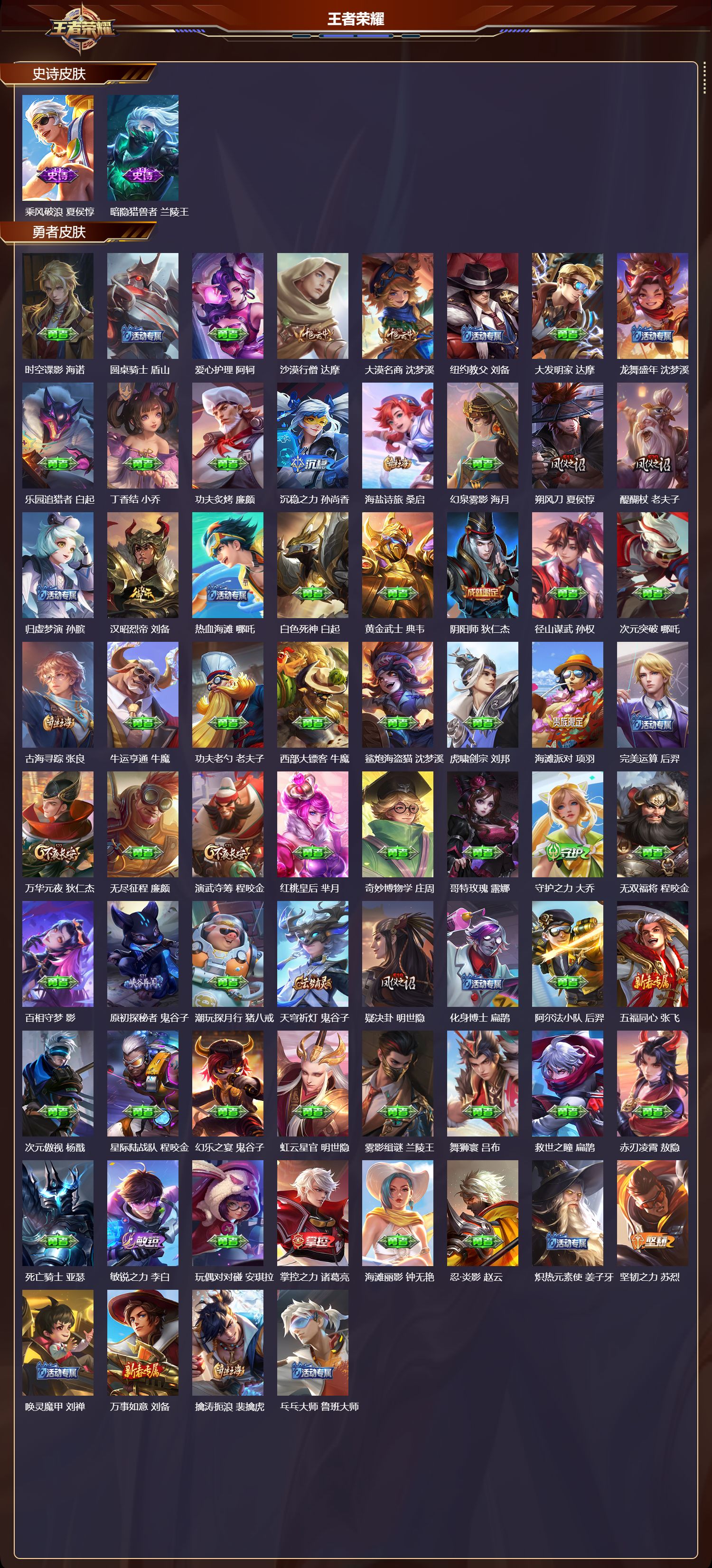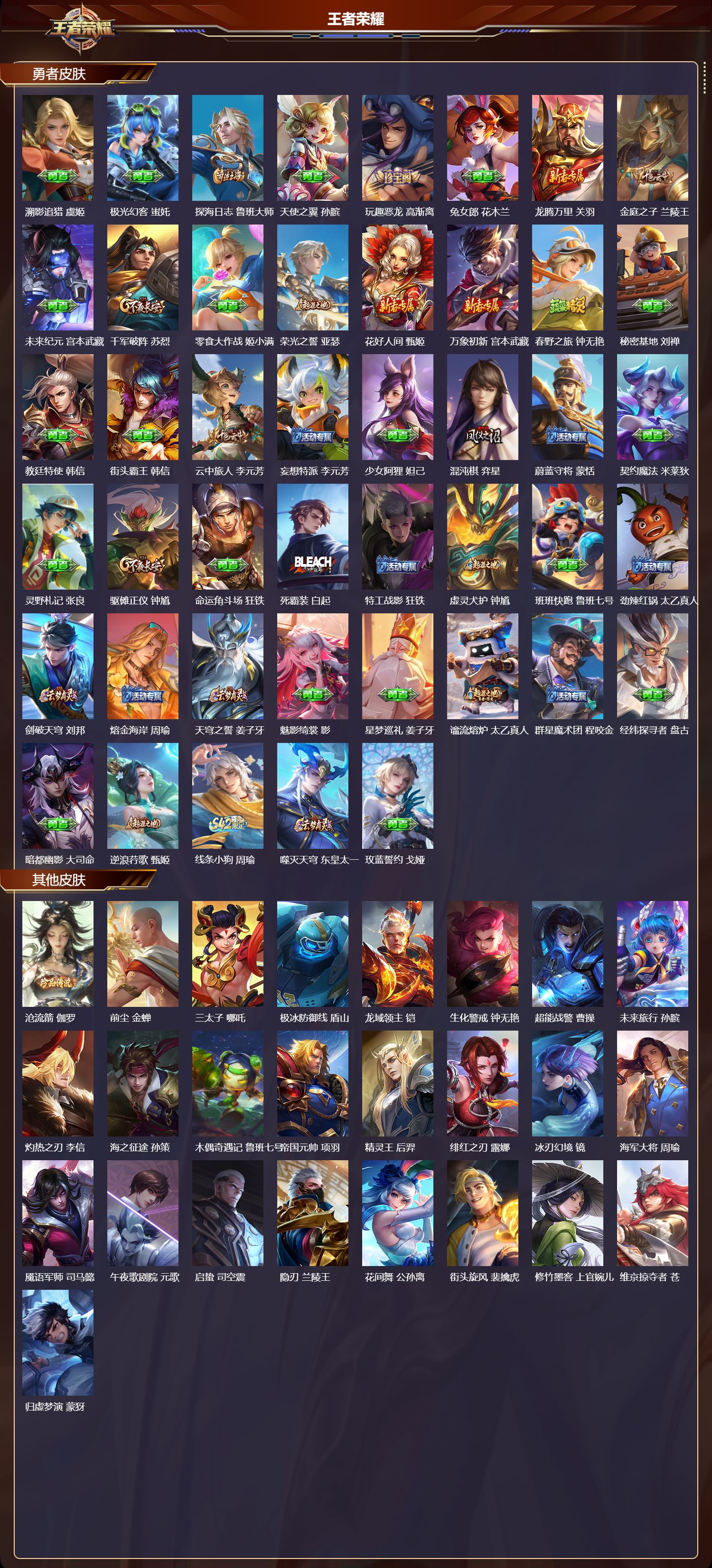 【113,勇者皮肤】时空谍影,海诺,圆桌骑士,盾山,爱心护理,阿轲,沙漠行僧,达摩,大漠名商,沈梦溪,纽约教父,刘备,大发明家,达摩,龙舞盛年,沈梦溪,乐园追猎者,白起,丁香结,小乔,功夫炙烤,廉颇,沉稳之力,孙尚香,海盐诗旅,桑启,幻泉雾影,海月,朔风刀,夏侯惇,醍醐杖,老夫子,归虚梦演,孙膑,汉昭烈帝,刘备,热血海滩,哪吒,白色死神,白起,黄金武士,典韦,阴阳师,狄仁杰,径山谋武,孙权,次元突破,哪吒,古海寻踪,张良,牛运亨通,牛魔,功夫老勺,老夫子,西部大镖客,牛魔,鲨炮海盗猫,沈梦溪,虎啸剑宗,刘邦,海滩派对,项羽,完美运算,后羿,万华元夜,狄仁杰,无尽征程,廉颇,演武夺筹,程咬金,红桃皇后,芈月,奇妙博物学,庄周,哥特玫瑰,露娜,守护之力,大乔,无双福将,程咬金,百相守梦,影,原初探秘者,鬼谷子,潮玩探月行,猪八戒,天穹祈灯,鬼谷子,疑决卦,明世隐,化身博士,扁鹊,阿尔法小队,后羿,五福同心,张飞,次元傲视,杨戬,星际陆战队,程咬金,幻乐之宴,鬼谷子,虹云星官,明世隐,雾影缉谜,兰陵王,舞狮寰,吕布,救世之瞳,扁鹊,赤刃凌霄,敖隐,死亡骑士,亚瑟,敏锐之力,李白,玩偶对对碰,安琪拉,掌控之力,诸葛亮,海滩丽影,钟无艳,忍·炎影,赵云,炽热元素使,姜子牙,坚韧之力,苏烈,唤灵魔甲,刘禅,万事如意,刘备,擒涛扼浪,裴擒虎,乓乓大师,鲁班大师,溯影追猎,虞姬,极光幻客,蚩奼,探海日志,鲁班大师,天使之翼,孙膑,玩趣恶龙,高渐离,兔女郎,花木兰,龙腾万里,关羽,金庭之子,兰陵王,未来纪元,宫本武藏,千军破阵,苏烈,零食大作战,姬小满,荣光之誓,亚瑟,花好人间,甄姬,万象初新,宫本武藏,春野之旅,钟无艳,秘密基地,刘禅,教廷特使,韩信,街头霸王,韩信,云中旅人,李元芳,妄想特派,李元芳,少女阿狸,妲己,混沌棋,弈星,蔚蓝守将,蒙恬,契约魔法,米莱狄,灵野札记,张良,驱傩正仪,钟馗,命运角斗场,狂铁,死霸装,白起,特工战影,狂铁,虚灵犬护,钟馗,班班快跑,鲁班七号,劲辣红锅,太乙真人,剑破天穹,刘邦,熔金海岸,周瑜,天穹之誓,姜子牙,魅影绮裳,影,星梦巡礼,姜子牙,谧流熔炉,太乙真人,群星魔术团,程咬金,经纬探寻者,盘古,暗都幽影,大司命,逆浪荇歌,甄姬,线条小狗,周瑜,噬灭天穹,东皇太一,玫蓝誓约,戈娅,