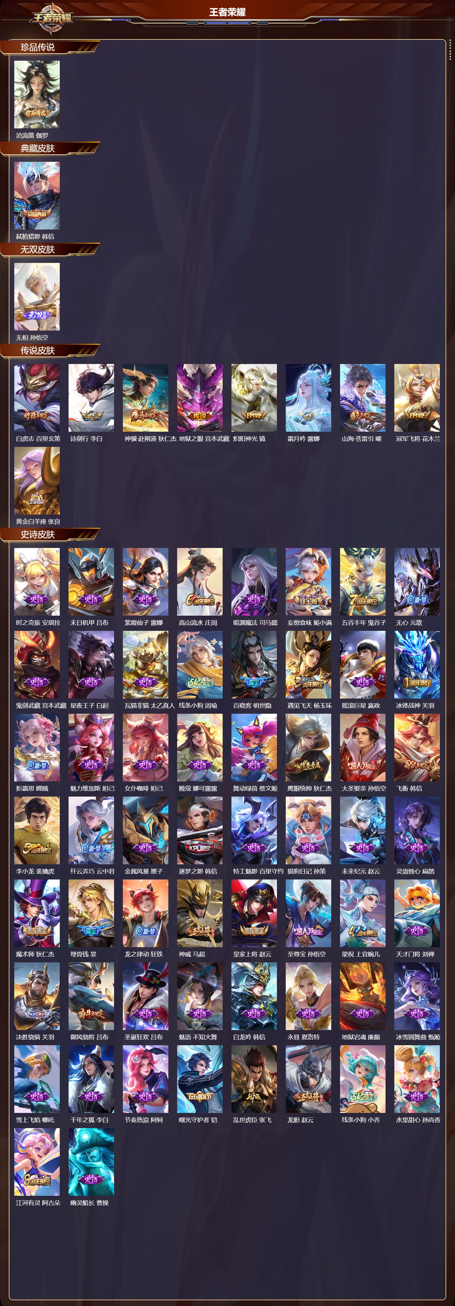 【60,史诗皮肤】时之奇旅,安琪拉,末日机甲,吕布,紫霞仙子,露娜,高山流水,庄周,暗渊魔法,司马懿,妄想食味,姬小满,五谷丰年,鬼谷子,无心,元歌,鬼剑武藏,宫本武藏,星夜王子,白起,瓦猫非猫,太乙真人,线条小狗,周瑜,百晓客,明世隐,遇见飞天,杨玉环,摇滚巨星,嬴政,冰锋战神,关羽,拒霜思,嫦娥,魅力维加斯,妲己,女仆咖啡,妲己,晚萤,娜可露露,舞动绿茵,蔡文姬,鹰眼统帅,狄仁杰,大圣娶亲,孙悟空,飞衡,韩信,李小龙,裴擒虎,纤云弄巧,云中君,金属风暴,墨子,逐梦之影,韩信,特工魅影,百里守约,猫狗日记,孙策,未来纪元,赵云,灵蛊蚀心,扁鹊,魔术师,狄仁杰,埋骨钱,暃,龙之律动,狂铁,神威,马超,皇家上将,赵云,至尊宝,孙悟空,梁祝,上官婉儿,天才门将,刘禅,决胜骁骑,关羽,御风骁将,吕布,圣诞狂欢,吕布,魅语,不知火舞,白龙吟,韩信,永昼,夏洛特,地狱岩魂,廉颇,冰雪圆舞曲,甄姬,雪上飞焰,哪吒,千年之狐,李白,节奏热浪,阿轲,曙光守护者,铠,乱世虎臣,张飞,龙胆,赵云,线条小狗,小乔,水果甜心,孙尚香,江河有灵,阿古朵,幽灵船长,曹操,乘风破浪,夏侯惇,暗隐猎兽者,兰陵王,